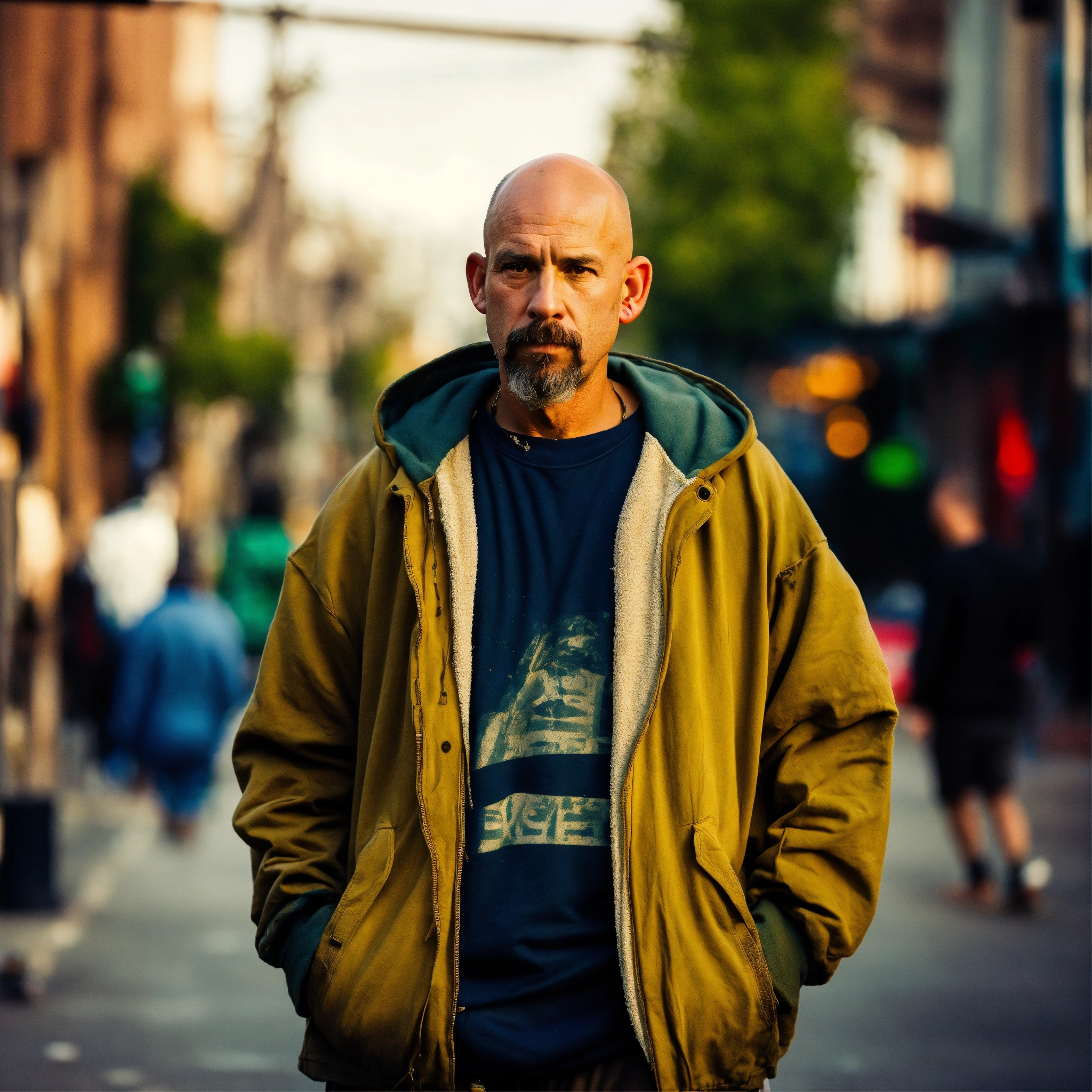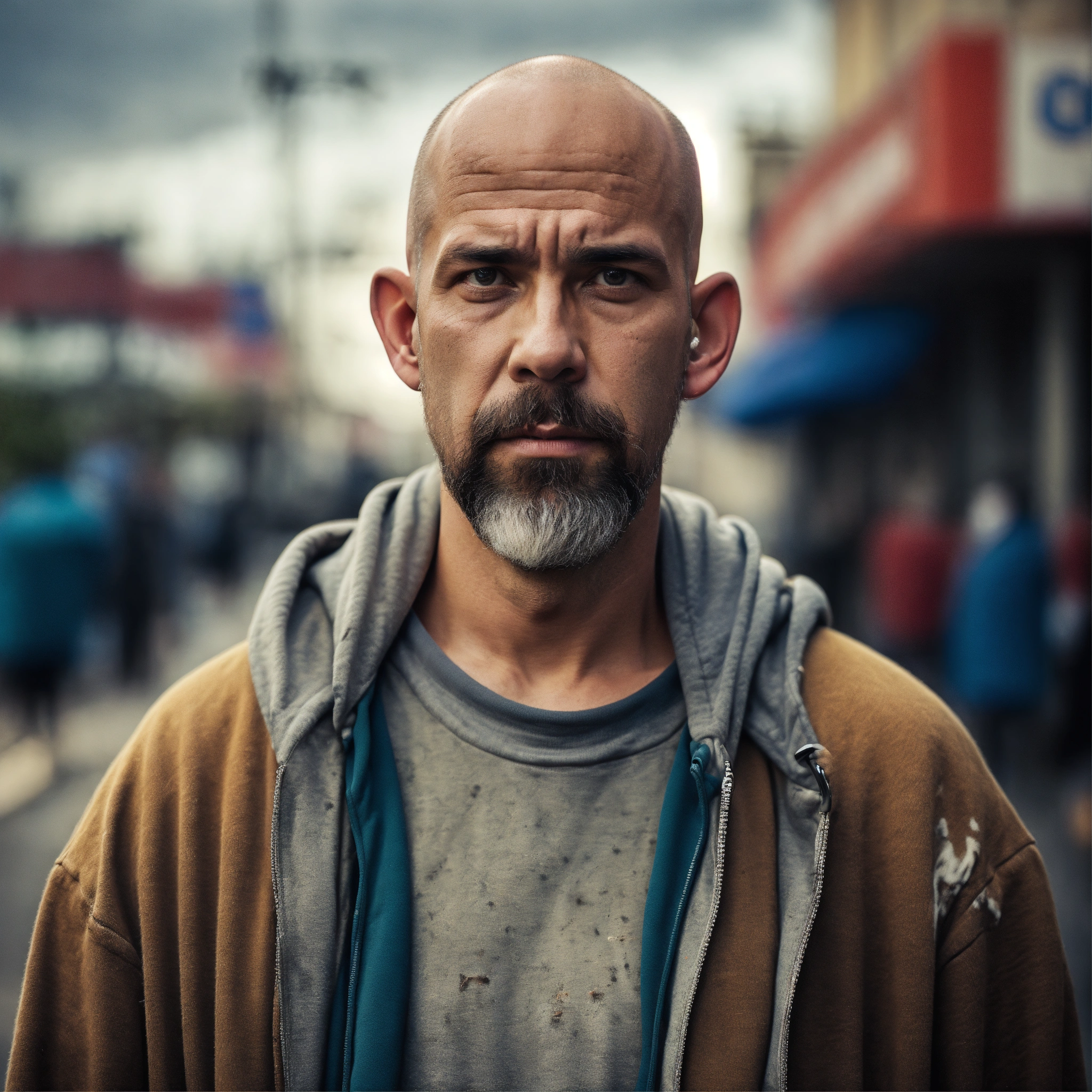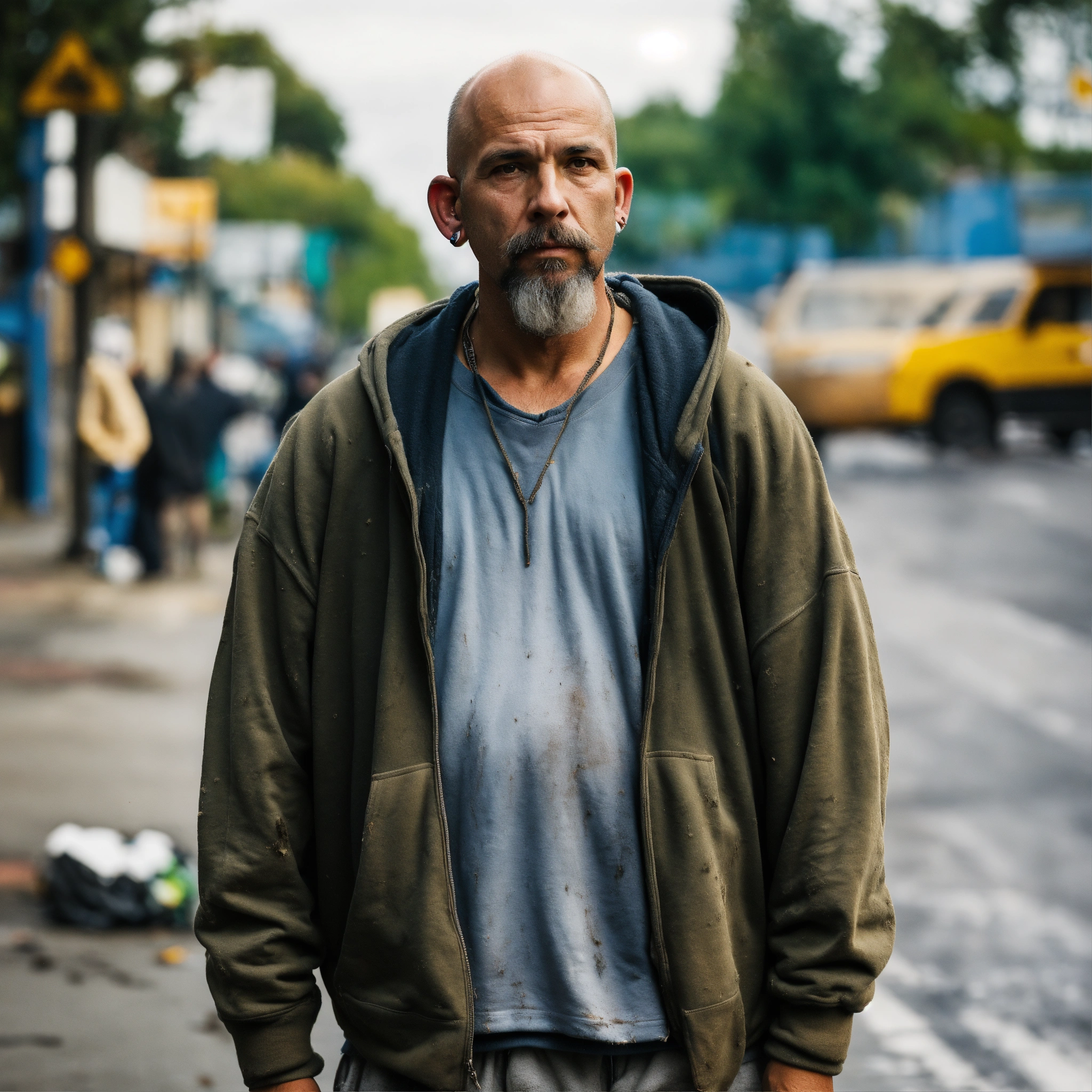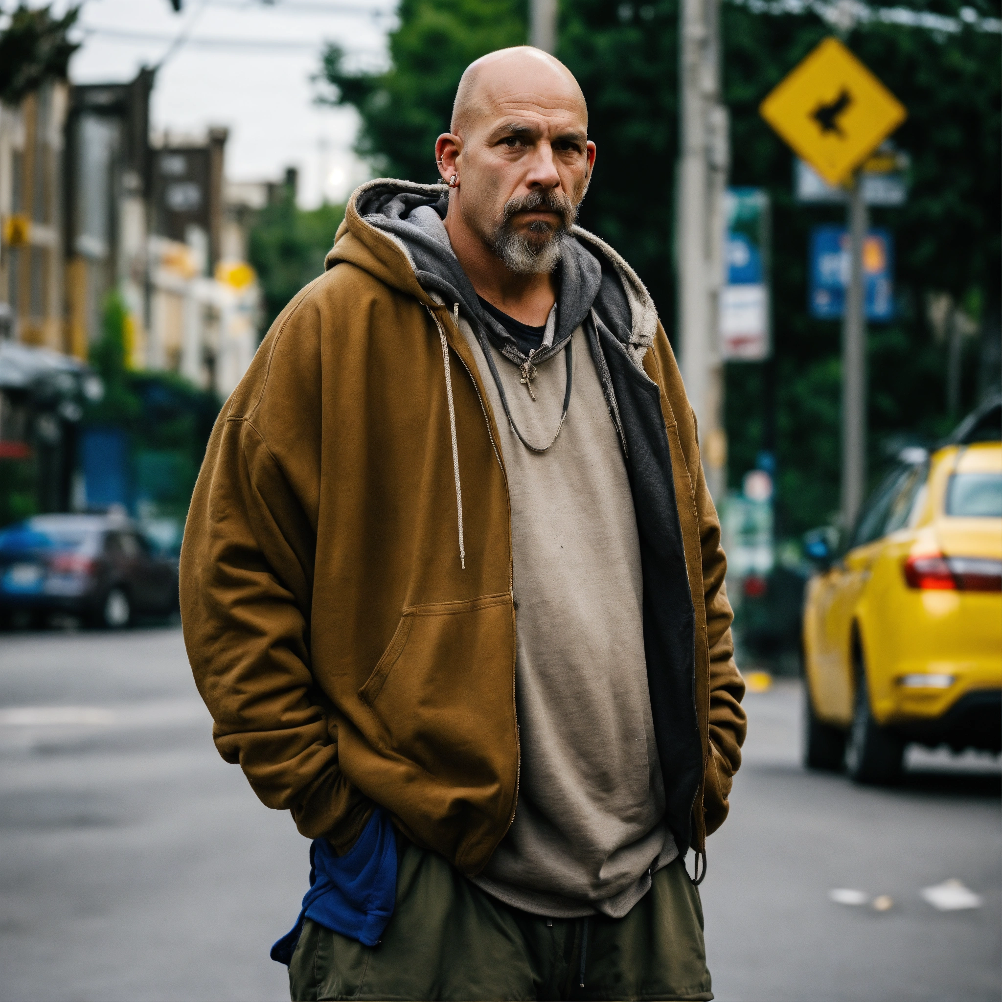 A huge bald homeless man, small goatee, large ears, wearing dirty shorts and a hoodie, standing in the street