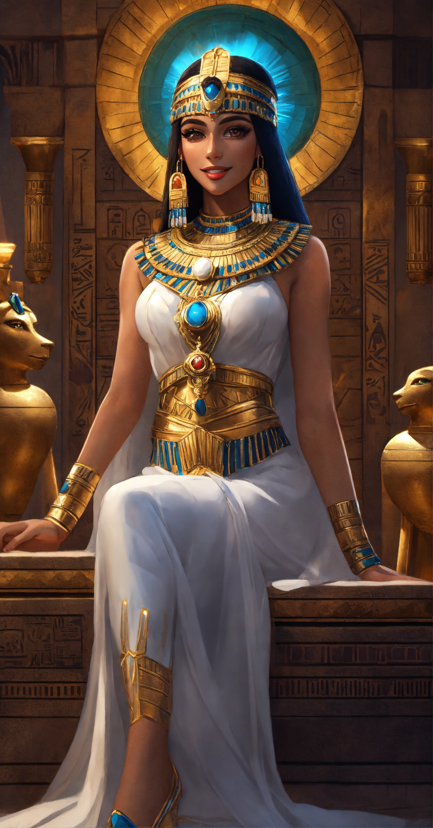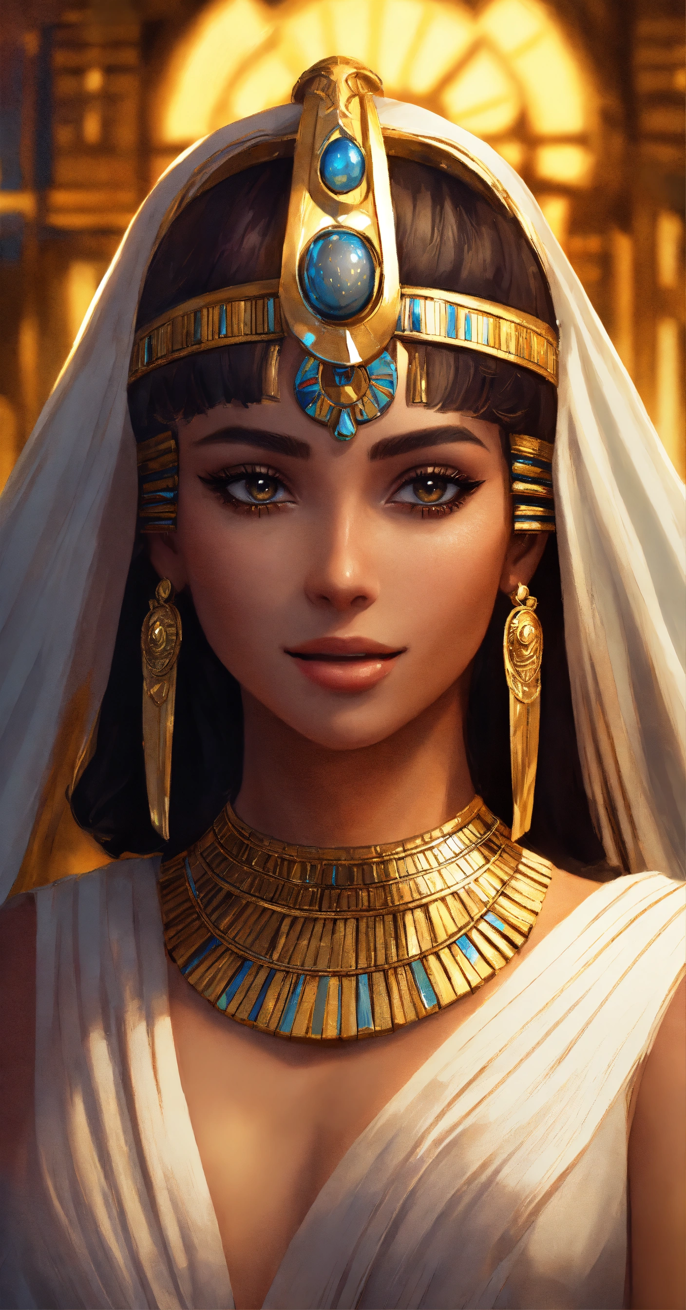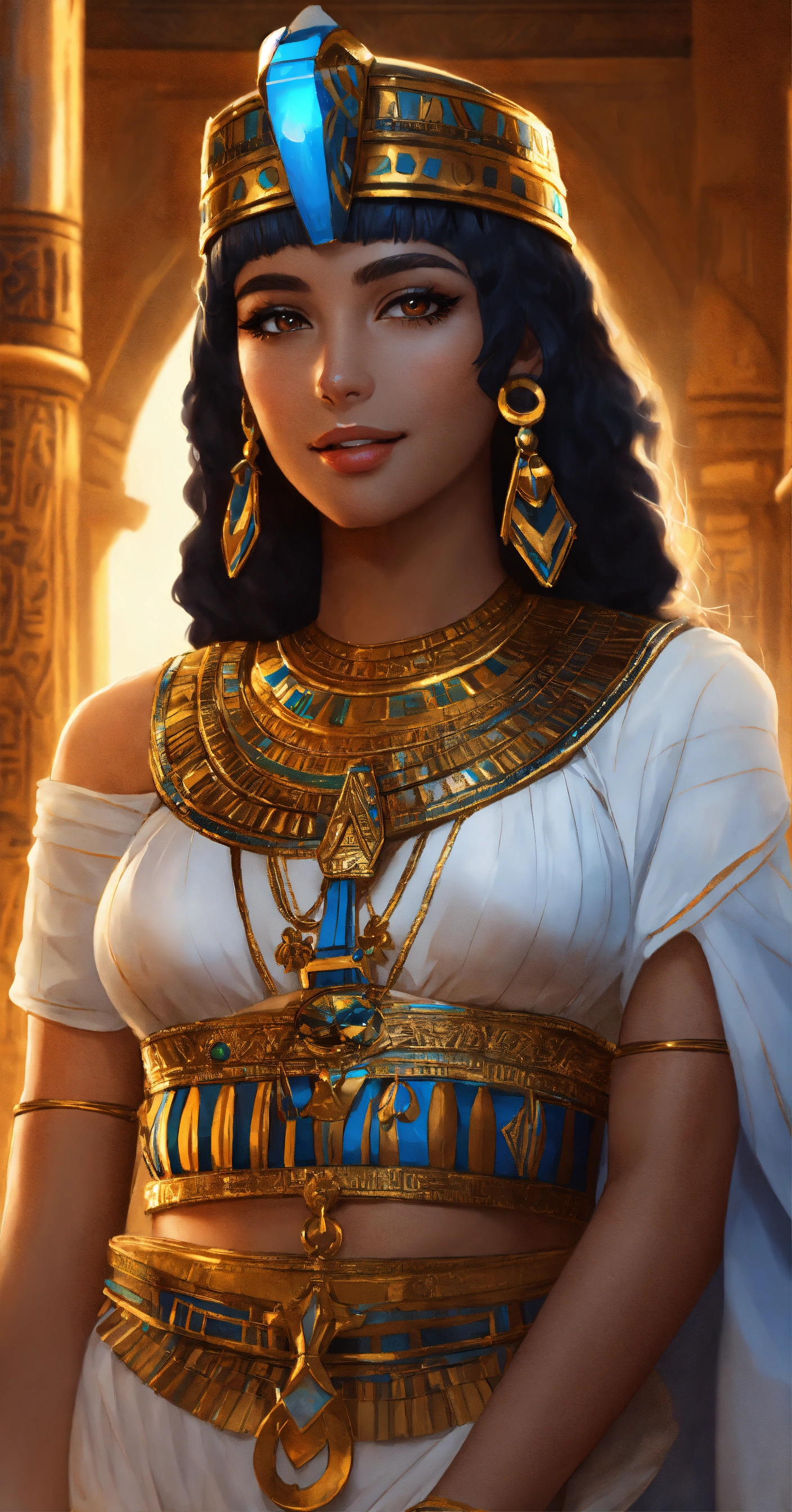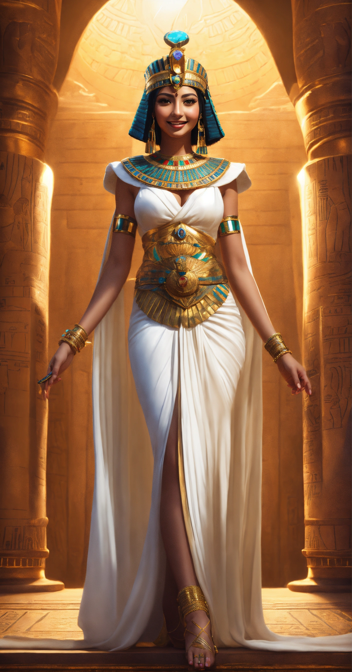 Sofia jamora as cleopatra, egyptian princess, digital painting, artstation, cg art, elegant, highly detailed, sharp focus, full body, smiling, big eyes, wearing white costume, art by sun khamunaki, virtual painted, night