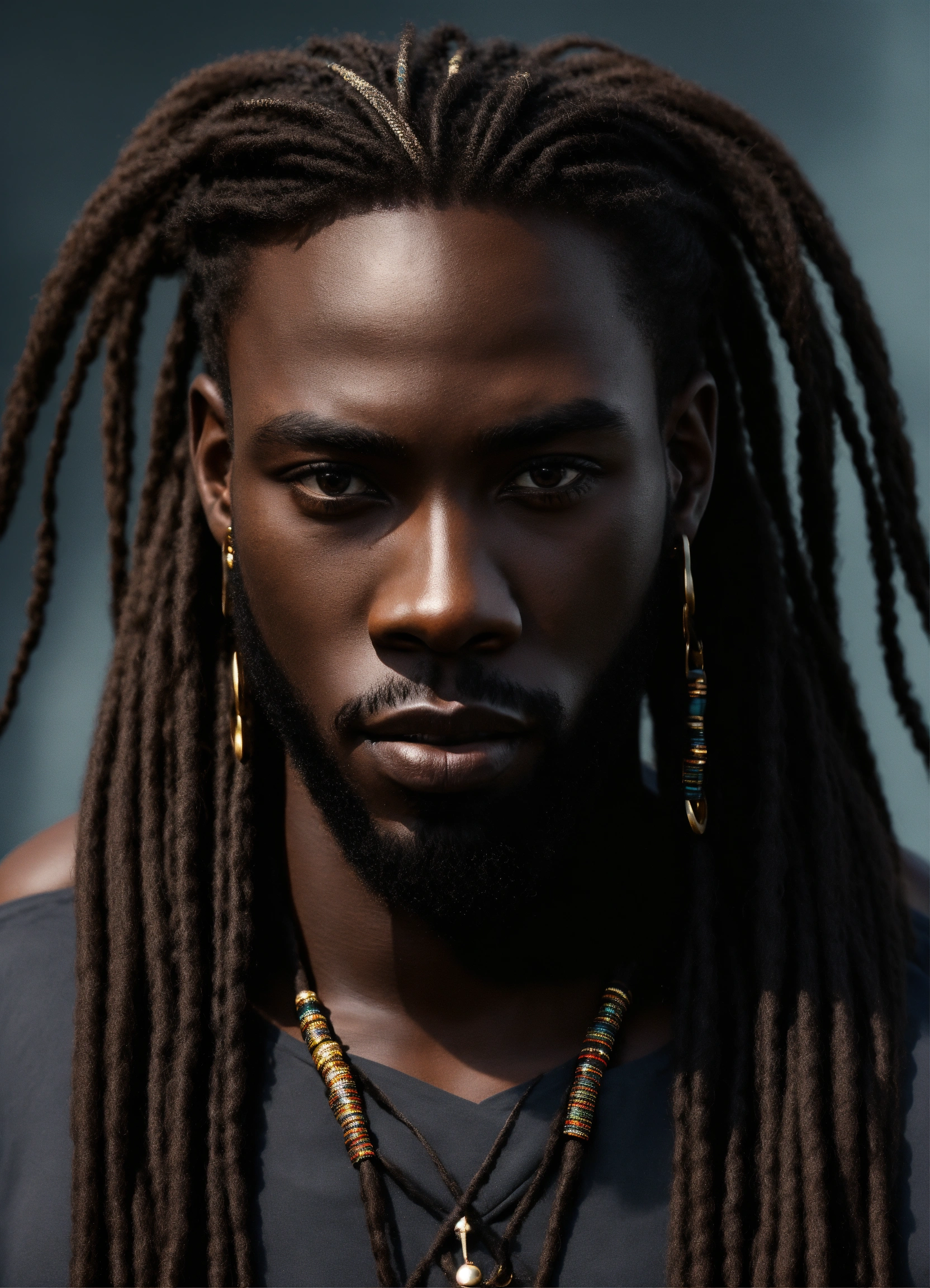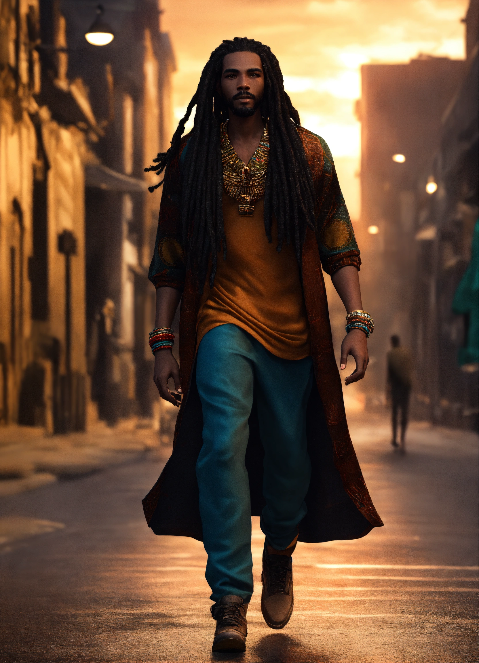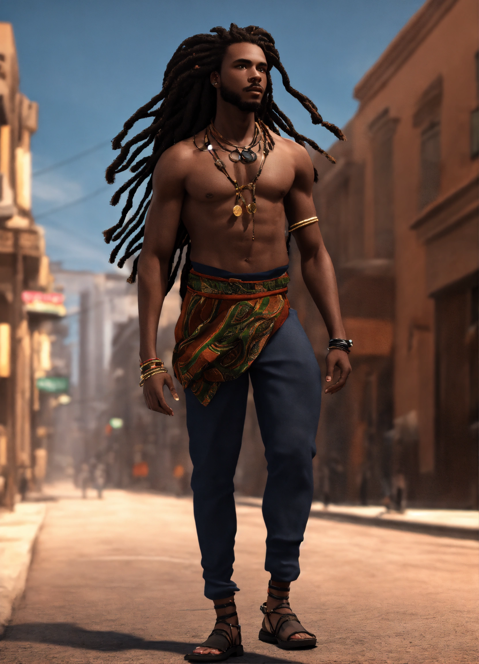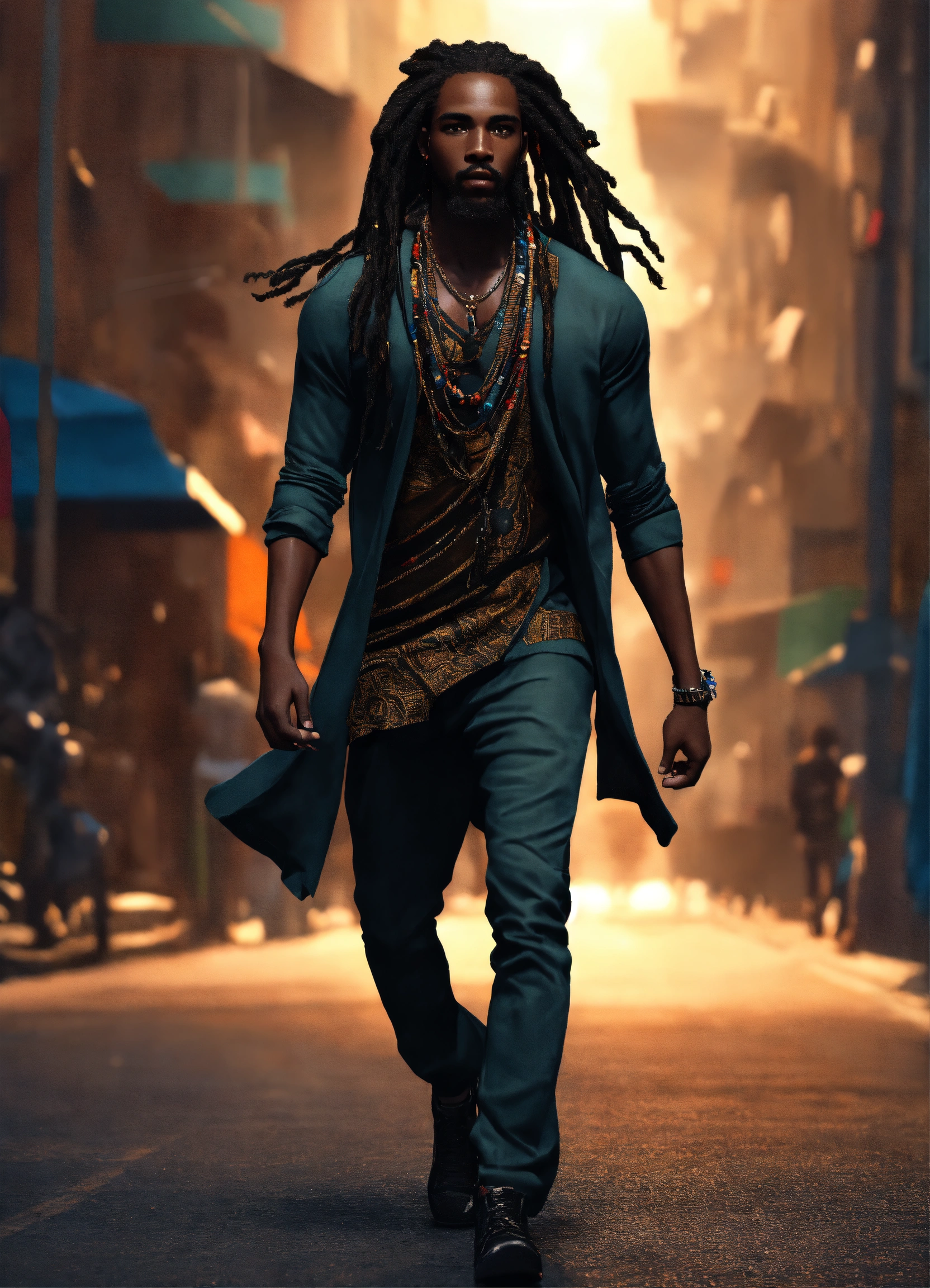 3d render of a black african man with long flowing dreadlocks, 6'5" tall, well-built, striding confidently up the street, looking directly into camera, from the darkest tribe in africa his skin color is jet black, skin color the black of pure onyx, skin color midnight black, skin color the blackest black on the color spectrum, wearing african style clothing