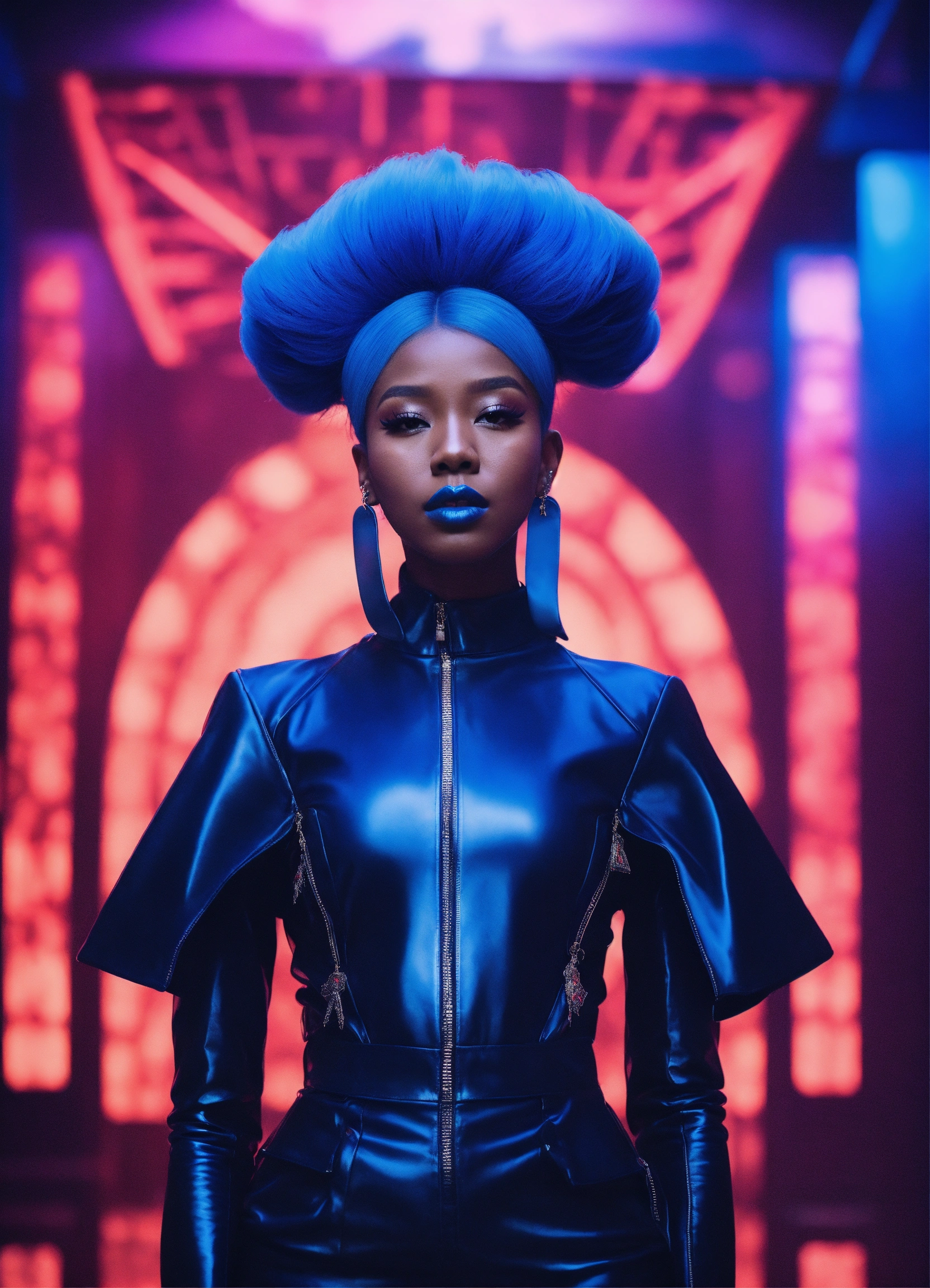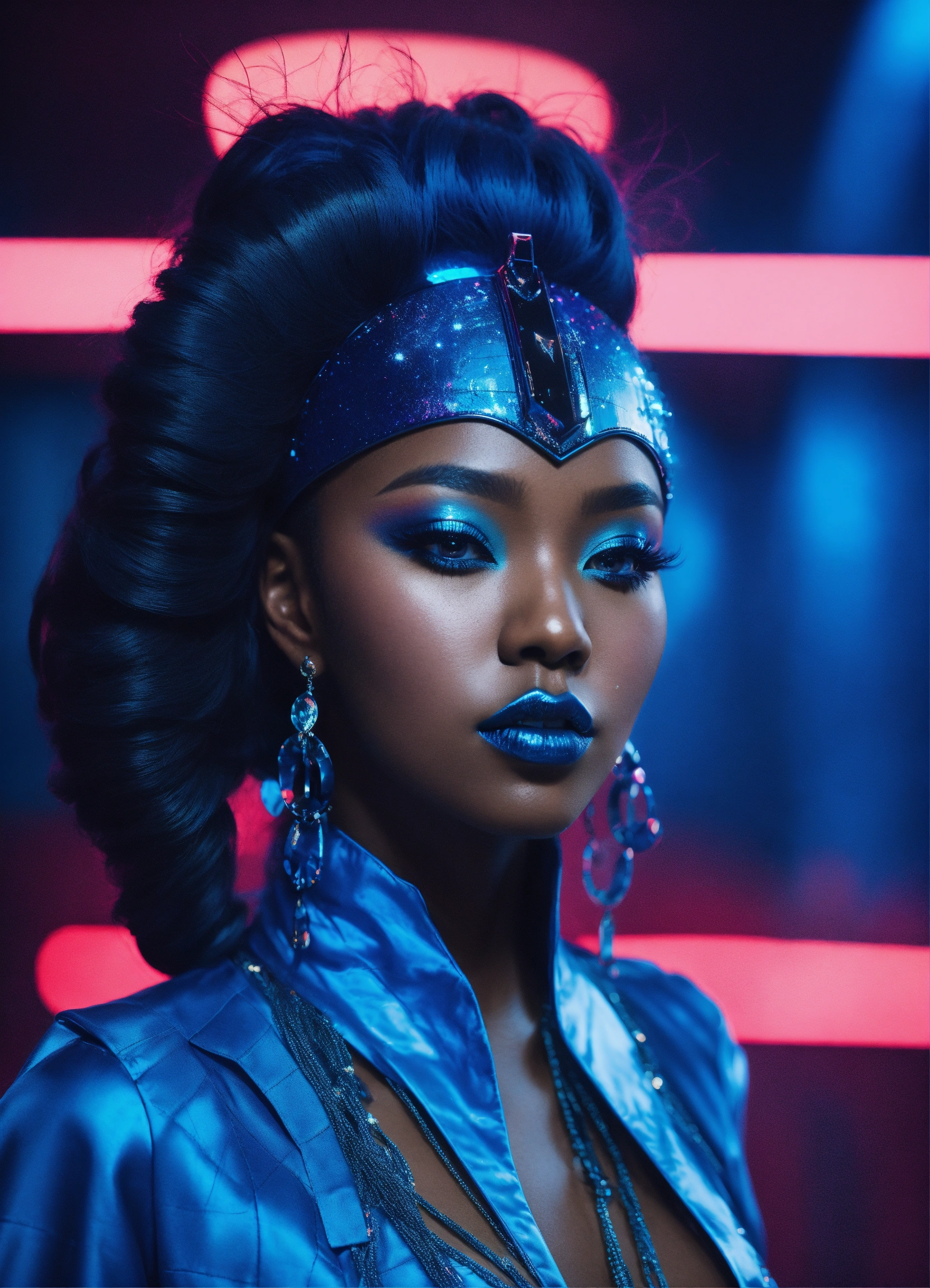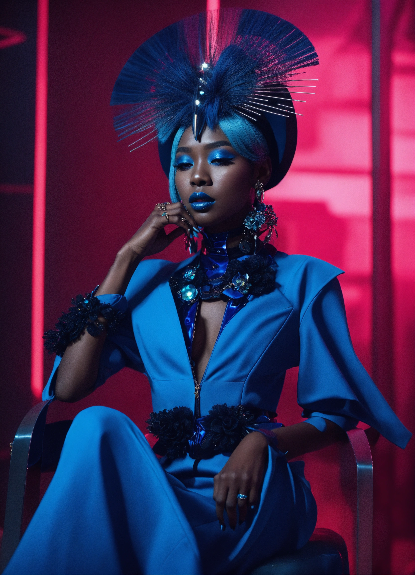 A dark skin black female kpop idol in a all blue sleek futuristic outfit, with huge headpiece center piece, clean makeup with oversized blue hair, with depth of field, fantastical edgy and regal themed outfit, captured in vivid colors, embodying the essence of fantasy, minimalist
