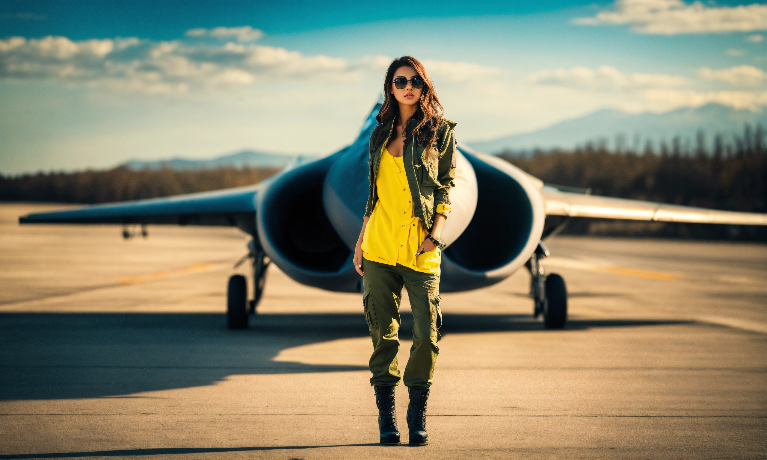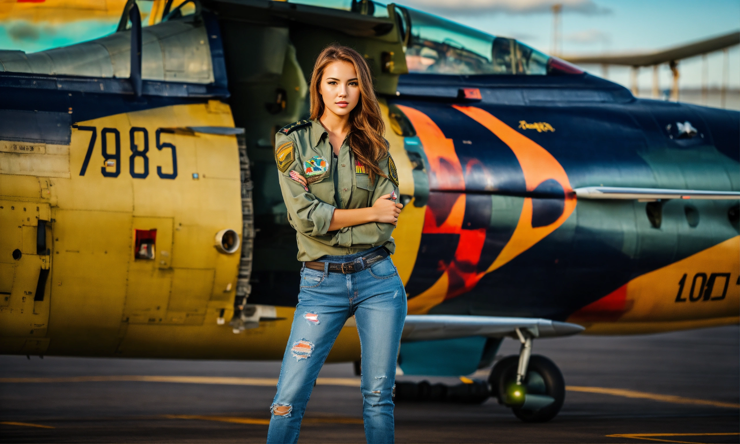 Cool models girl standing in the front of a military jet, hands in the pants, colorful image, view a little be from the down to the up