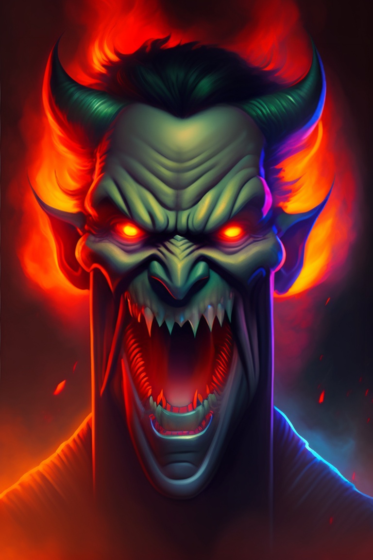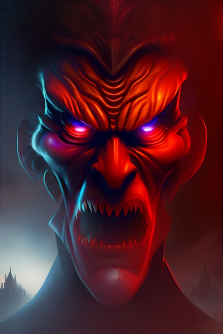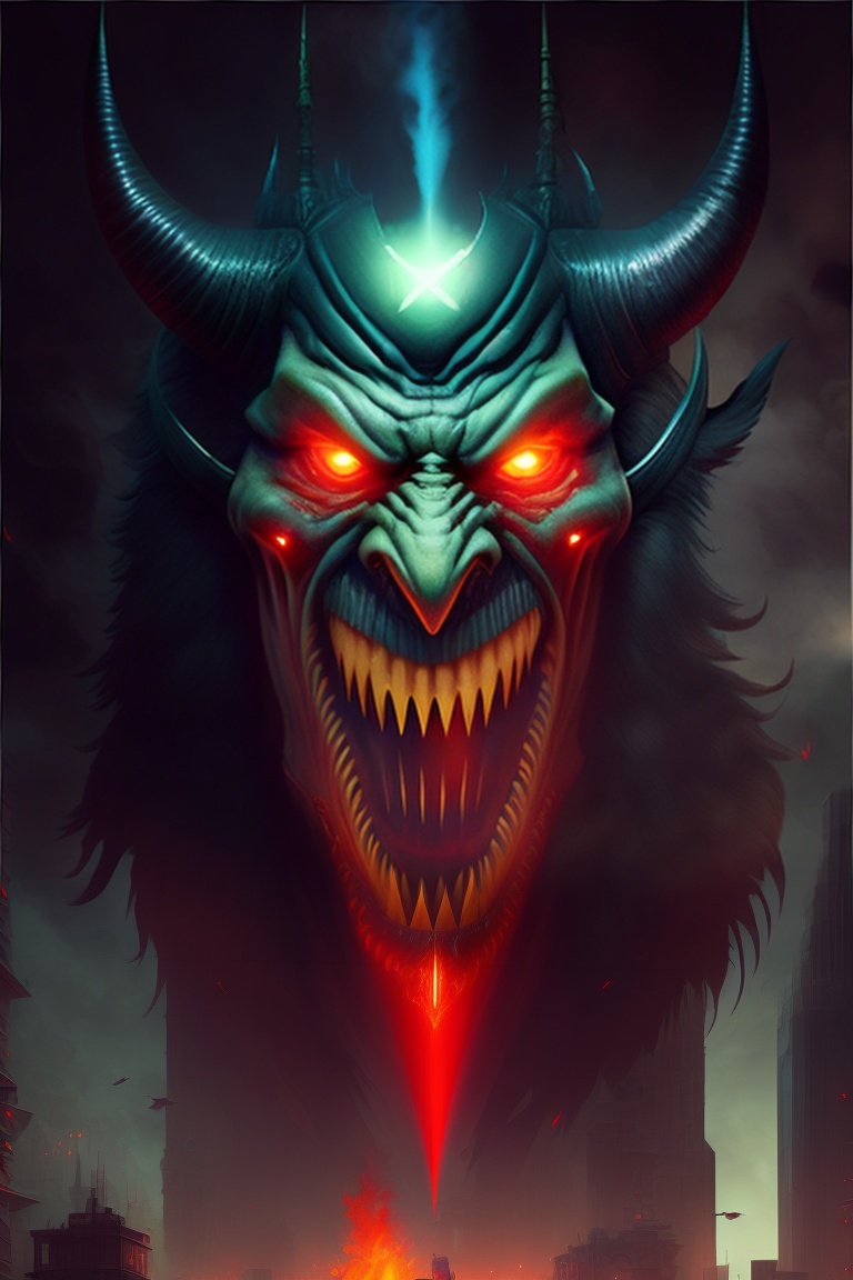 A super scary monster, 3 eyes, ctulhu, hp lovecraft, city in flames backkground, giant mouth scary, big head, no nose, devil, hell