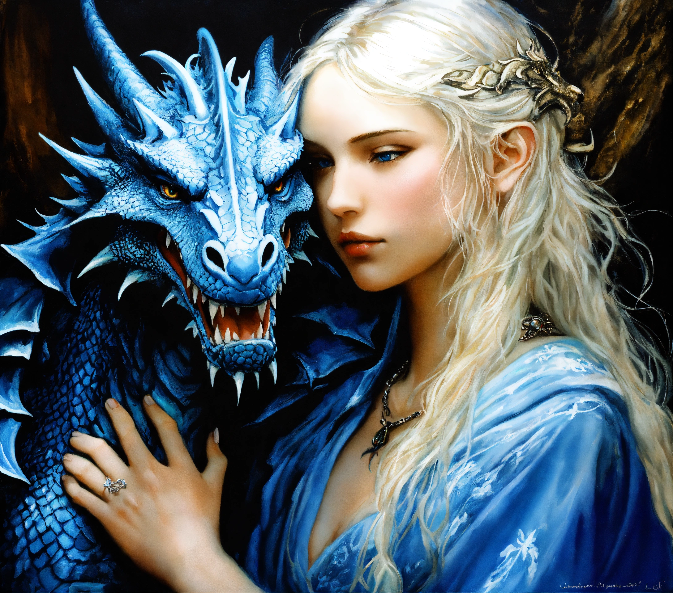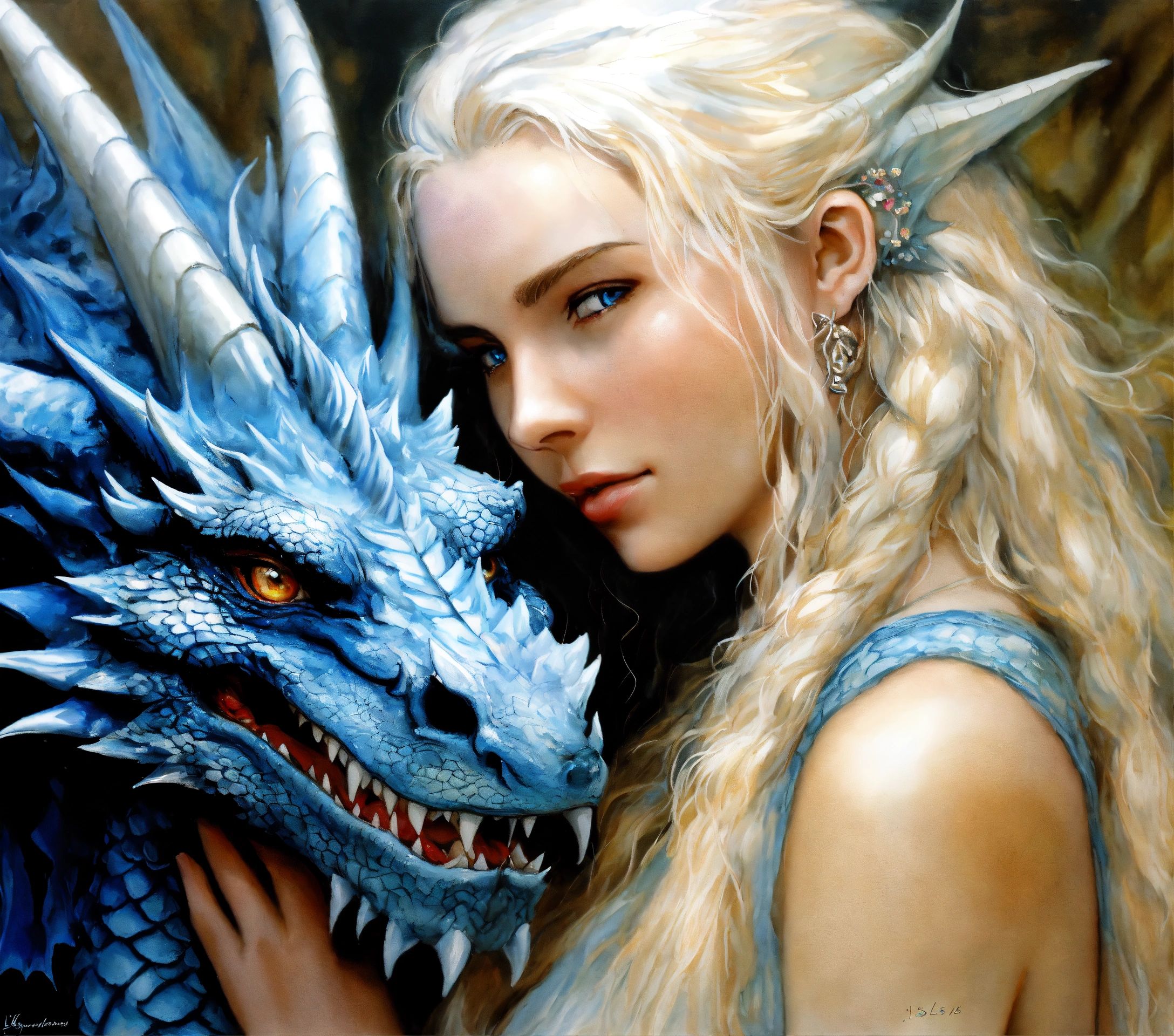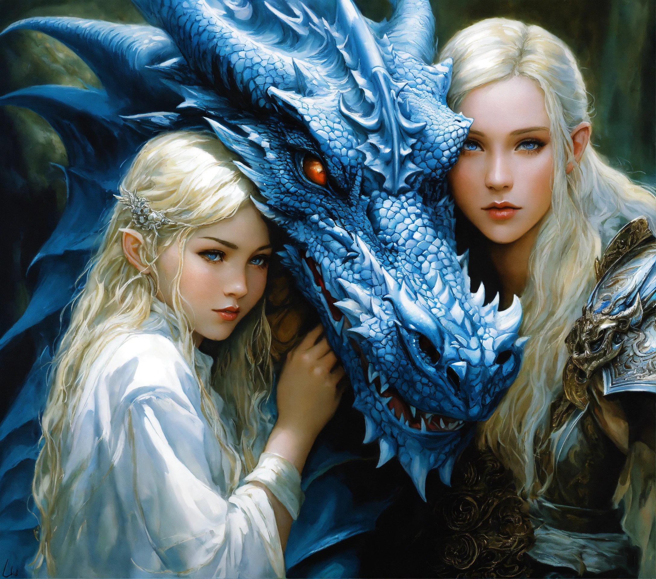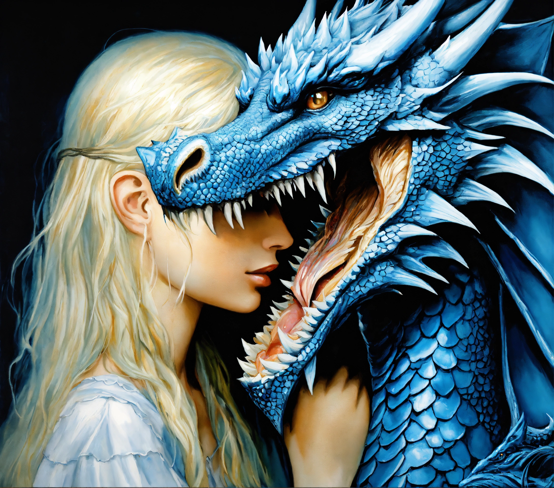 Painting of a giant magnificent blue dragon head with a 15 year old whiteblond elvish girl which is hugging the dragons head, the dragon's head is as big as the entire girl, ultra detailled, ultra realistic, in the style of luis royo