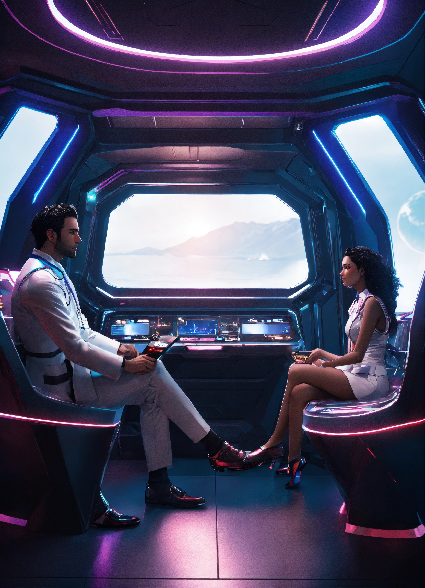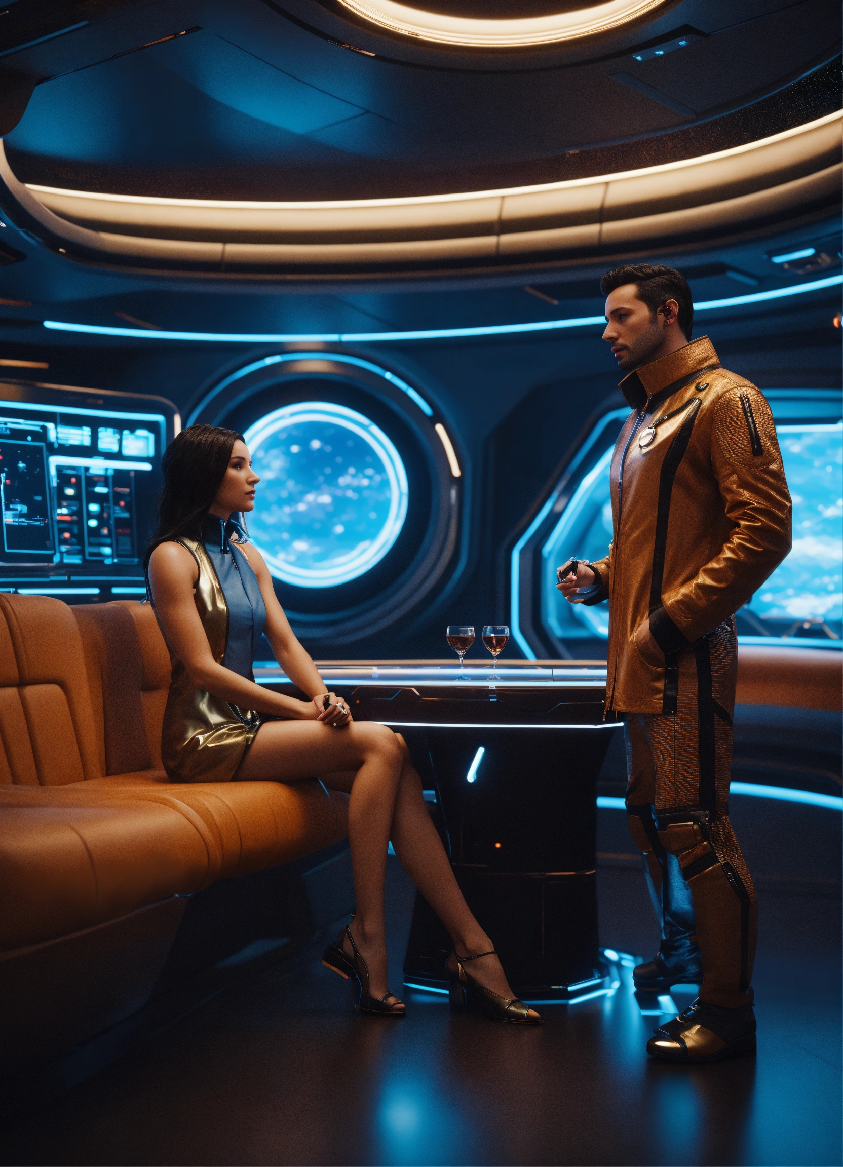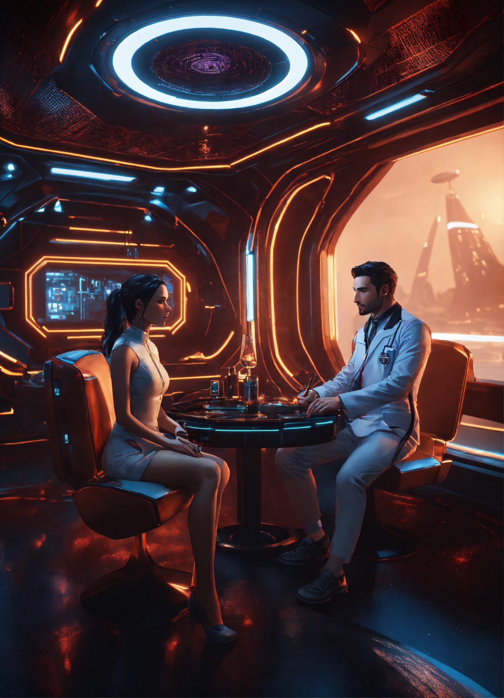 35 year old male doctor with dark hair in futuristic clothing, talking to 2 beautiful girls in a dark lounge on a luxurious hi tech space space yacht, realistic, futuristic, sci-fi, 8k, unreal engine