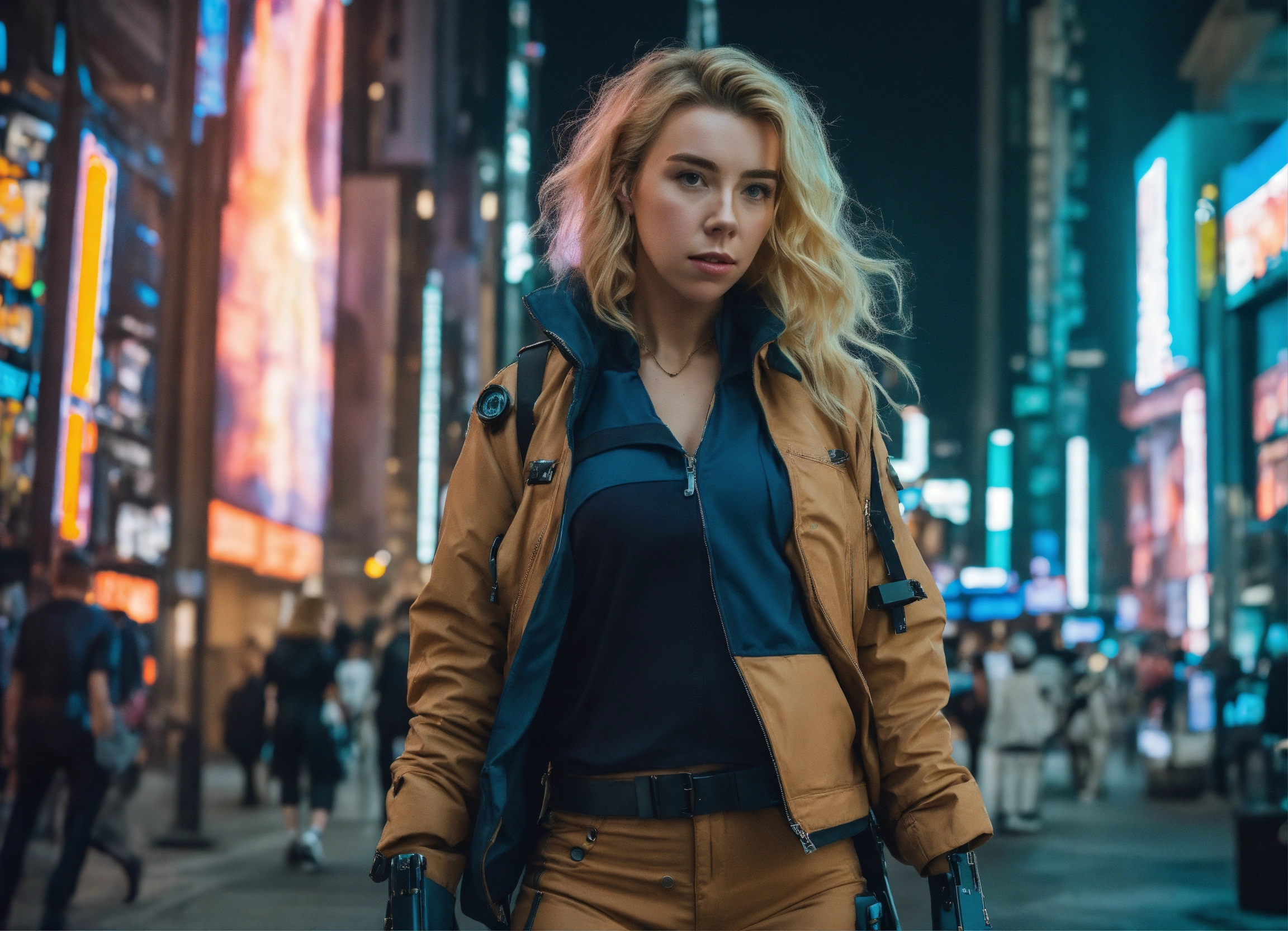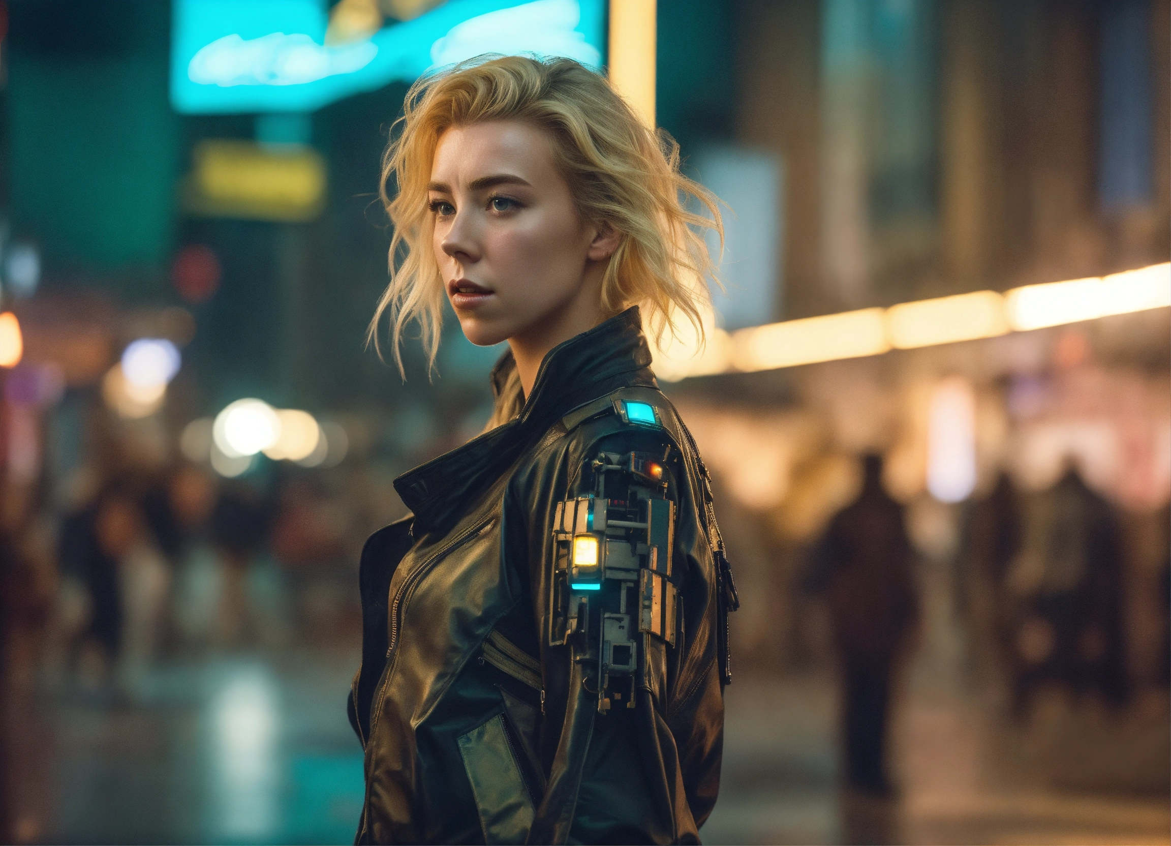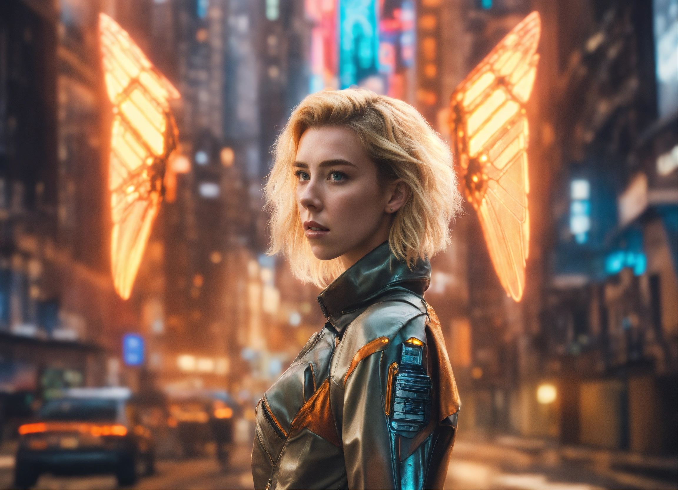 Text full body top view real life photo of a women looking aroused she looks like vanessa kirby has blond hair 18 year old woman with big angelwing's wearing mechsuite in a cyberpunk like city