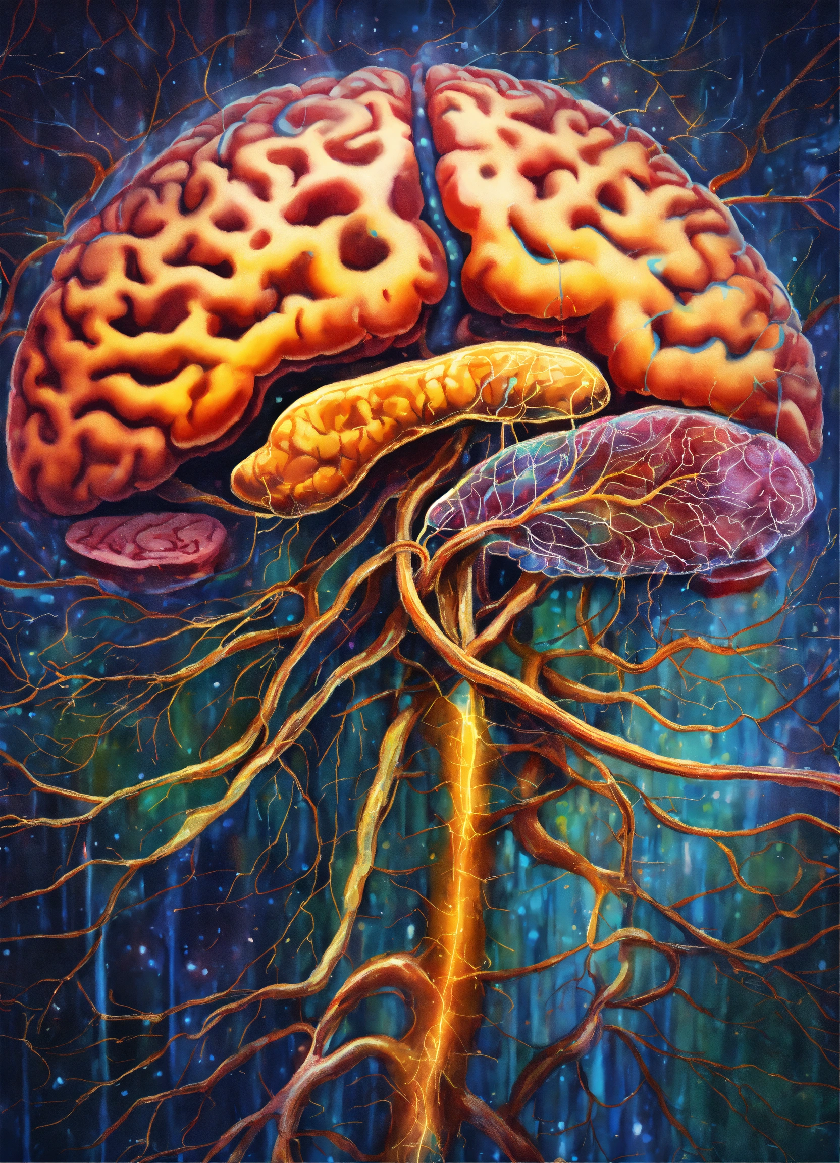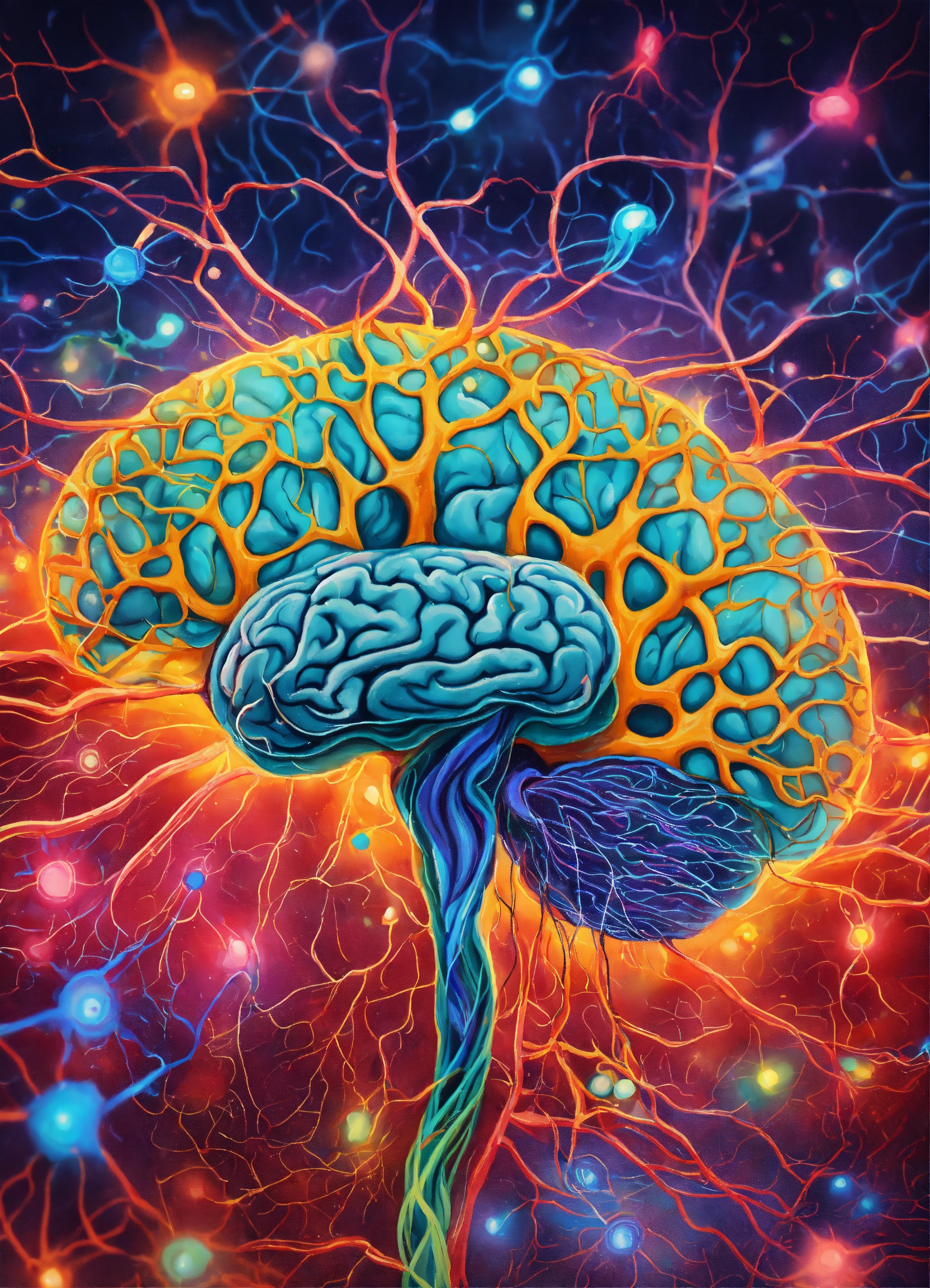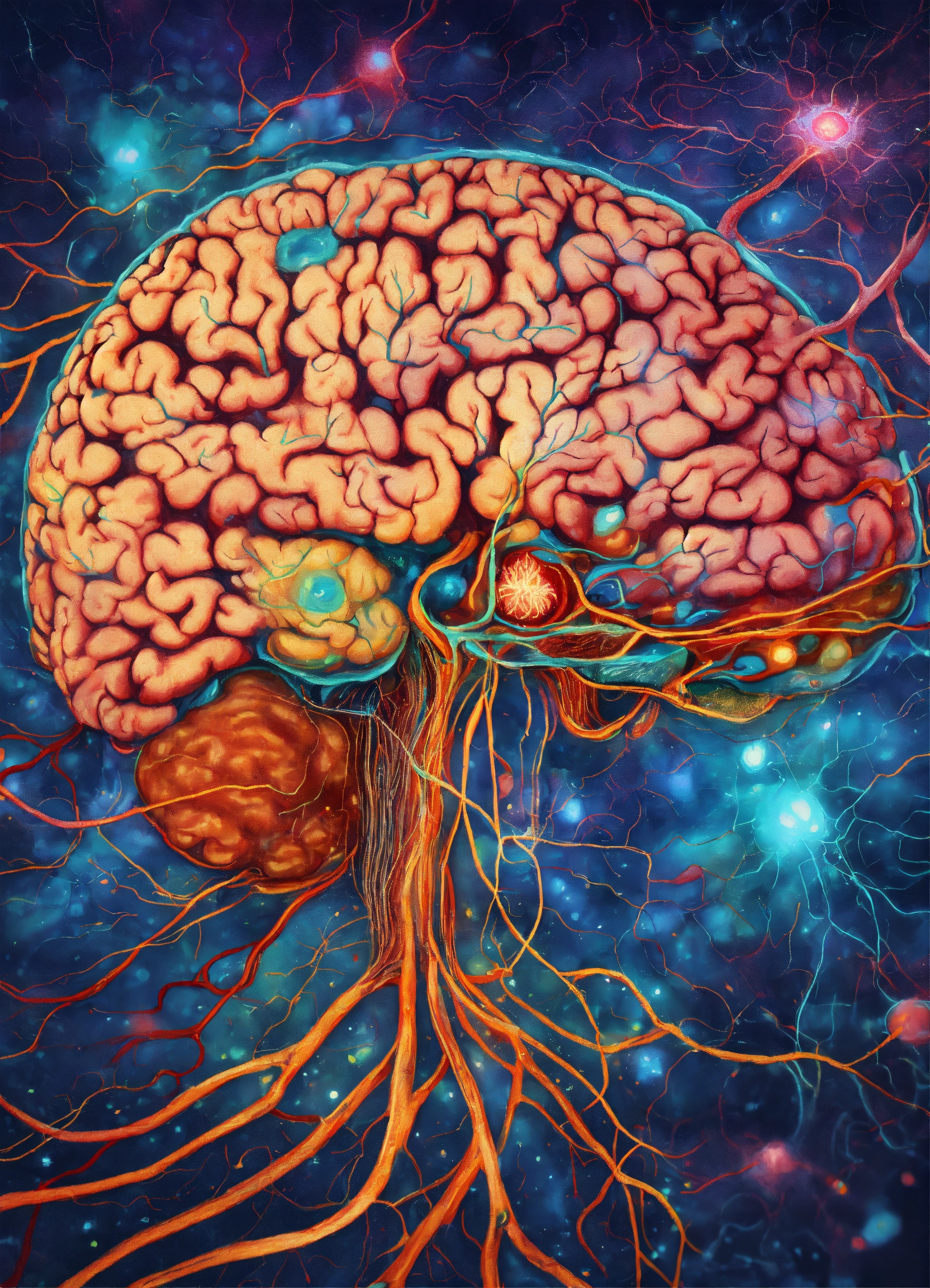 A hand drawn painting of the inside of a human brain with synapses, neurons and neural networks, 8k, sharp, vibrant, vivid