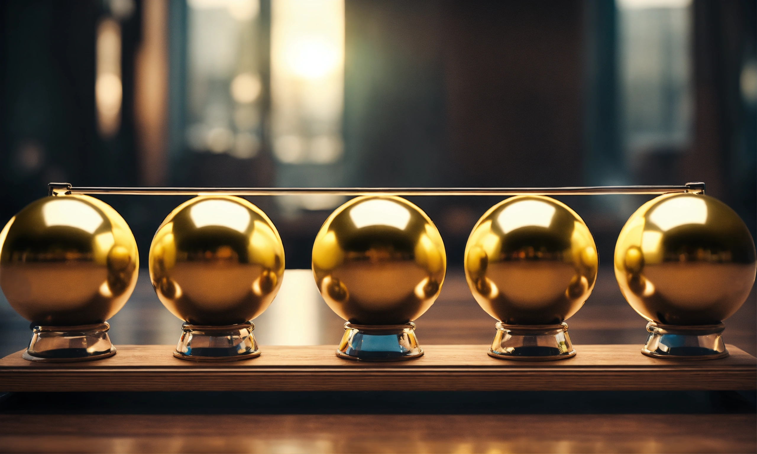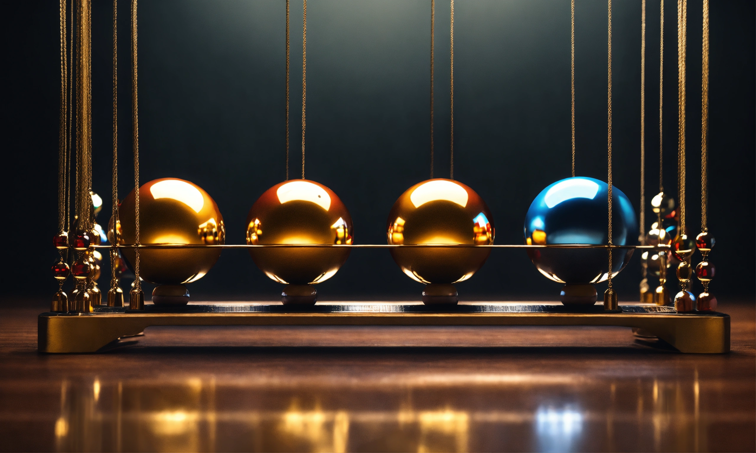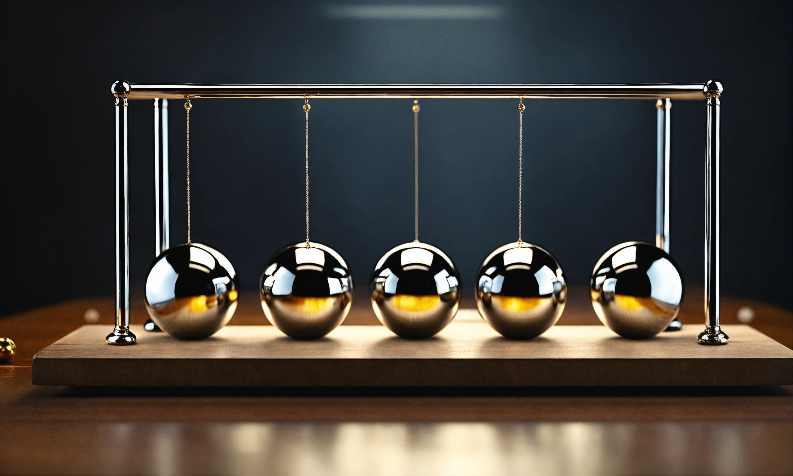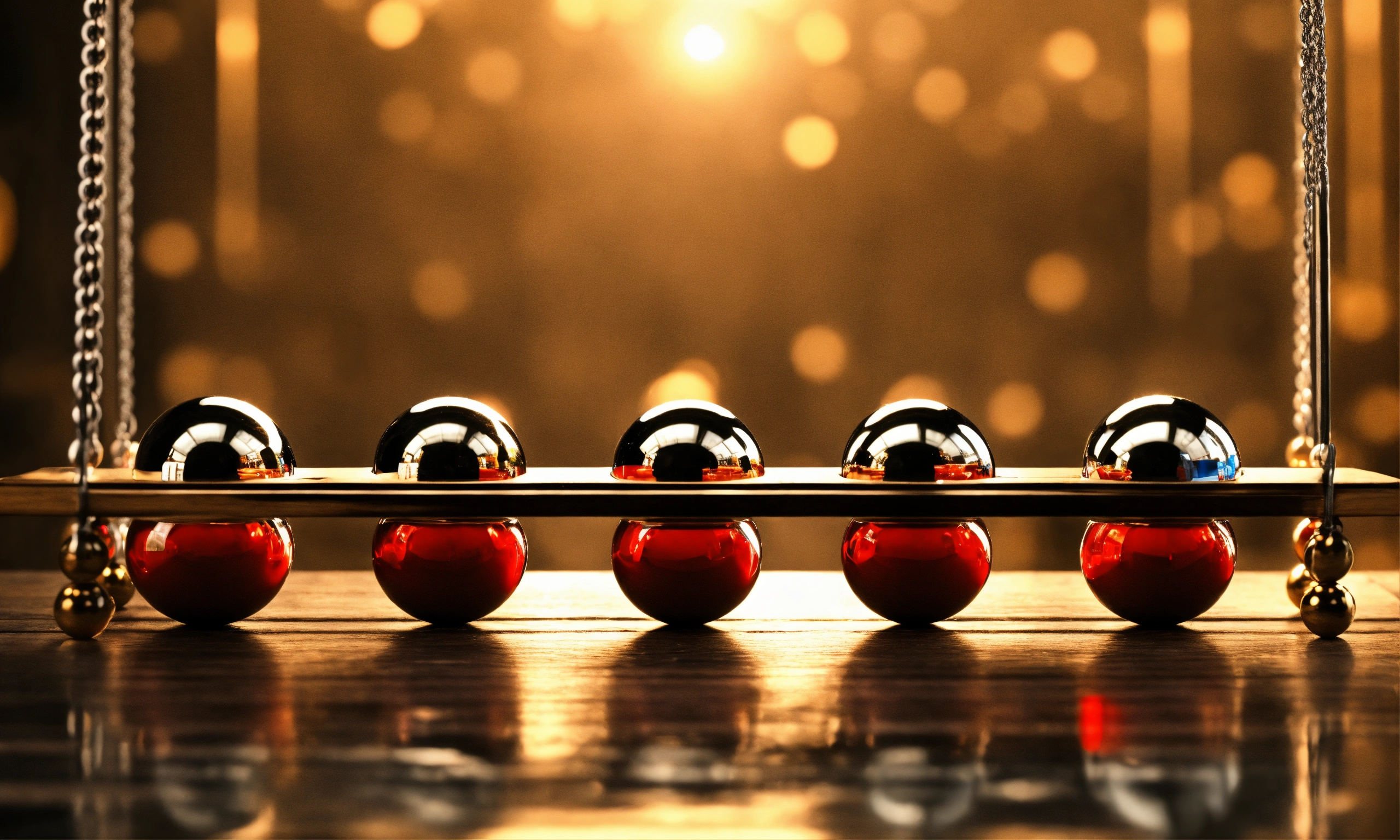 Five balancing balls newtons cradle, human faces reflections on balls, photo-realistic, 8k, high definition