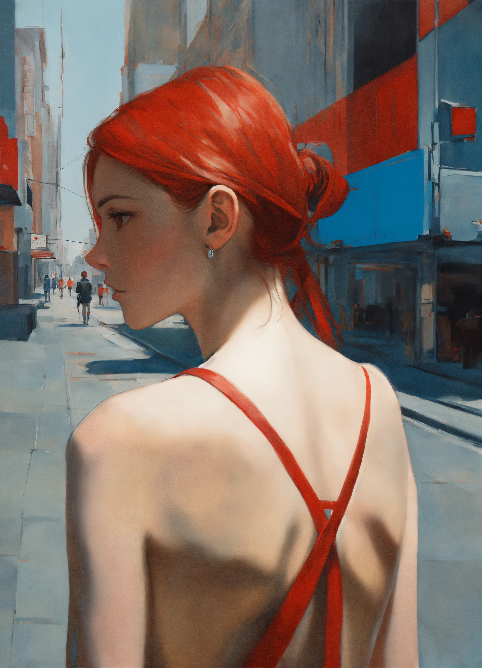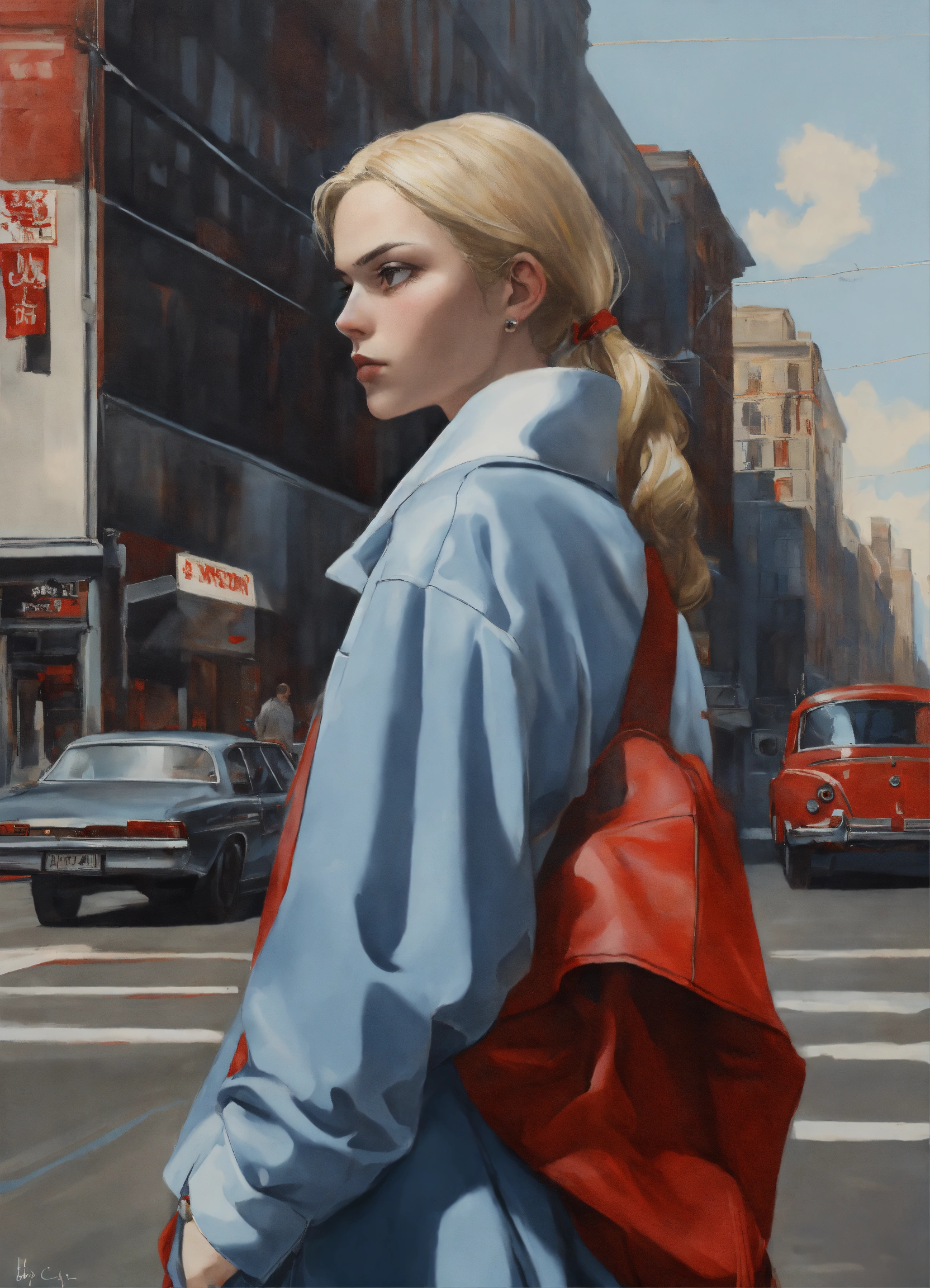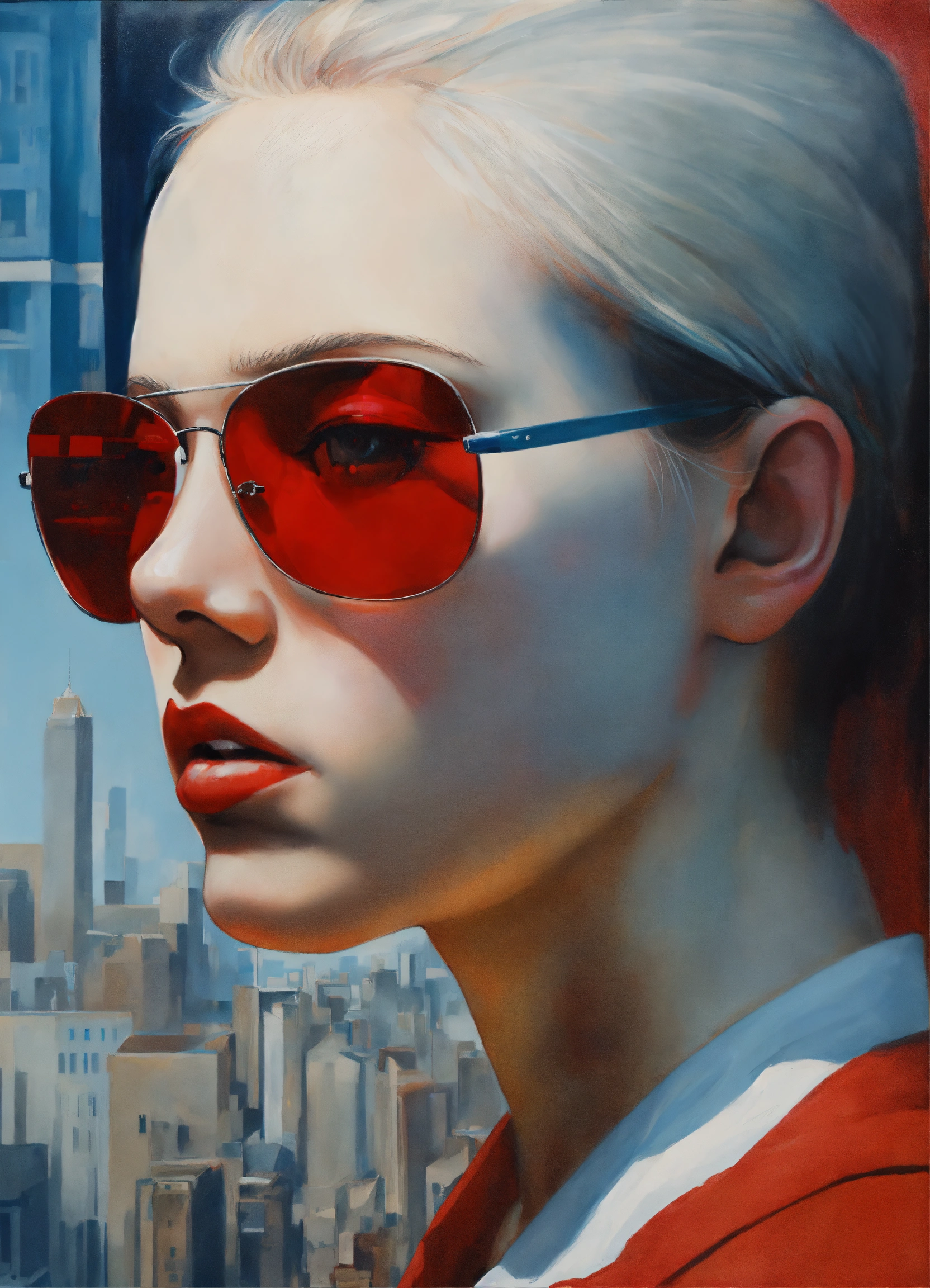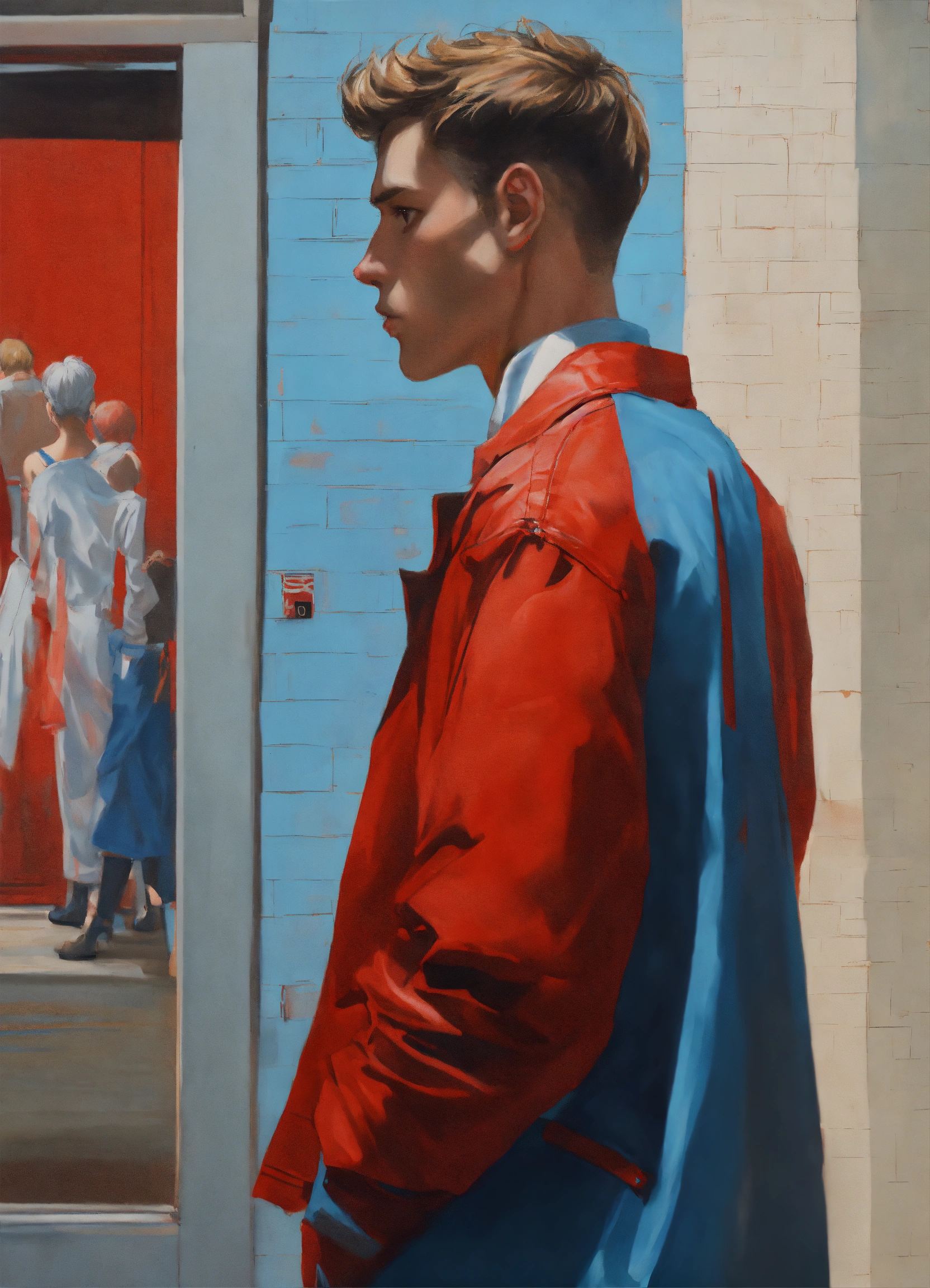 Superrealist style, urban style, a person with a dishonest gaze, turned toward the back a little, red, white, pale blue