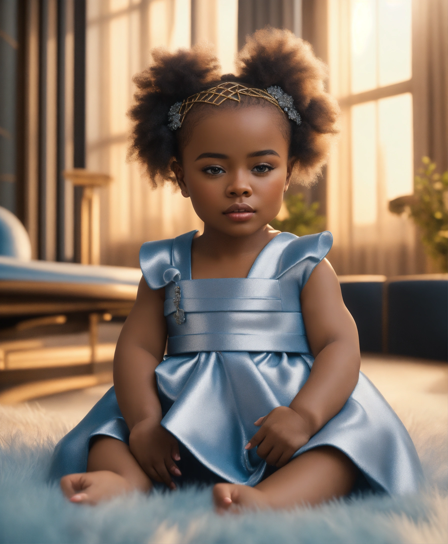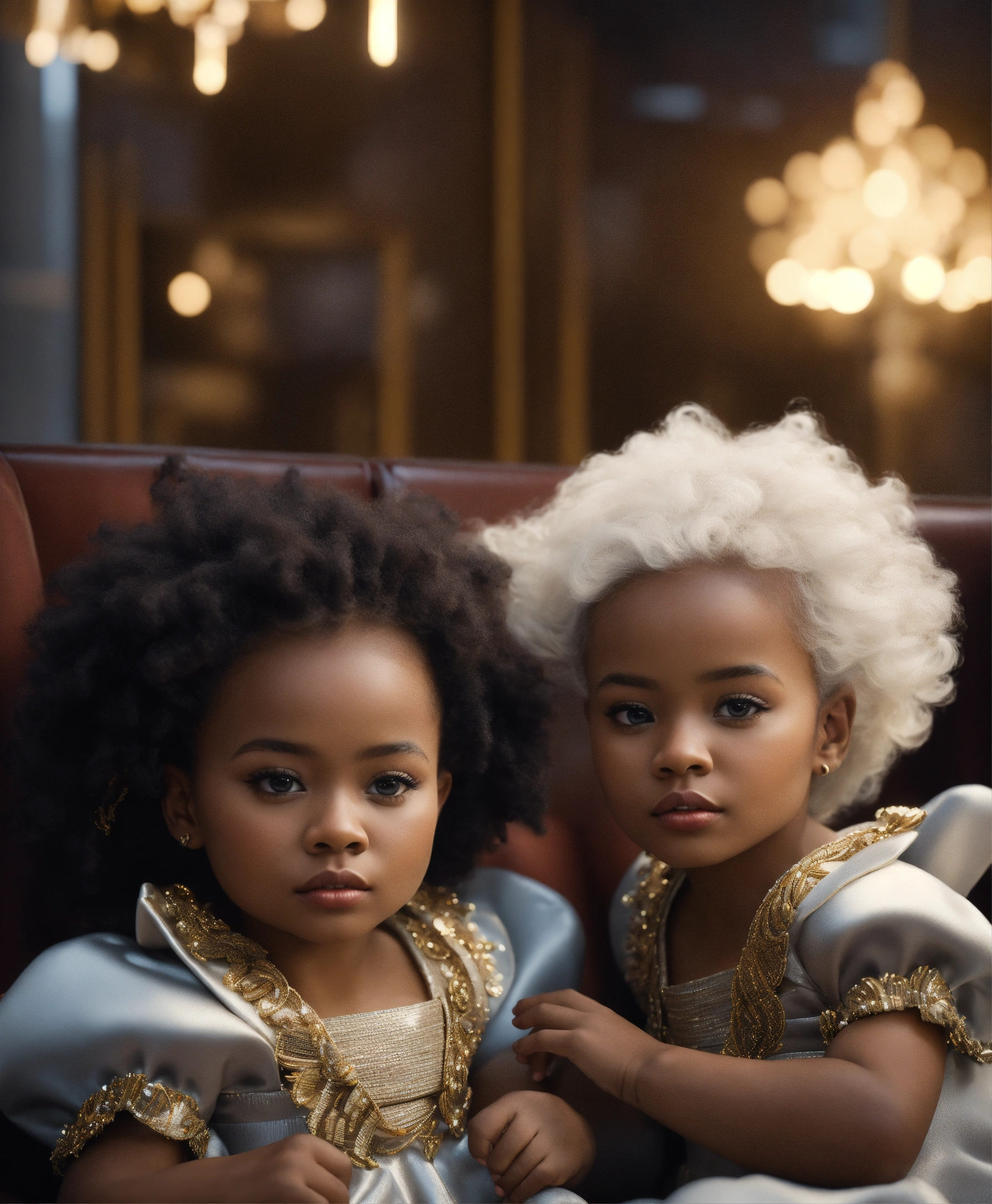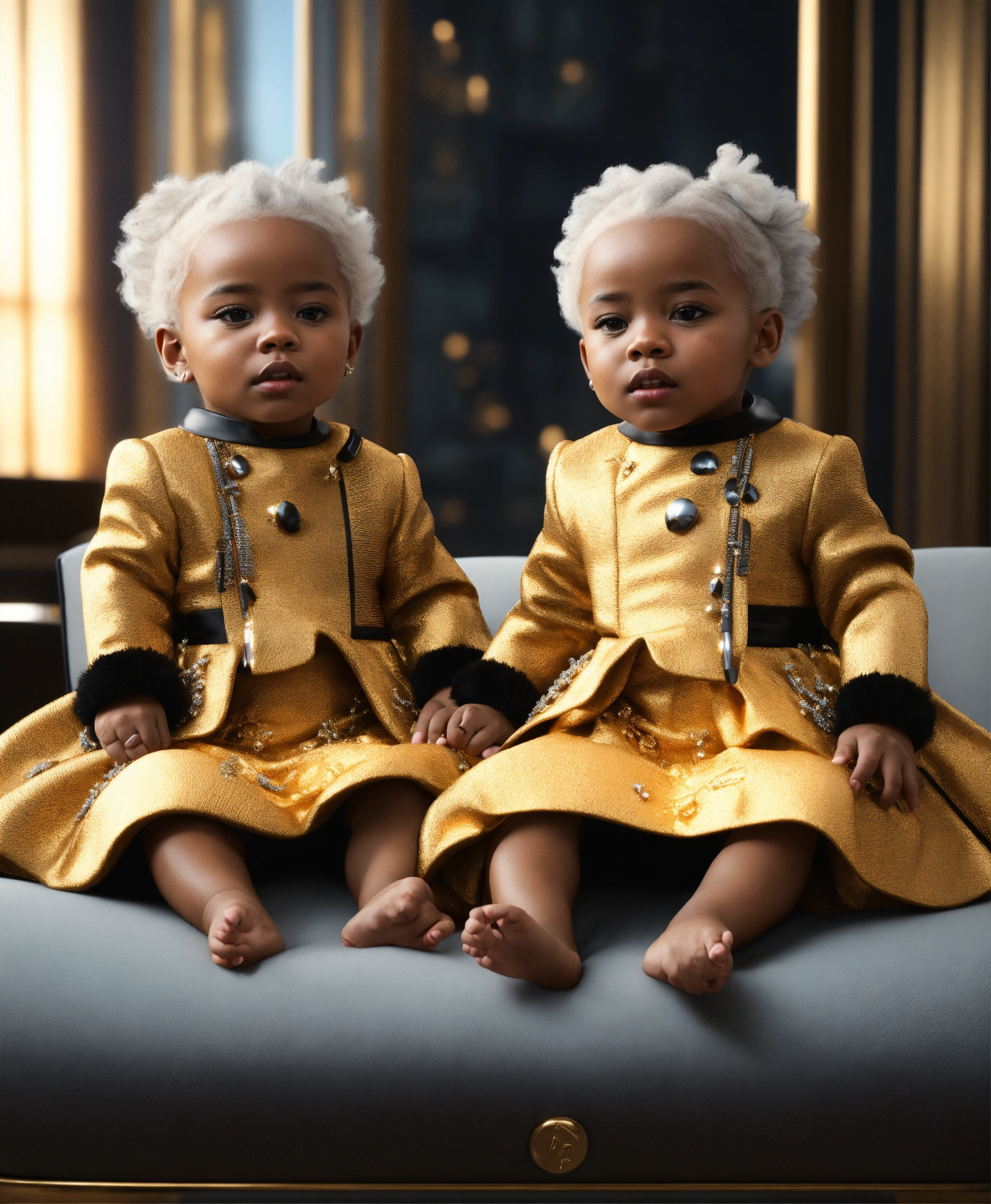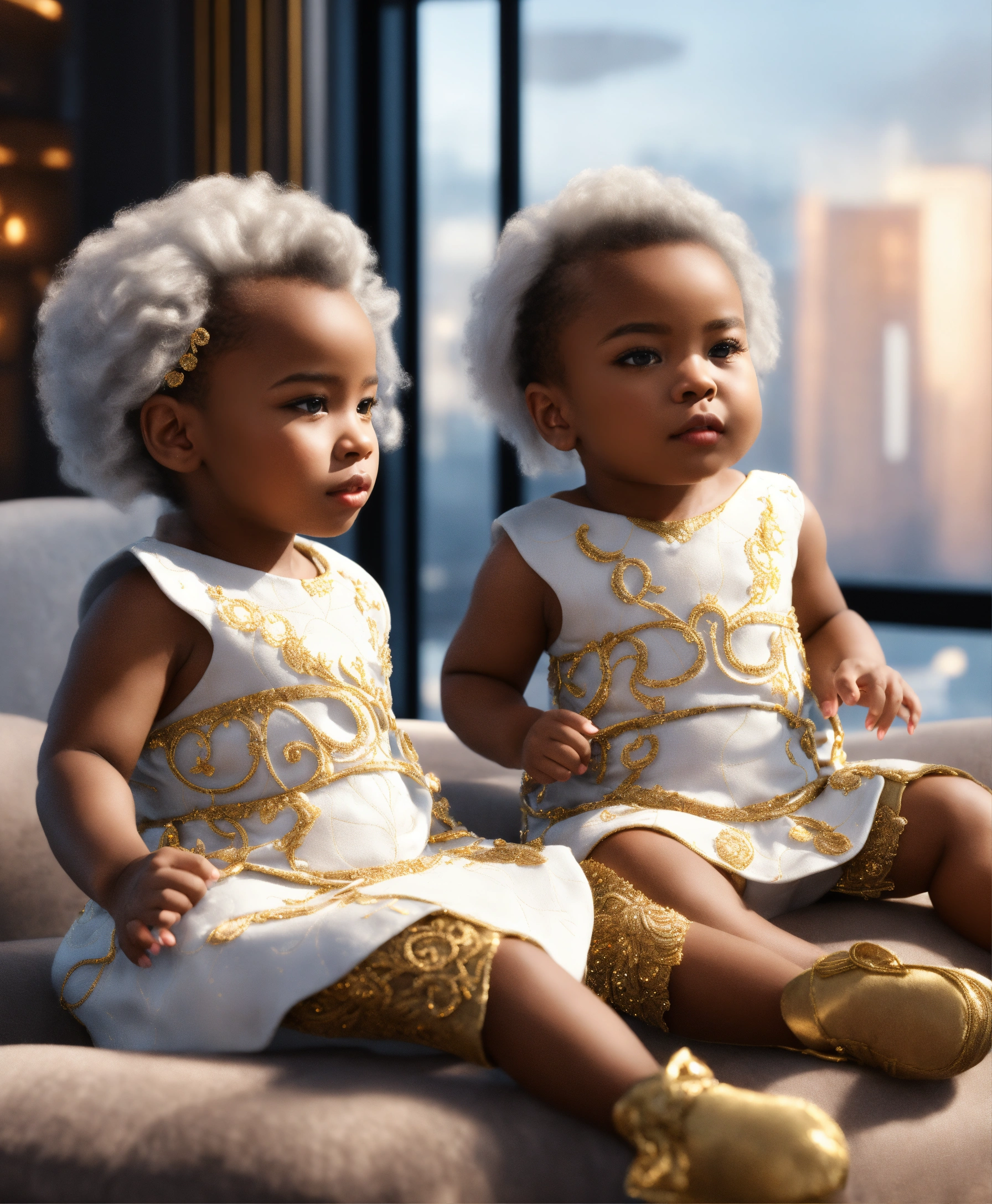 Gorgeous 4-month-old, fraternal twins, one twin white hair. african features, one twin brown-skin, black curly hair, in haute couture dresses. sitting in upscale futuristic penthouse, regal persona. cinematic style, high detail, realistic physics, photorealistic, unreal engine, hdr, 8k