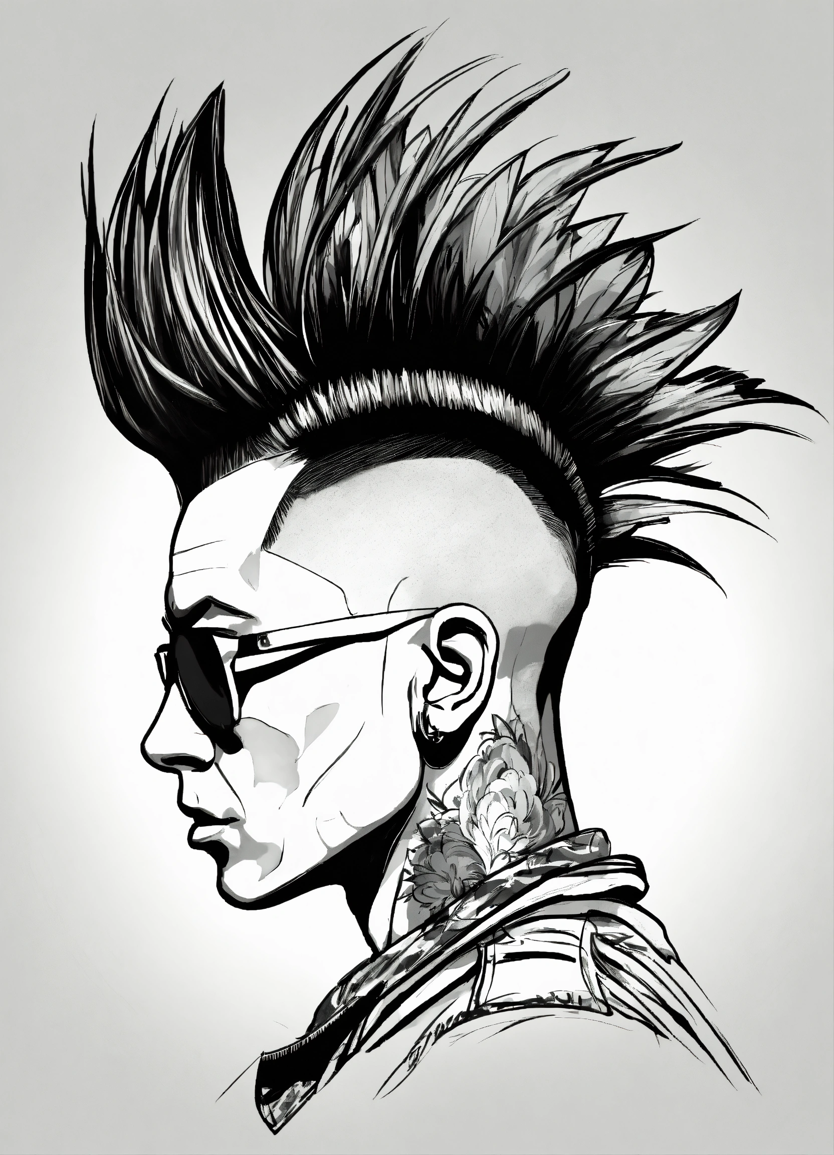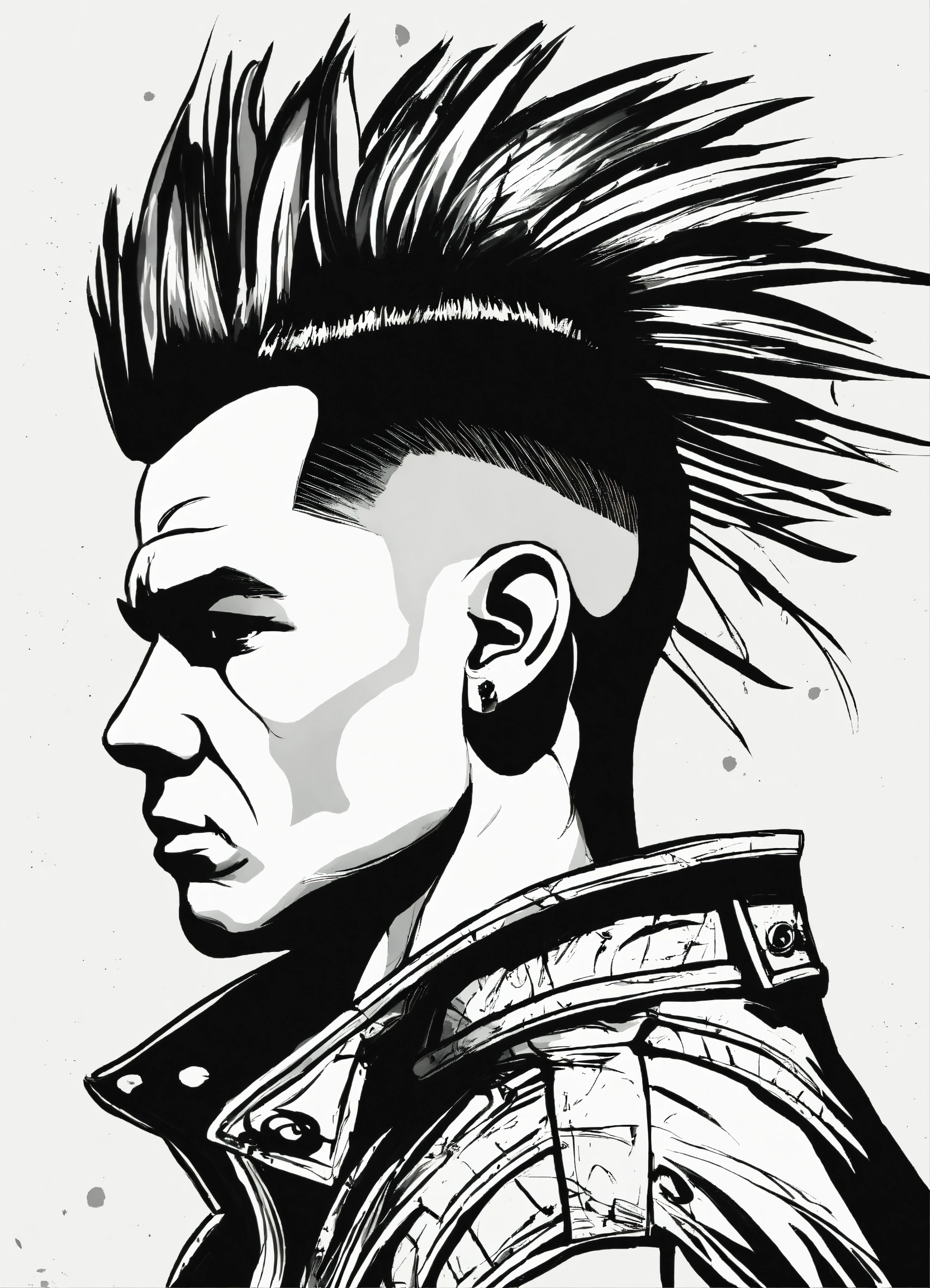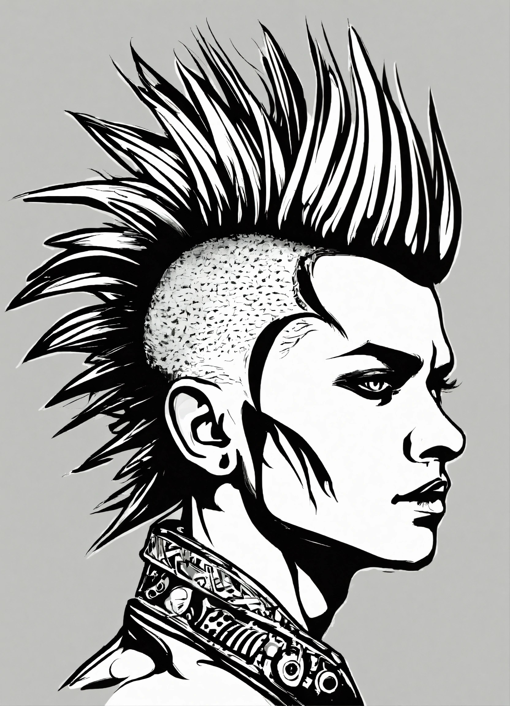 Mohawk hairstyle, black and white, white background, no background, ink fine line art stylized, vector, design for tattoo, ignorant style.