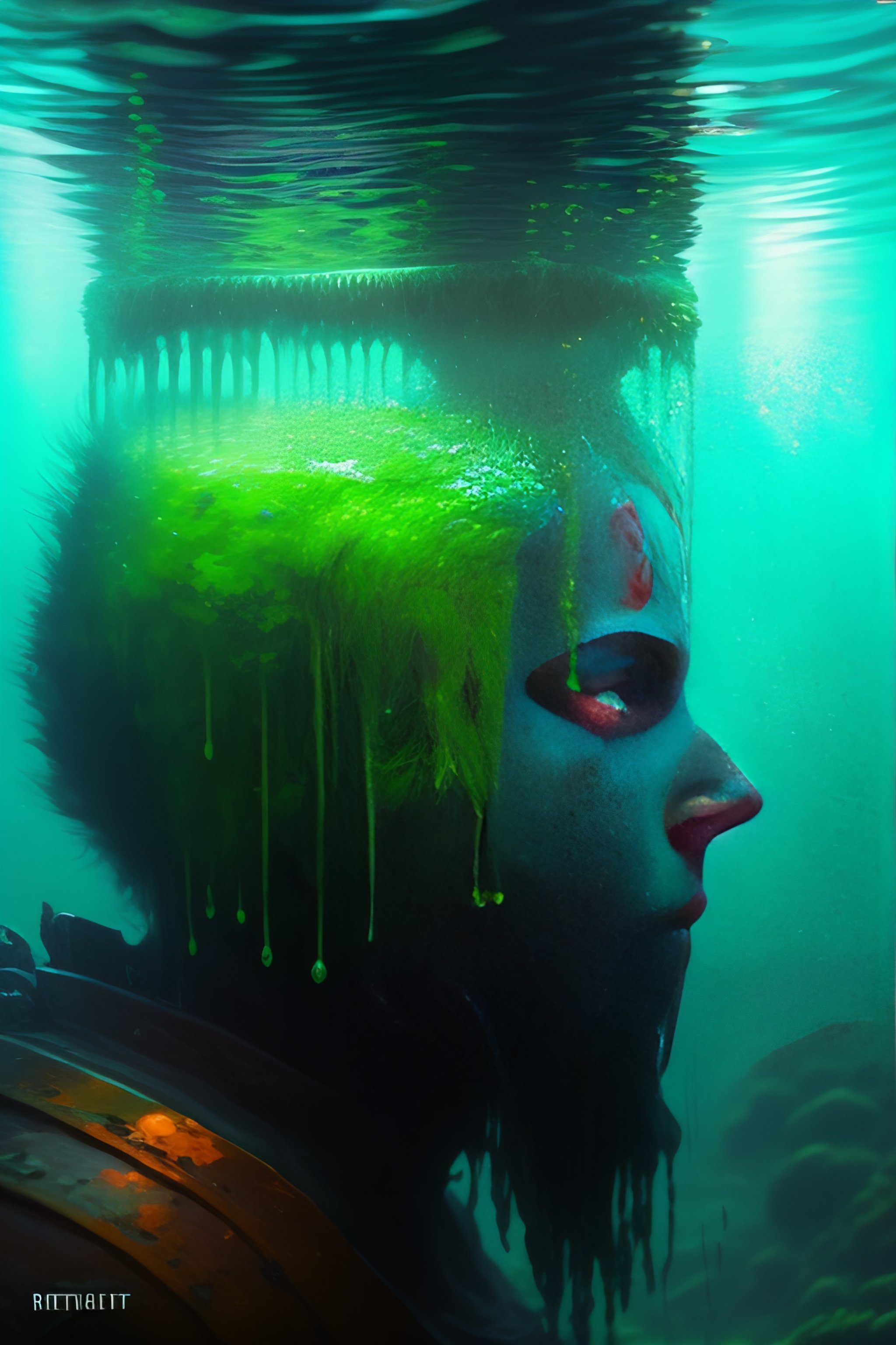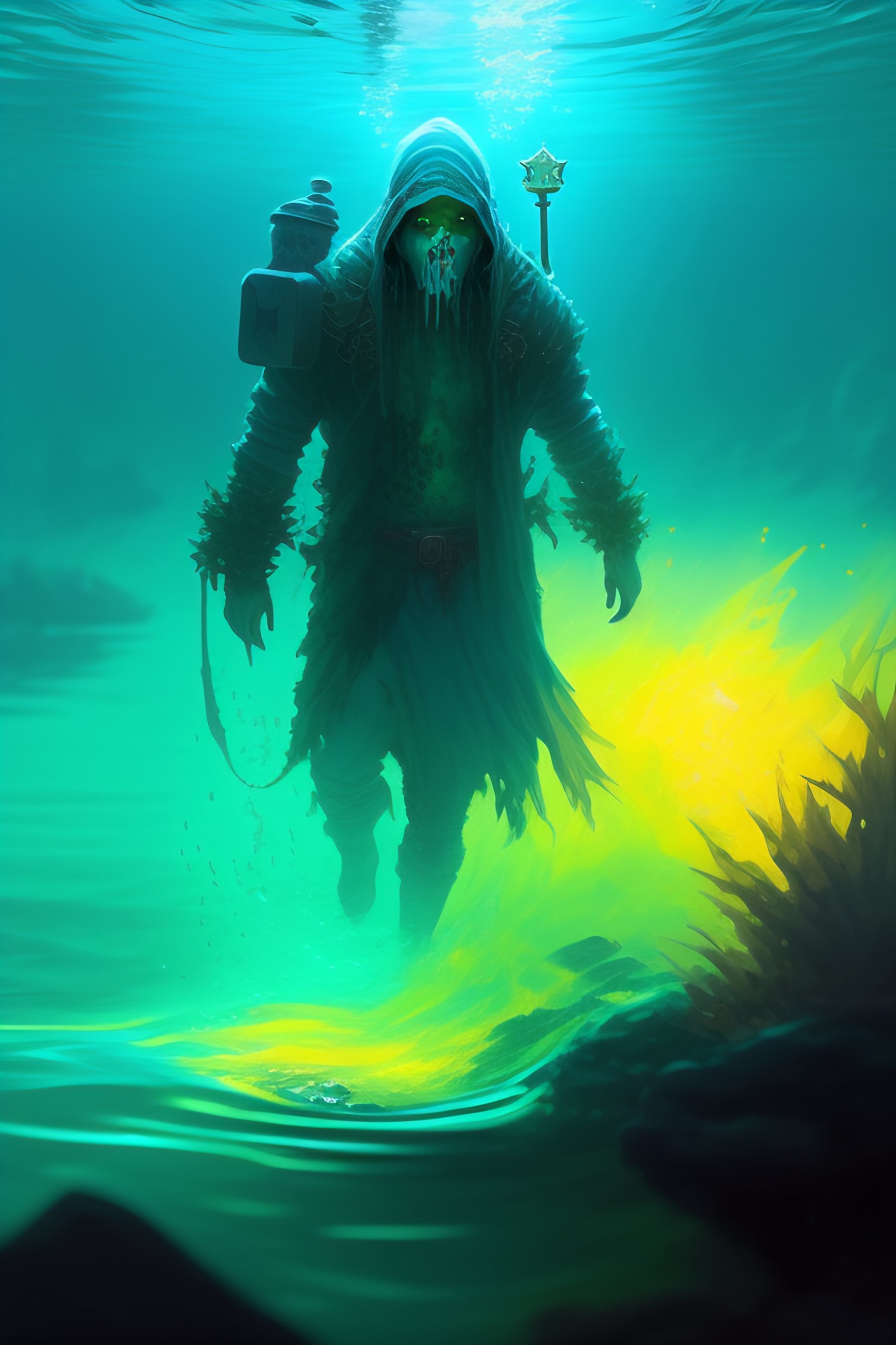 Painting by greg rutkowski of a minecraft drowned zombie with glowing cyan eyes, wearing ragged clothing and and algae growing on it, holding a trident, underwater