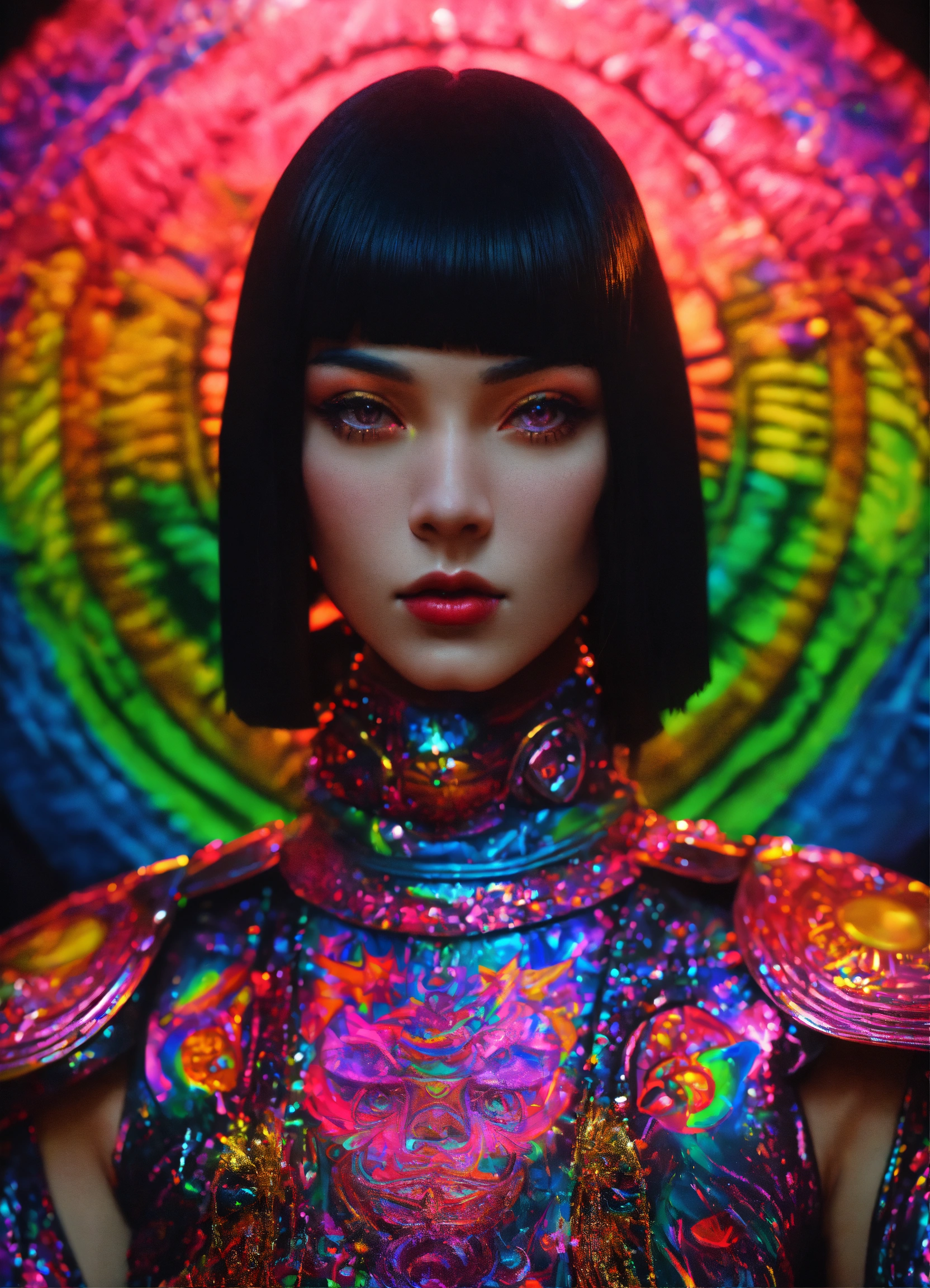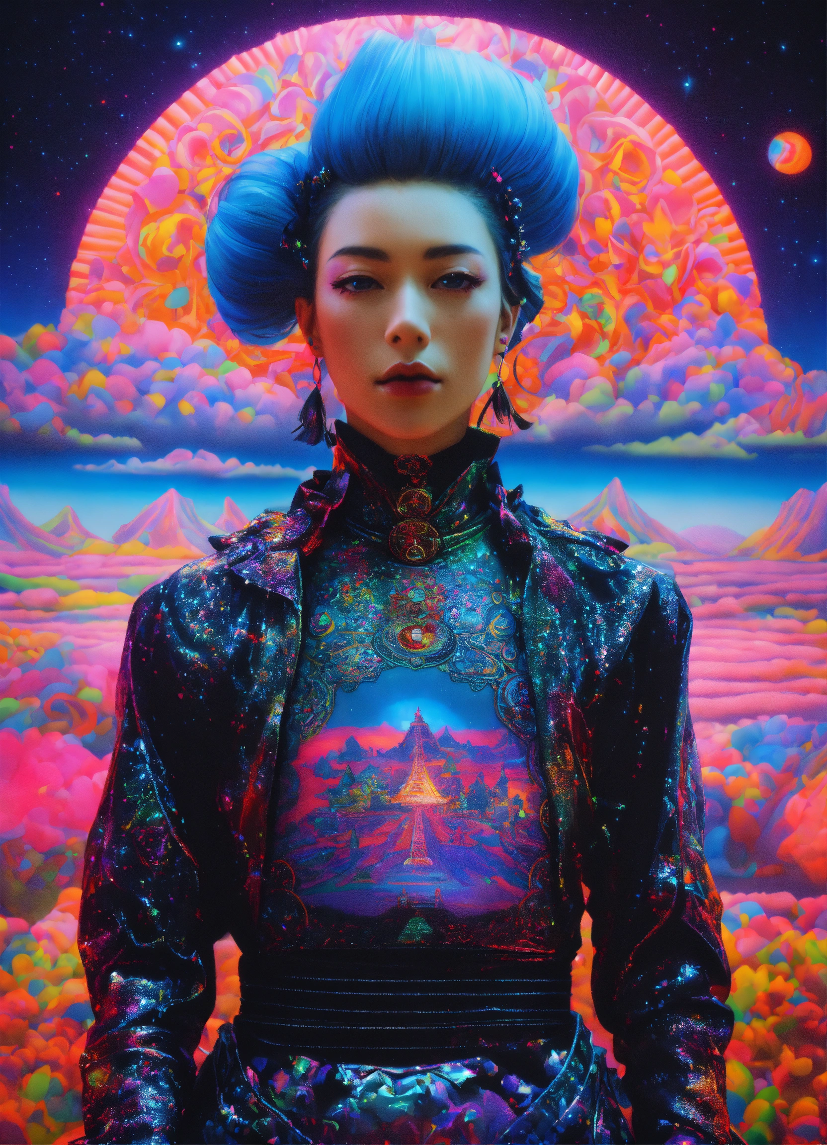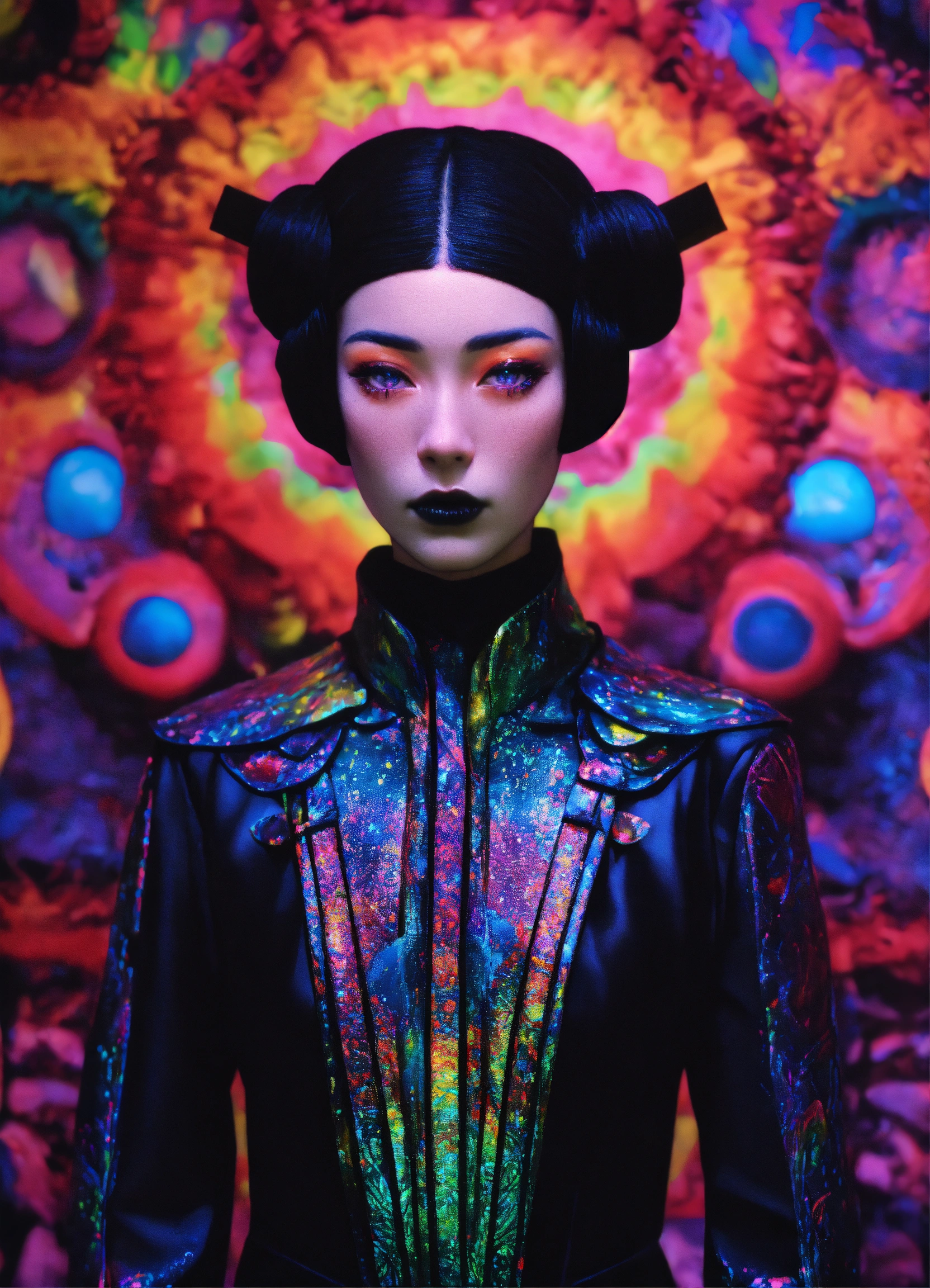 Photorealistic 3d portrait of gorgeous goth emo samurai family kawaii punk rock anime folk haute couture costume, of cosmic alex grey painting in a dmt black light glitter neon black rainbow glitter holographic paris fashion night 70mm film, art by salvador dali and holy mountain the movie.