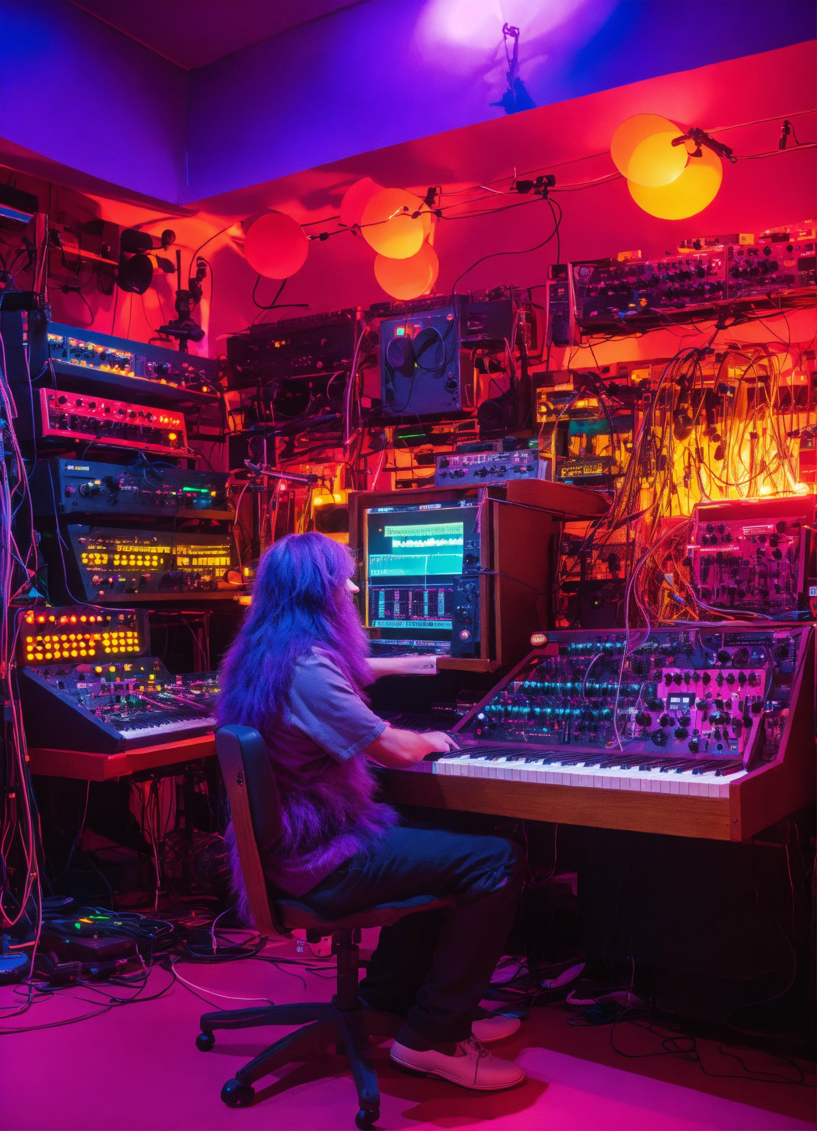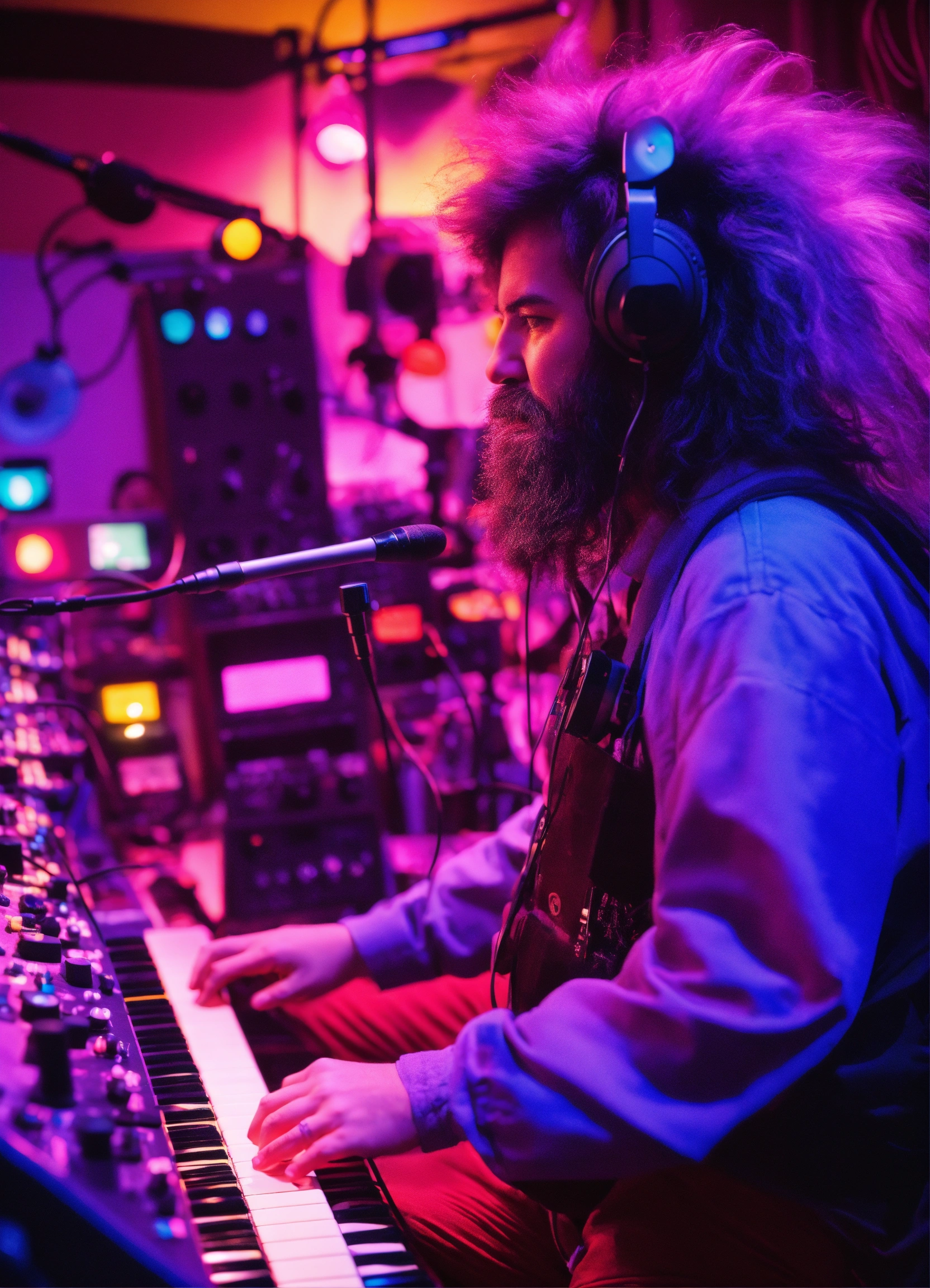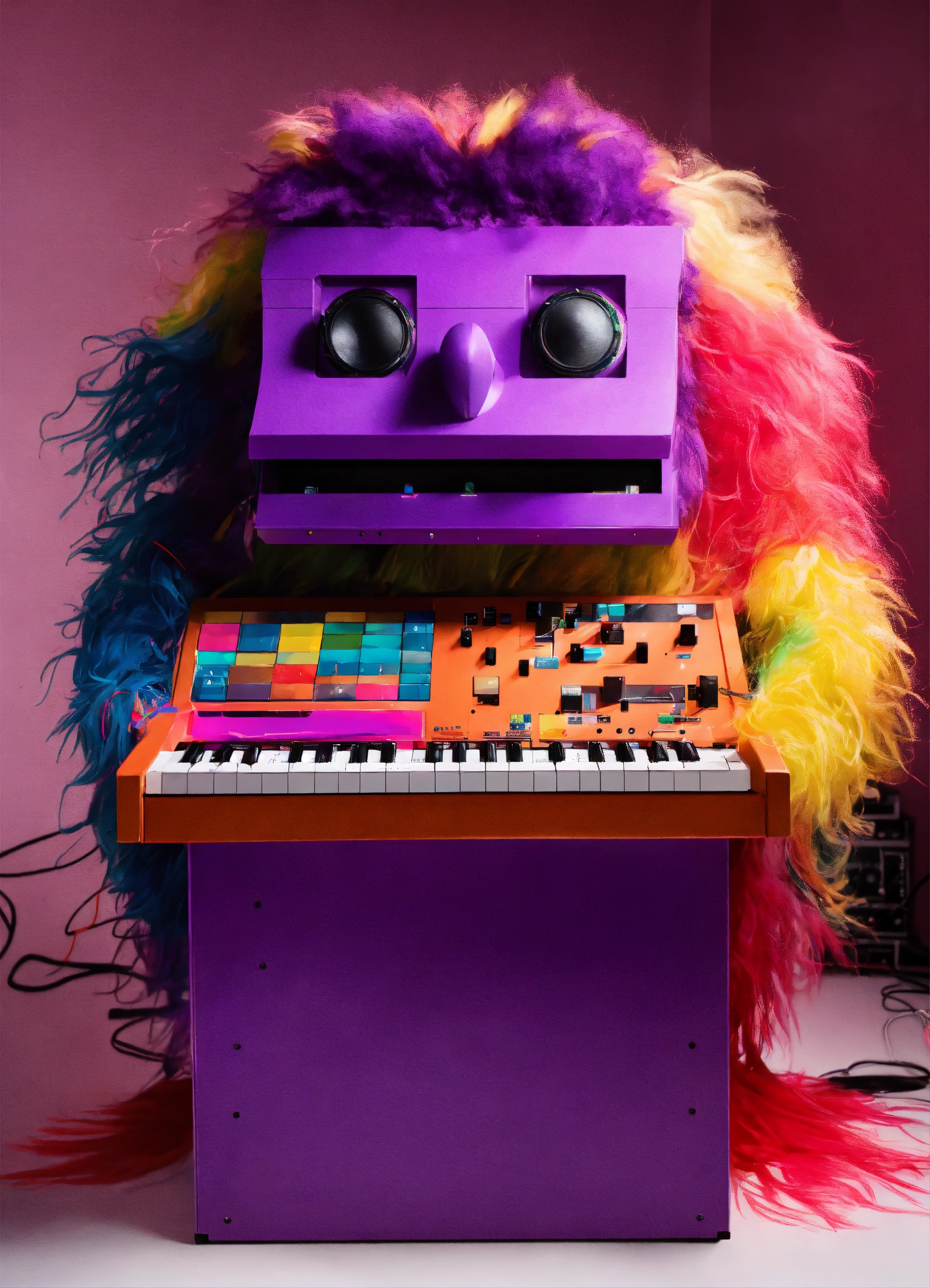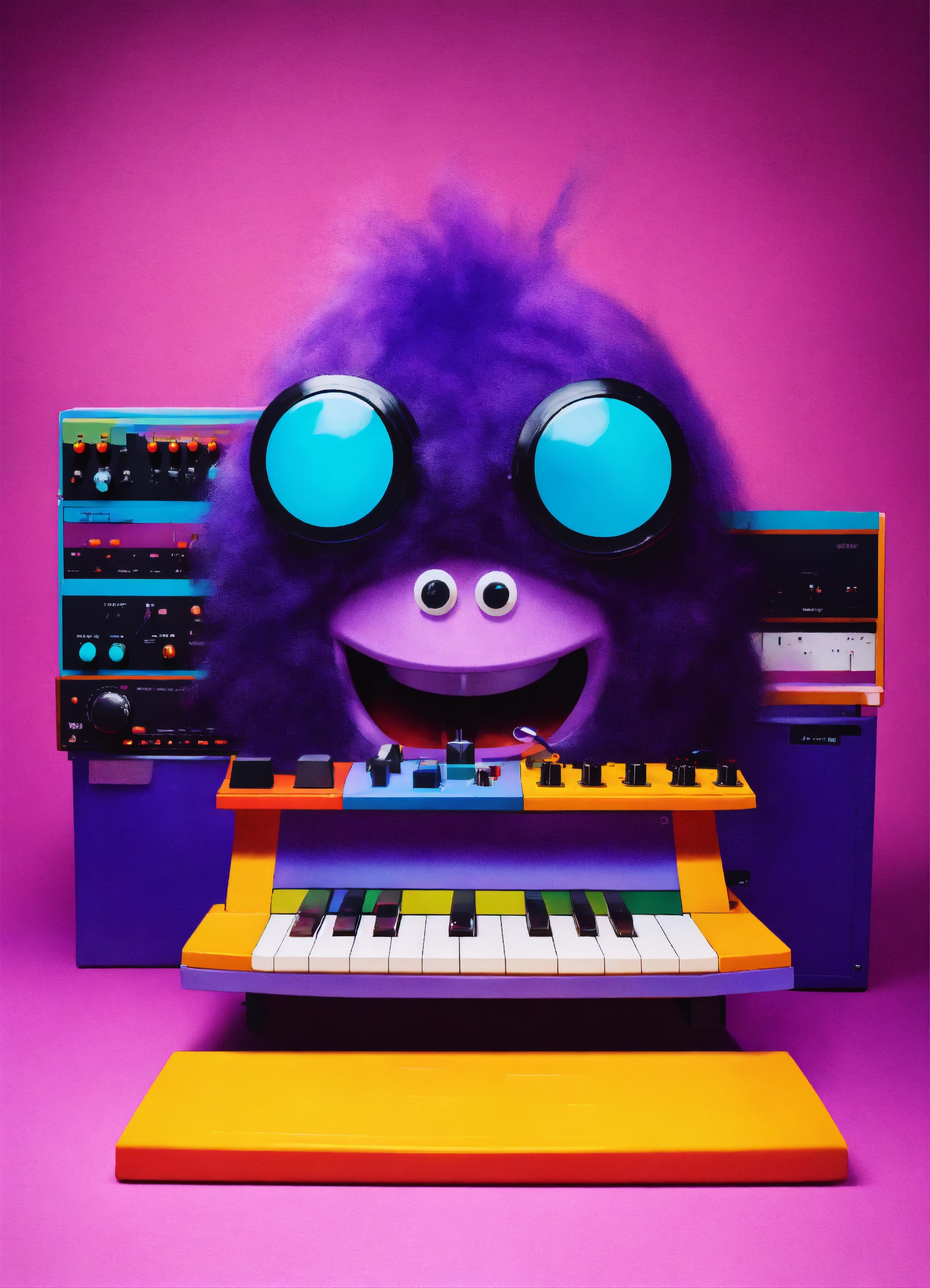 Big hairy purple grimace playing in a studio of colorful toy synthesizers that are alive with personality and waveforms