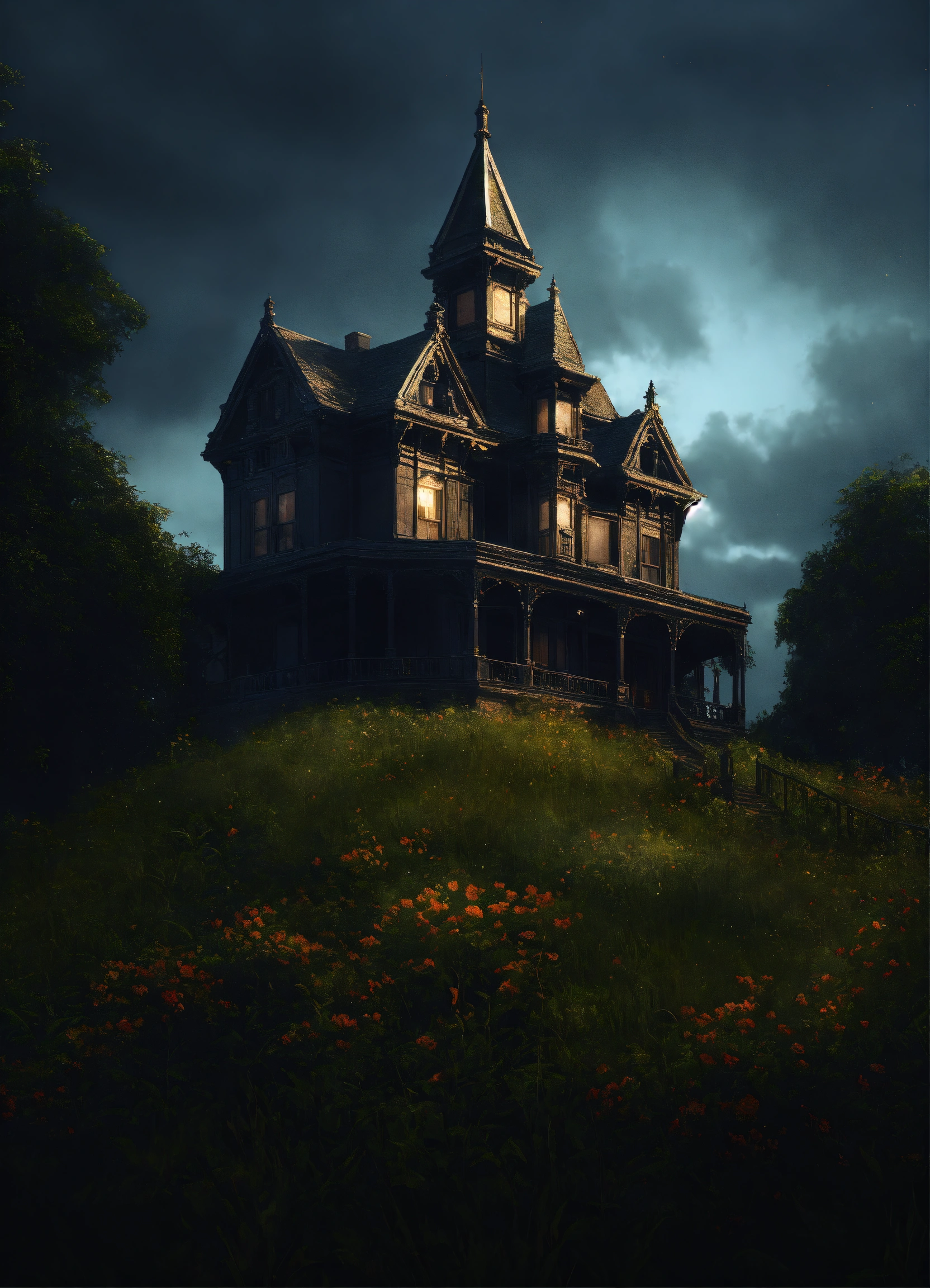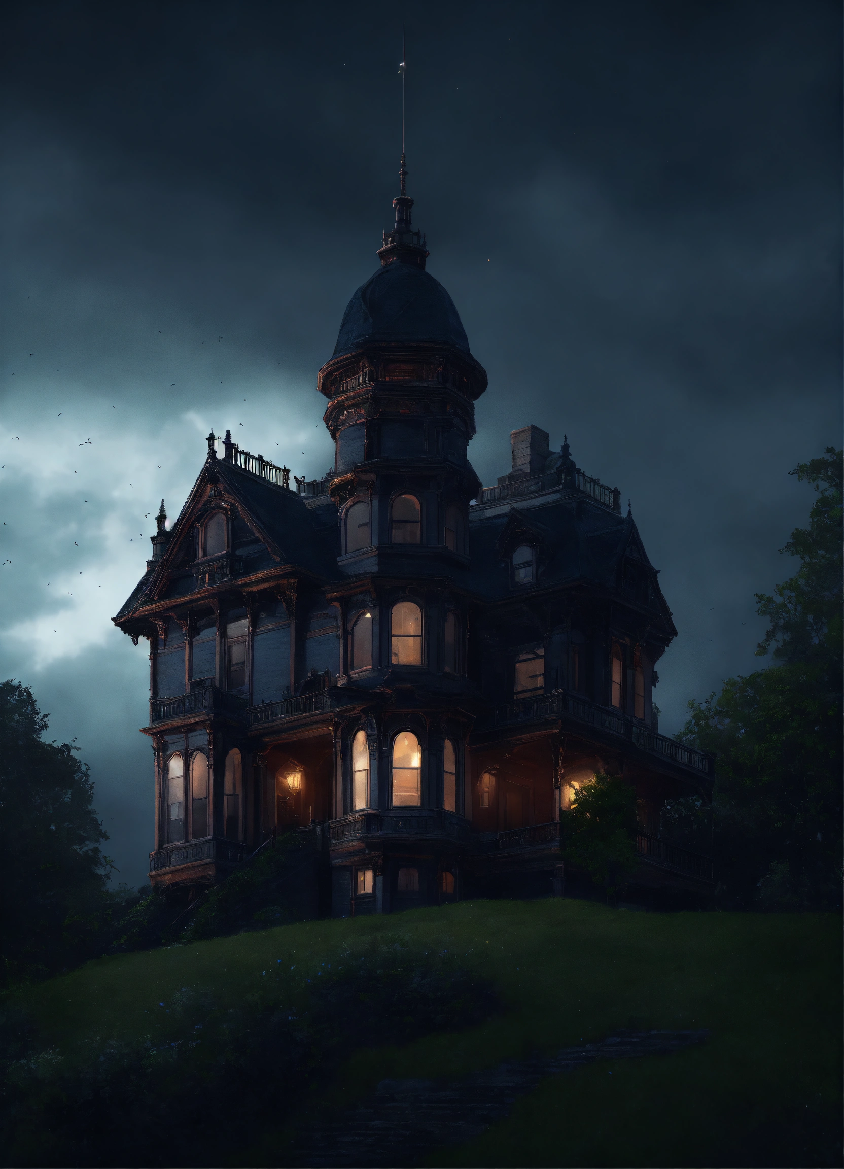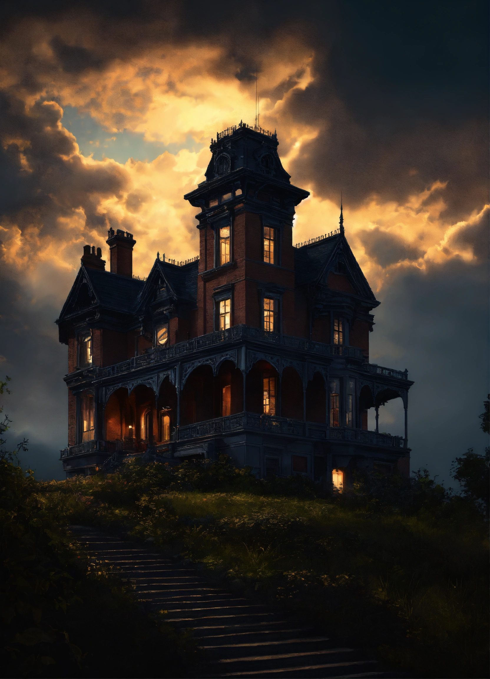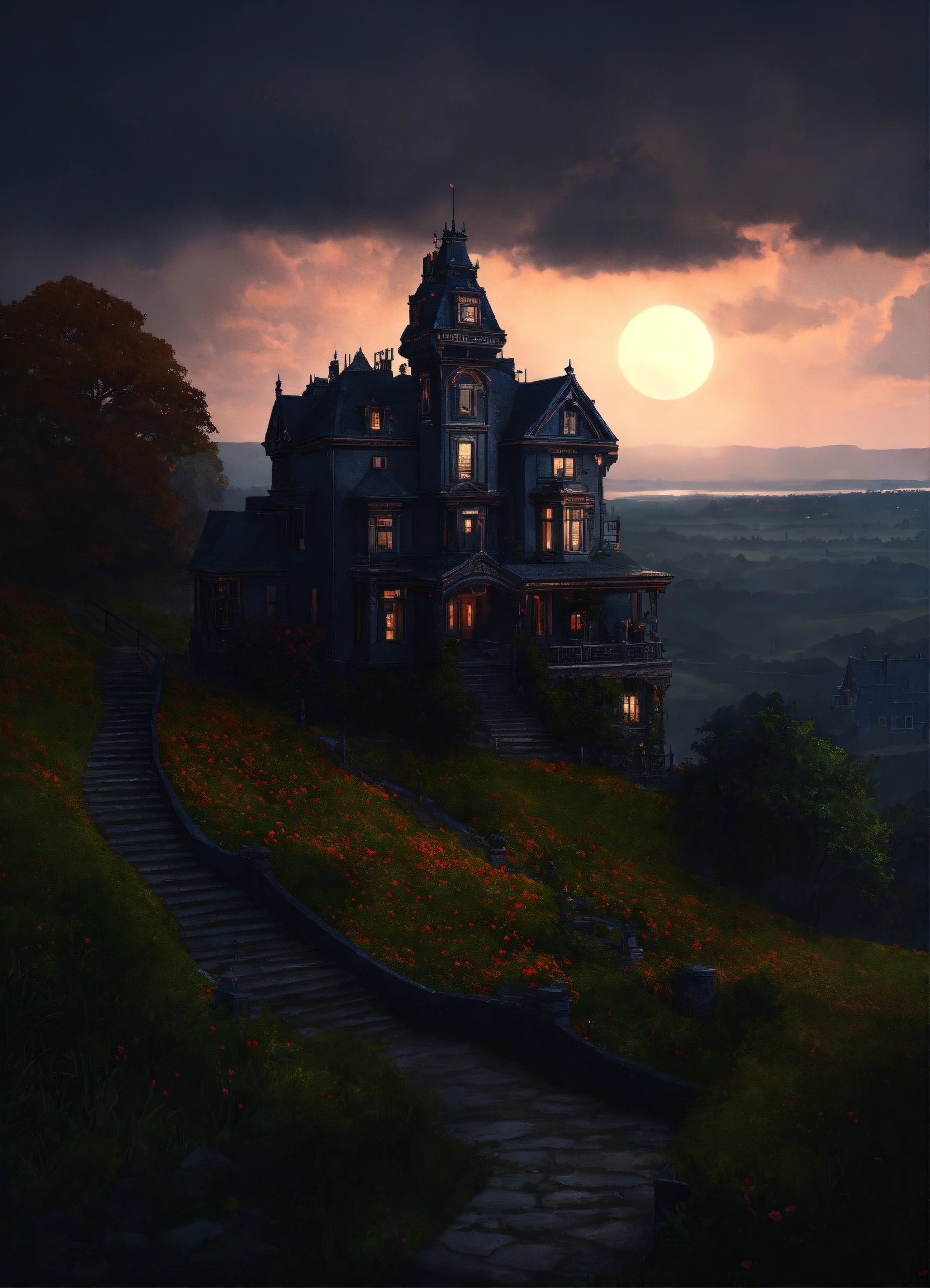 A victorian mansion at the top of a hill, silhouetted against a dark sky, digital art, artstation, highly detailed, 4k