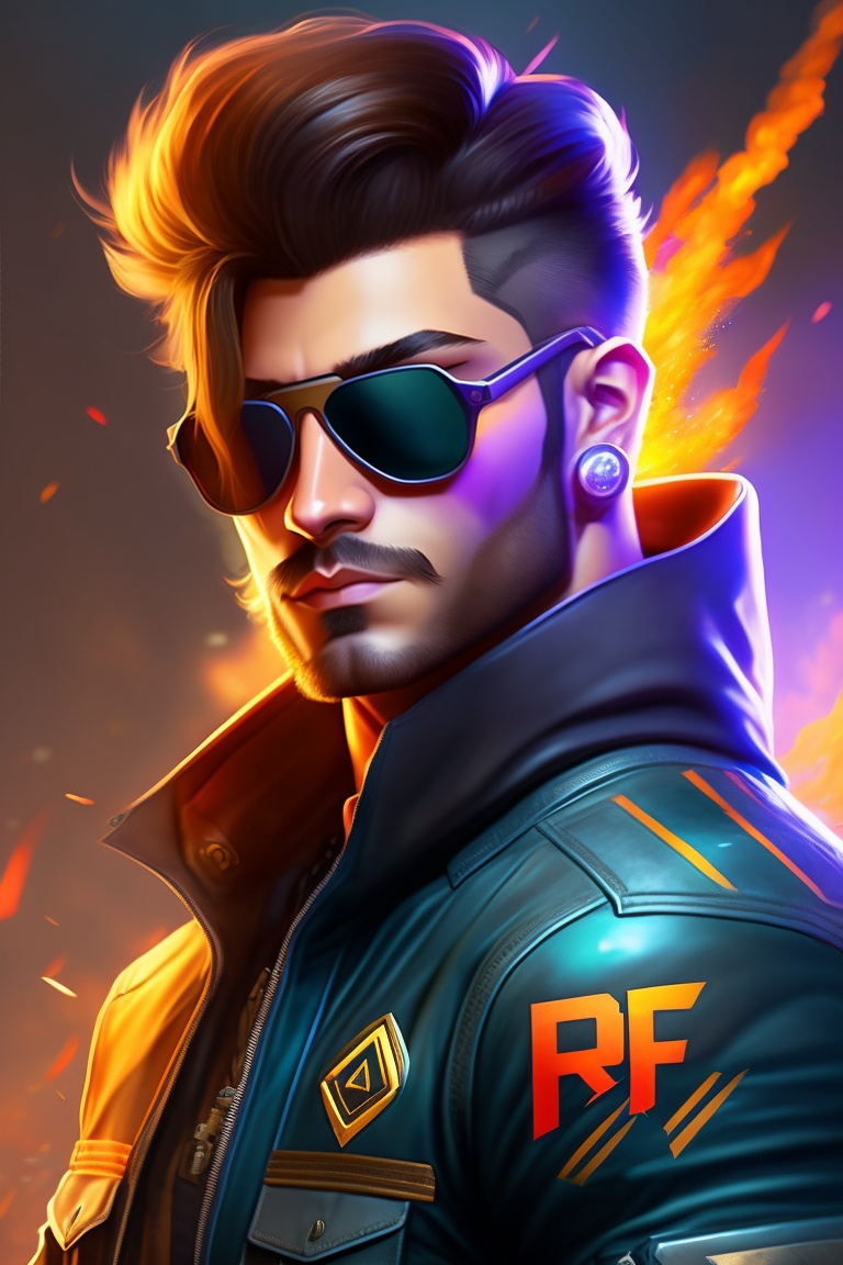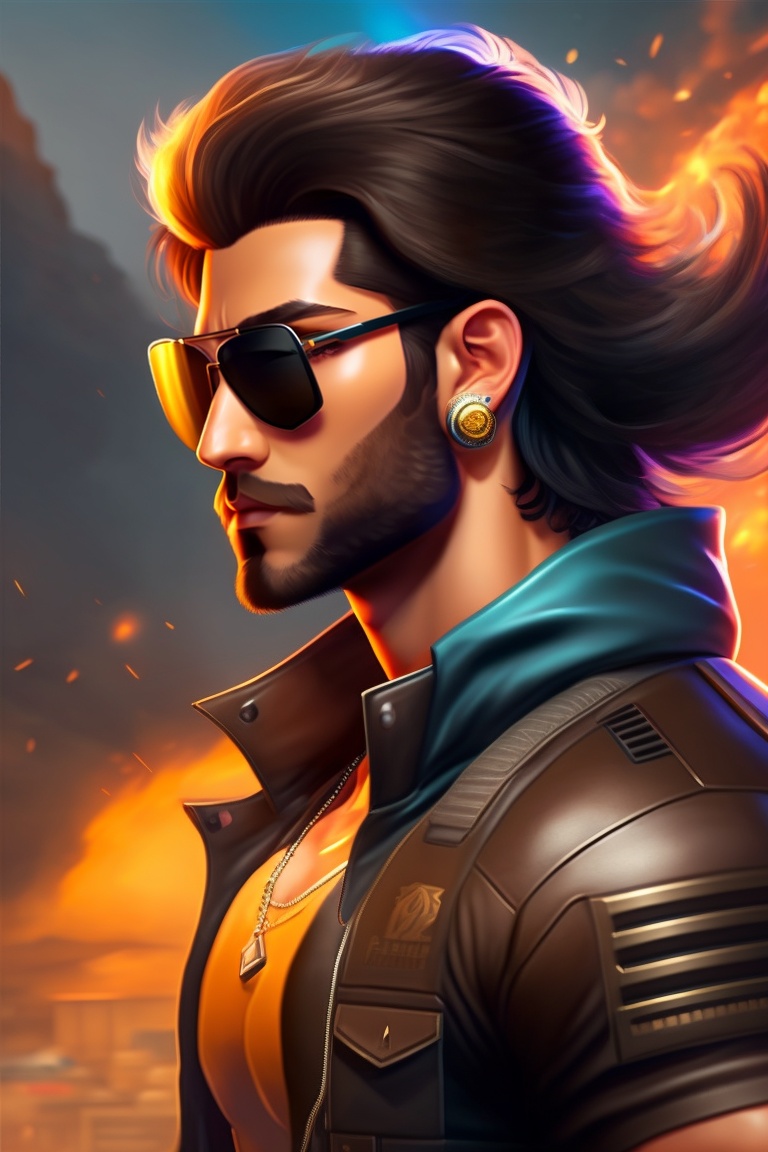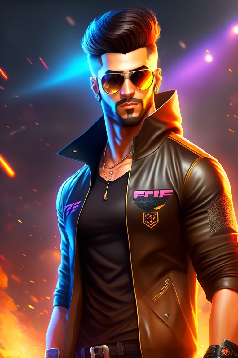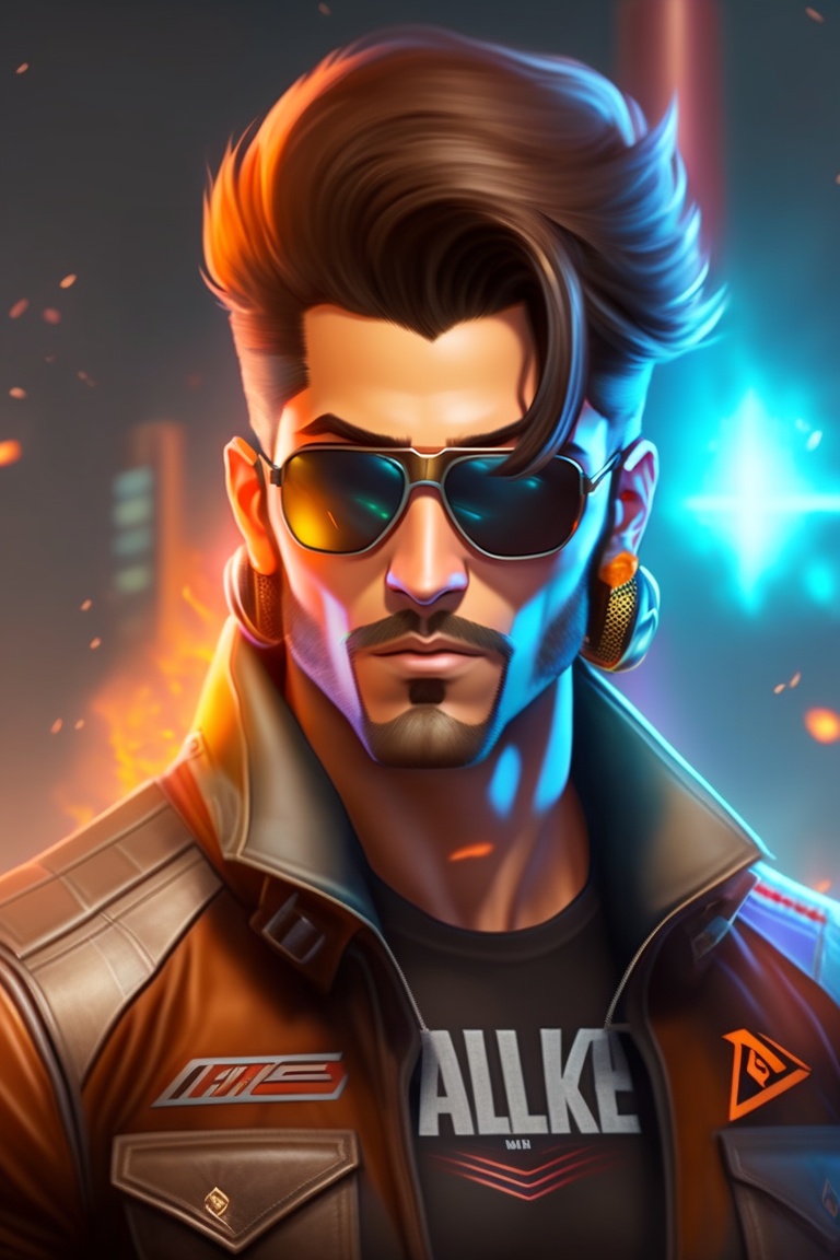 Free fire dj alok character, brown goggles, black hainic t shirt with back hair with short midrange long hair and background blur