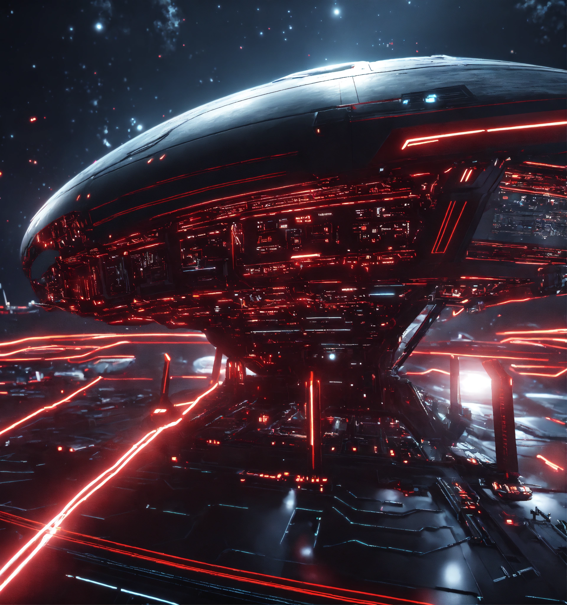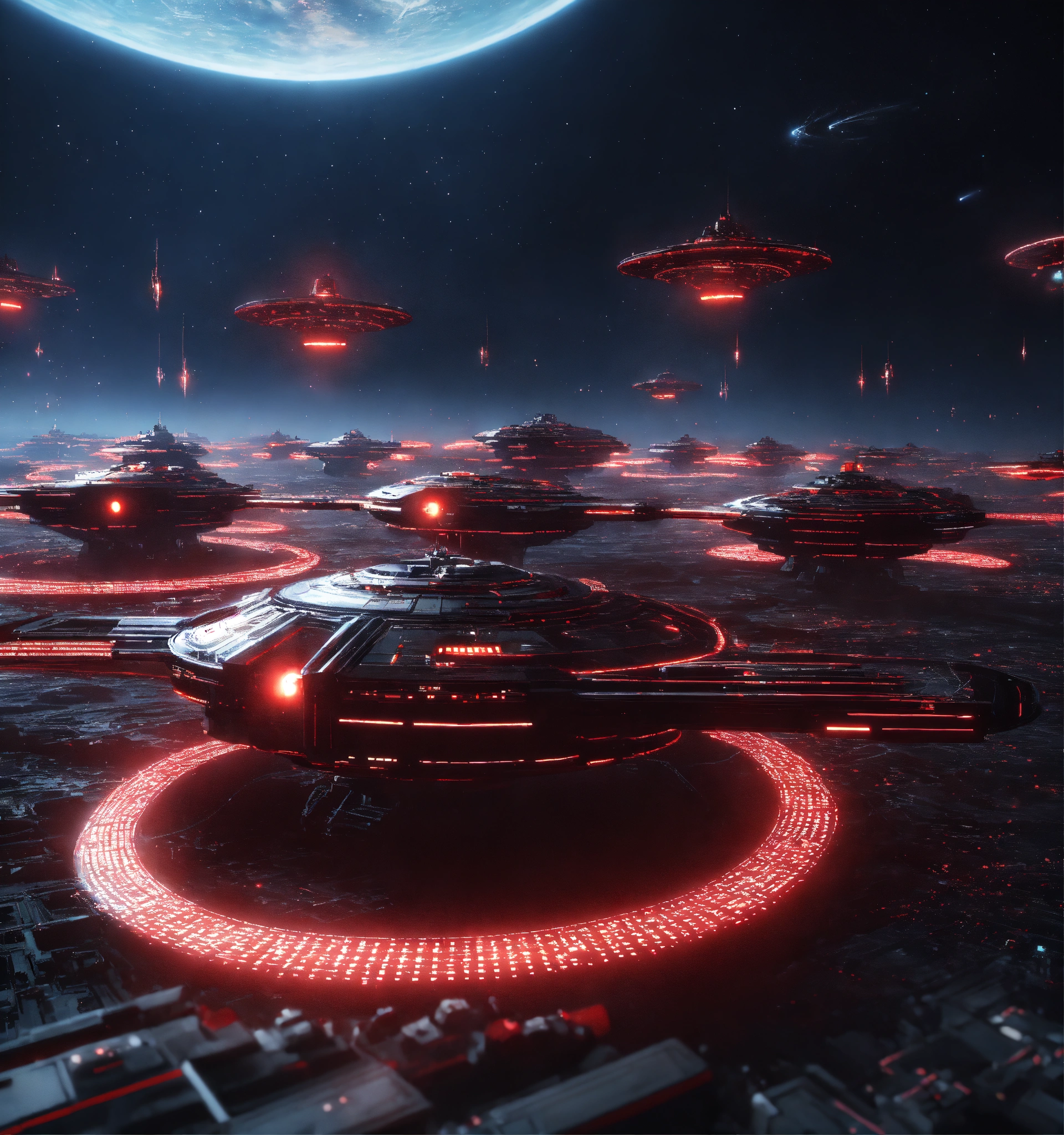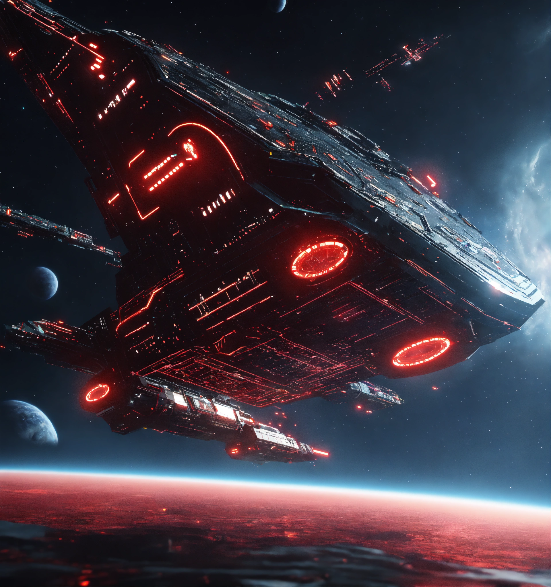 Zoom out on fleet of long black organic worm like space ships with red circuitry and markings, appear in deep space from hyperspace, realistic, 8k, tron, unreal engine