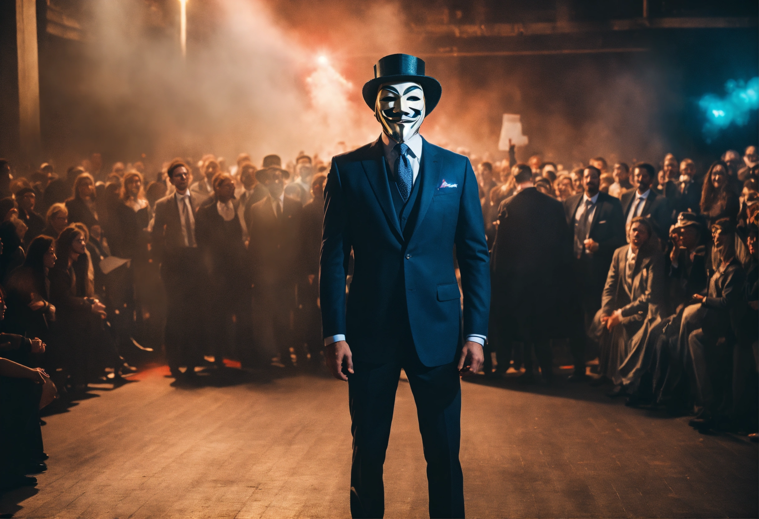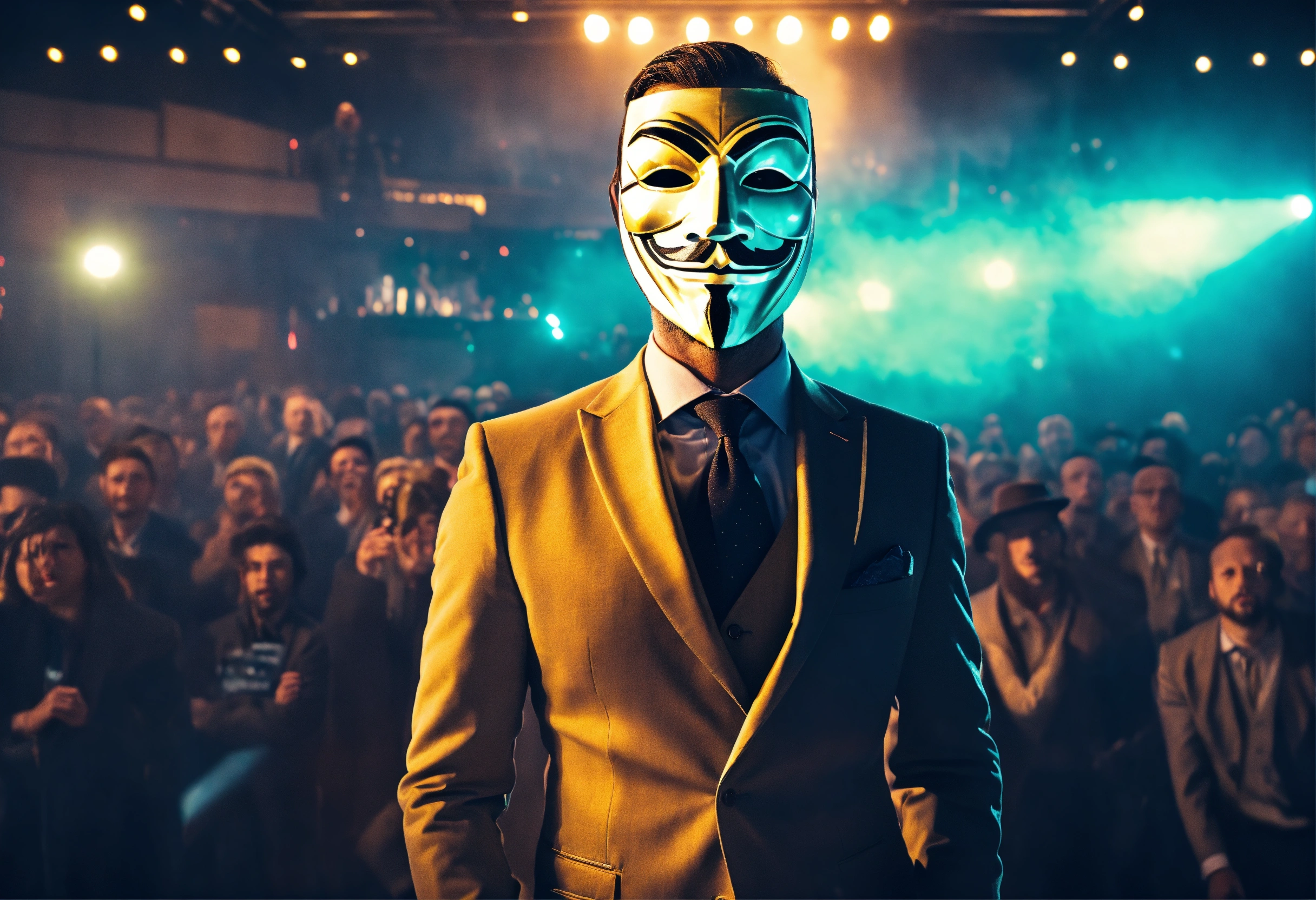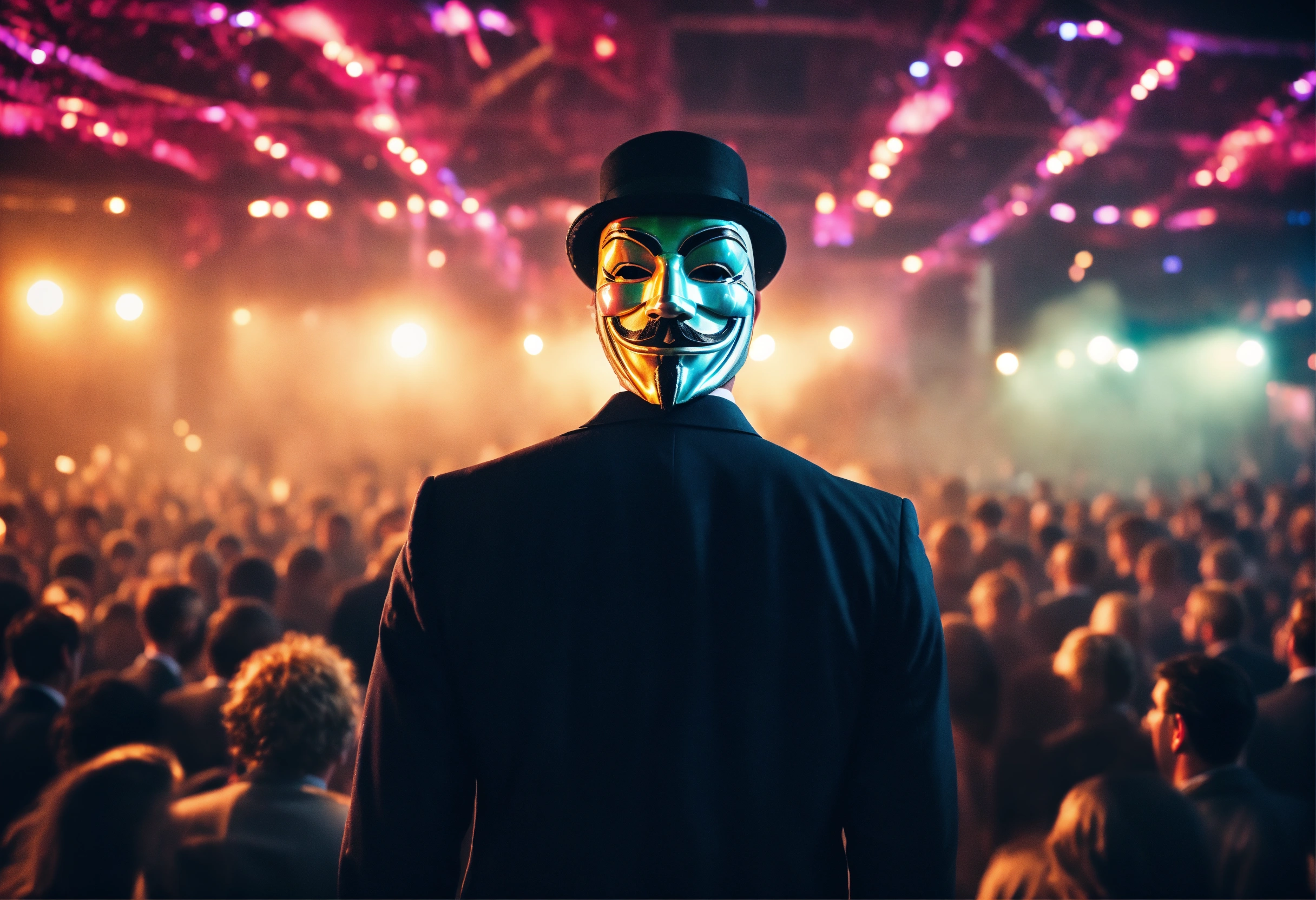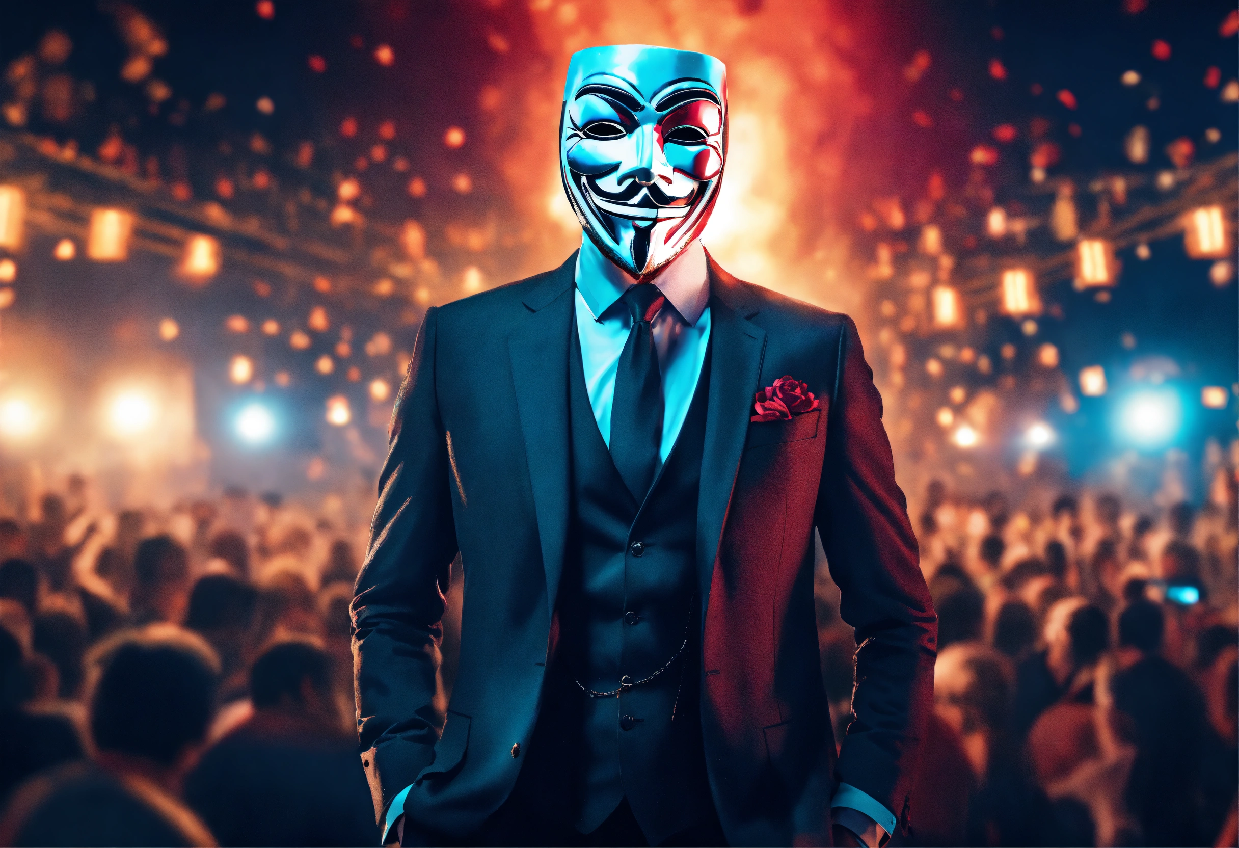 A businessman in a suit wearing a guy fawkes mask and performing in front of a huge crowd, 4k, aubrey powell, vintage photo, flare, beautiful cinematography, surreal, film grain, hype, back view with detailed and relevant ultra realistic neon background 8k
