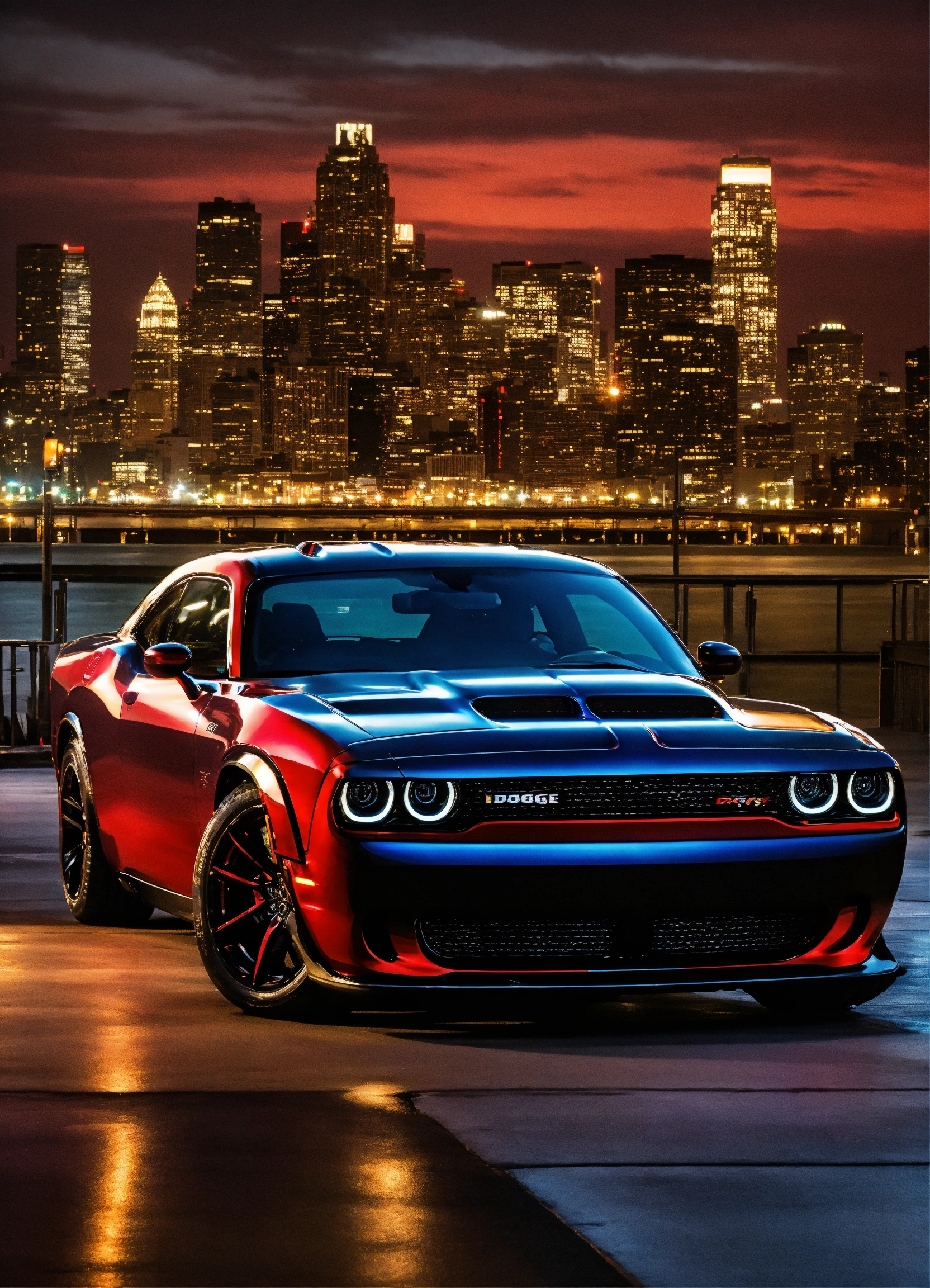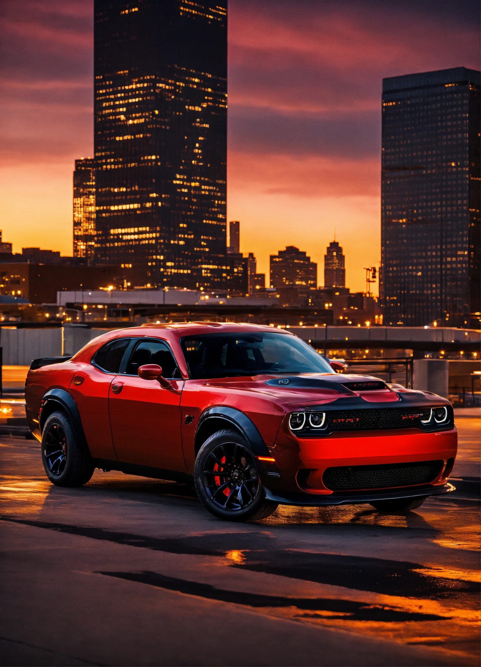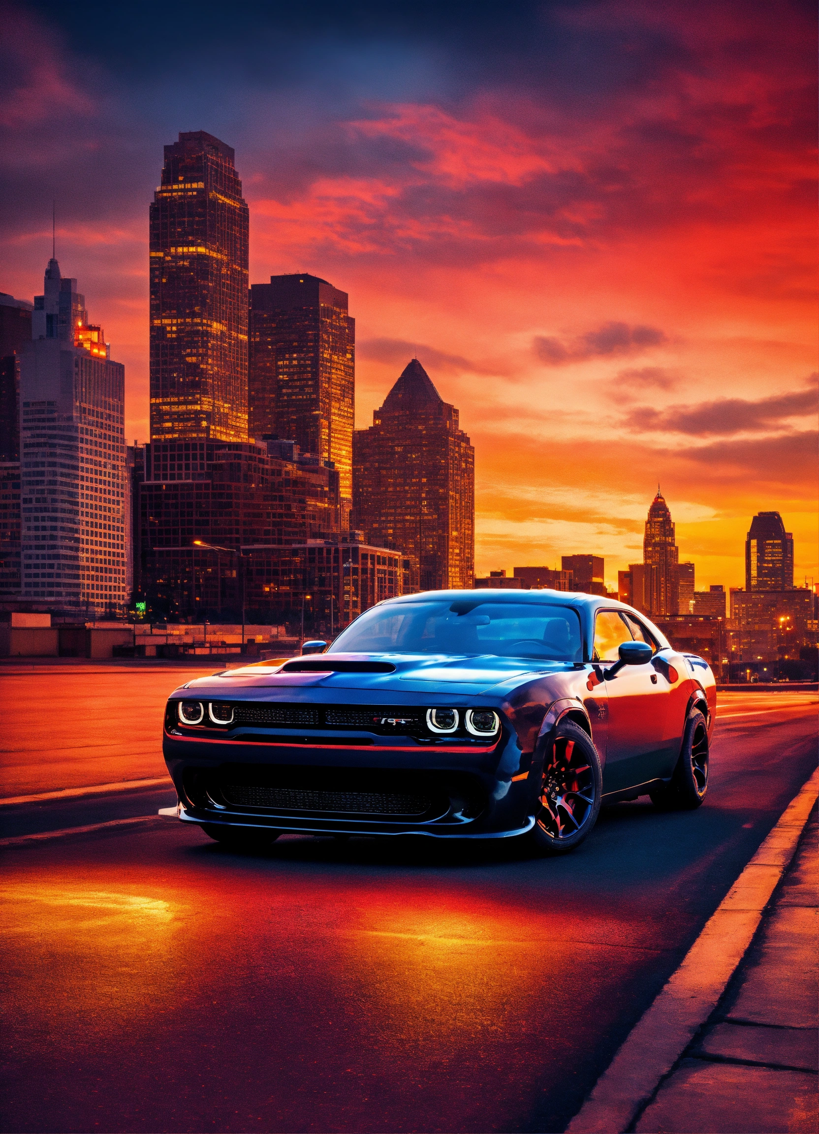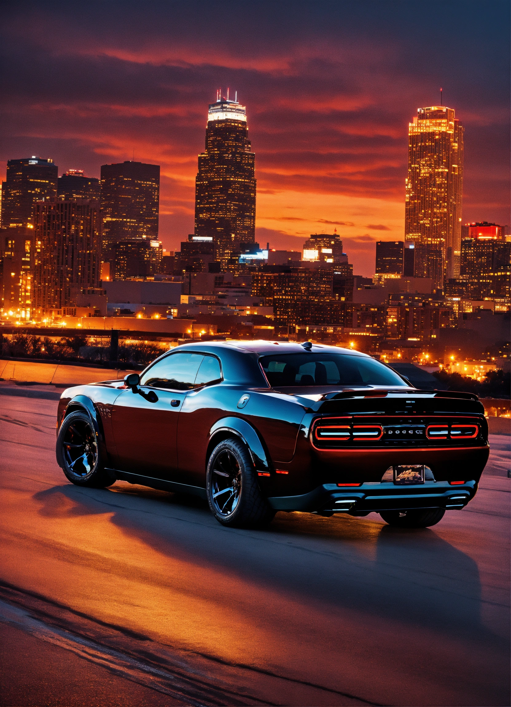 2023 dodge changer hellcat black and red with downtown background and golden moonlight landscape