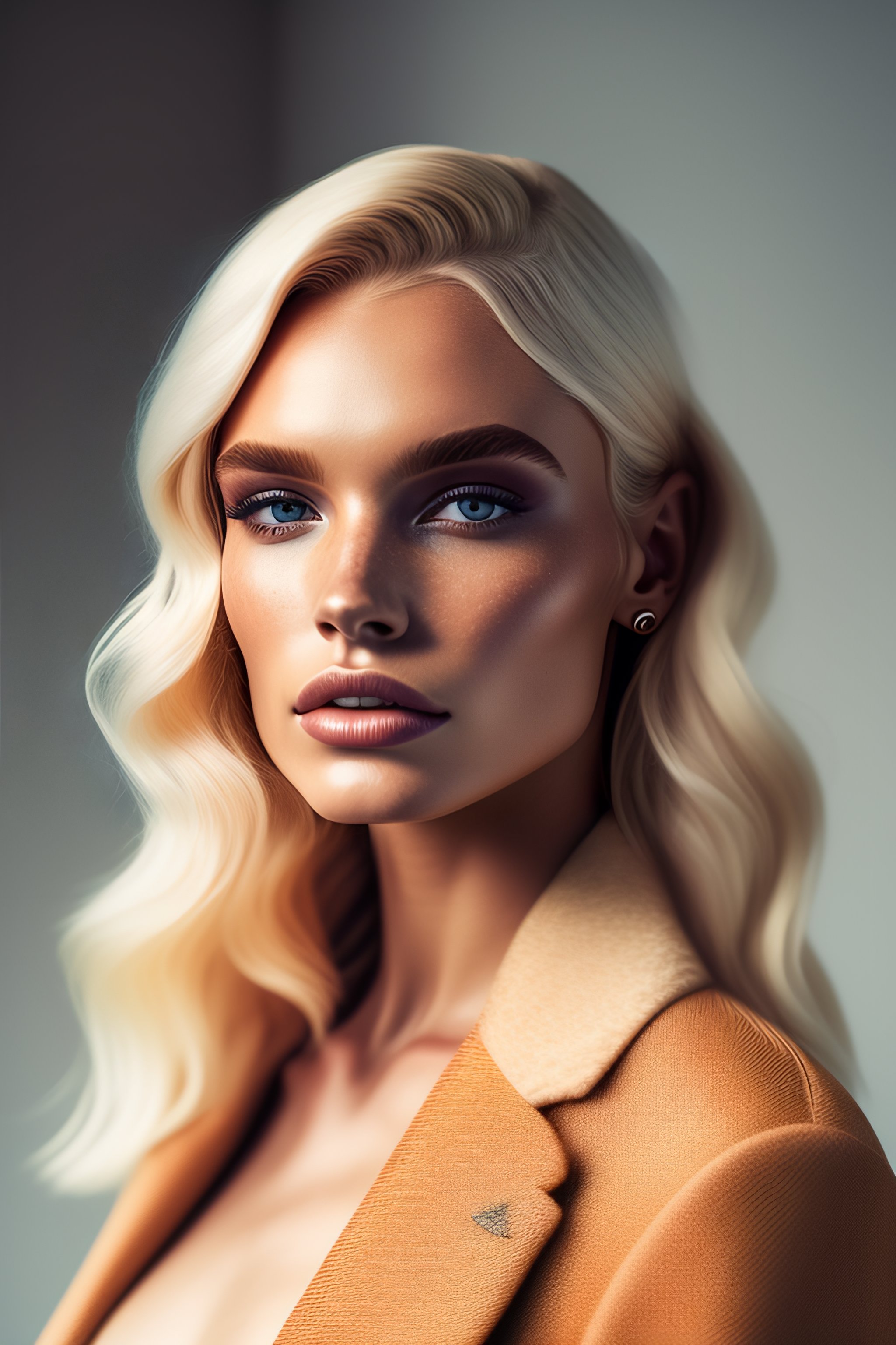 A photo full body of a beautiful blonde woman with freckles, fashion editorial, studio photography, magazine photography, pointed nose, blurry background