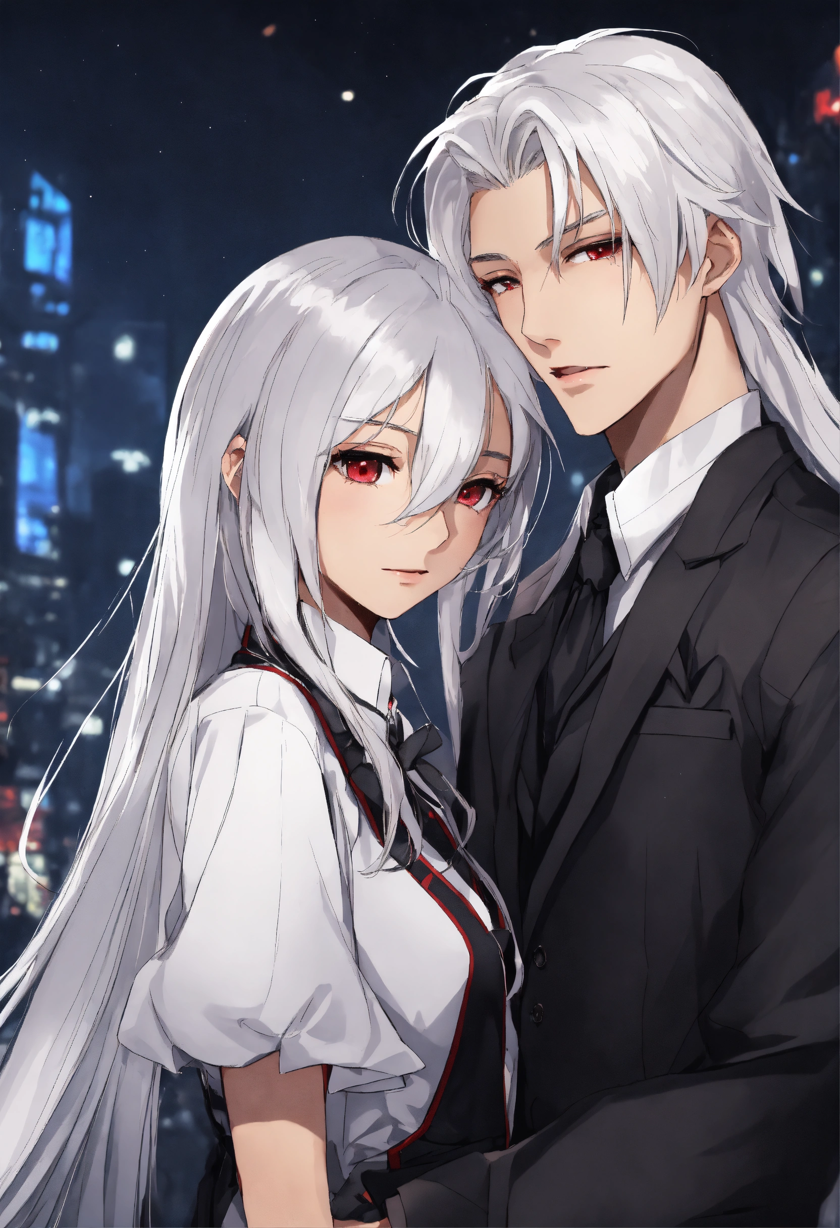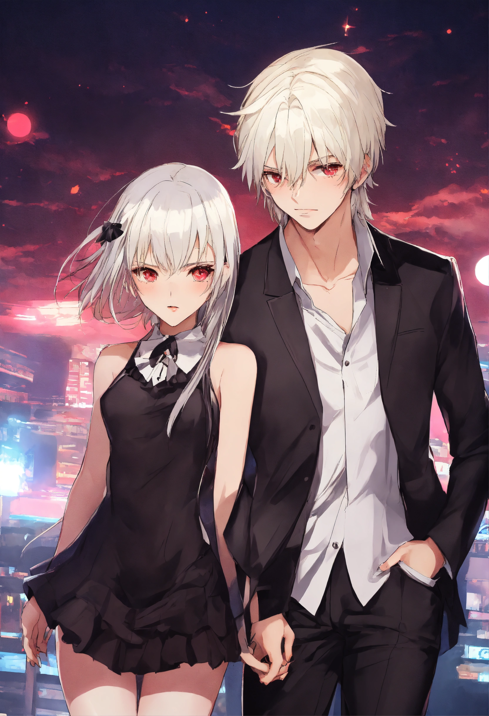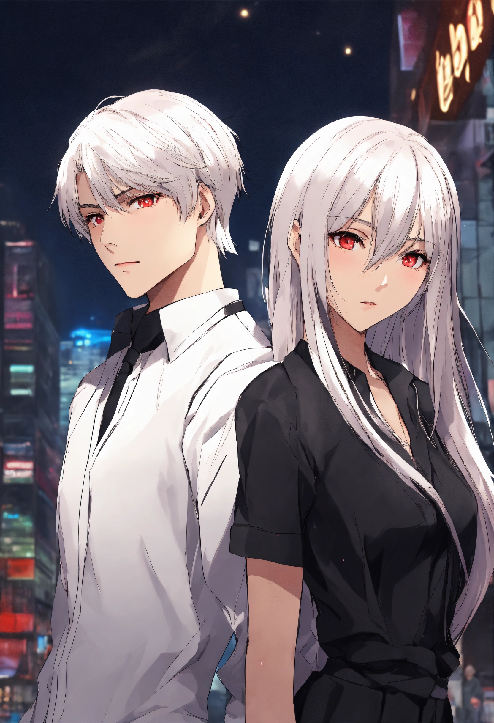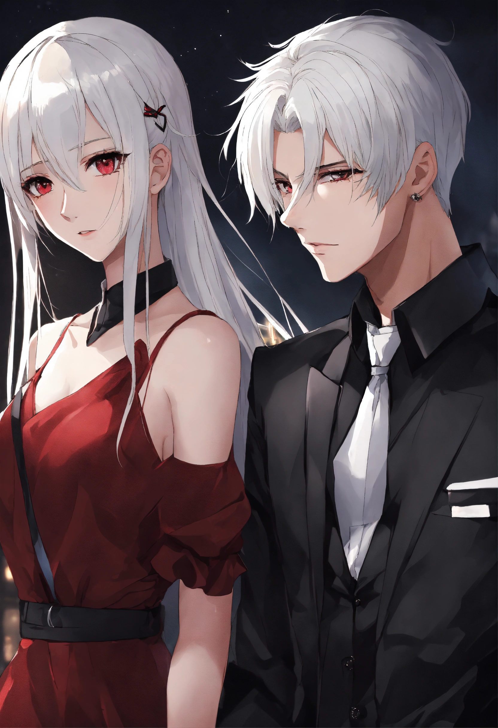 Guy and girl 20 years old. twins. the girl has white long straight hair. the guy has white short straight hair. sharp, cruel facial features. scarlet eyes. height 180 cm guy. girl height 175. anime reskin style. the guy is wearing a black formal shirt. the girl is dressed in a black dress. background black