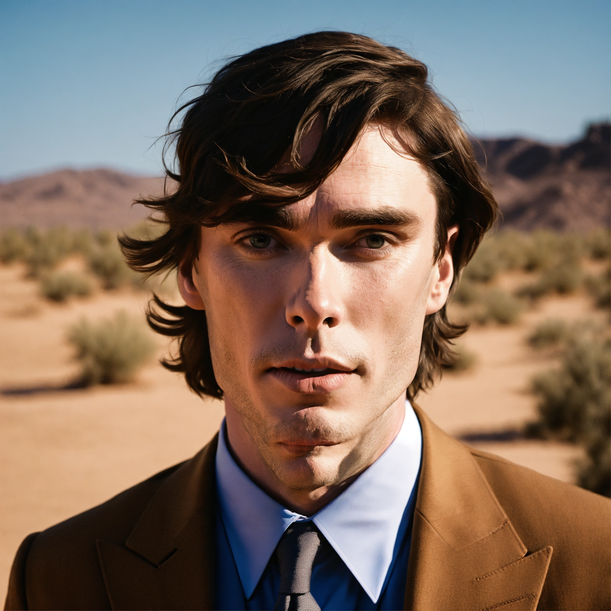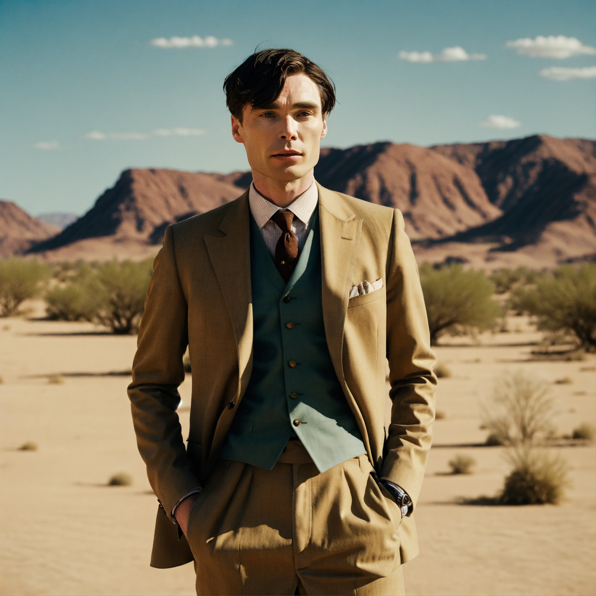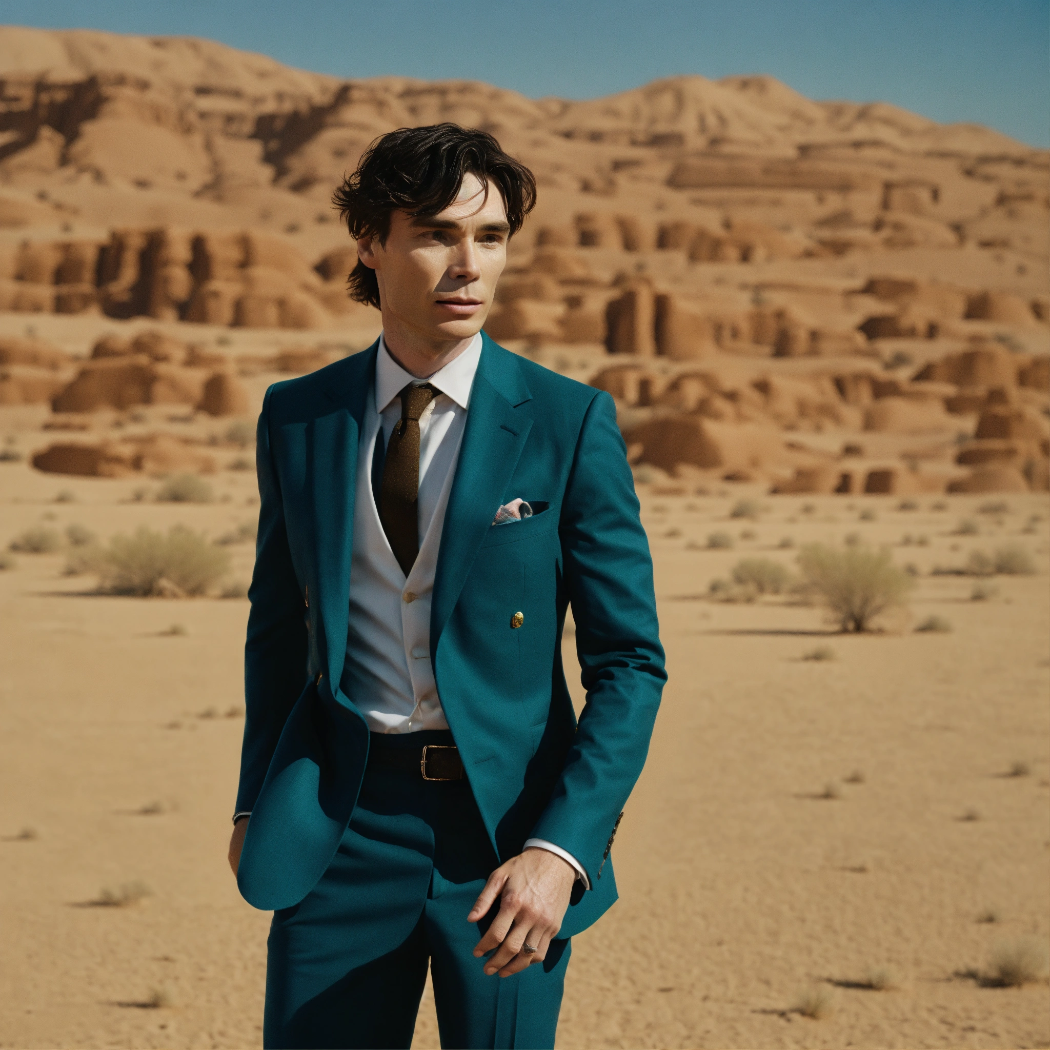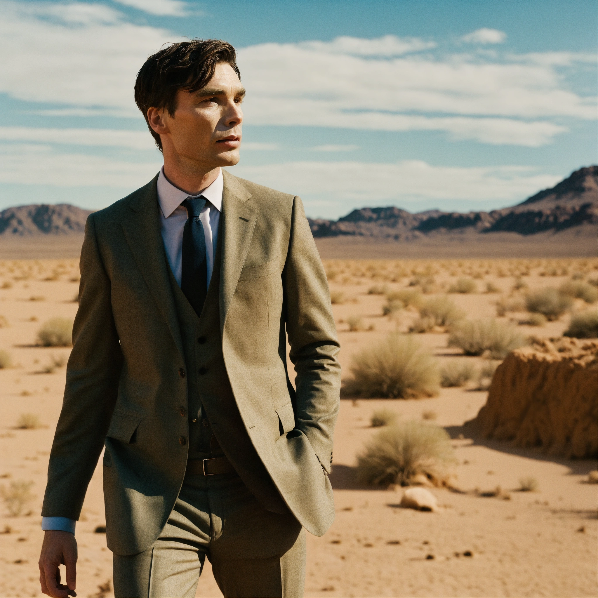 A photograph of cillian murphy wearing a suit in the desert, wes andersons asteriod city colour palette