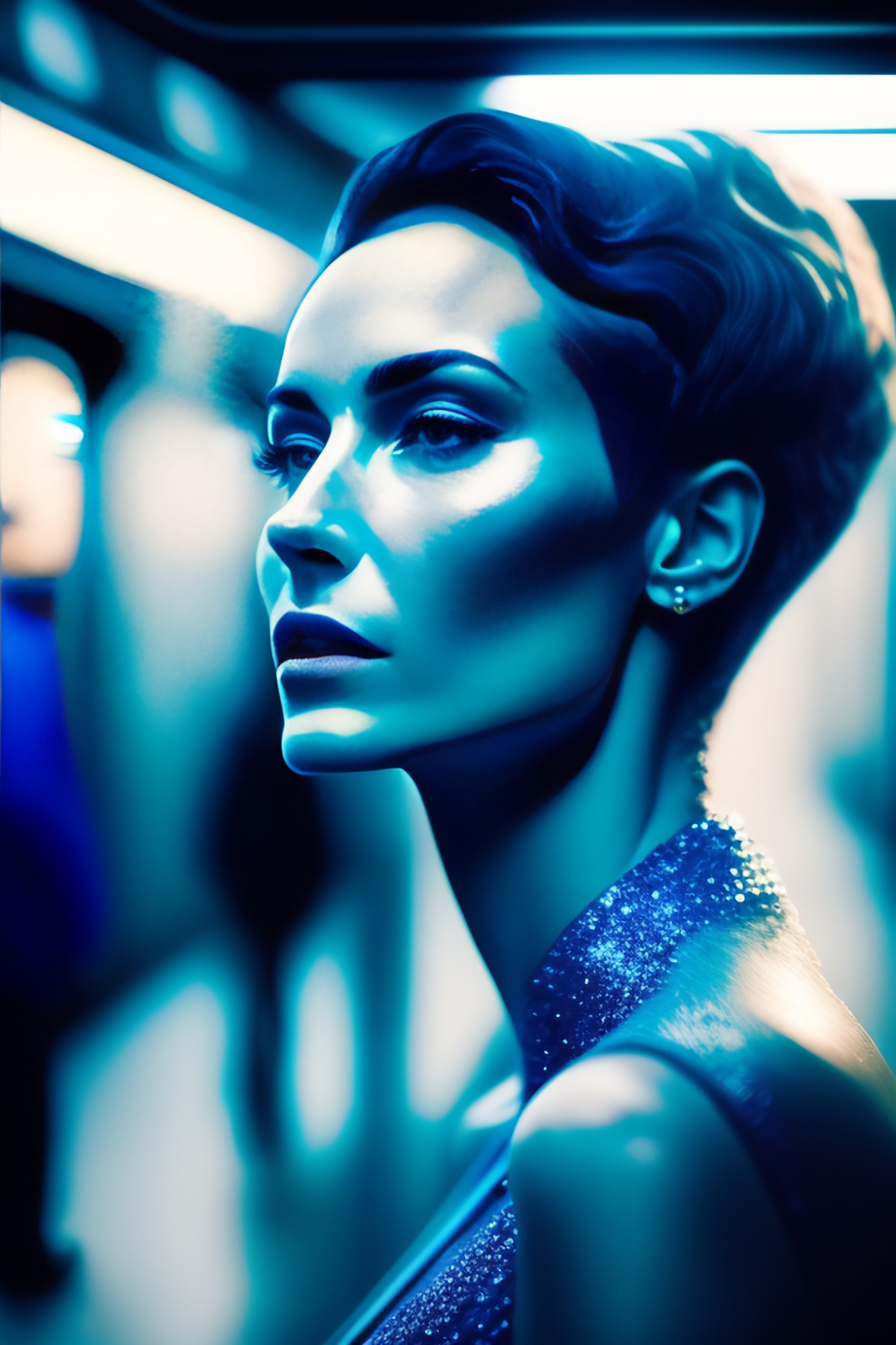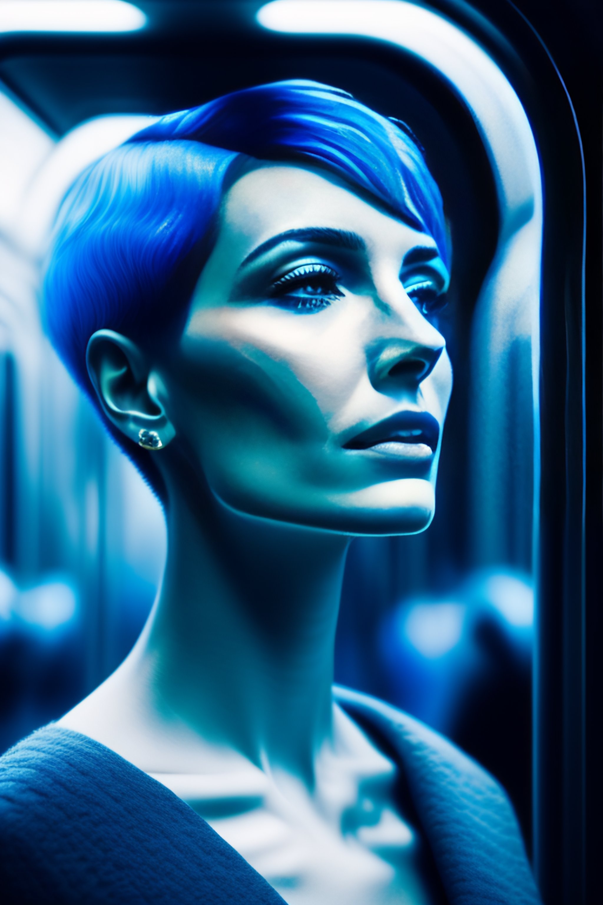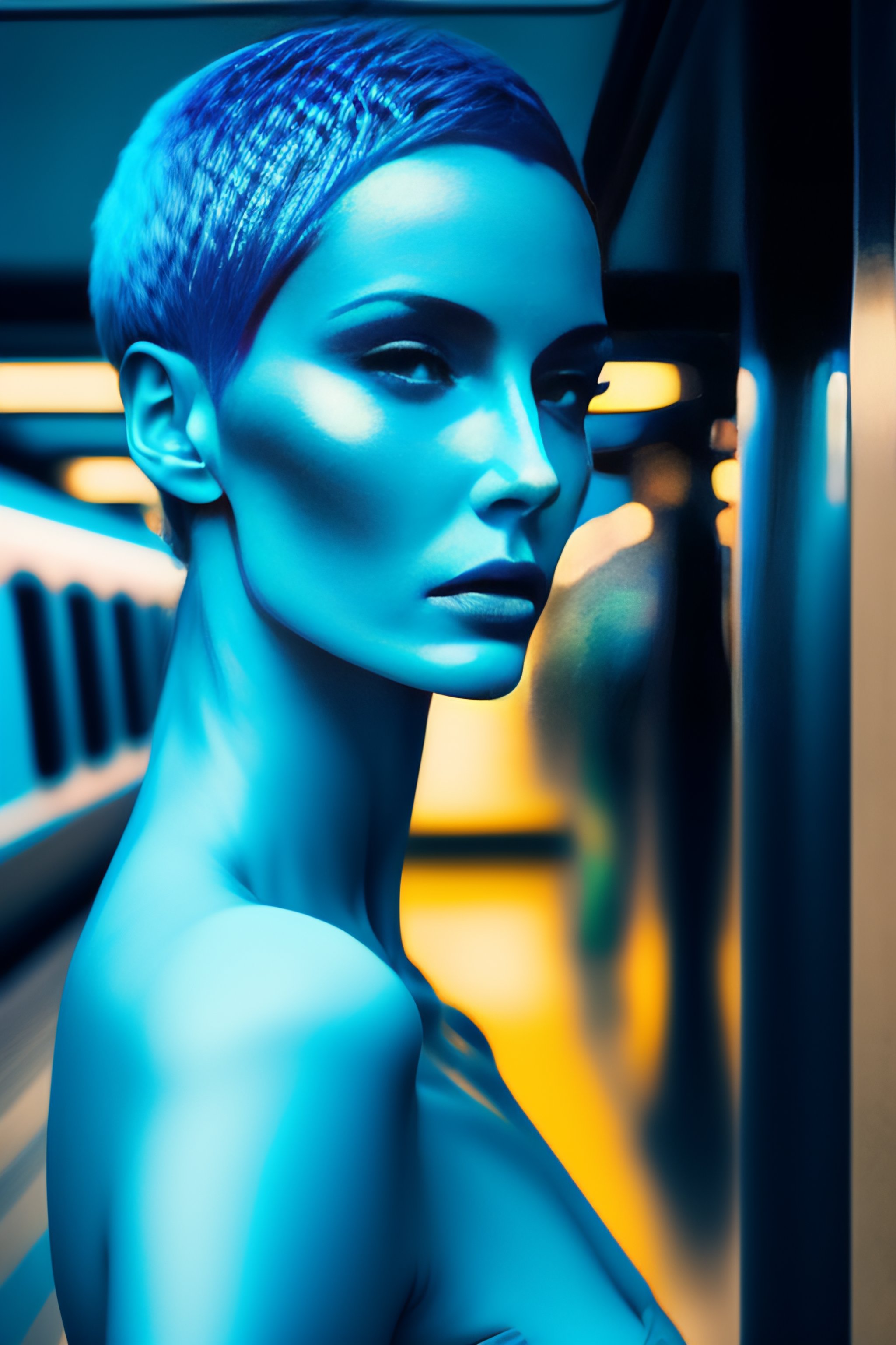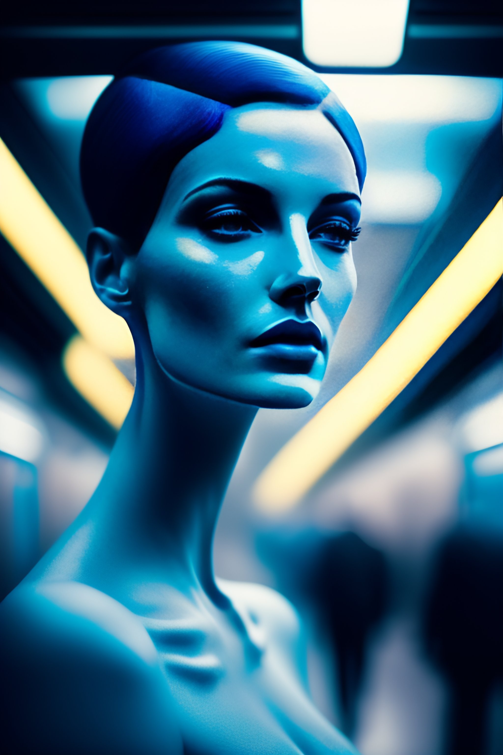 Profil of face of a alien woman with very short hair, and a long neck, in texture blue glass statue, she smoking a cigarette, waiting for the metro, in a subway, argentic