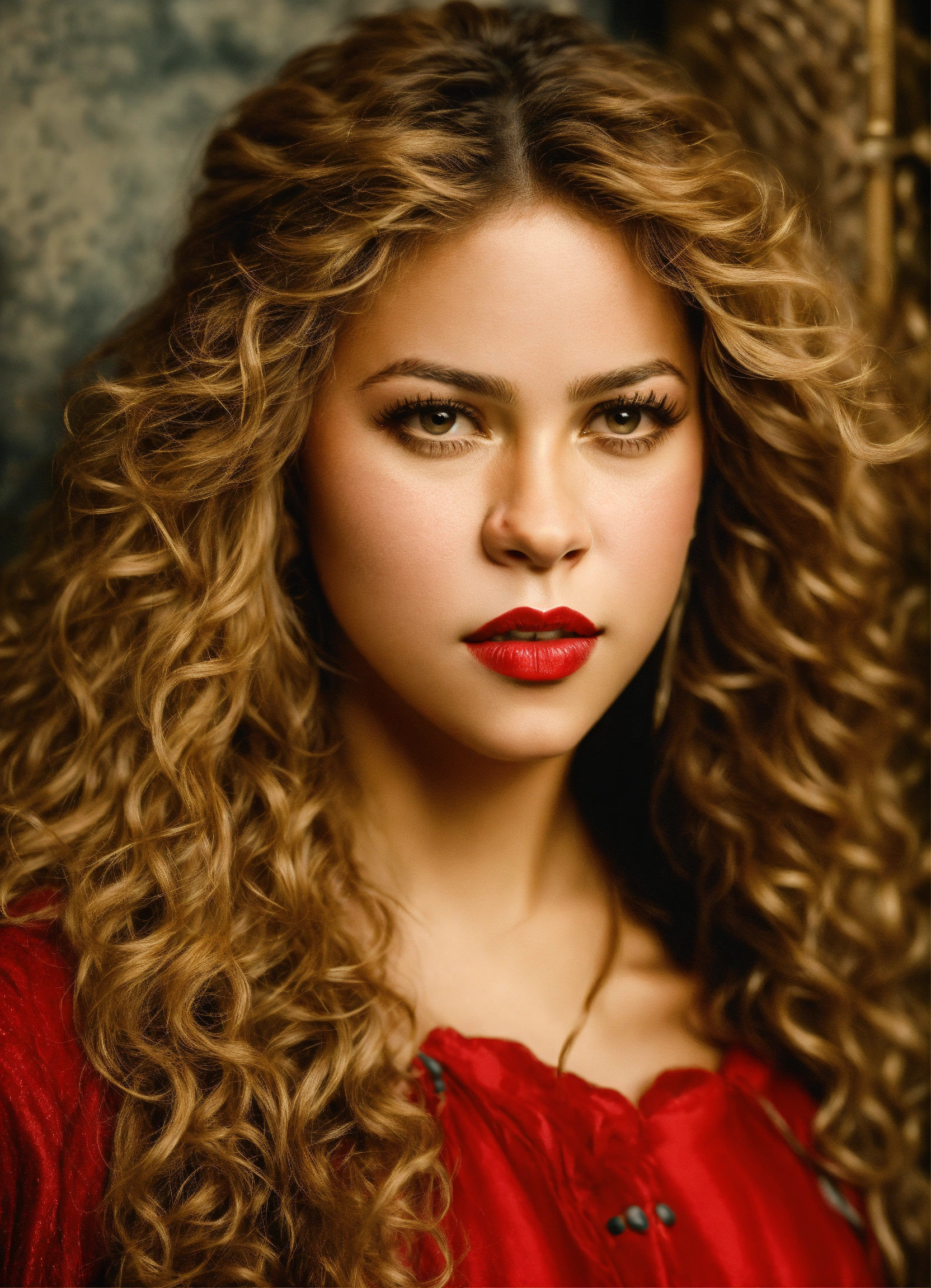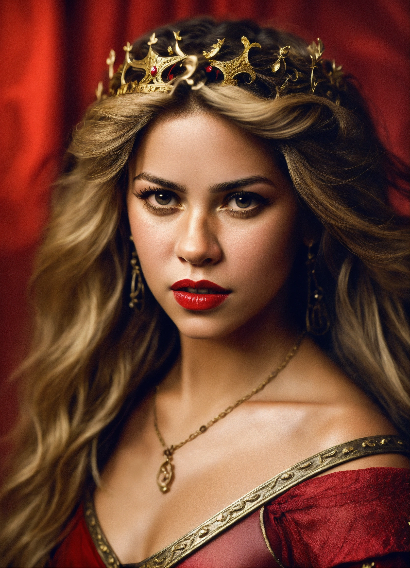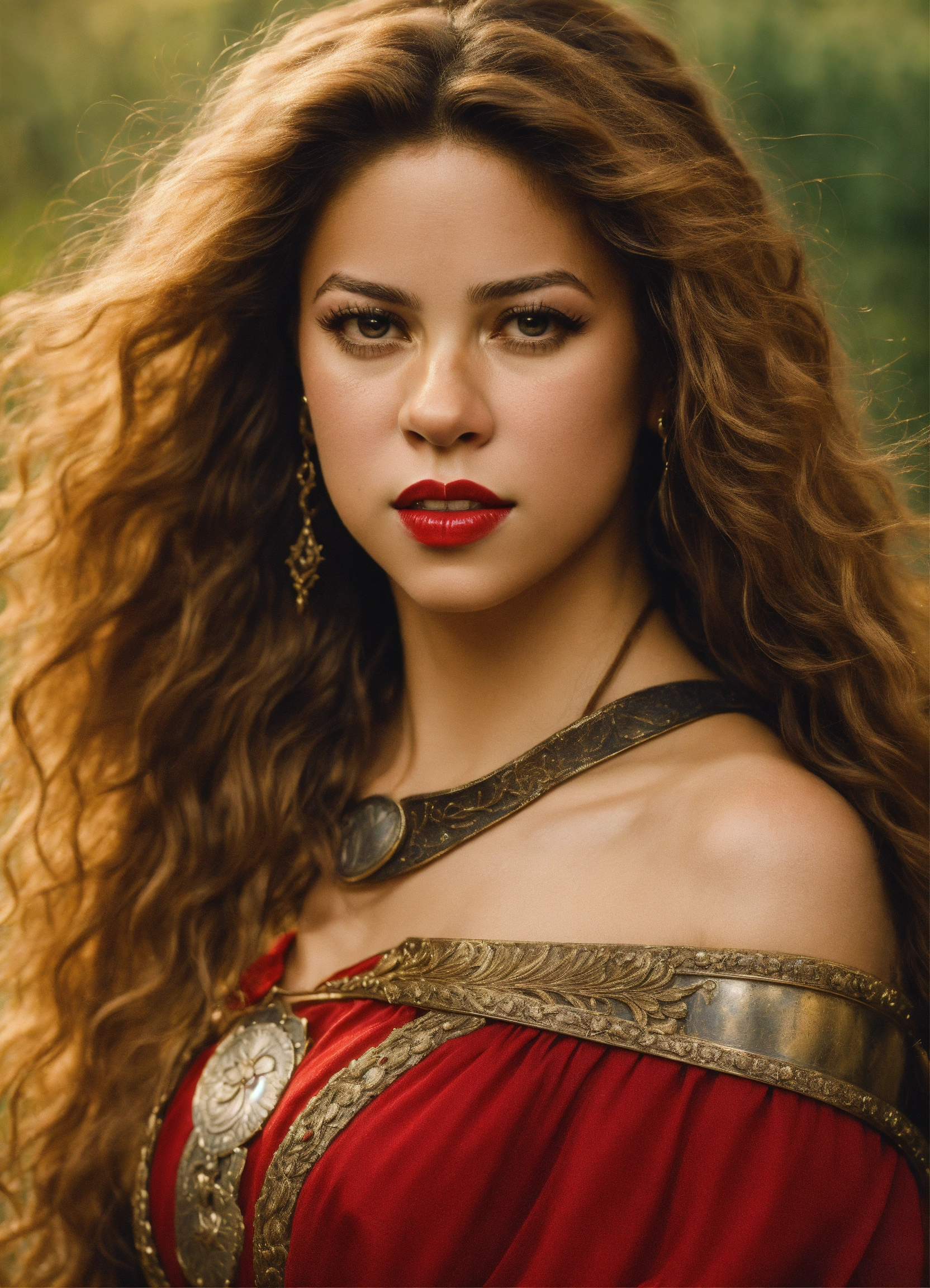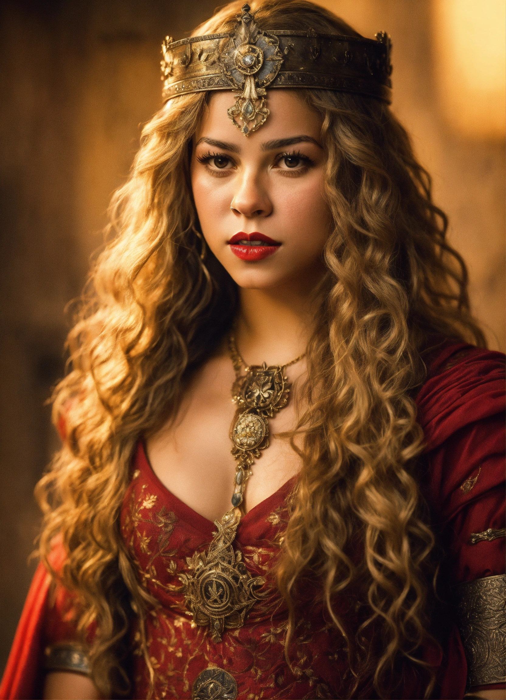 Photo quality portrait of young beautiful shakira as a mediaeval warrior queen with flowing hair, red lips and a stern expression
