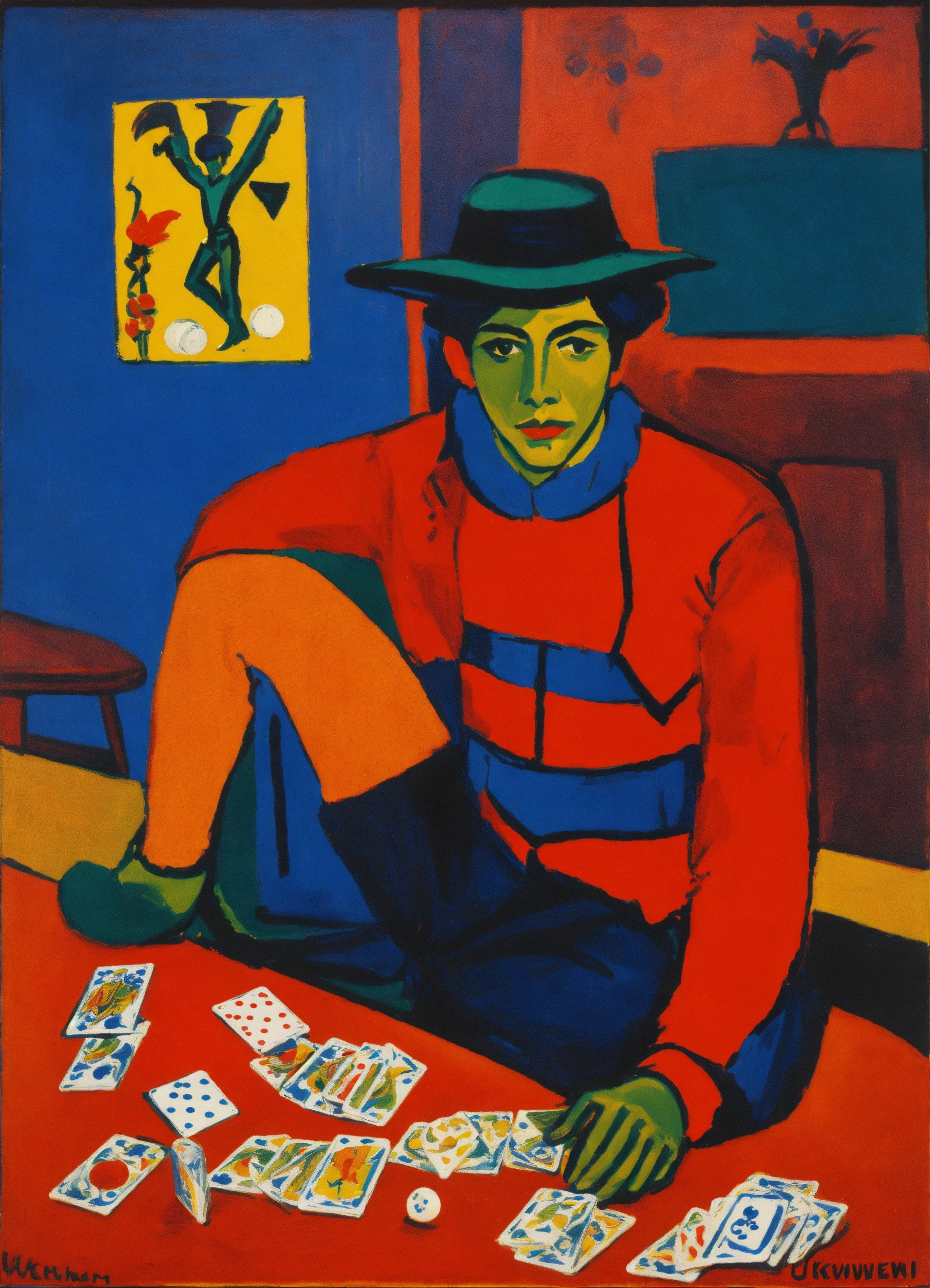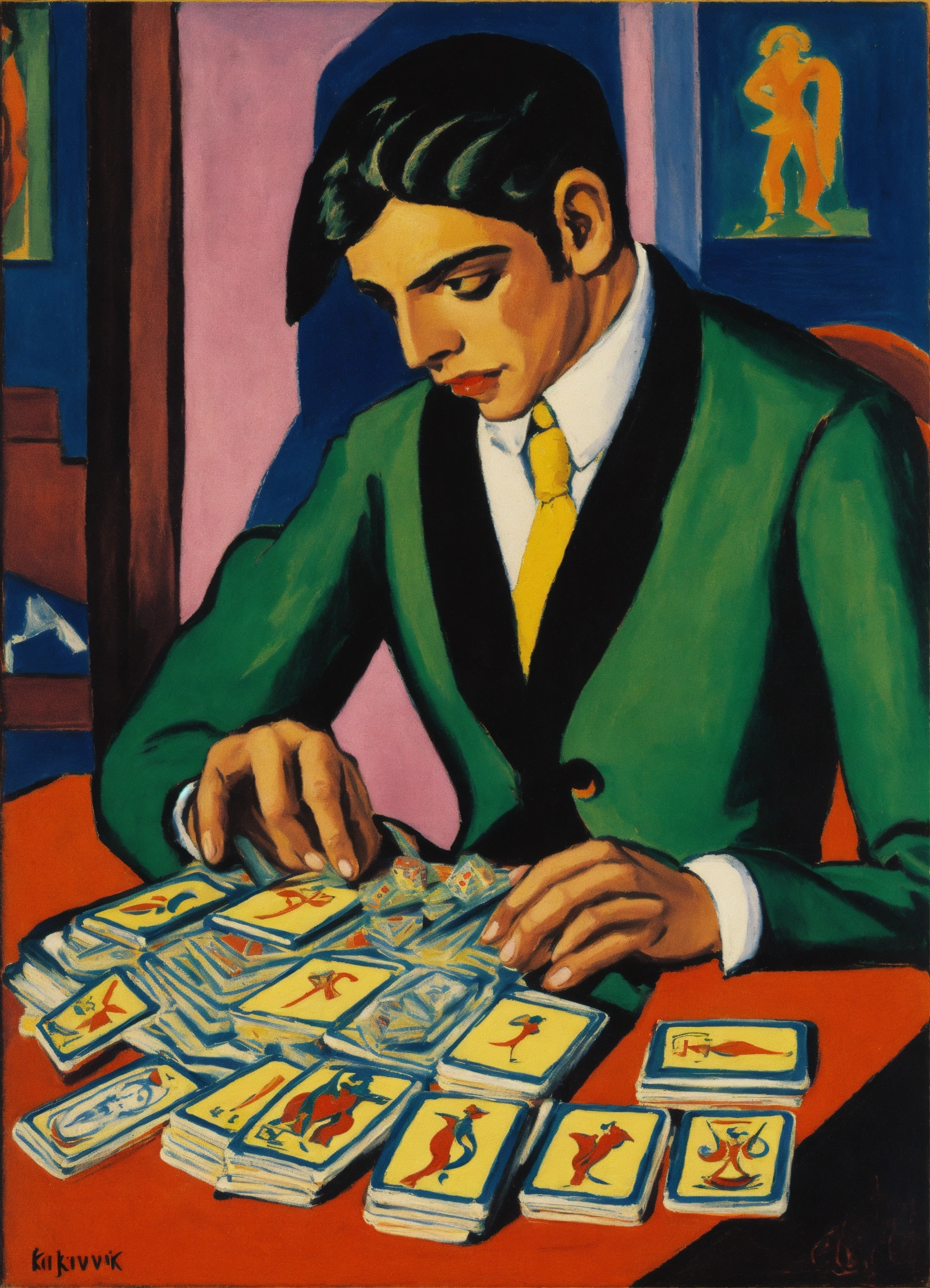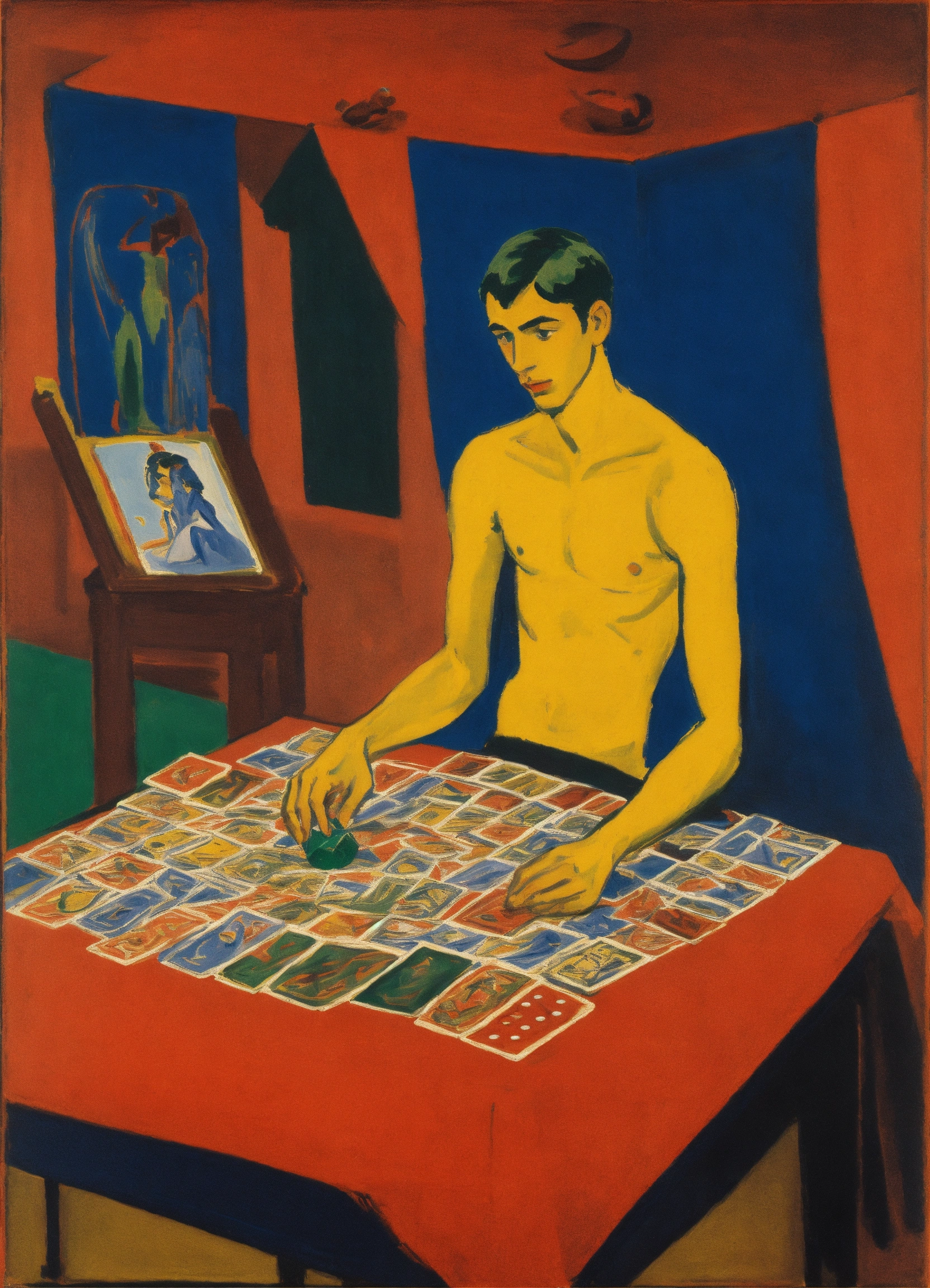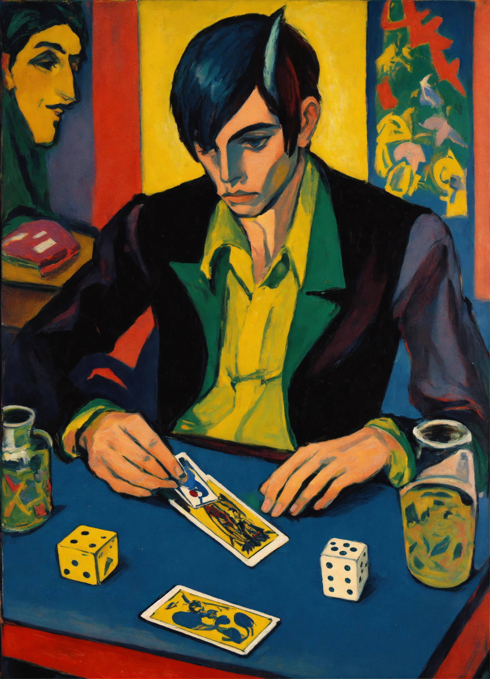 Ernst ludwig kirchner peinture, representation of the tarot card, the juggernaut, a young man who plays with dice placed on a table