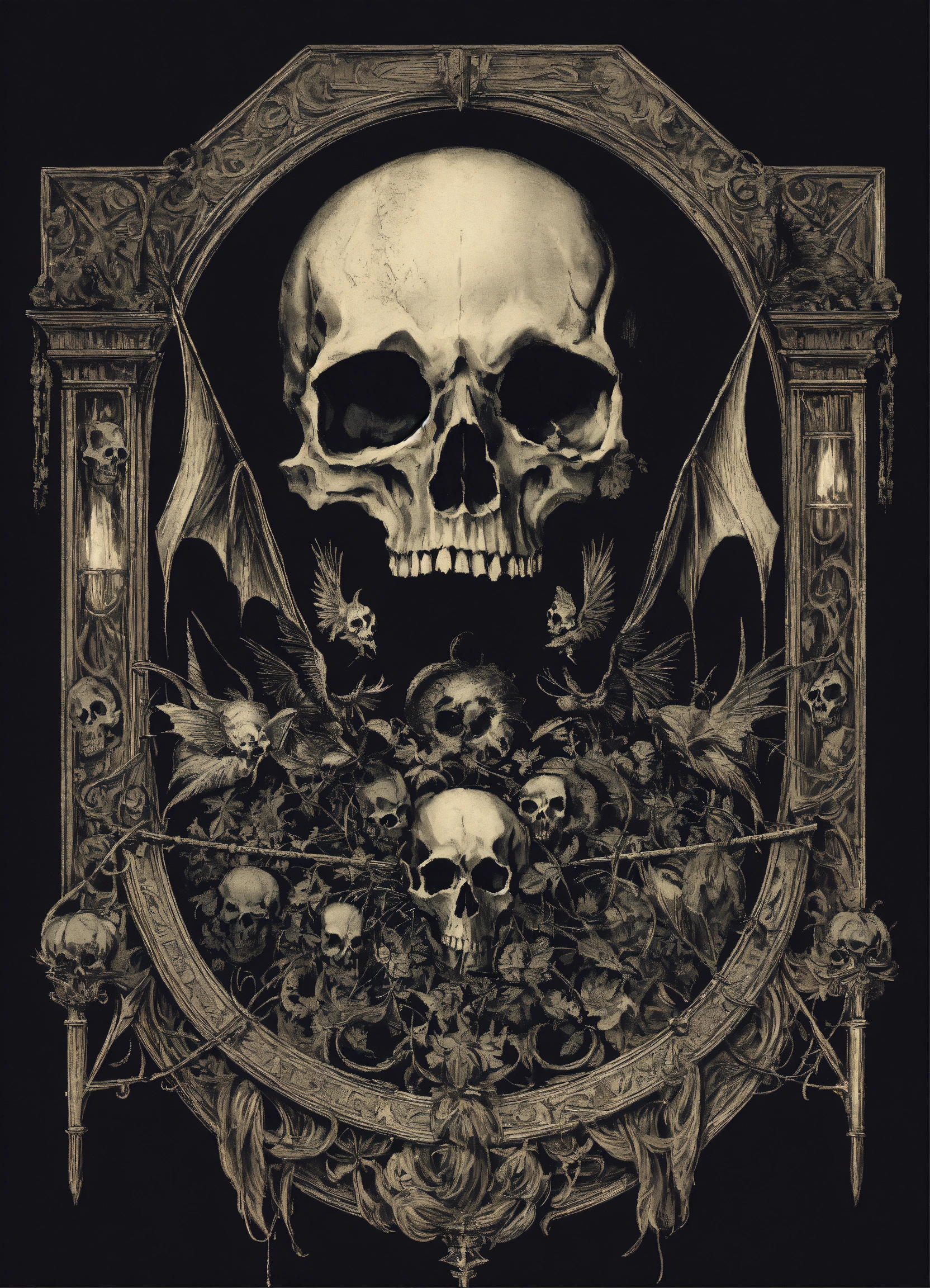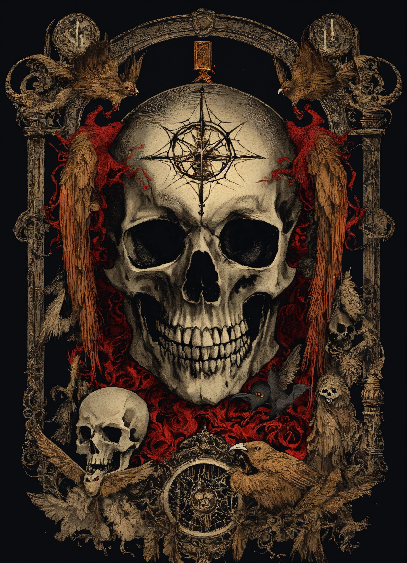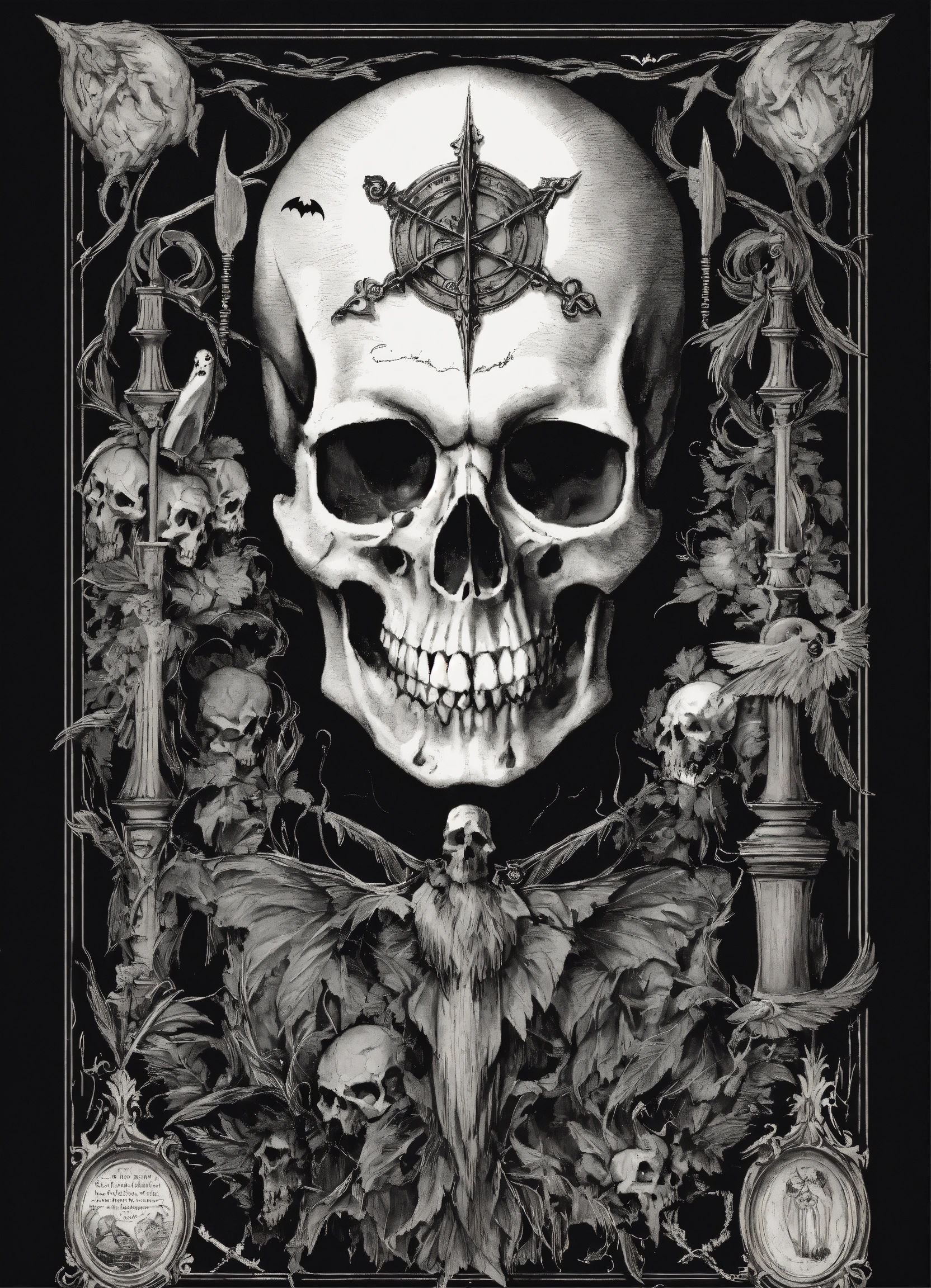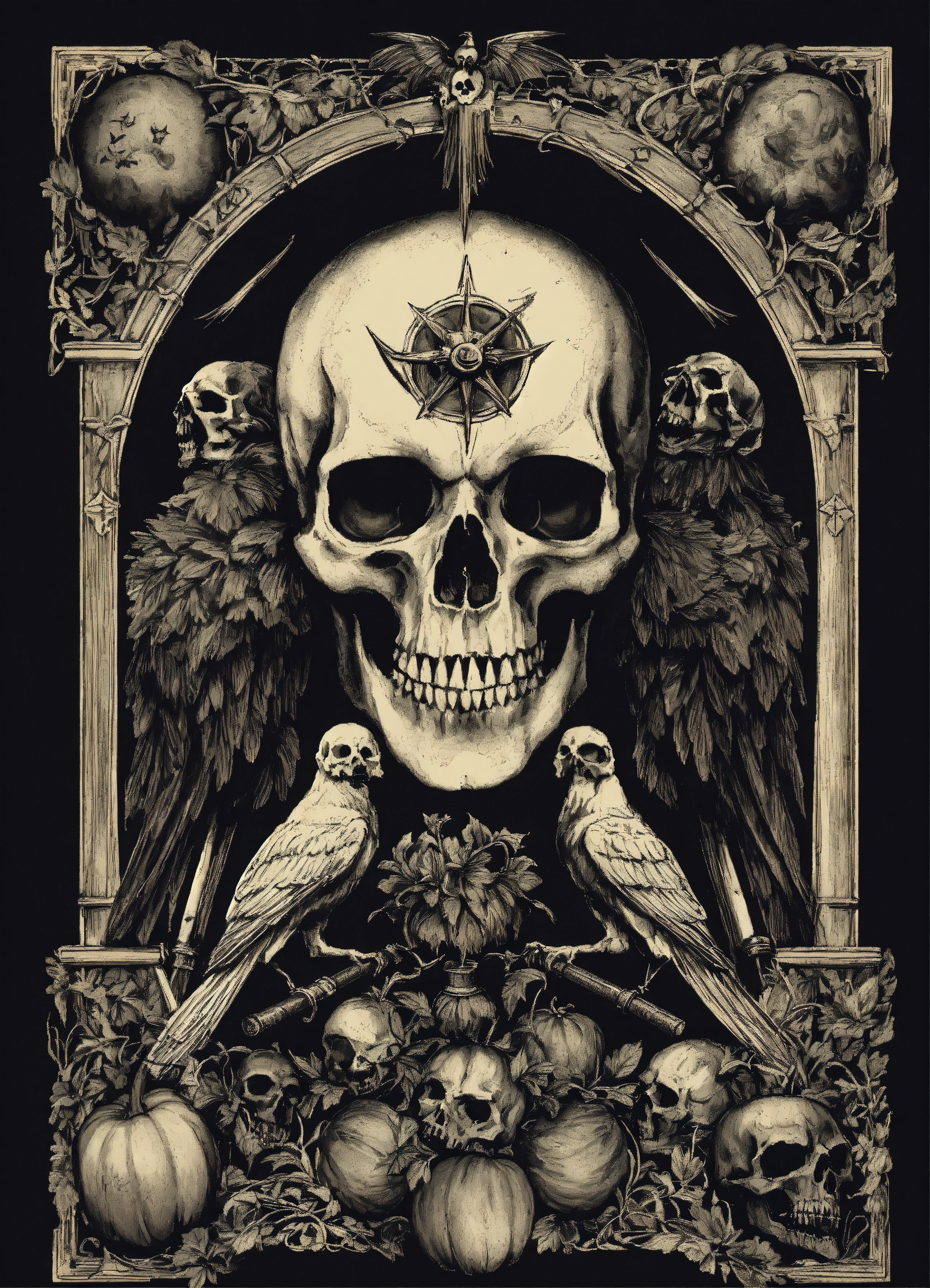 Albrecht durer style, satanic symbols, angry vampire skull, crow, halloween, strange, creepy, scary, thriller, fear, highly detailed, victorian style, tshirt design, black background