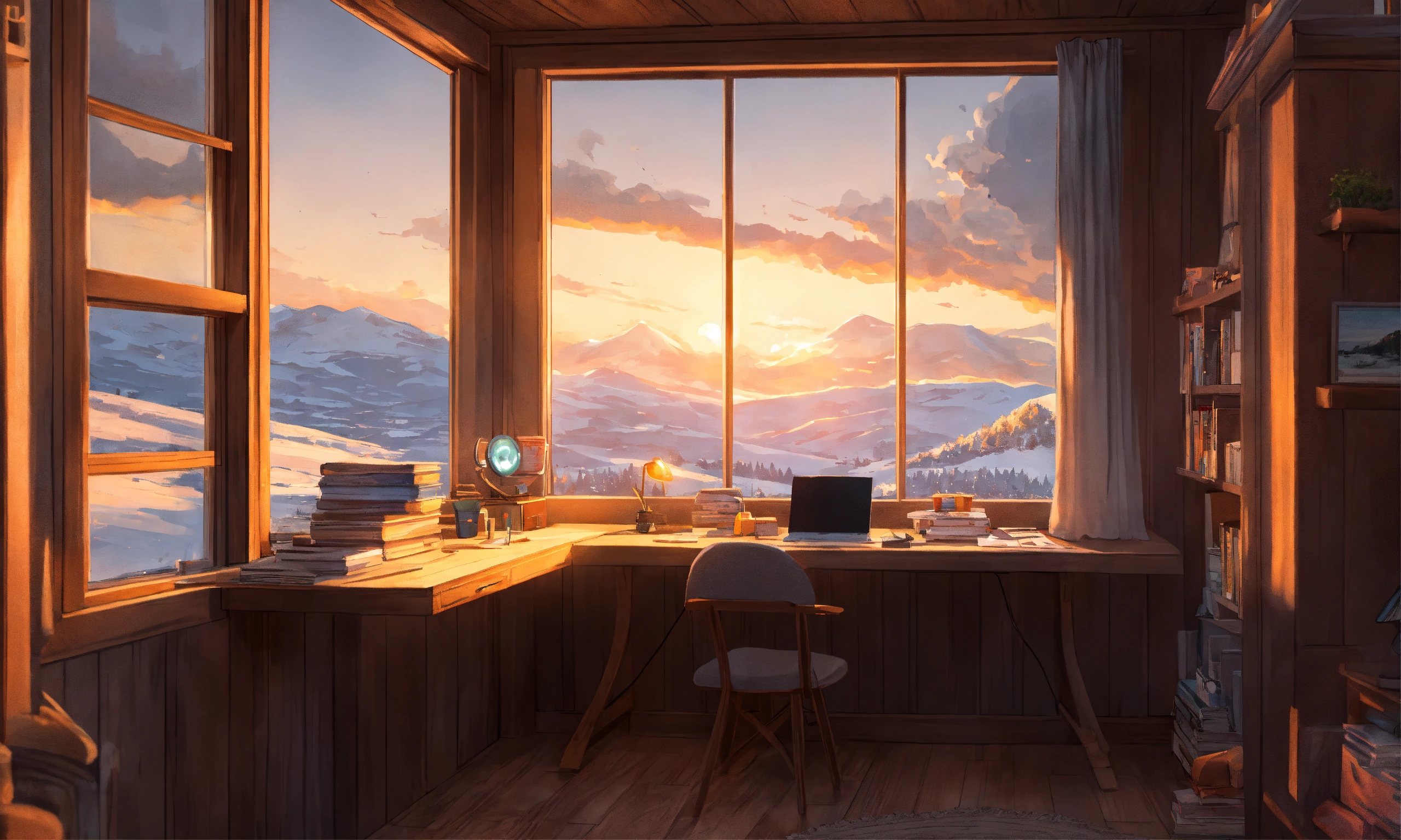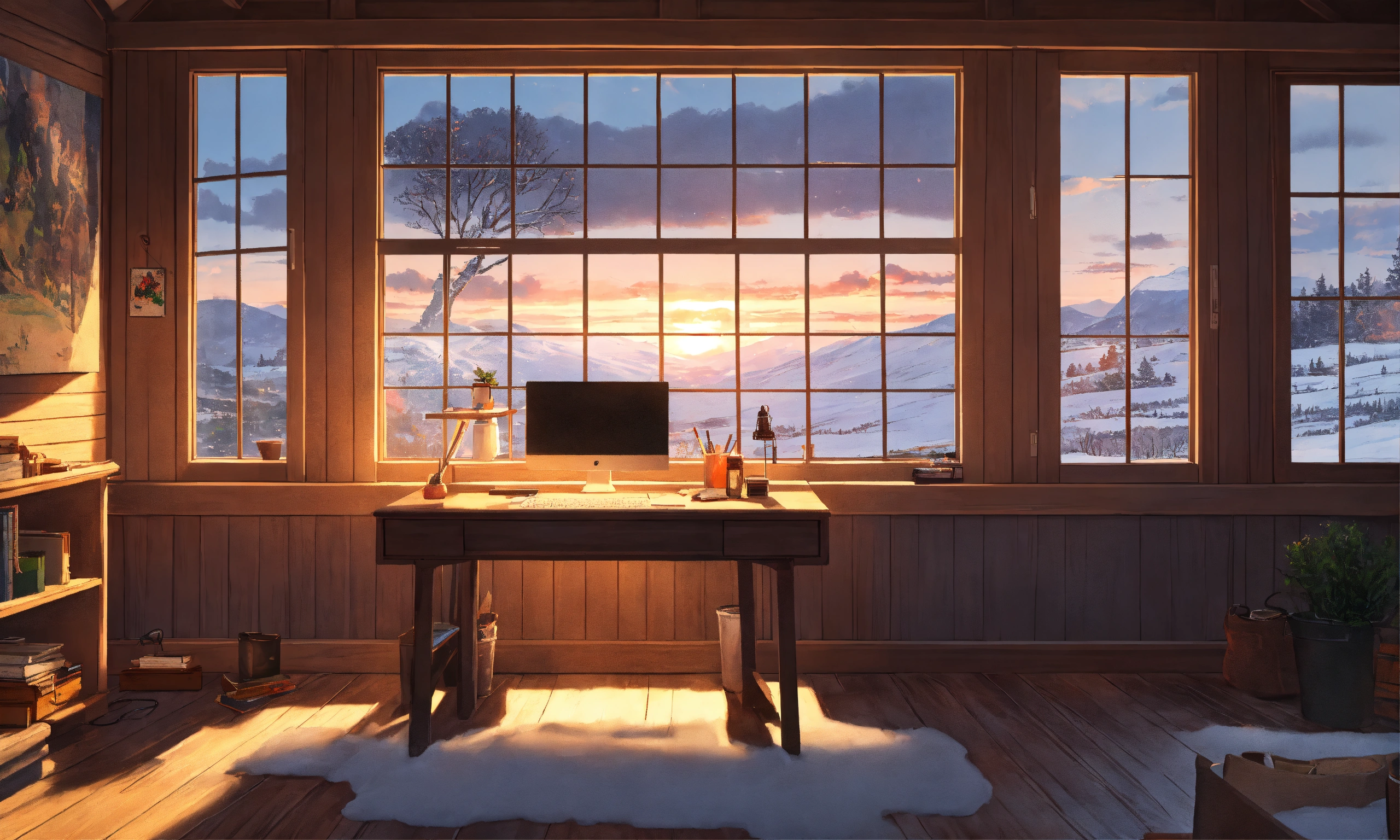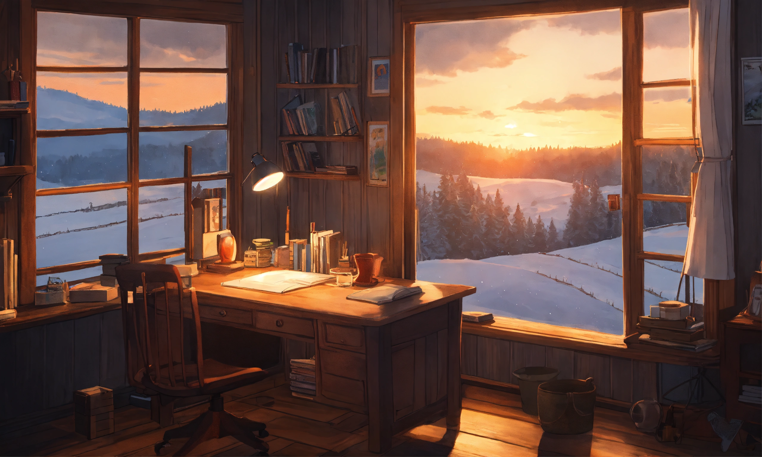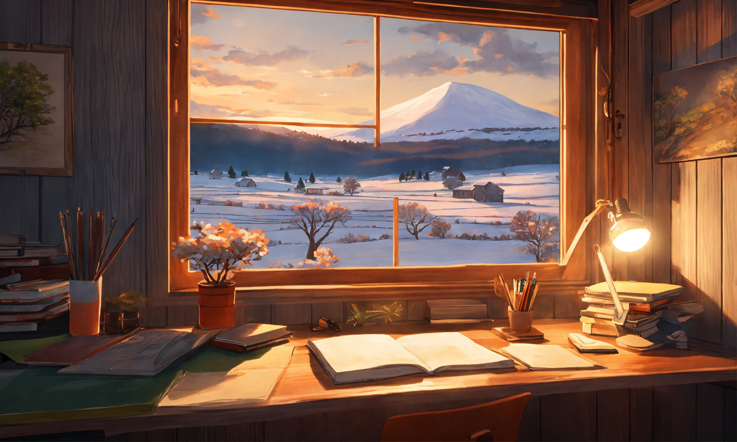Study desk in cabin, grey washed acrylic wooden walls, studio ghibli, anime, lofi artwork, big window with view over farm landscape covered in snow, study desk against window, sunset, point of view from behind the room