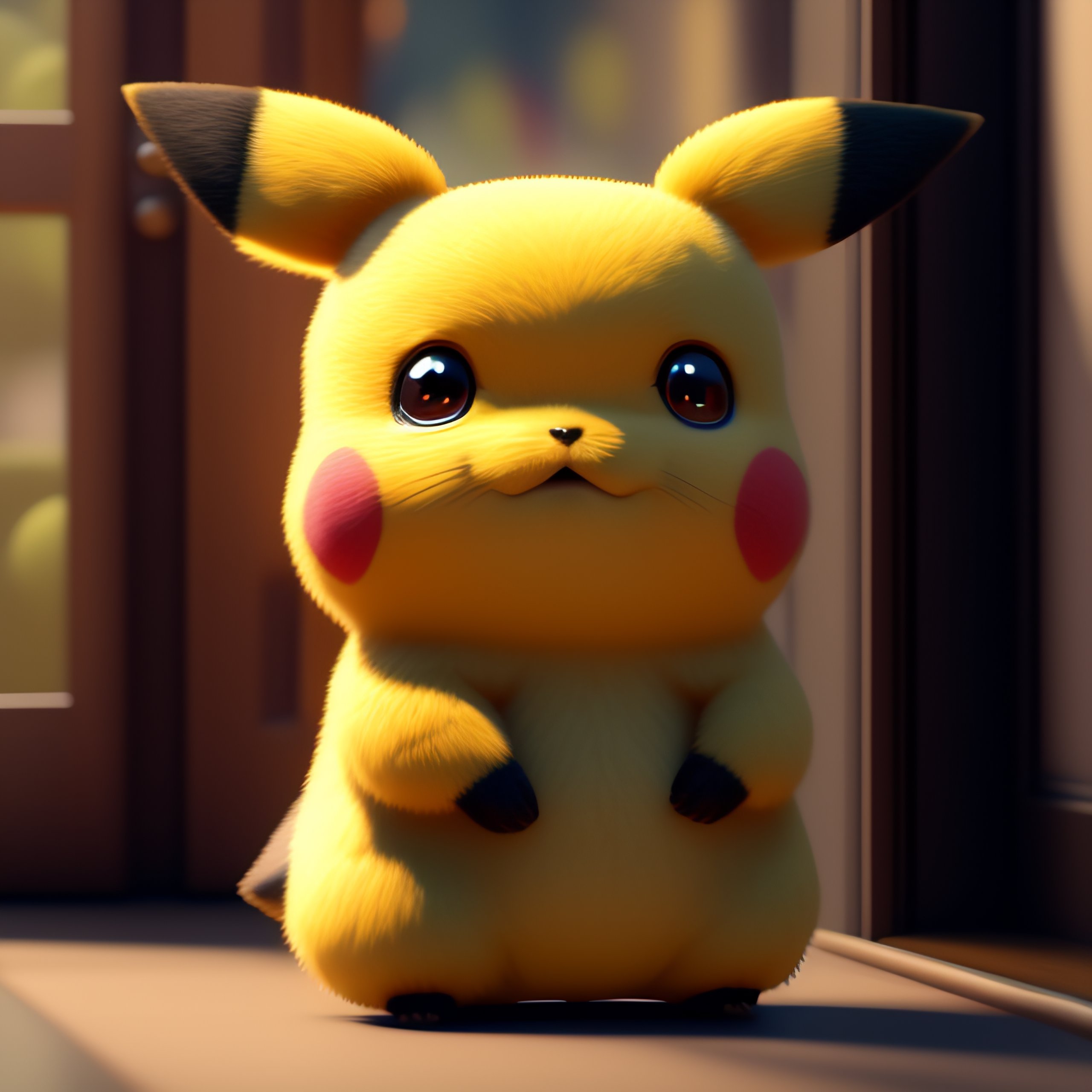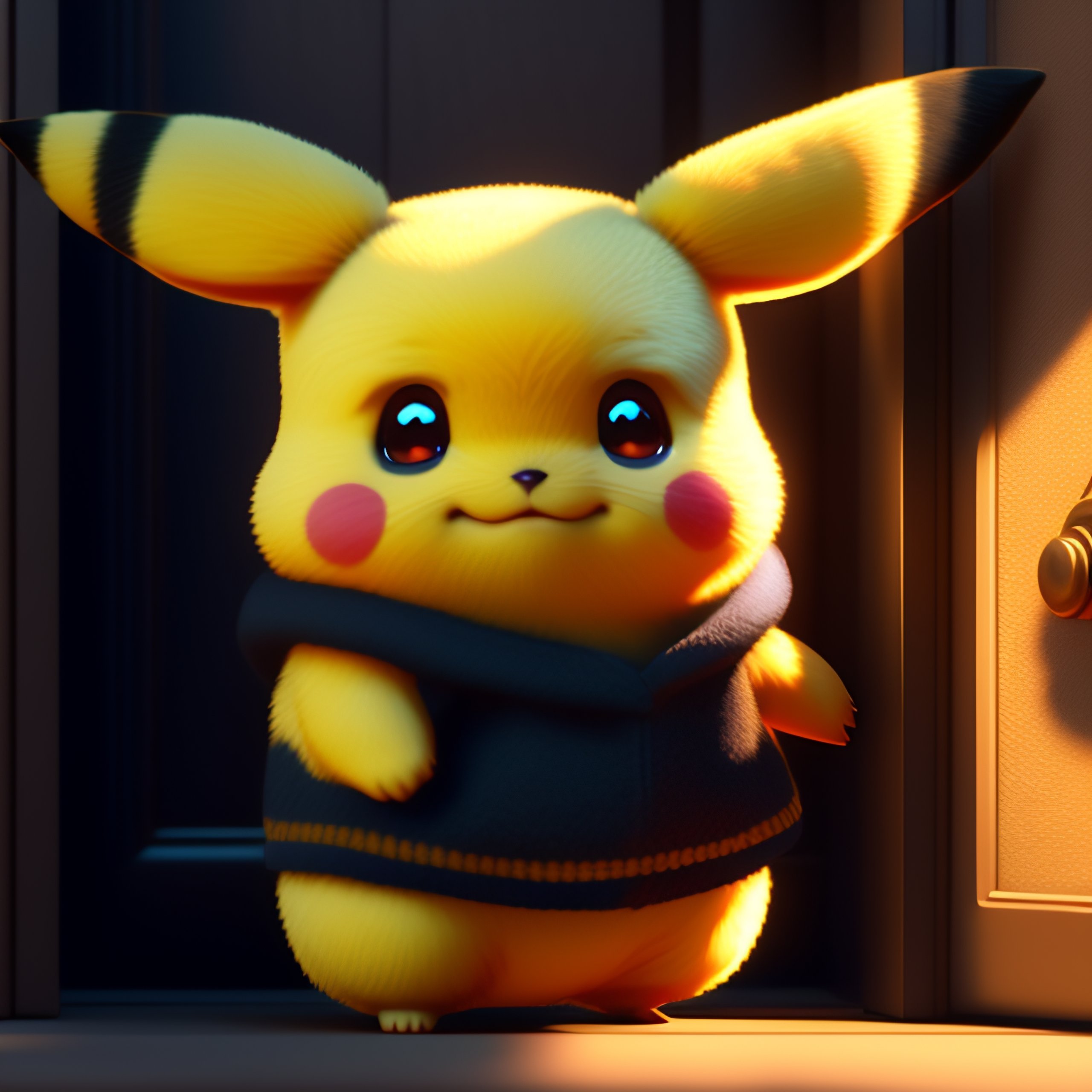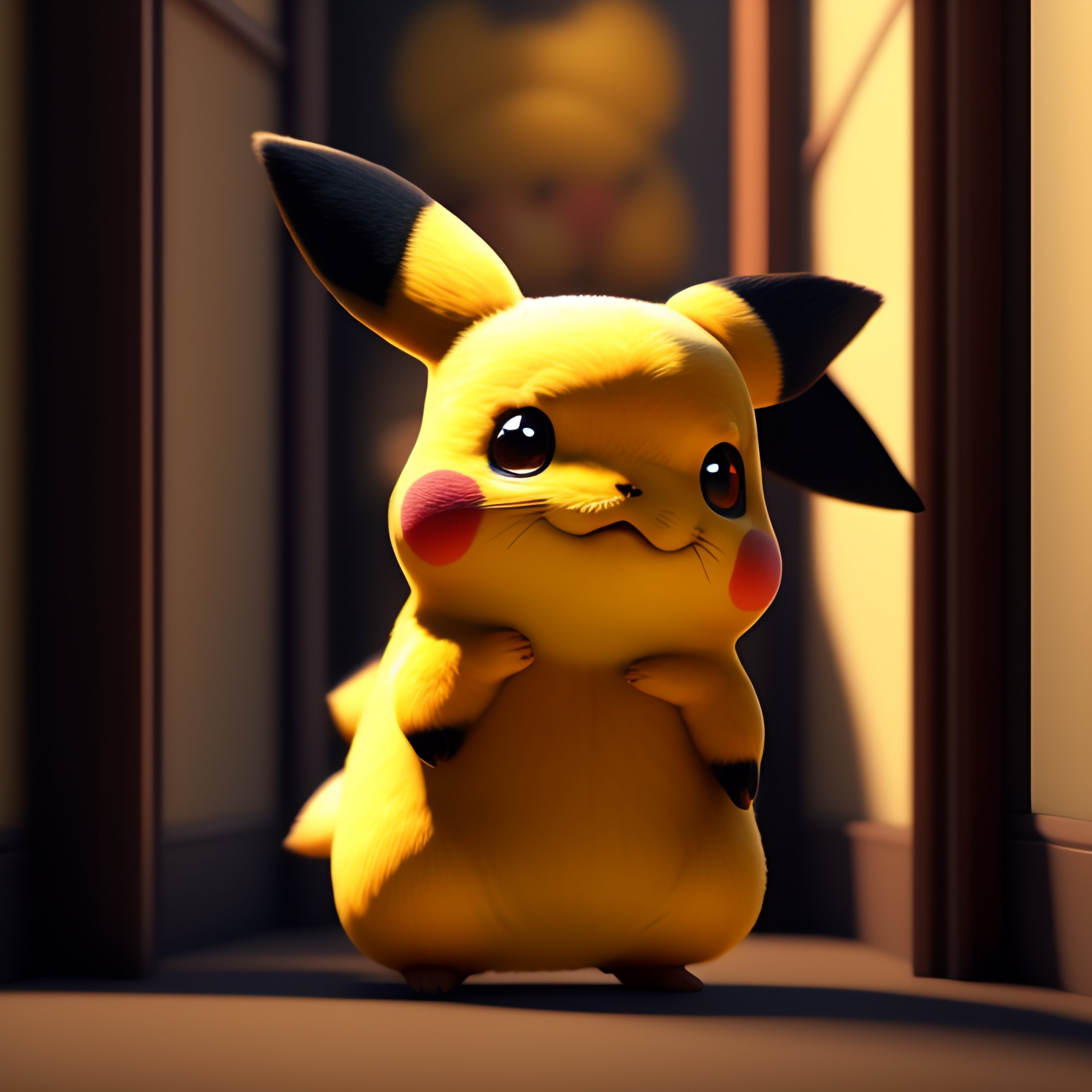 Cute little pikachu waving and smiling greeting me in front of the theater door, unreal engine, cozy interior lighting, art station, detailed digital painting, cinematic, character design by mark ryden and pixar and hayao miyazaki, unreal 5, daz, hyper realistic, octane rendering