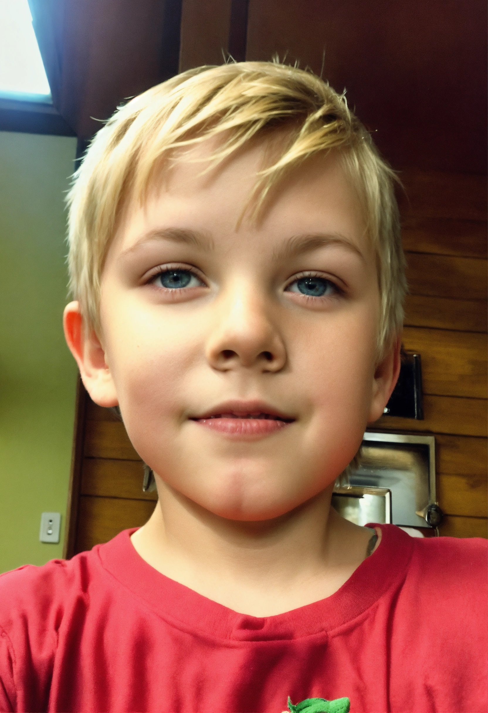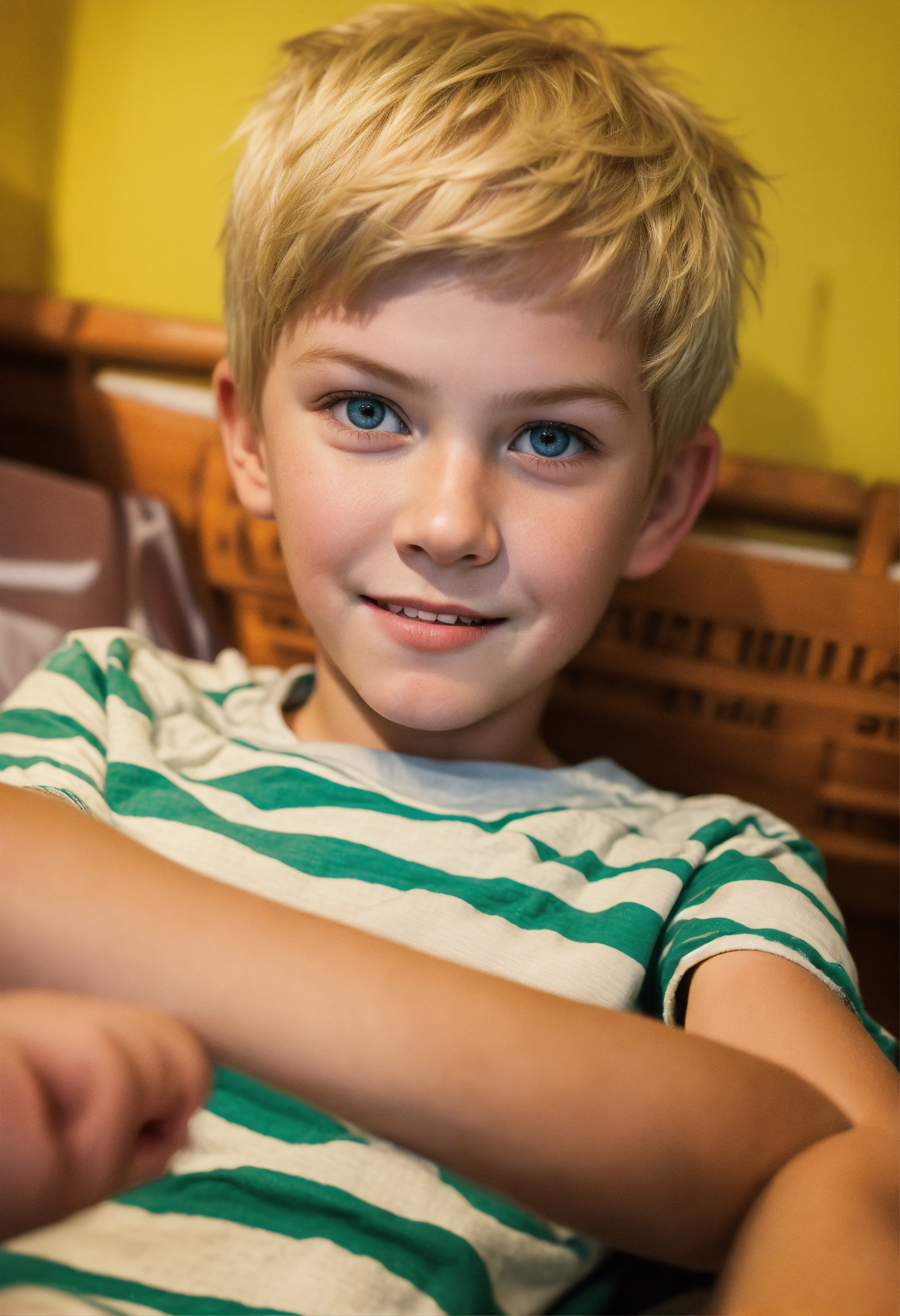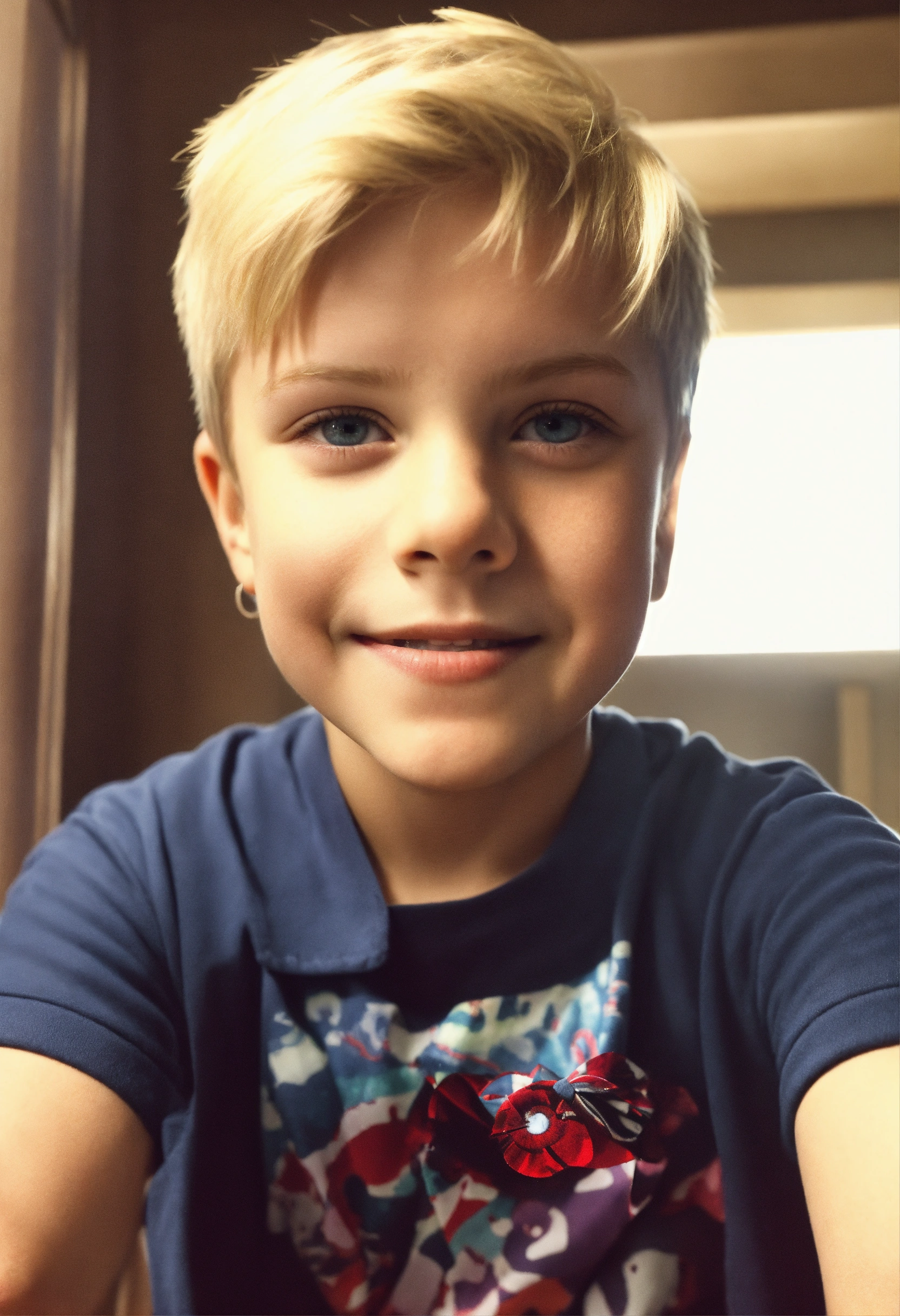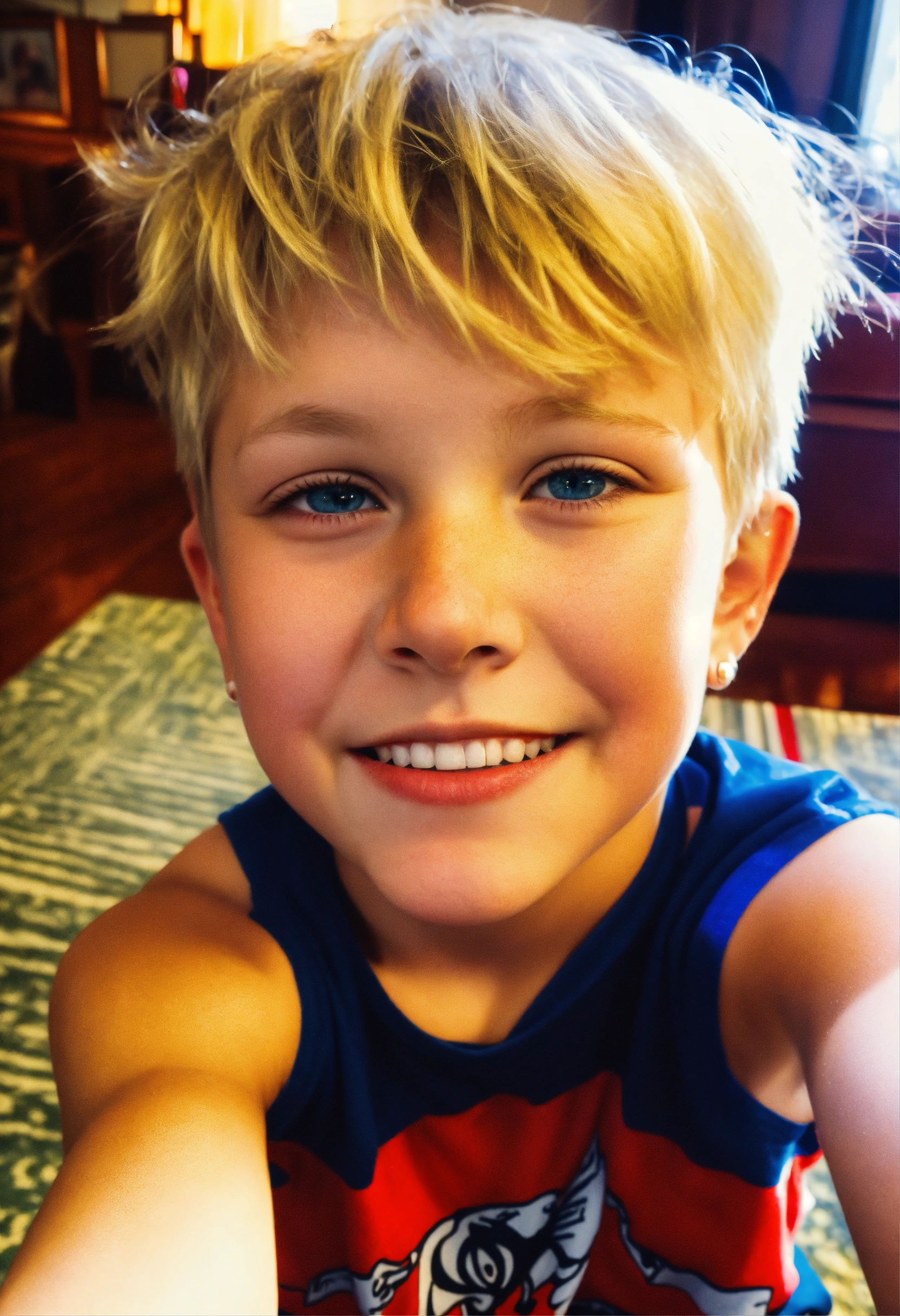 Selfie, photo, 8-year-old blonde boy, brat, spoiled brat, wicked, mischievous, adorable, short hair, obnoxious, cruel, devilish, shorts, smirk, looking at viewer, eye contact, teasing, bully, real, grainy photo, natural lighting, indoors