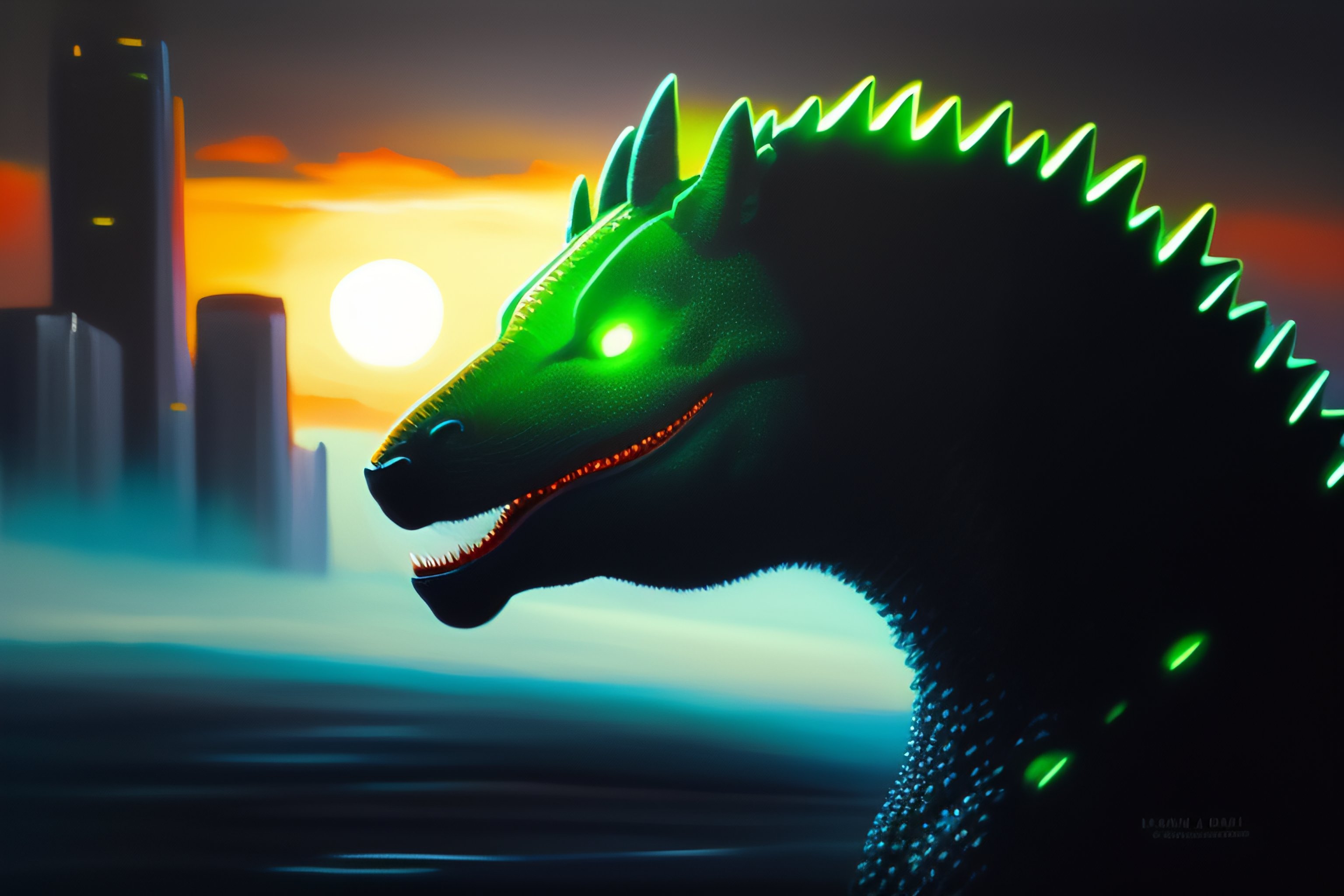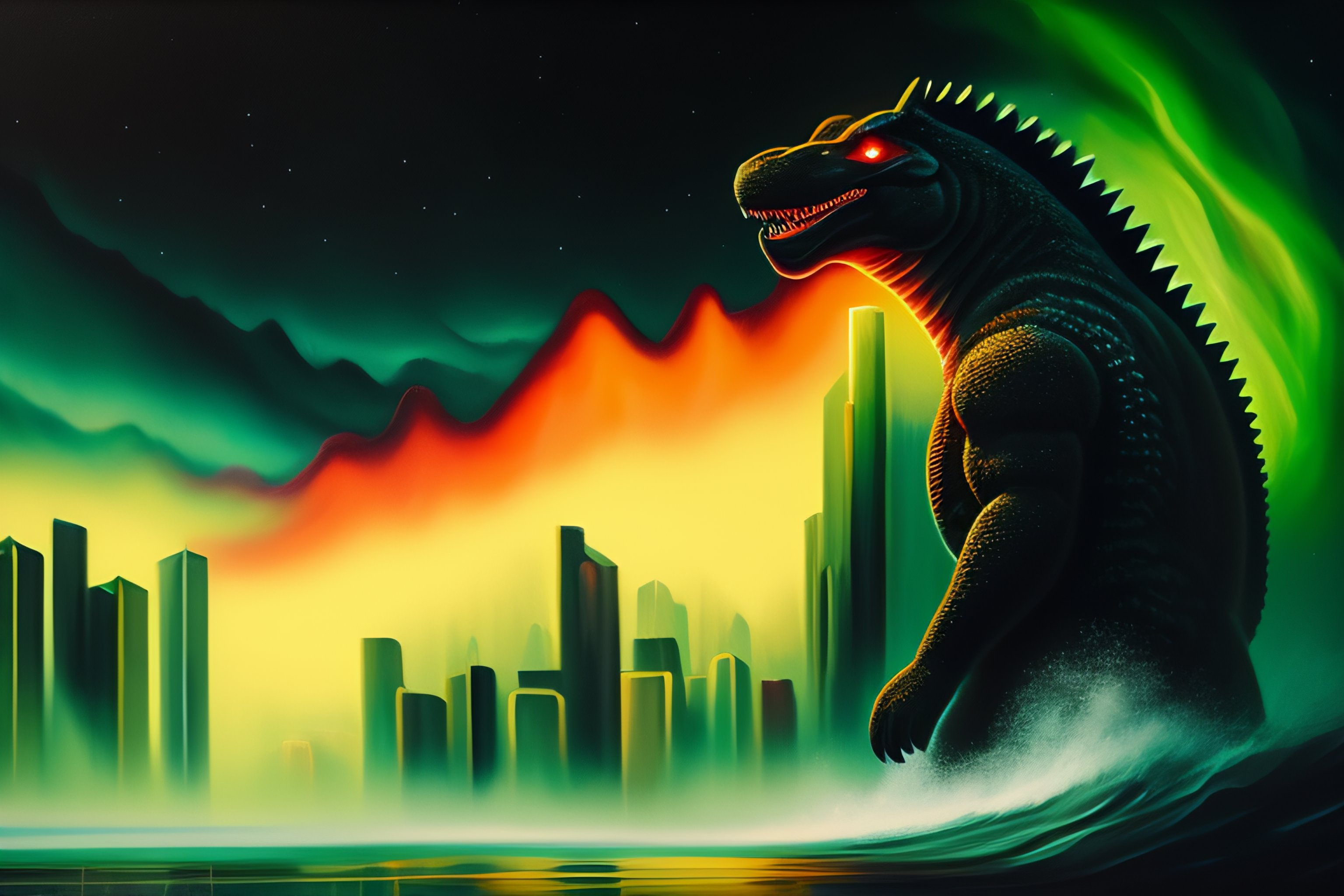 Black godzilla, stock chart, bullish, green candle stick chart, epic, oil painting, cinematic lighting