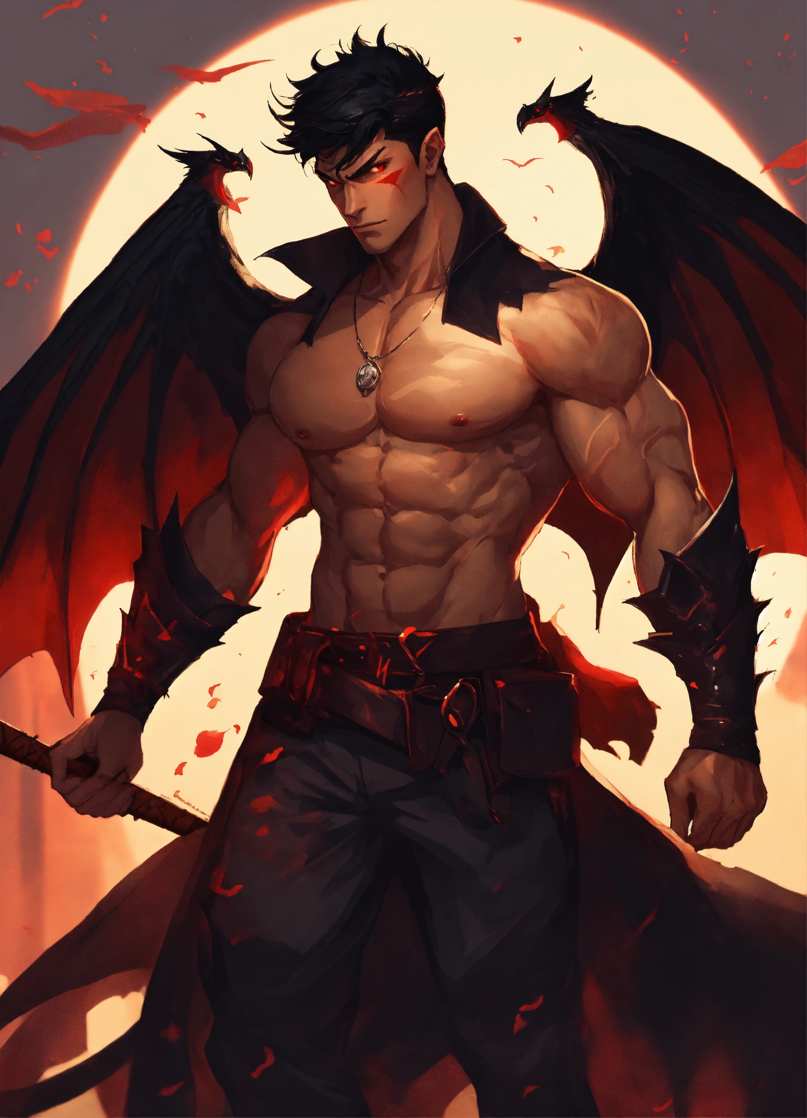 A handsome half demon man with broad shoulders, muscular frame, tan skin, huge bat wings, red eyes and short black hair, dnd character dangerous mystery dark clothing