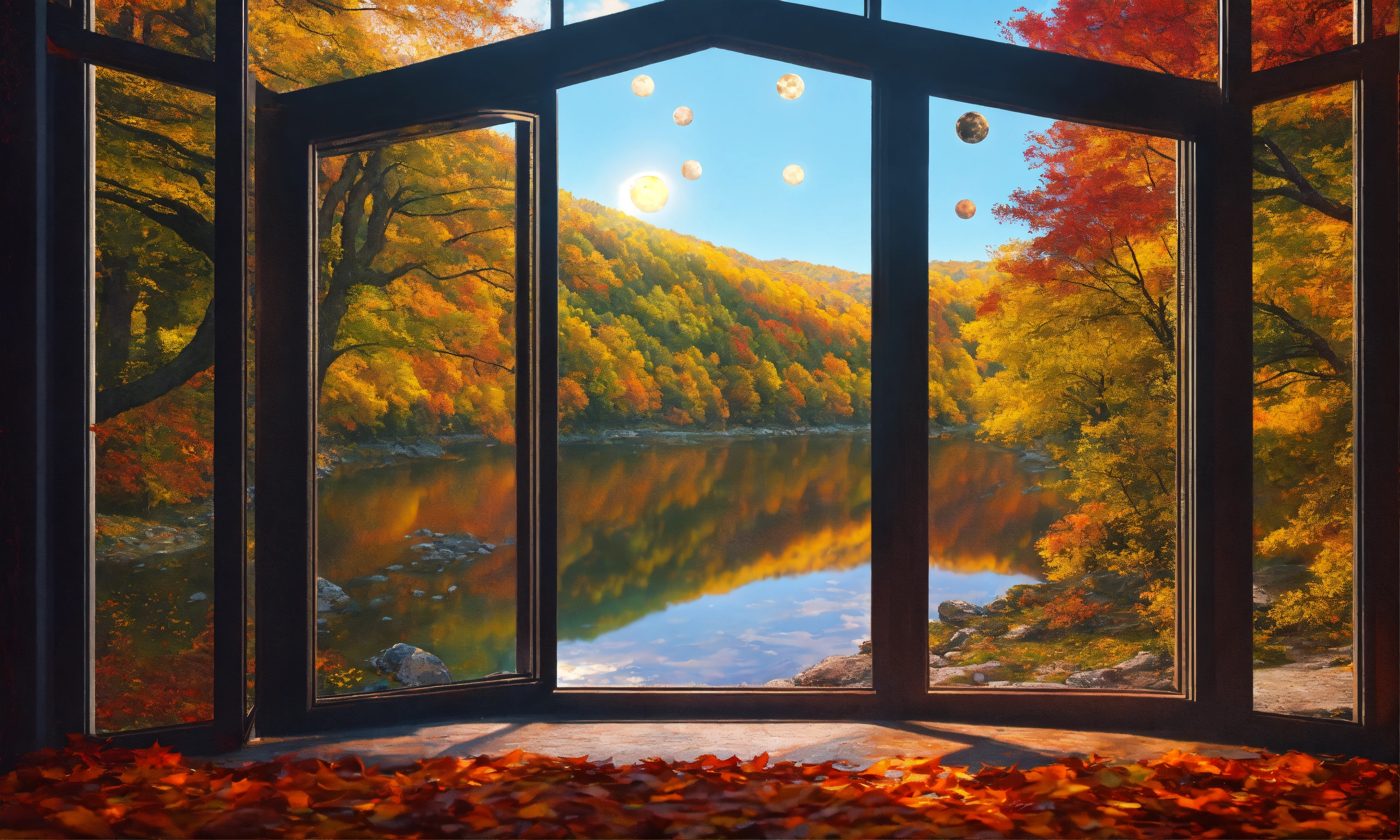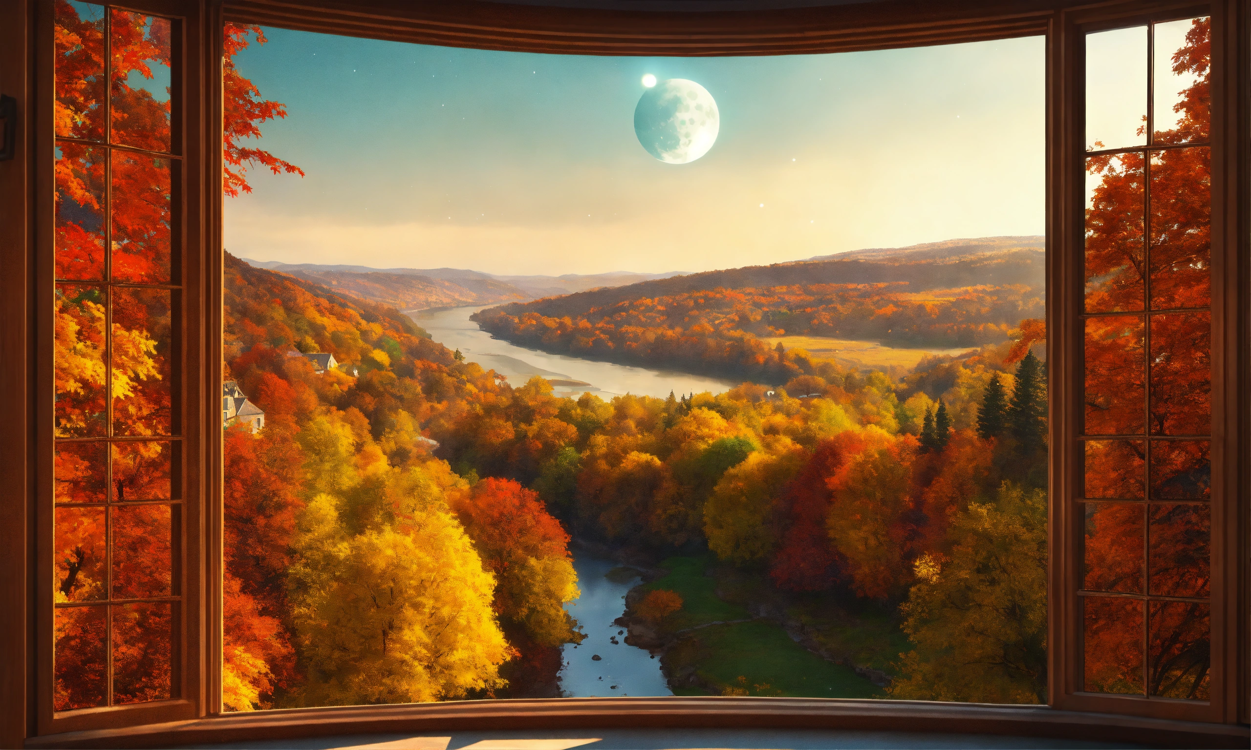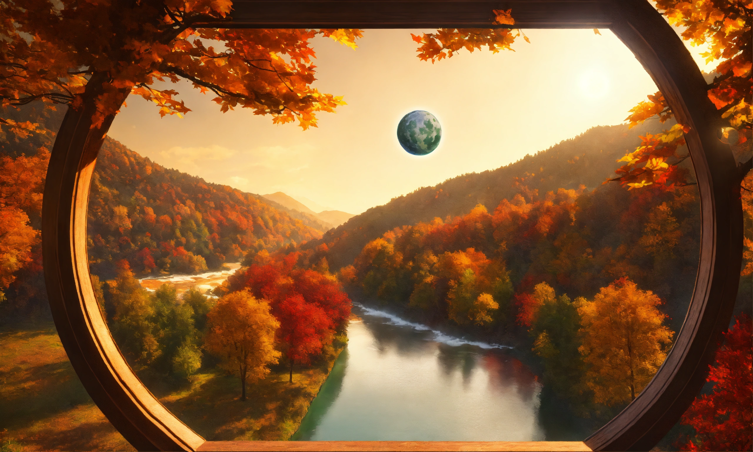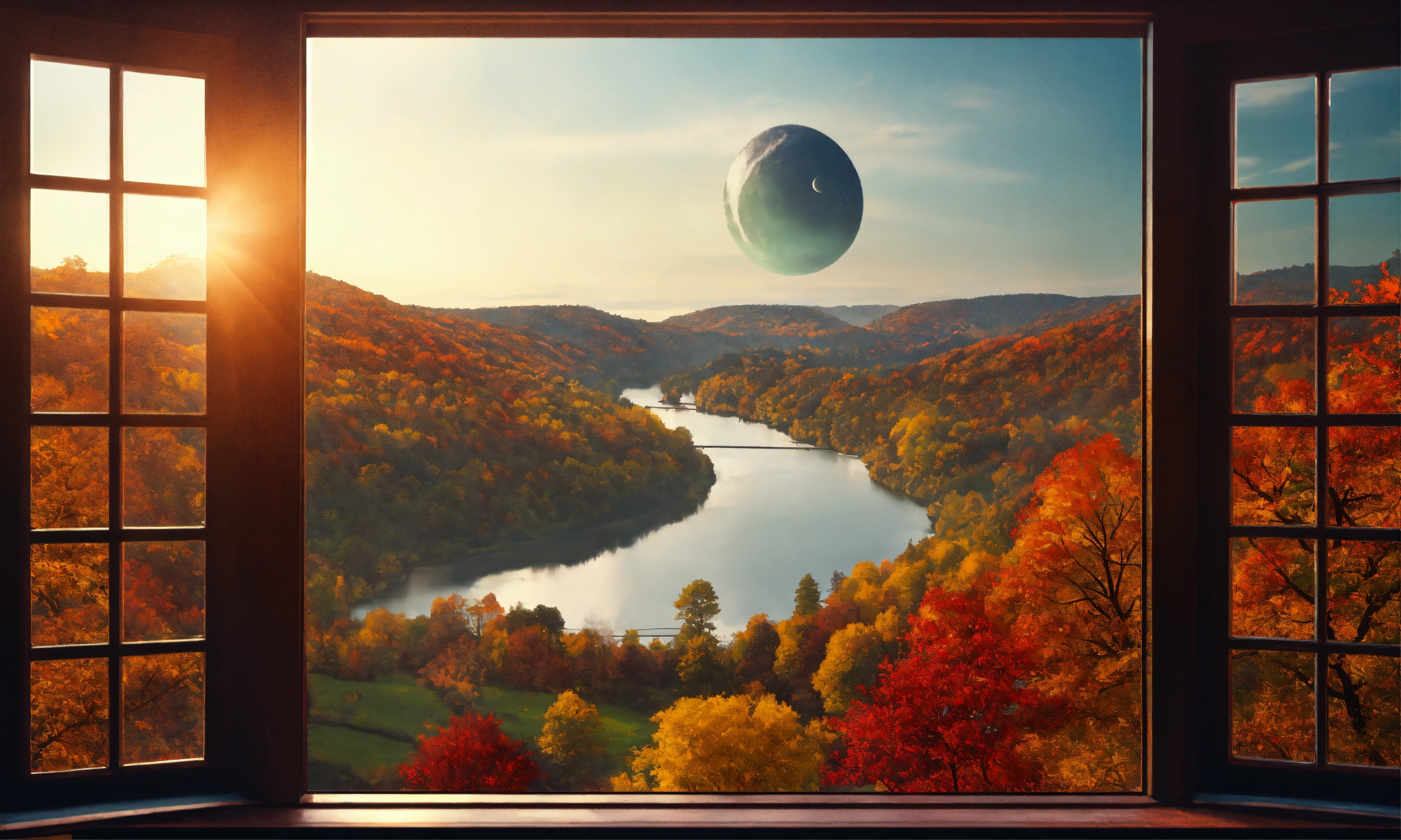 Looking out through a hexagonal window overlooking a valley with a river filled with autumnal trees with vibrant colored leaves planet with two moons realistic photo quality stable diffusion 4k resolution