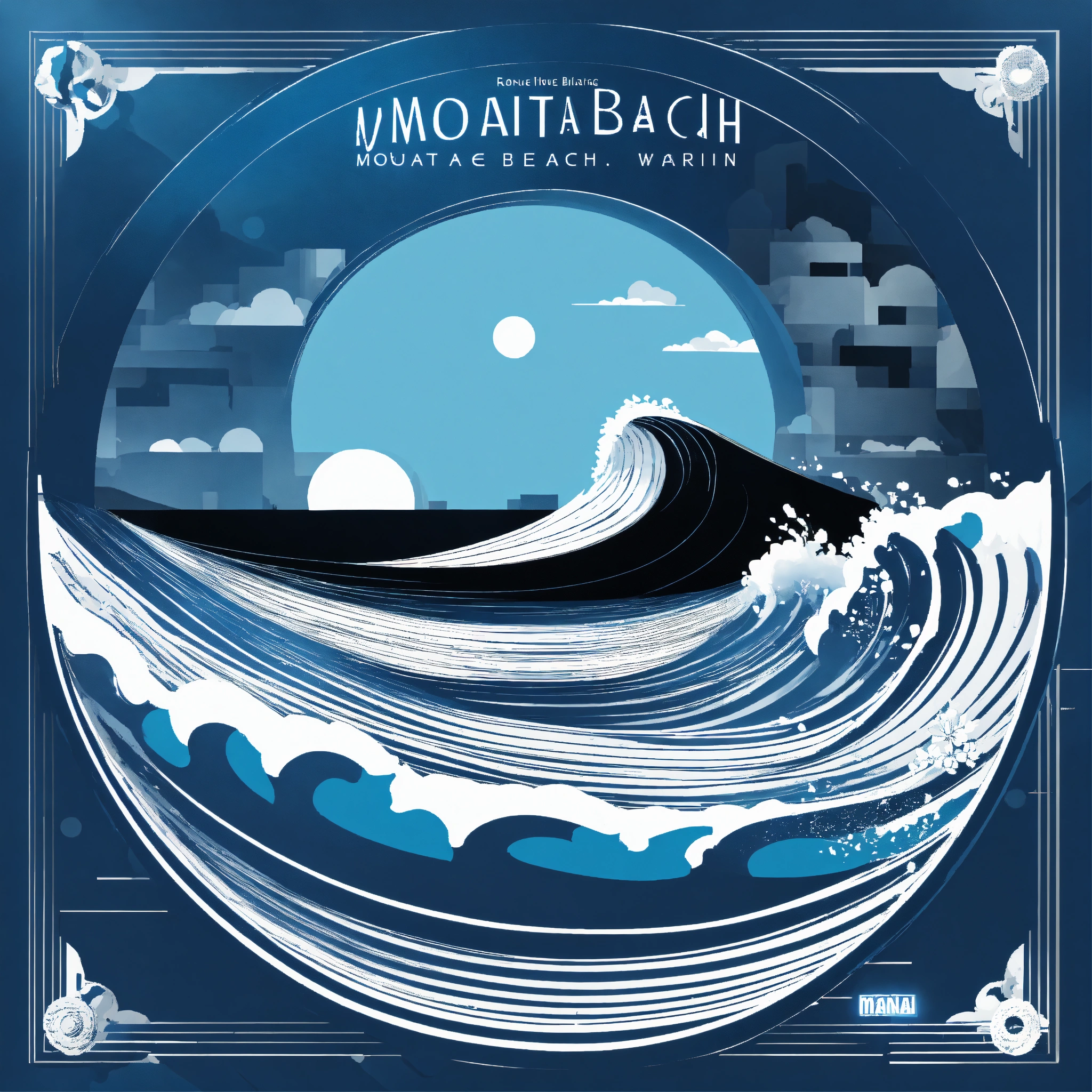 Flat vector design rond, minimal, bold branding in blue, black, white colors, whit flower, large wave made of machine parts, text montabeach, with blue background, with photo fusion, with photo effects, with cinema lighting