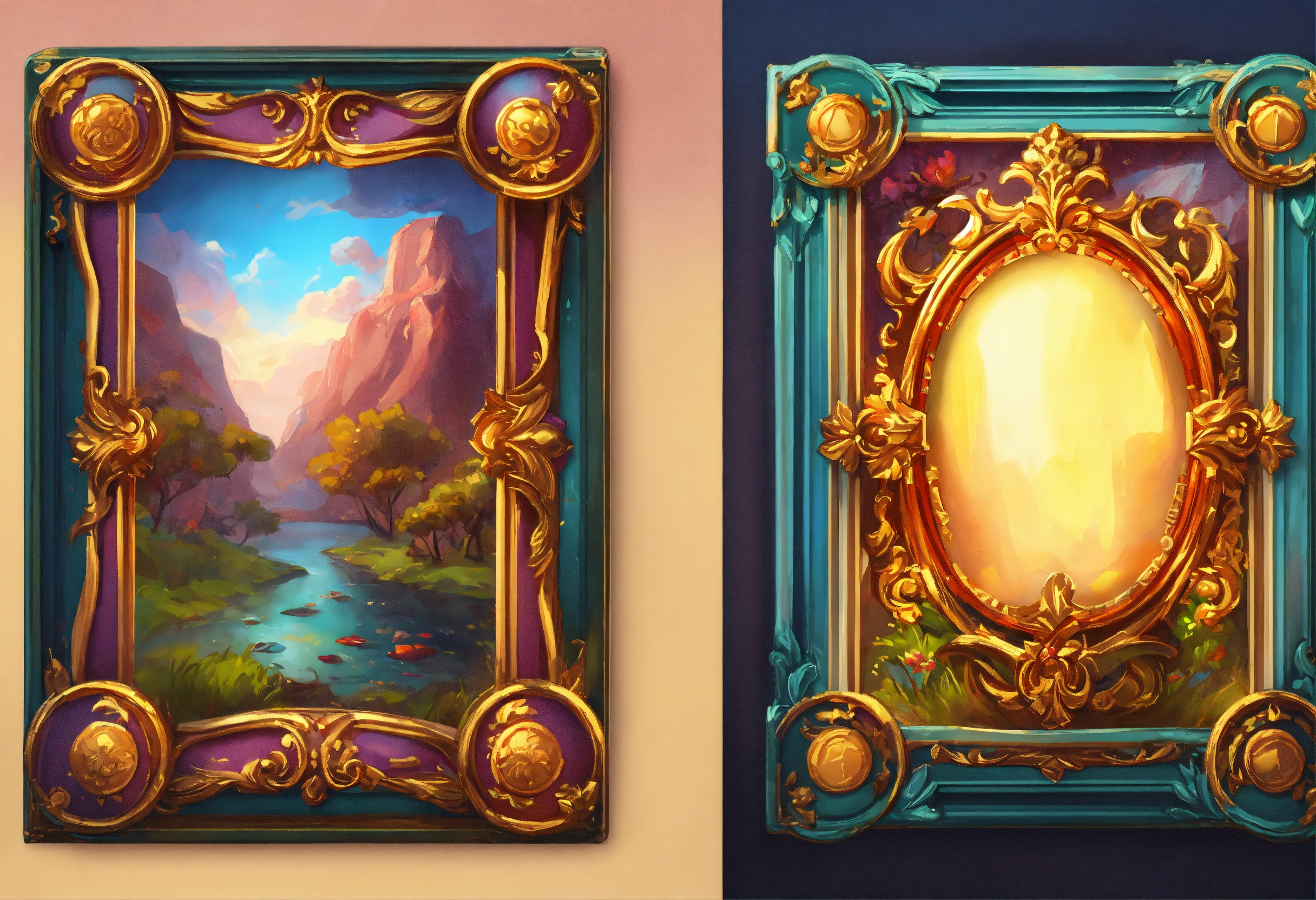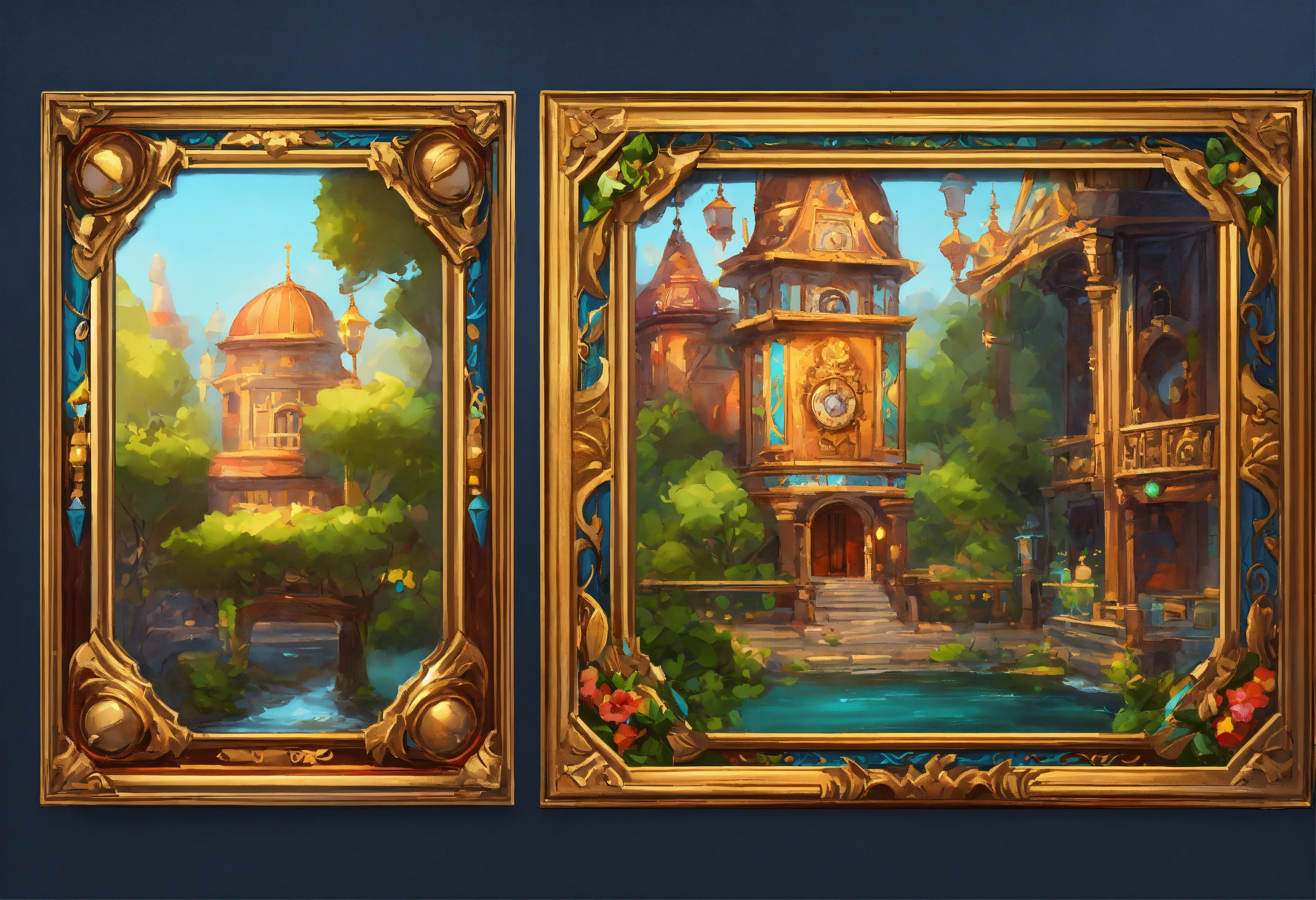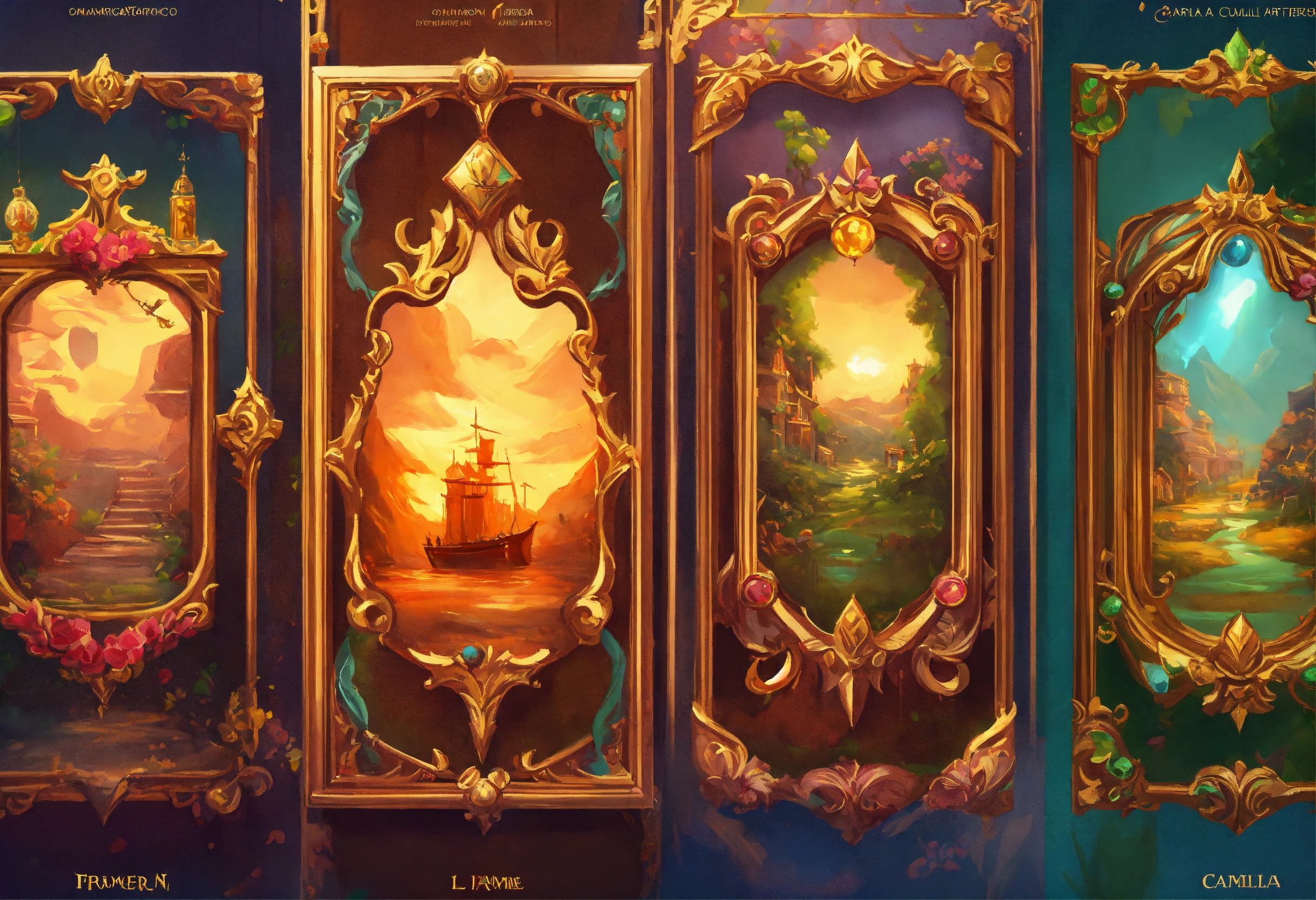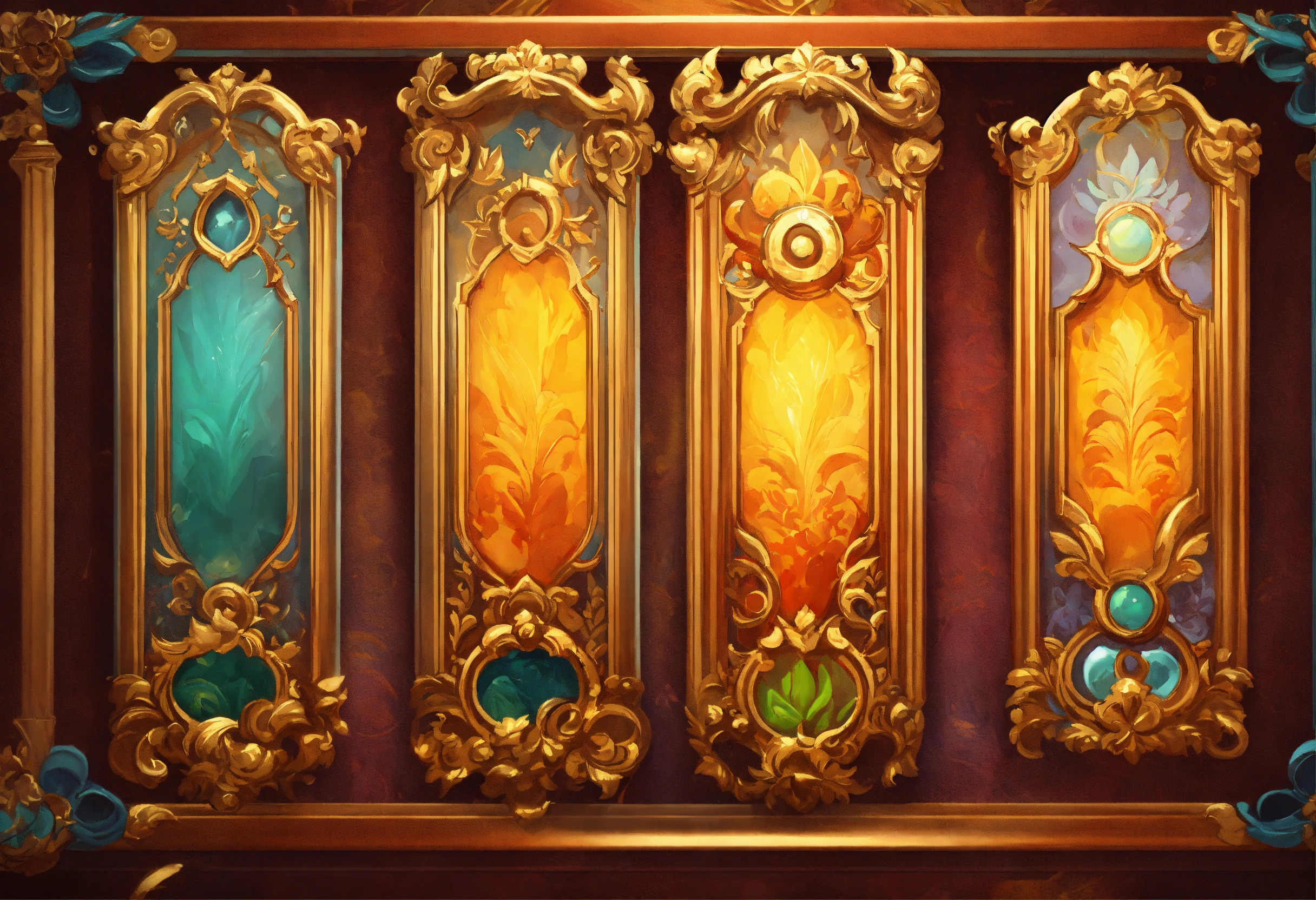 Ornamental frame slot game cards, realistic cartoon oil paint, 2d illustration style, sharp focus, bright color, digital paint design, trending on artstation, high details, simple lines, art by josé luis ágreda and camilla d'errico.