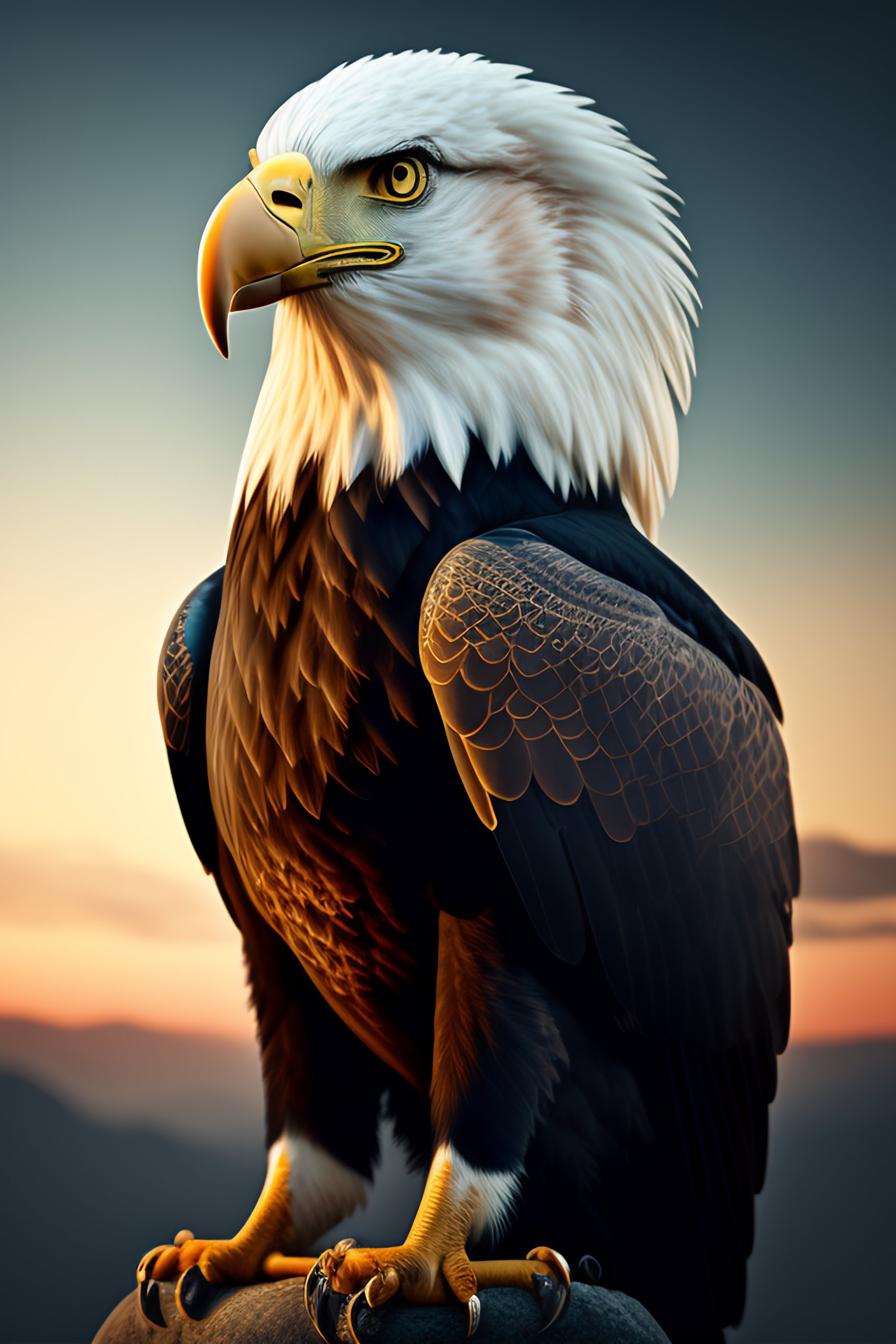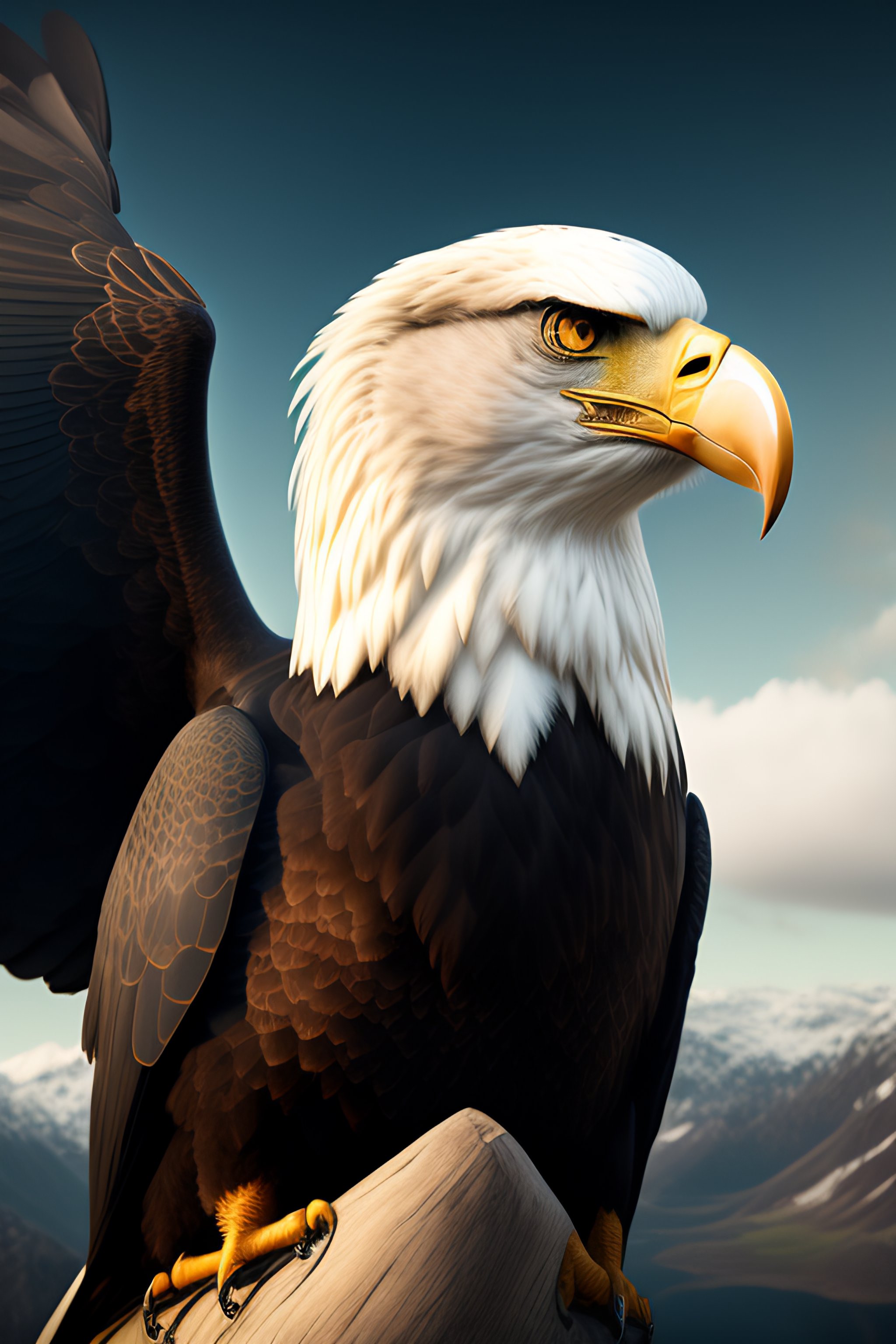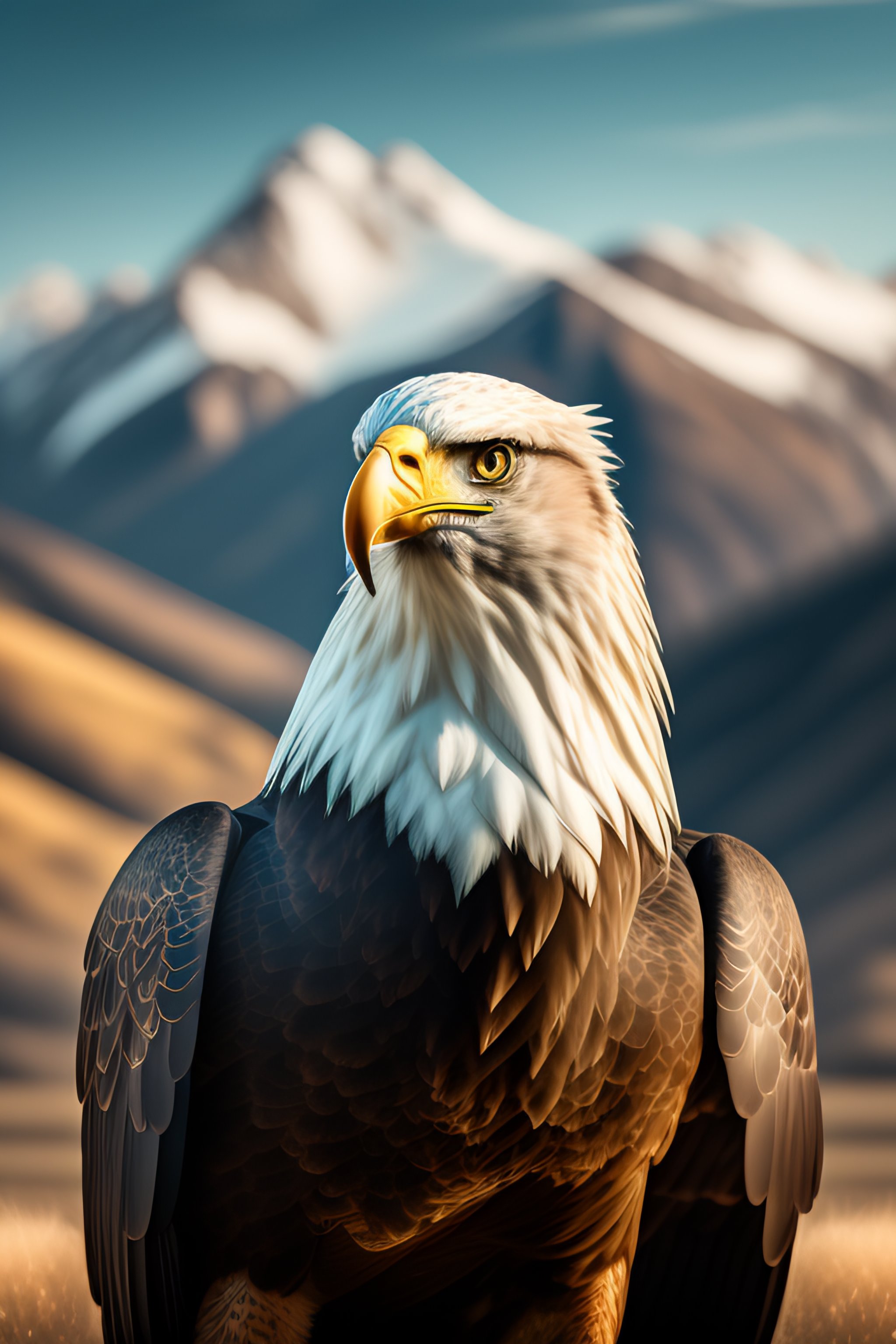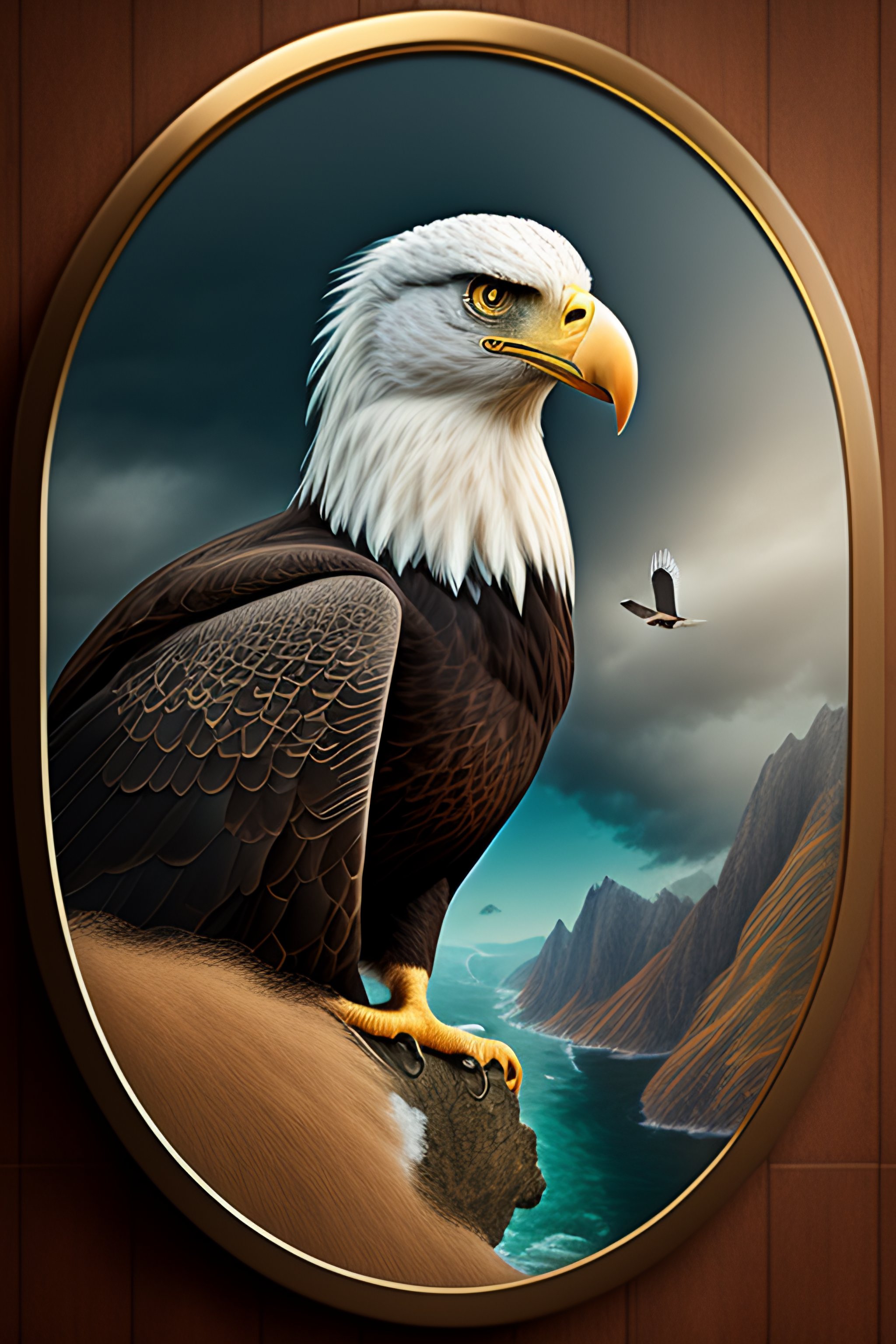 Fierce majestic front facing bald eagle in front of detailed shield of arms realistic world landscape atlas