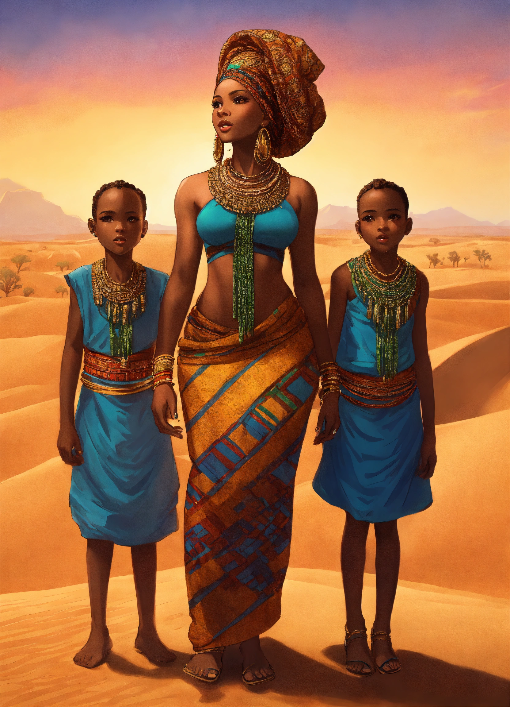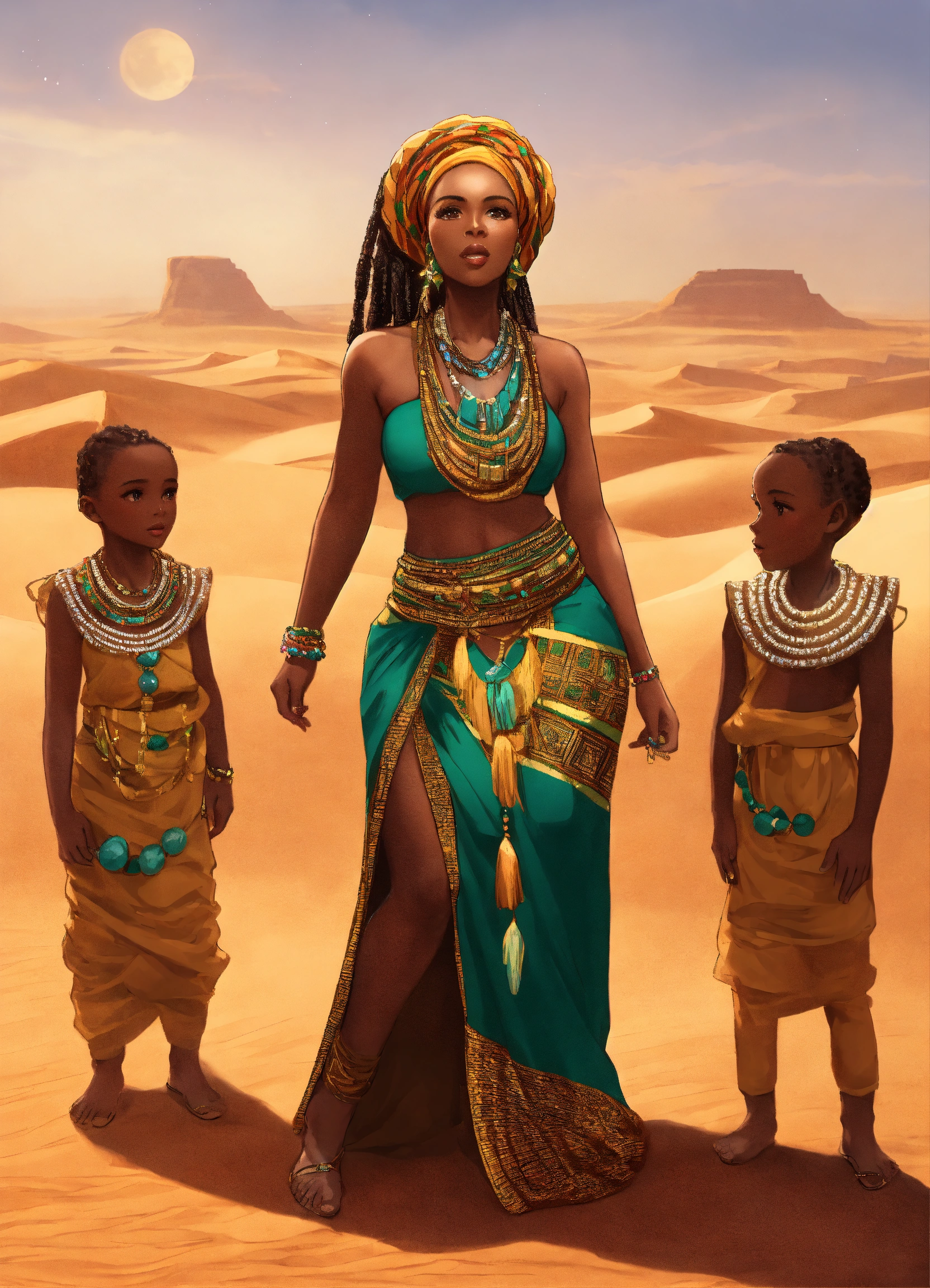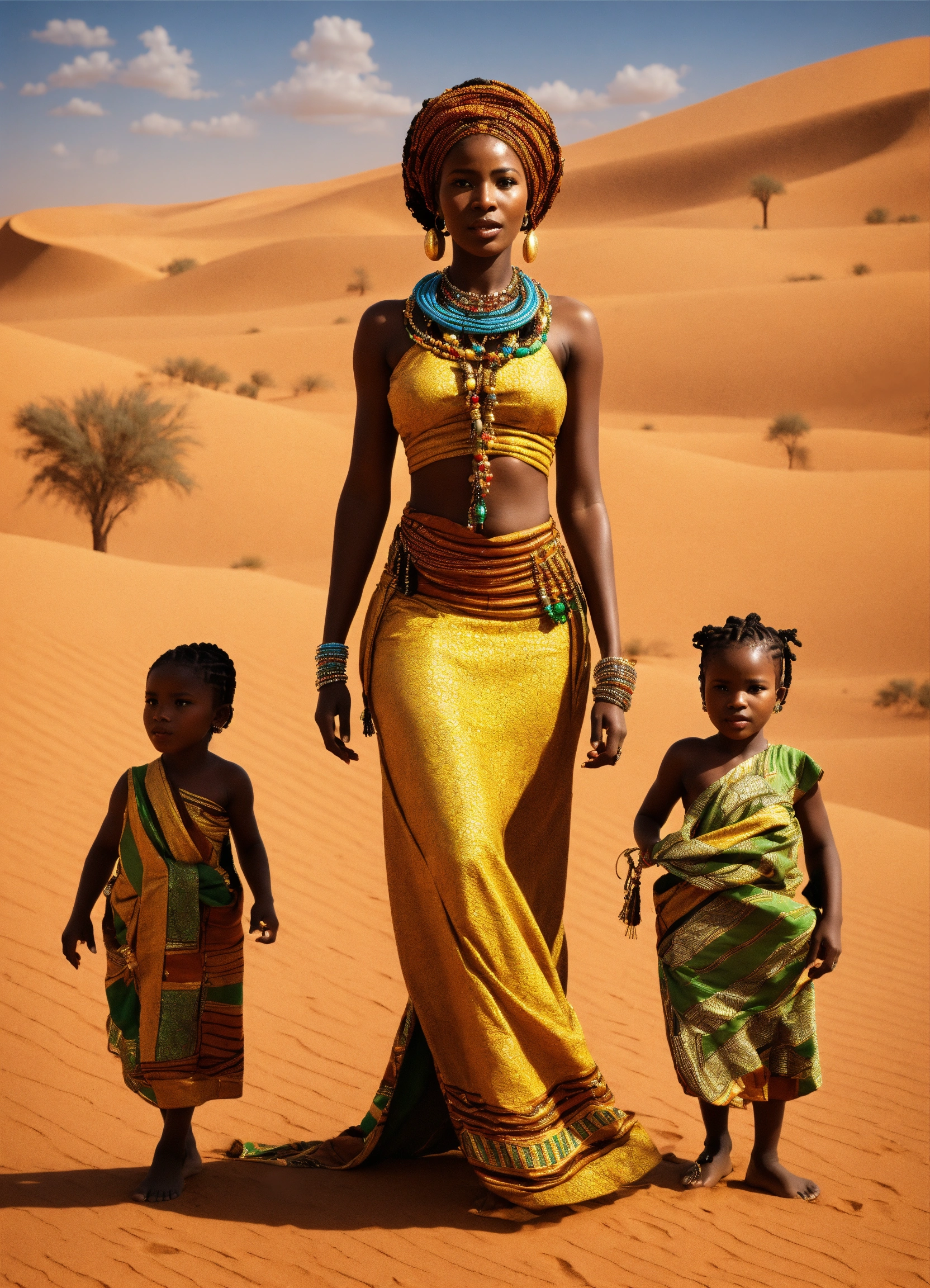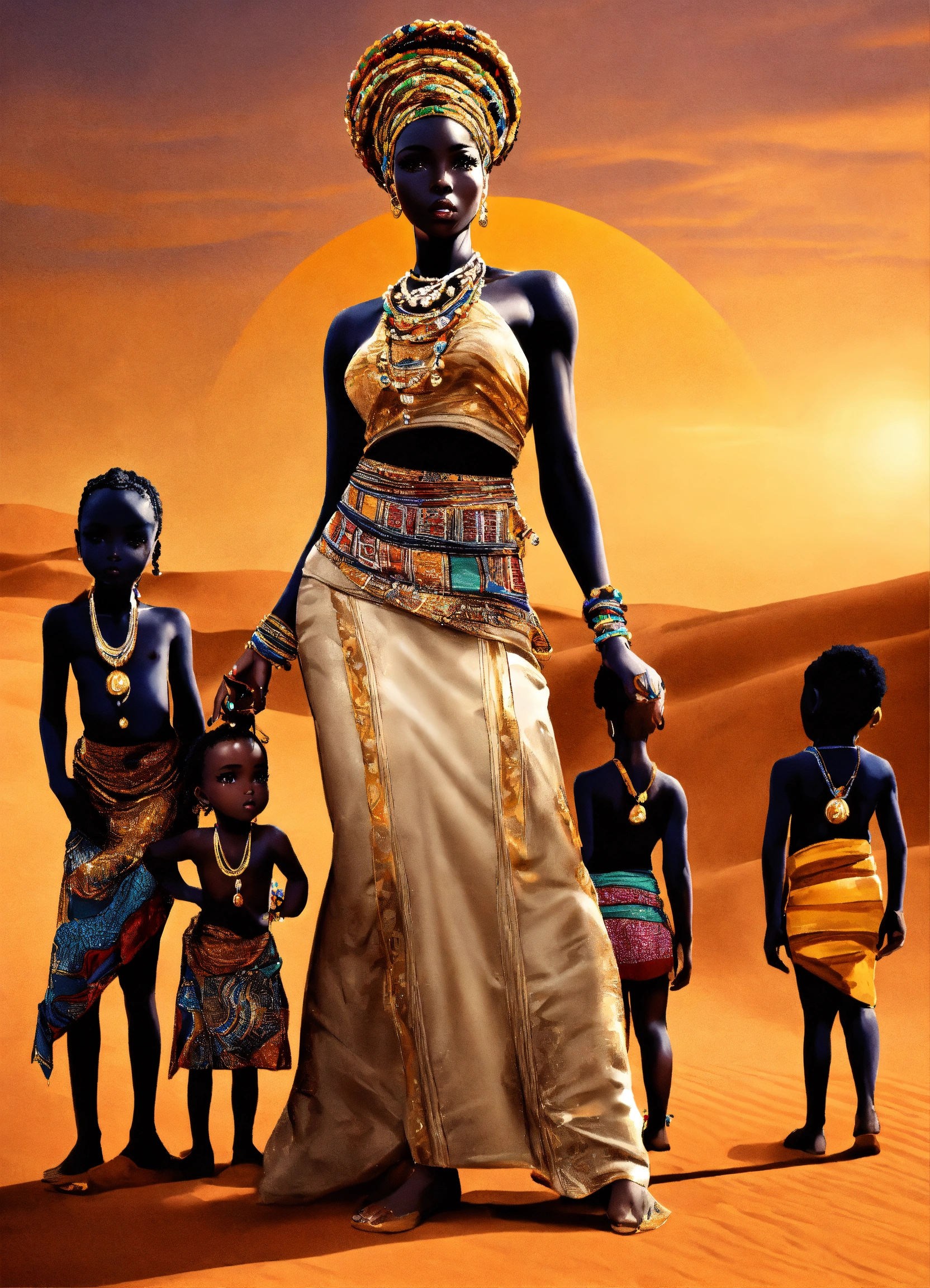 Full body incredibly beautiful 35 year old cartoon african woman with intricate cornrow braids in her hair dressed in jeweled elegant traditional african clothing gloriously standing in the sahara desert looking powerful with five little african children looking up to her for guidance
