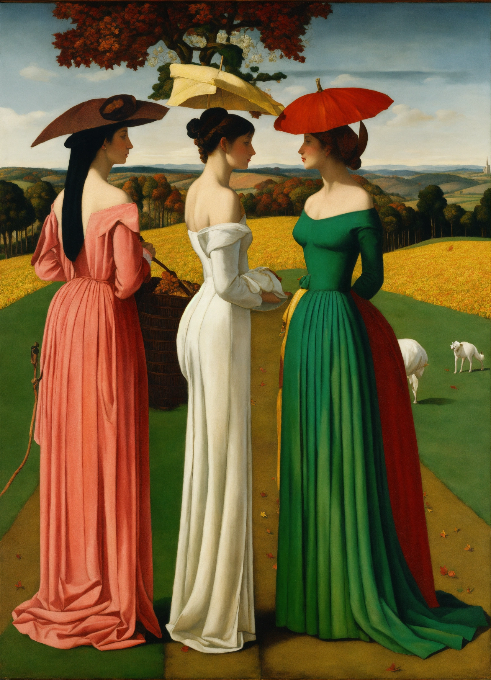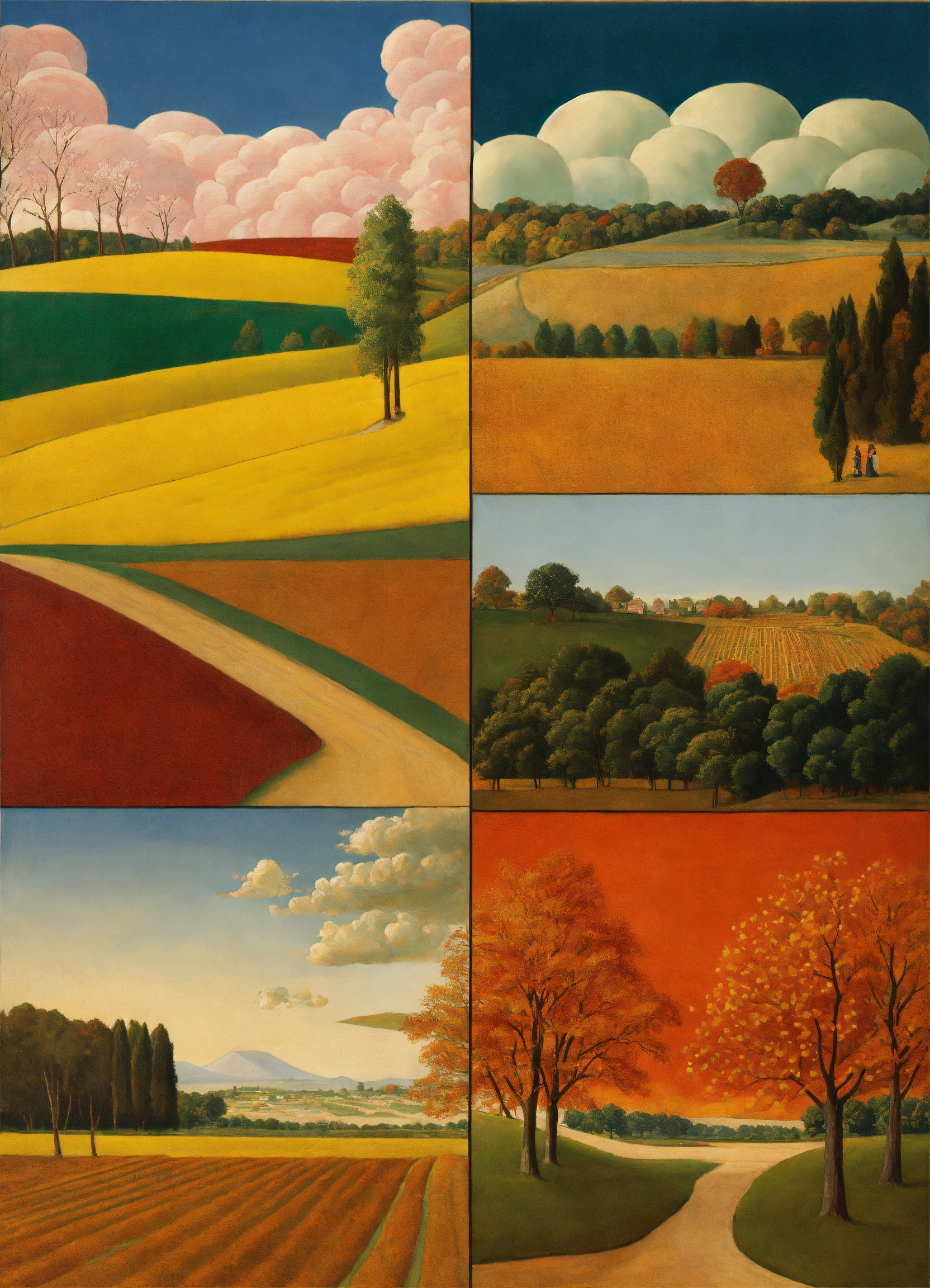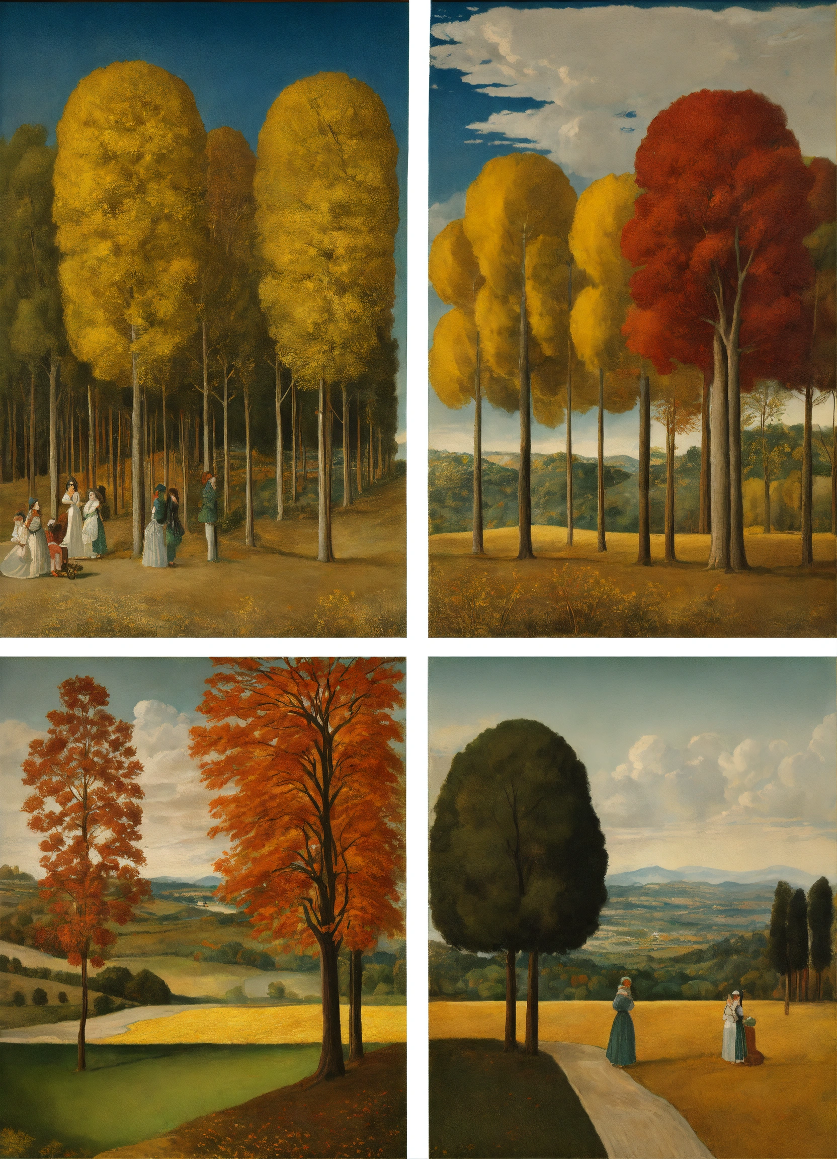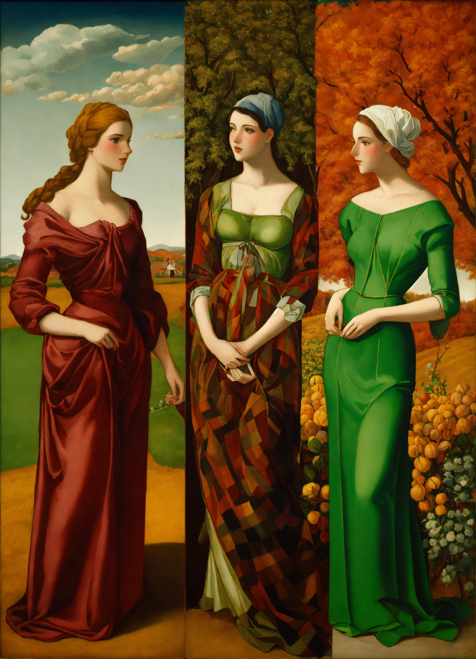 The four seasons (winter, spring, summer, and autumn) depicted by four women in the same large landscape, no separators, that de chirico would paint