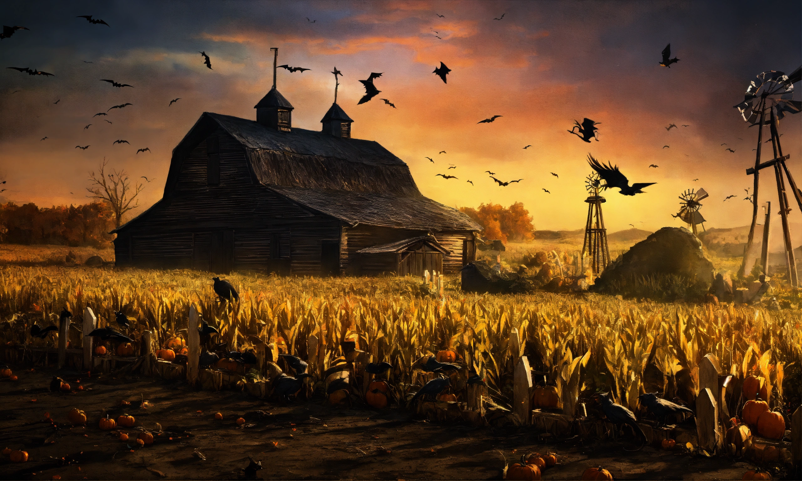 Witches, poison, halloween, corn field, haunted house, crows, barn, windmill, cave, bats, tornado, snake, tarantuls, cementery, grave, rats, cats, owls