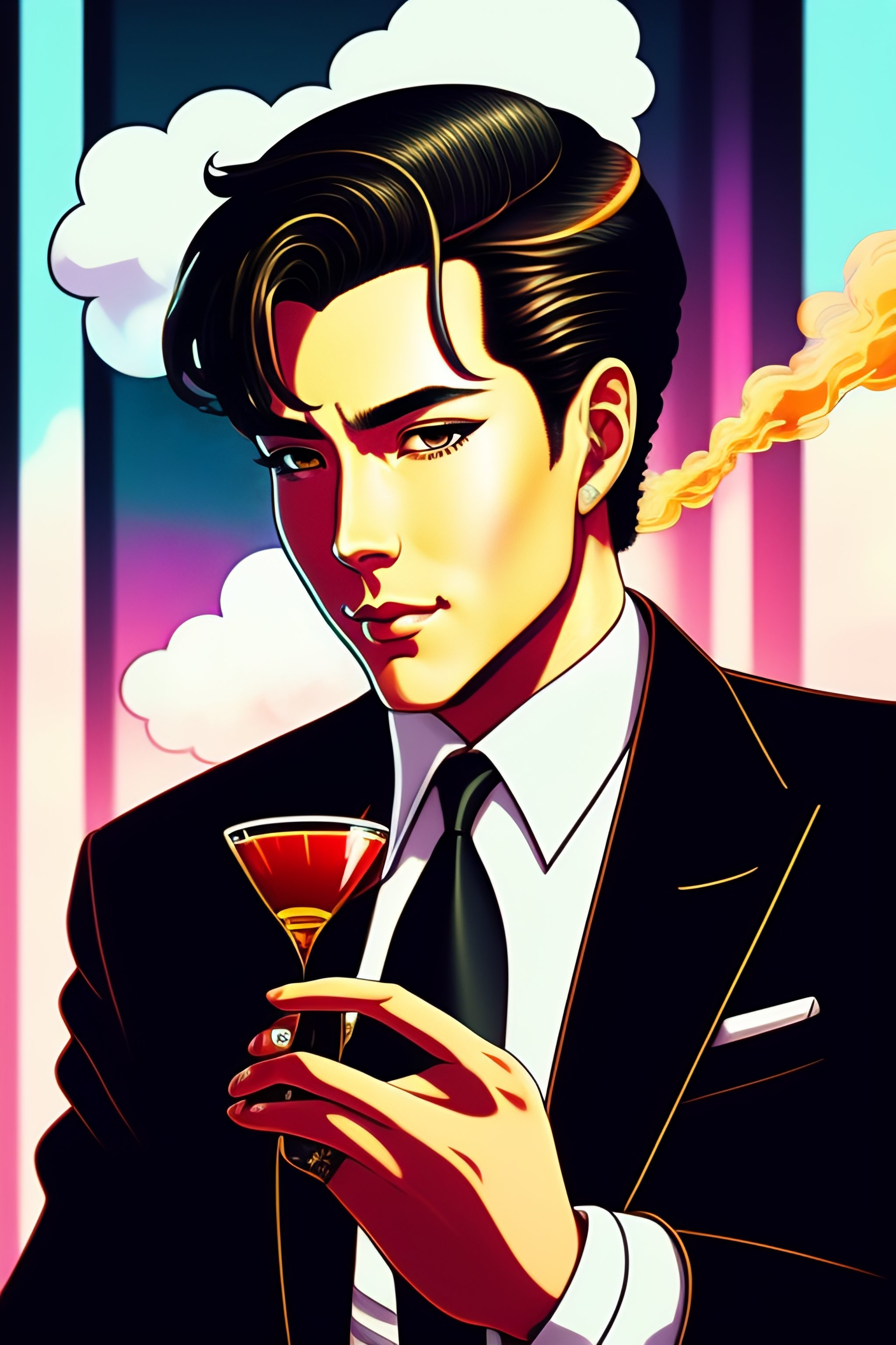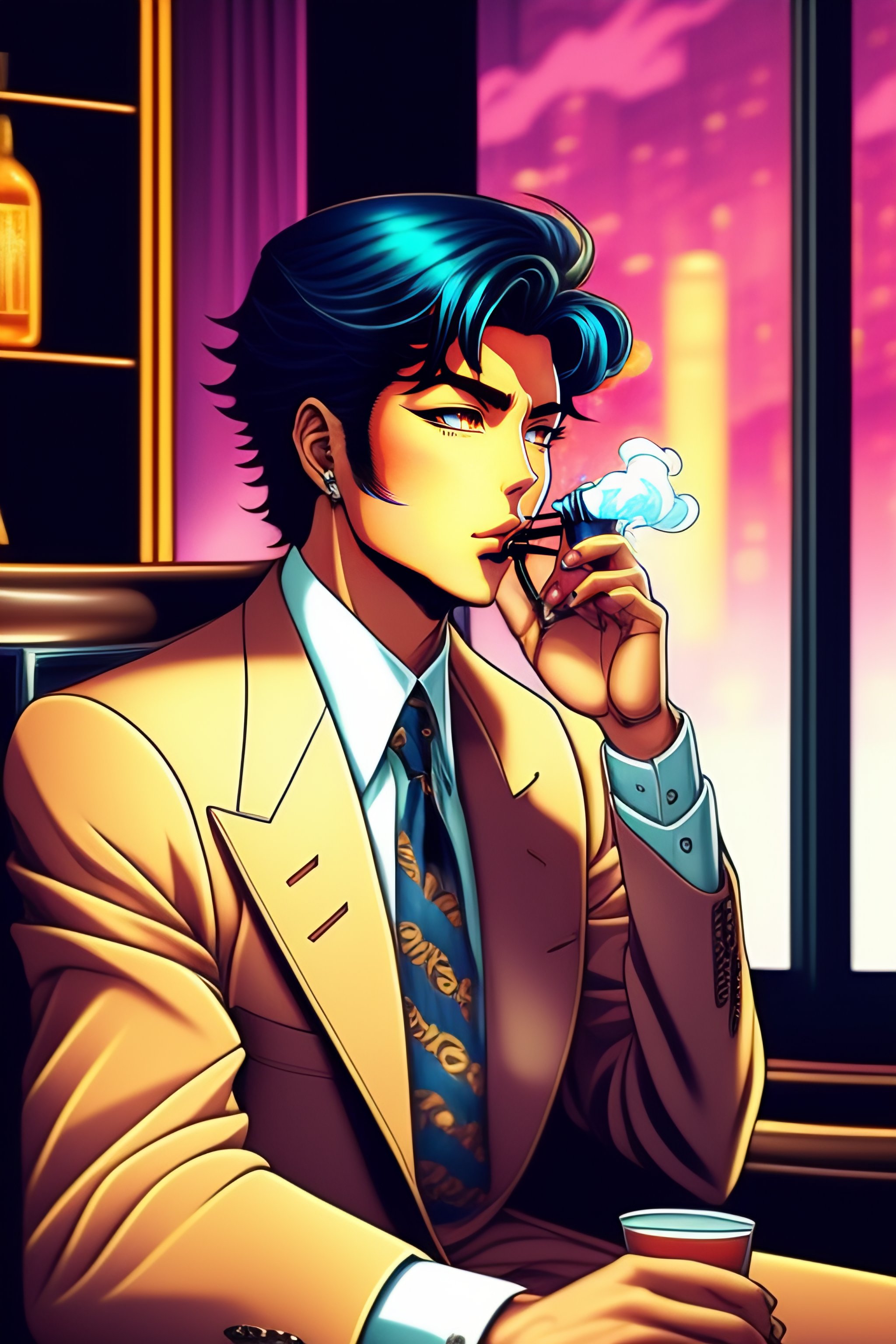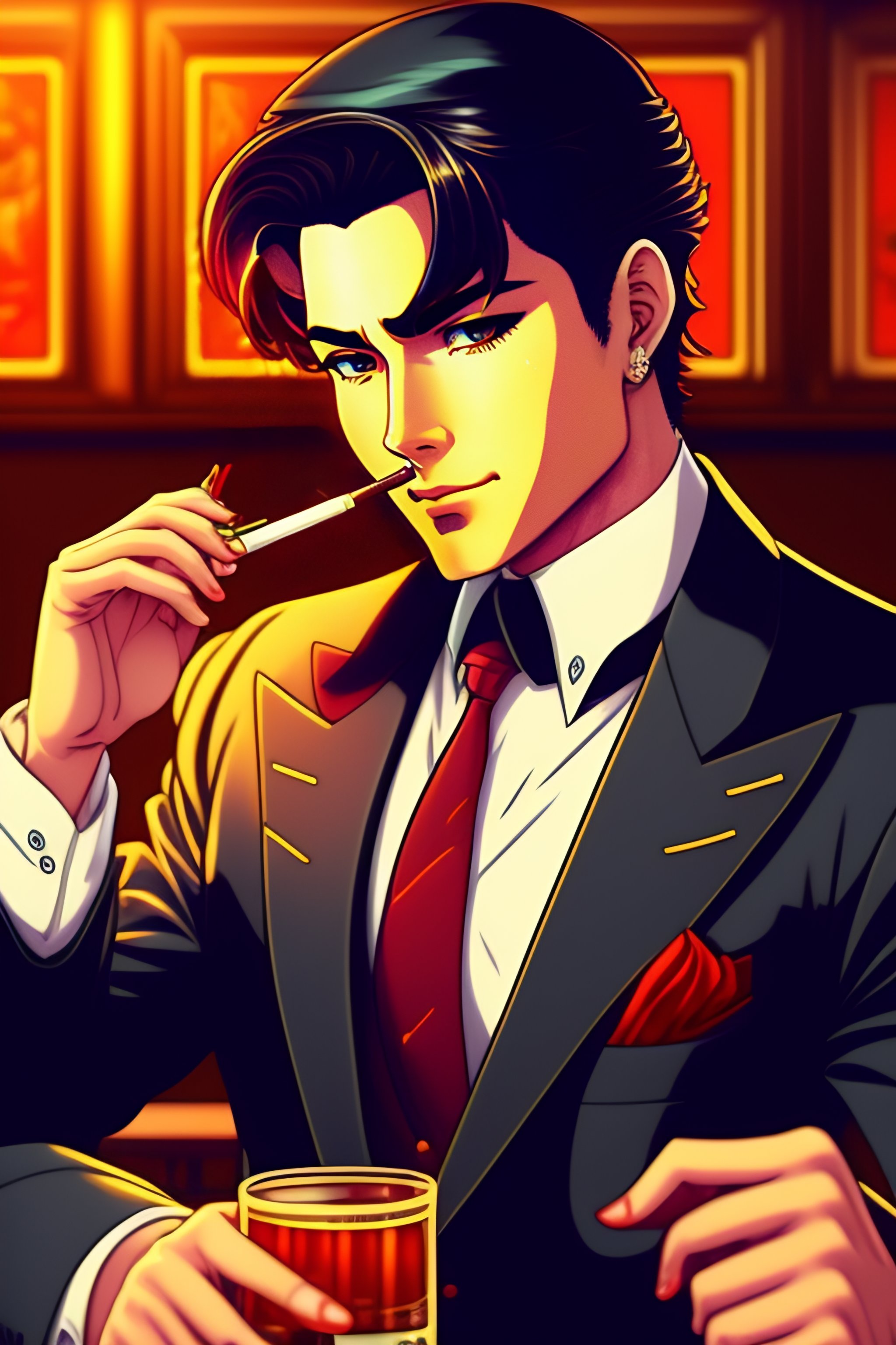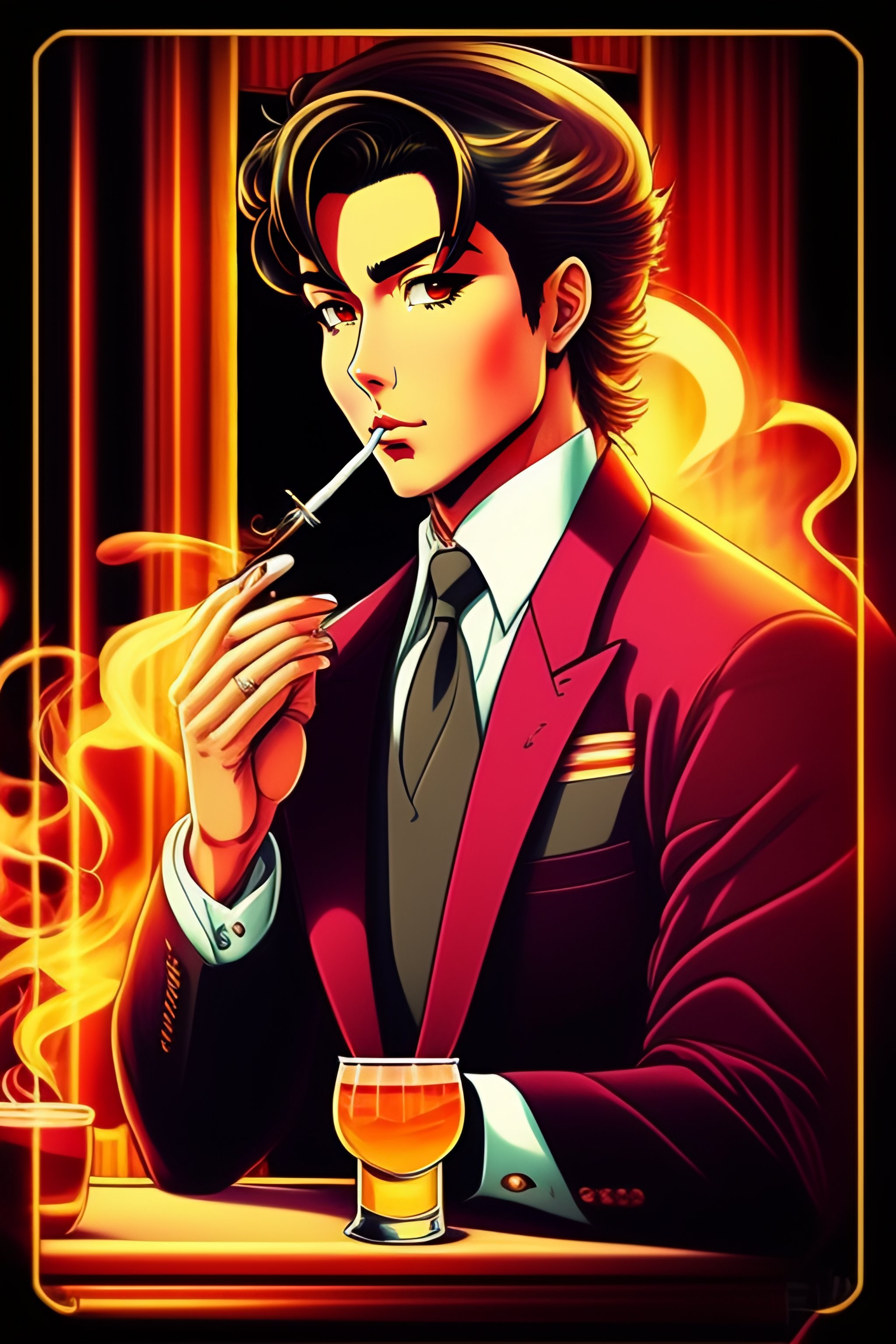 In the style of 90's vintage, anime art of a stylish business man smoking a cigarette inside a cocktail lounge, detailed art, fine line art 90’s vintage anime