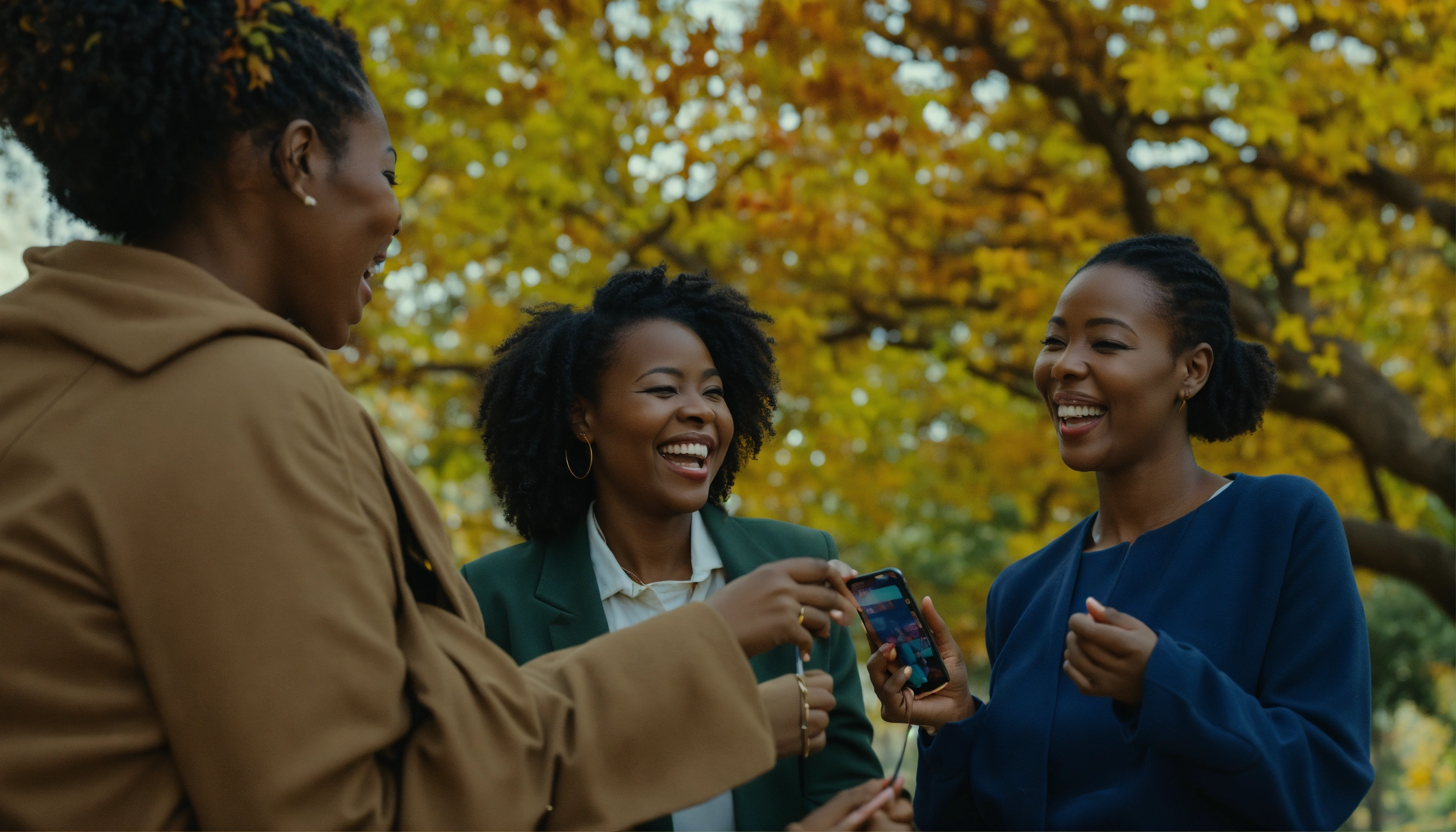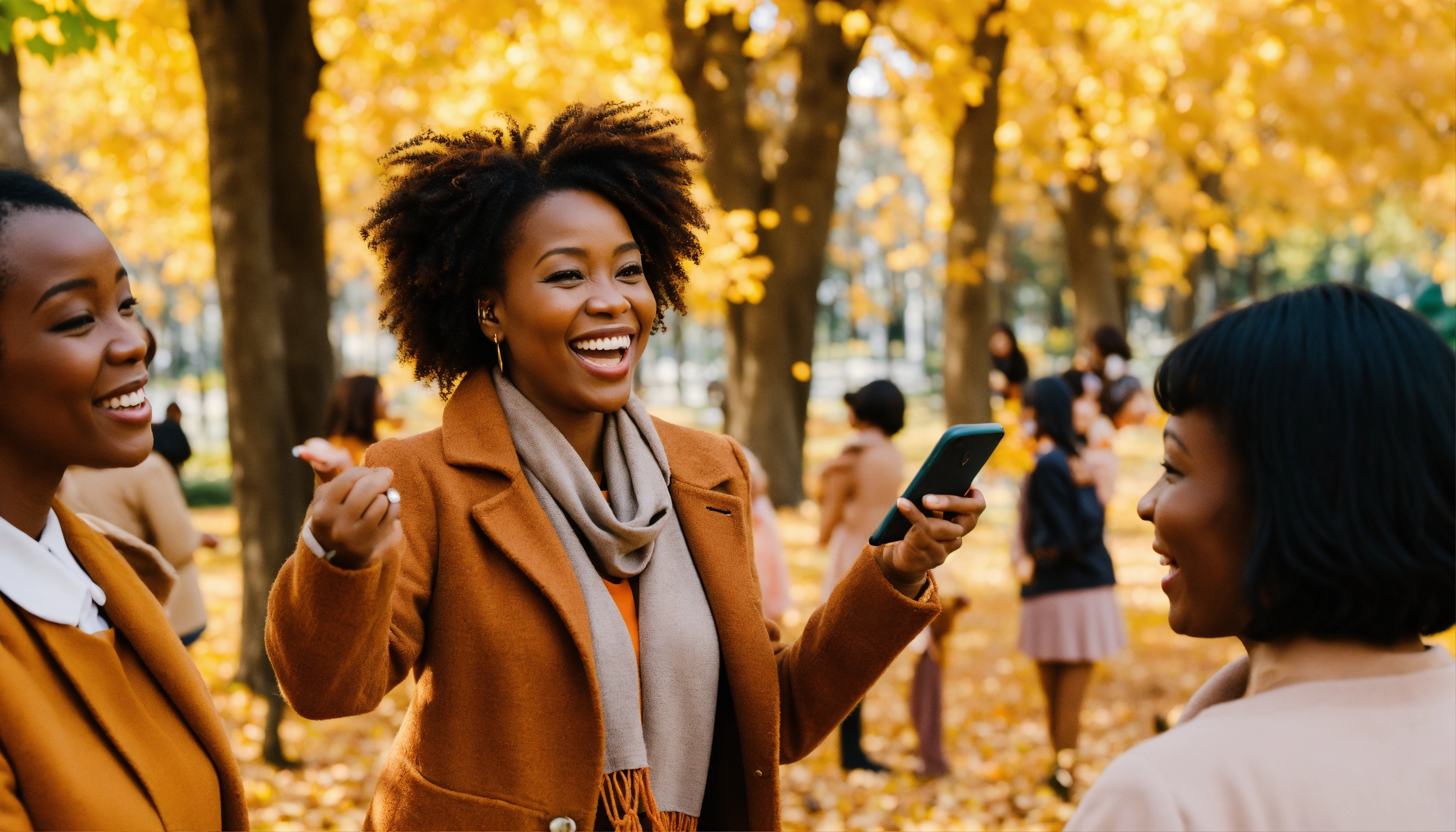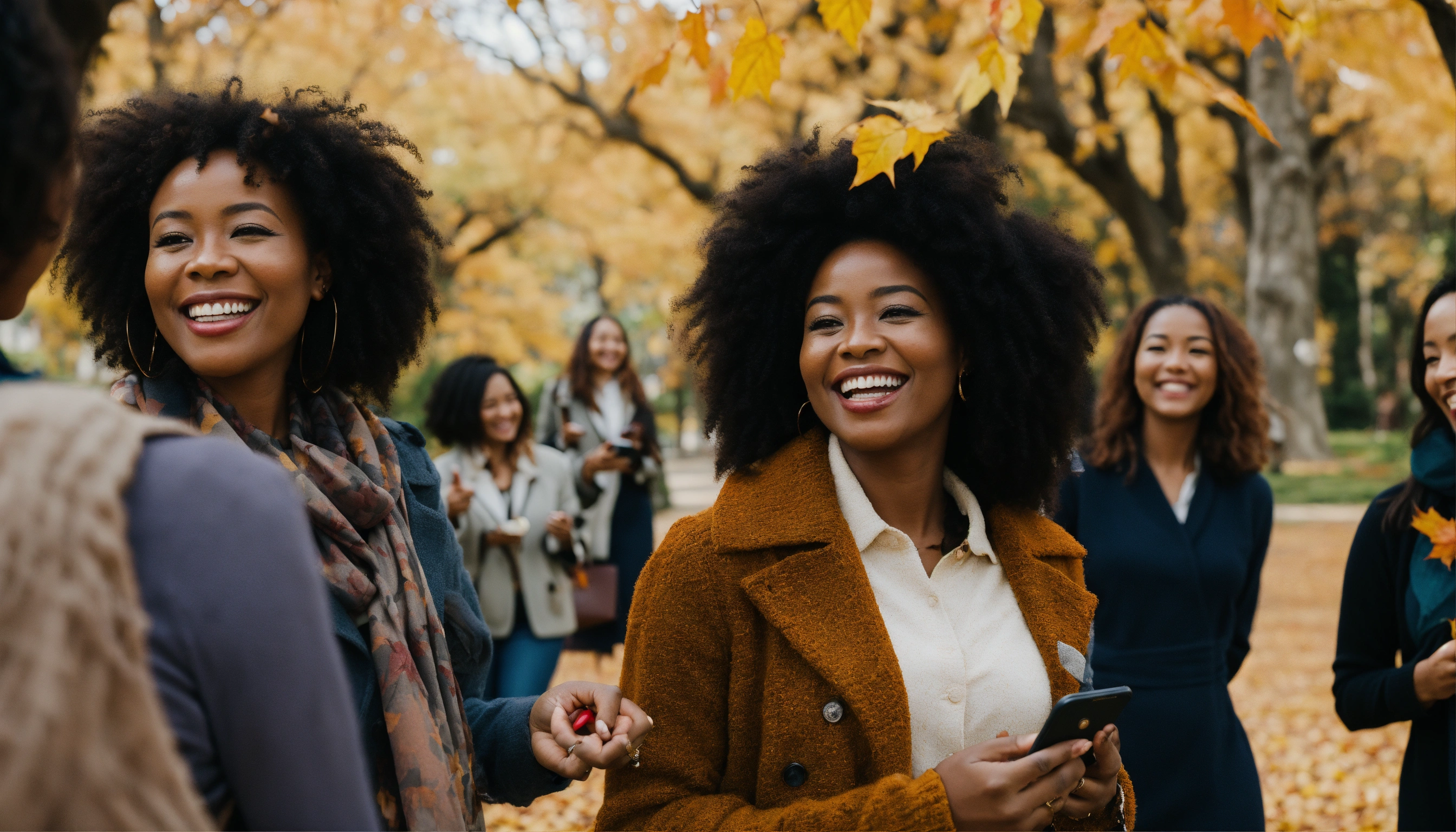 An african woman in her 30s smiling excitedly as she shares happy news with a diverse group of professional women. the african woman has a joyful expression as she gestures to her phone in an autumn park. she is surrounded by supportive women including asian, caucasian, and latina colleagues who smile back. they stand together outdoors with fallen orange, red and yellow leaves all around them. it is a peak fall day with trees full of colorful leaves and cool sunny weather. the women are happily celebrating the african woman's exciting career update during a supportive meetup in the autumn park.