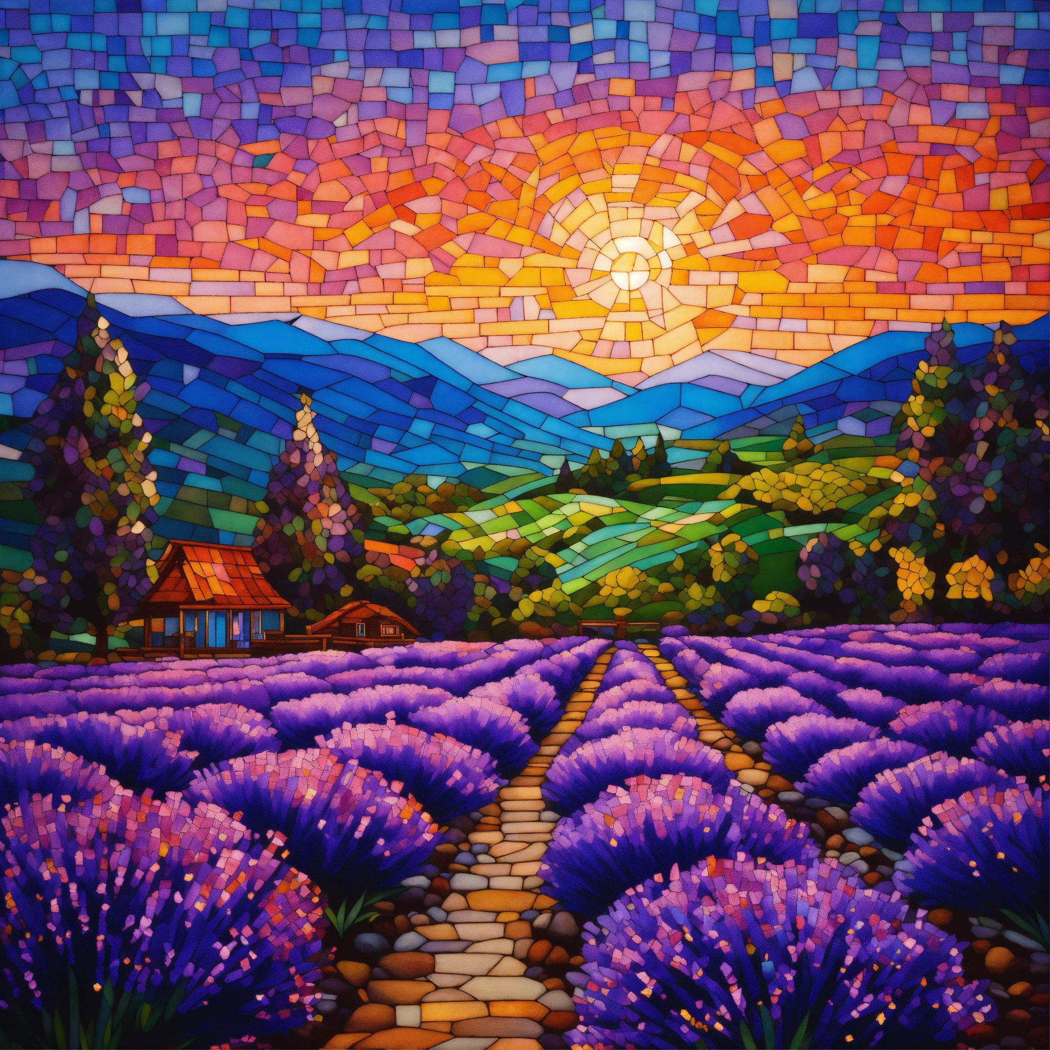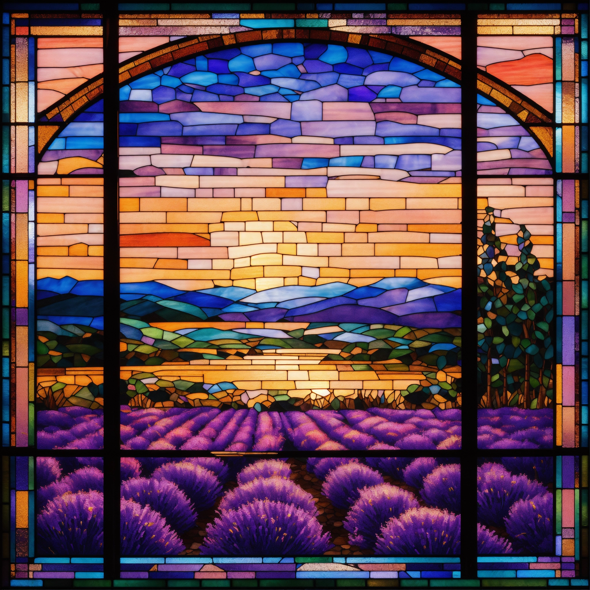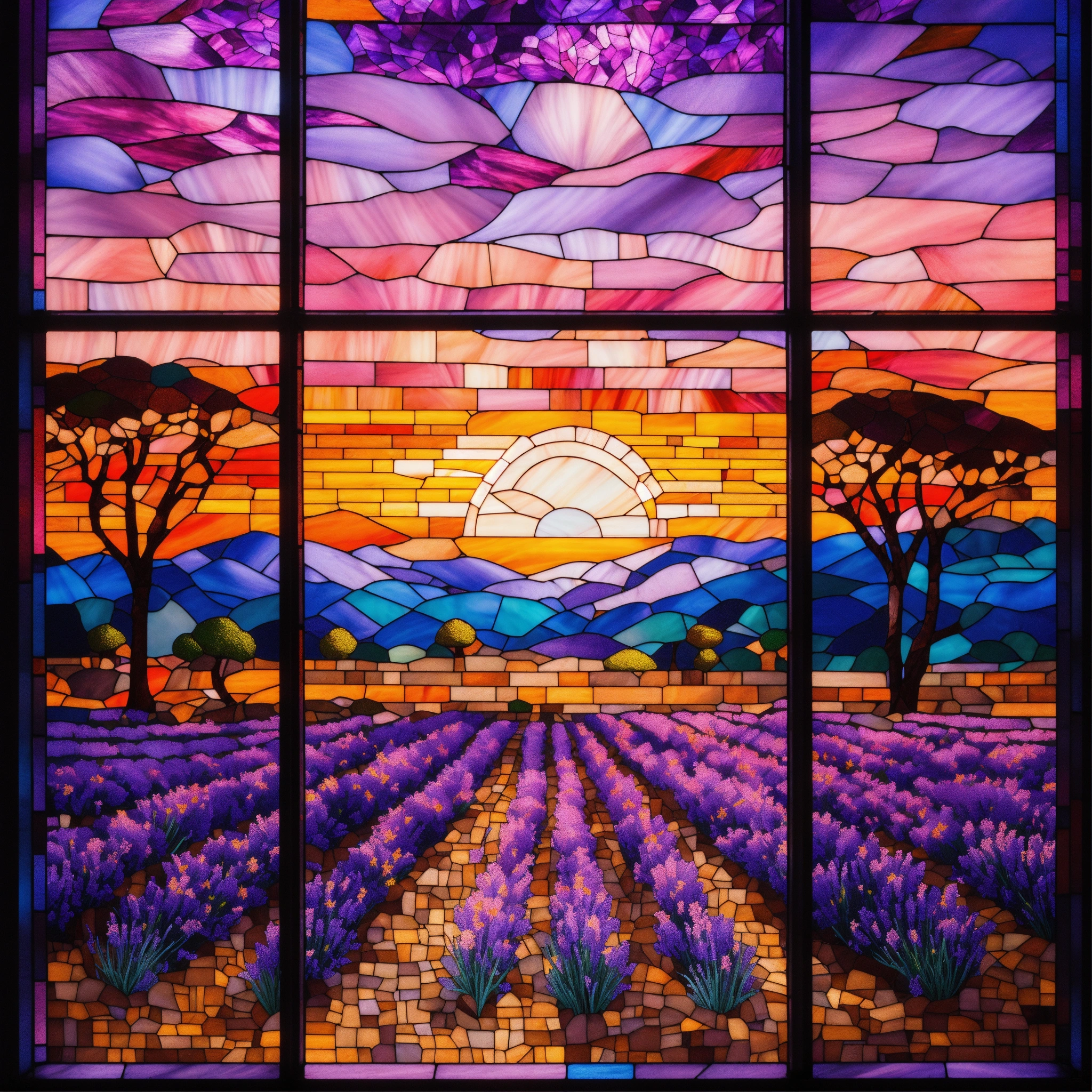 Stained glass window mosaic of field of lavender, vibrant colors, ultra sharp detail, trees, ultra blue lake, glitter, stars, stardust, hyper realistic, well rendered, detailed, electric pink, orange and yellow sunrise sky in style of thomas kinkade