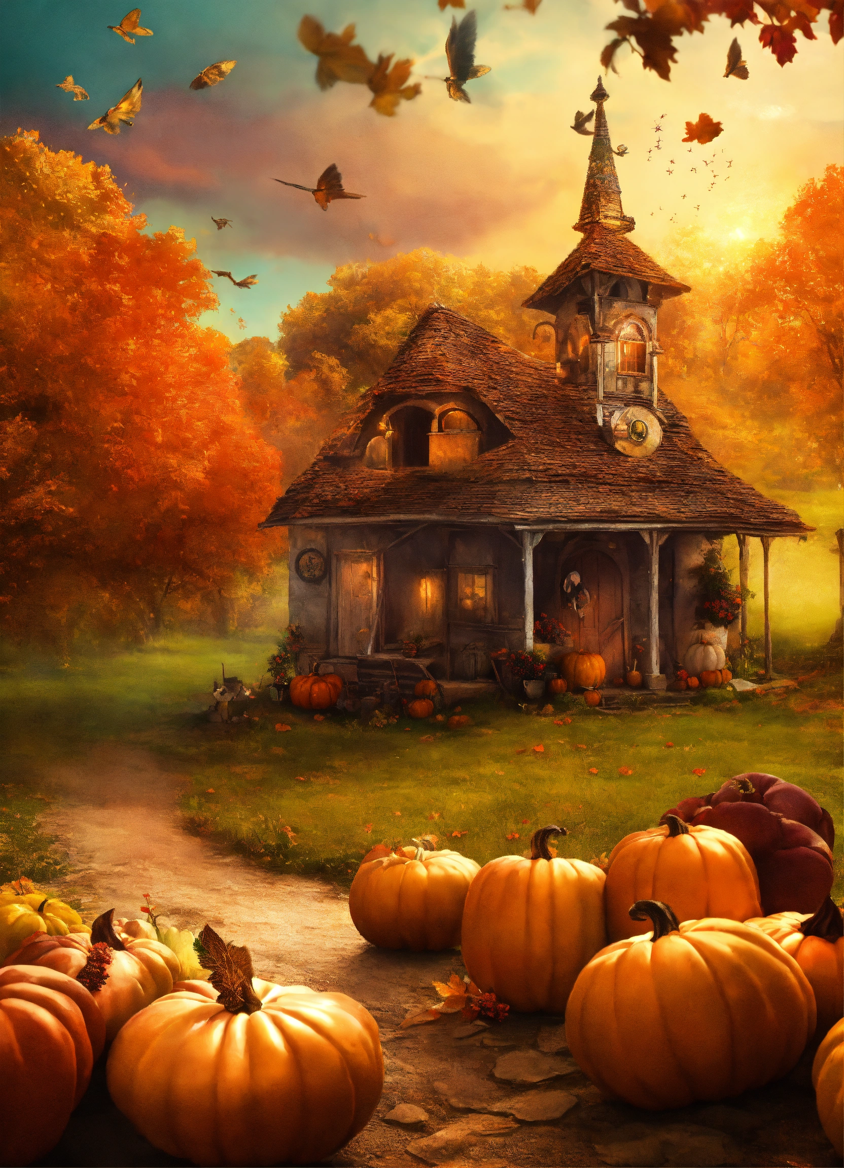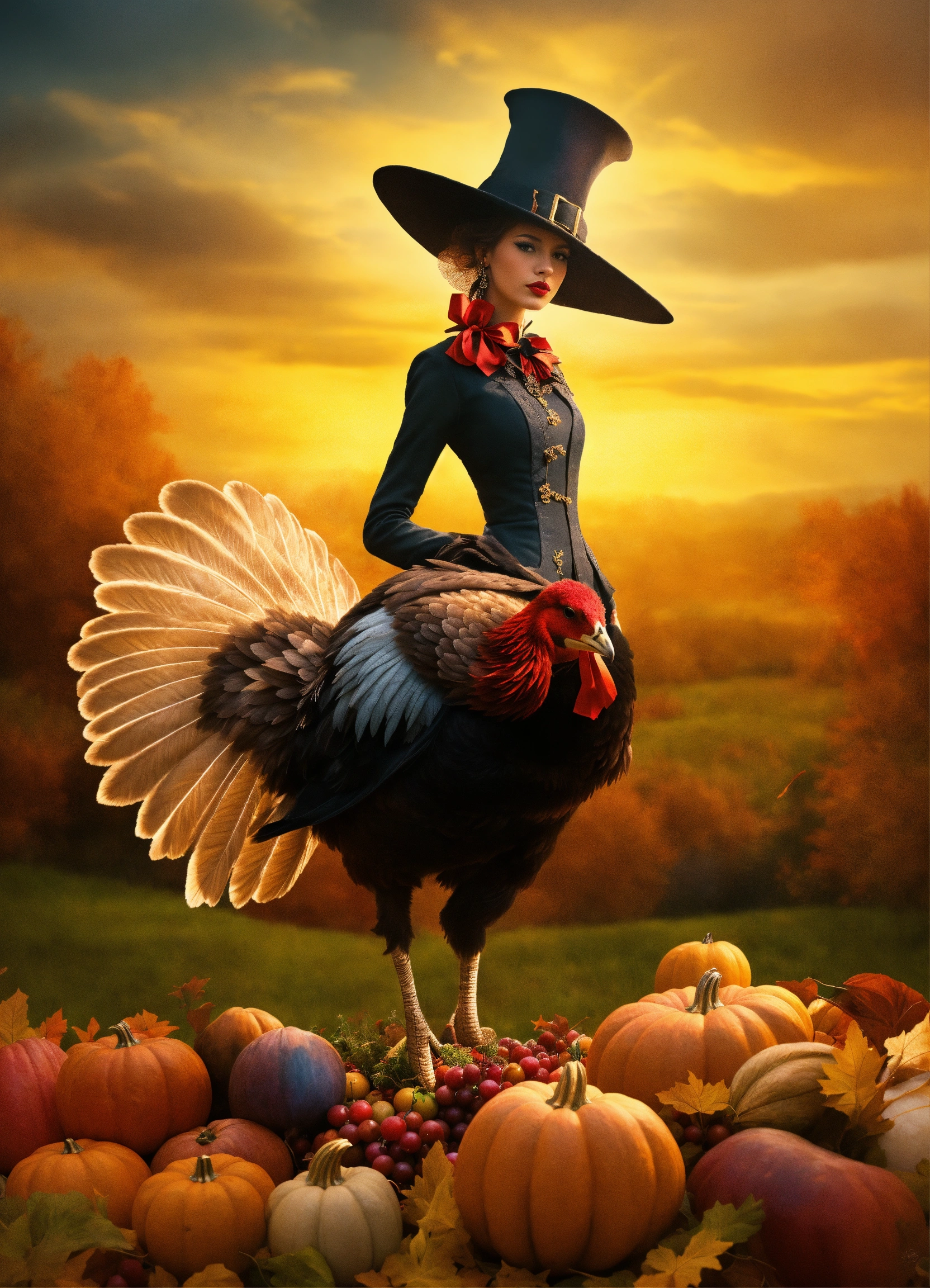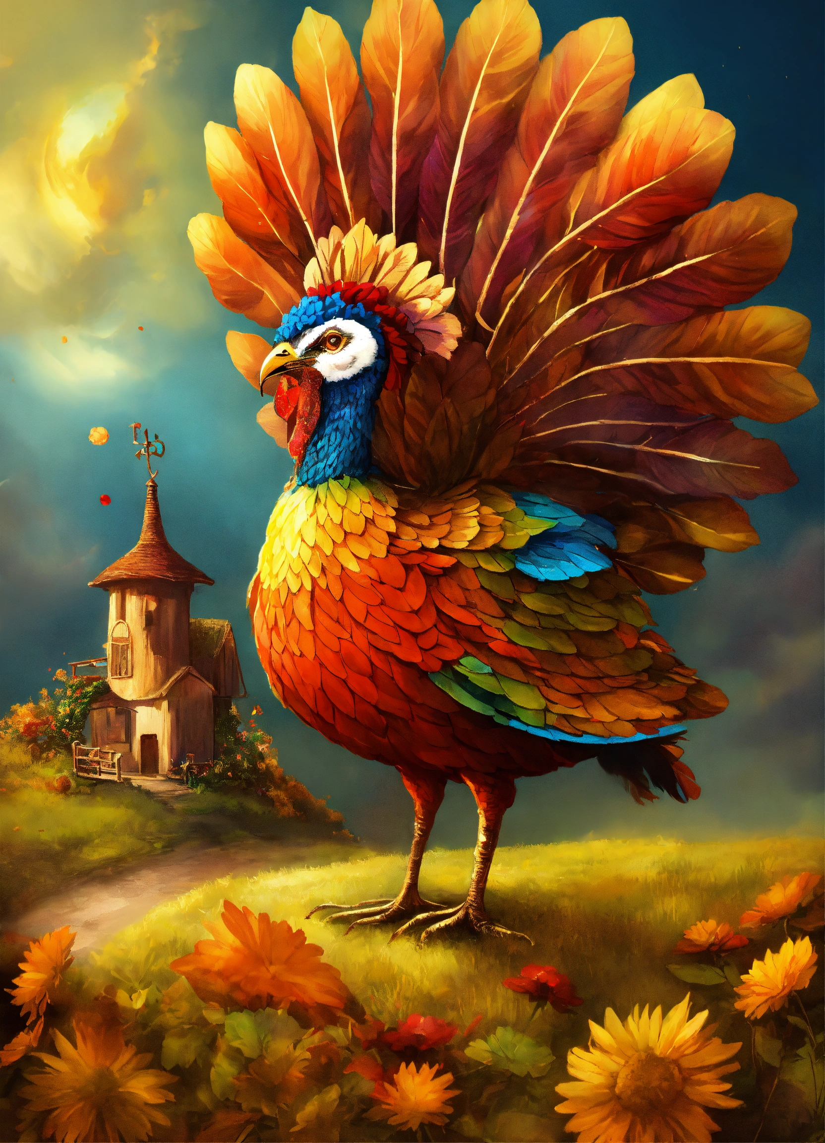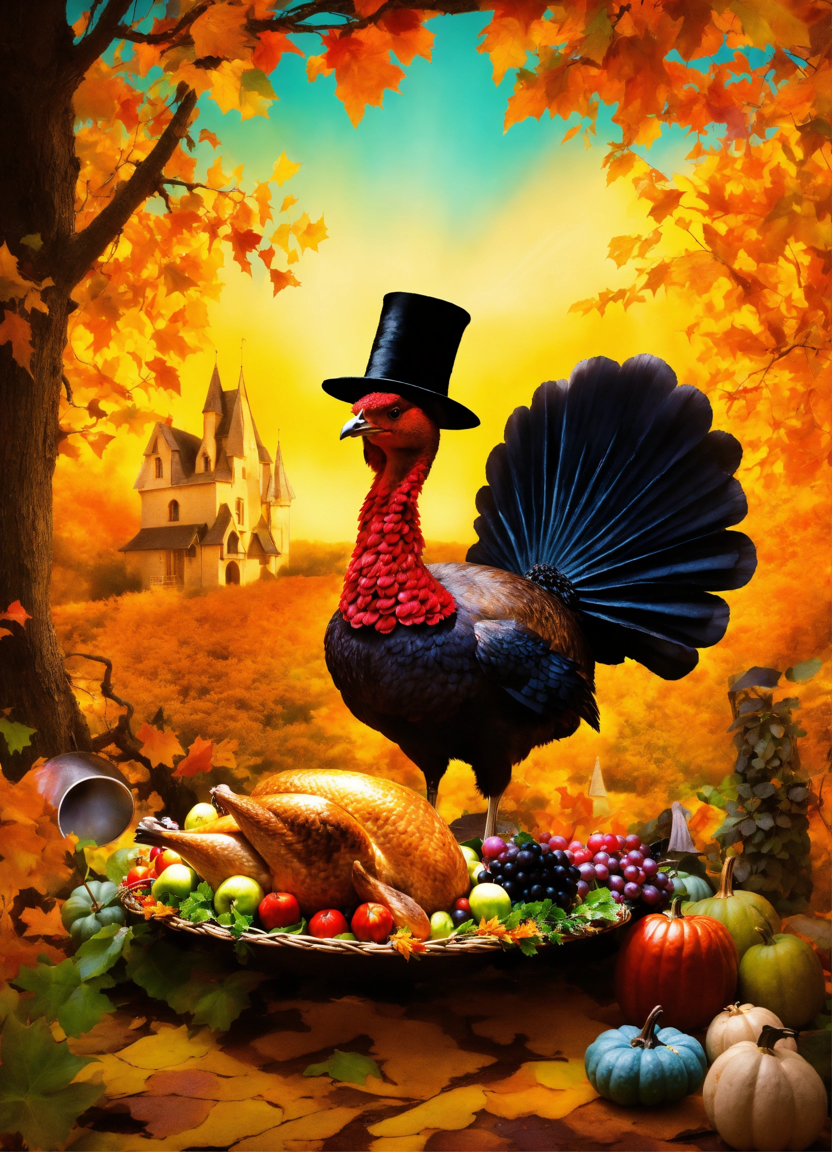 Prompt 2 artistic image create a surreal artistic image of a whimsical thanksgiving scene. the scene should include a turkey in a pilgrim hat and a cornucopia in a pilgrim hat. the background should be a blend of vibrant, otherworldly colors to enhance the whimsy. take inspiration from artists like salvador dali and tim burton. use a wide-angle lens to capture a dynamic perspective. incorporate elements of fantasy and magic into the composition, and play with unusual lighting effects.