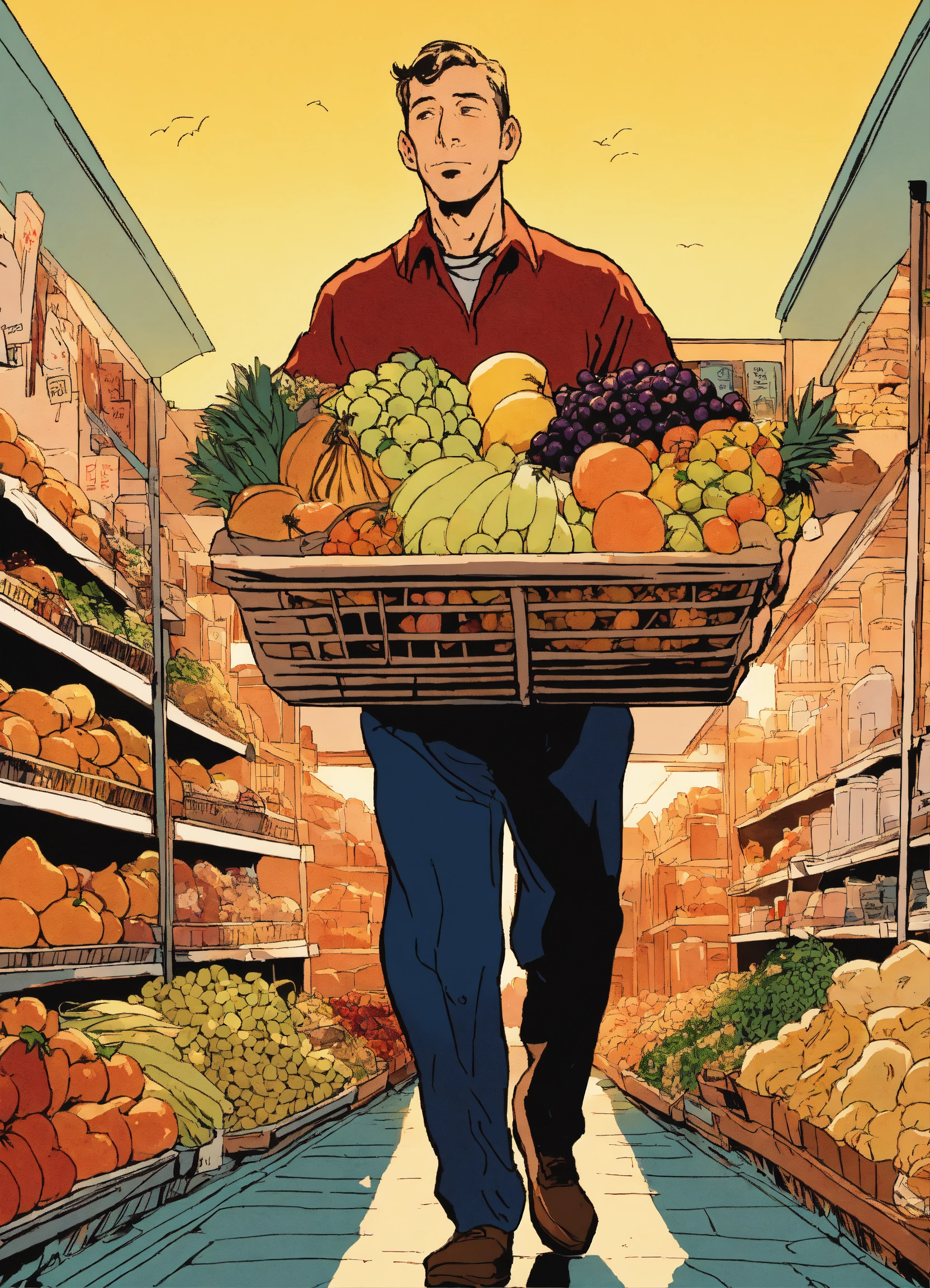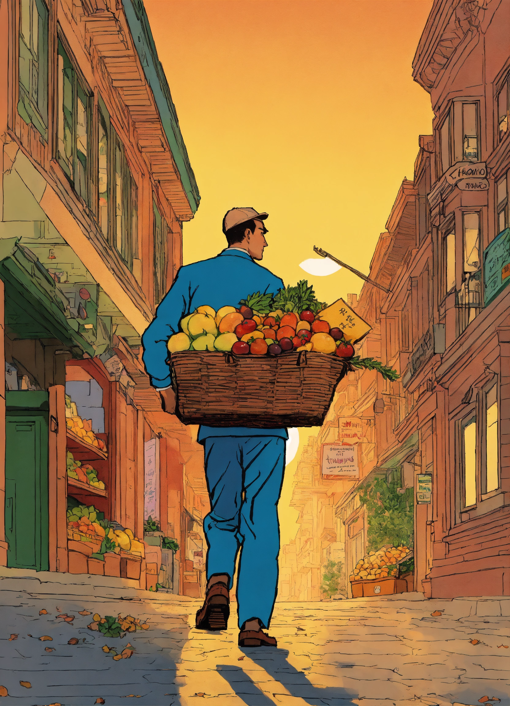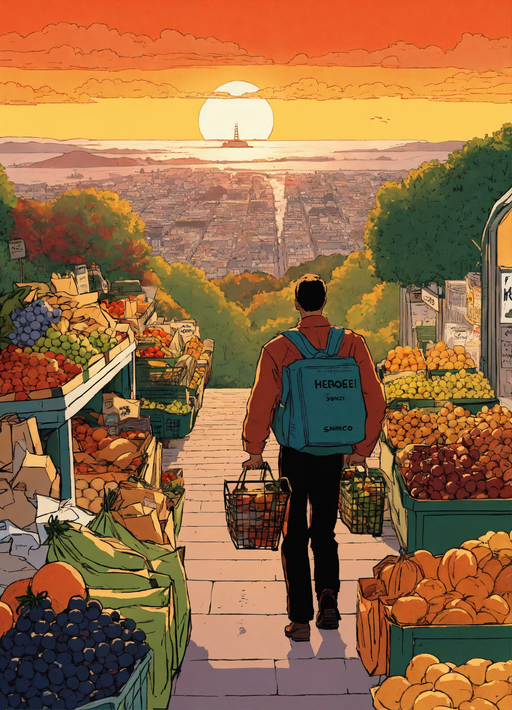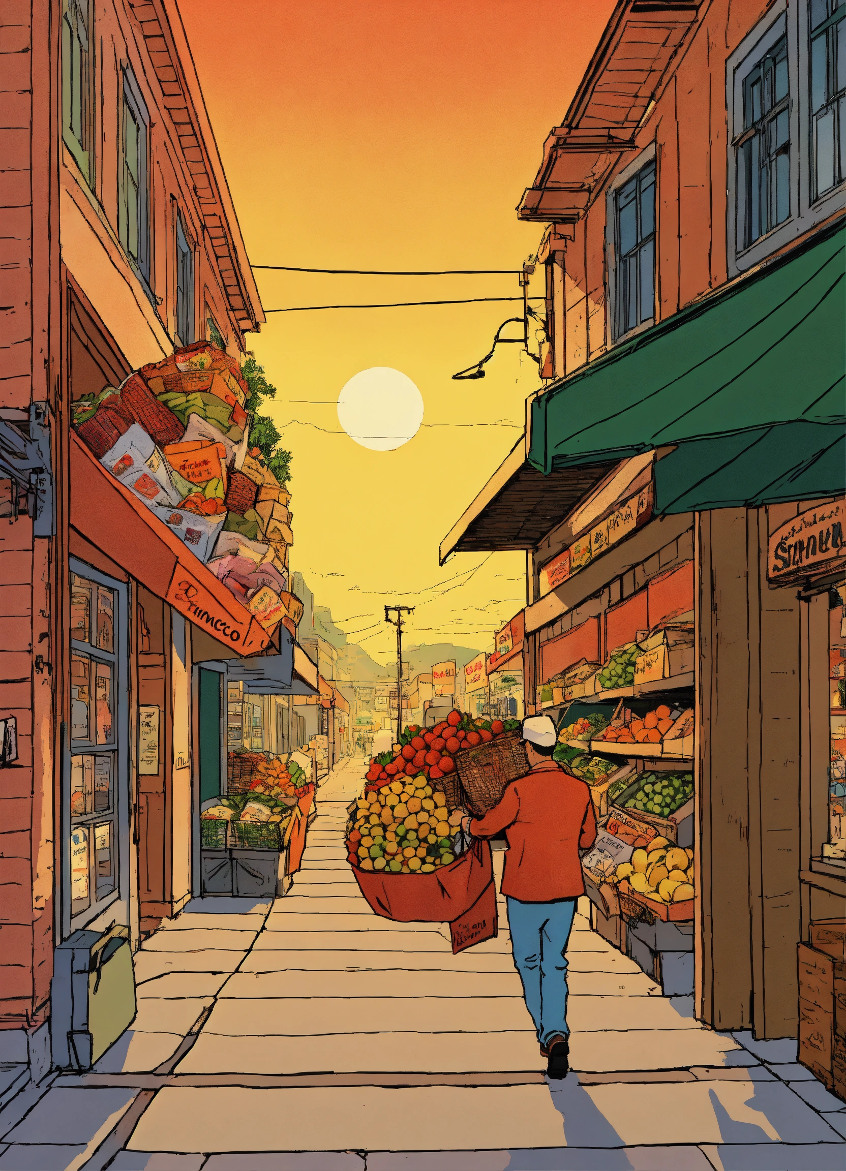 Beautiful illustration by hergé of a man carrying lots of bags of groceries with both hands, overflowing with fruits, san francisco grocery store during sunset, beautiful stunning color scheme, masterpiece