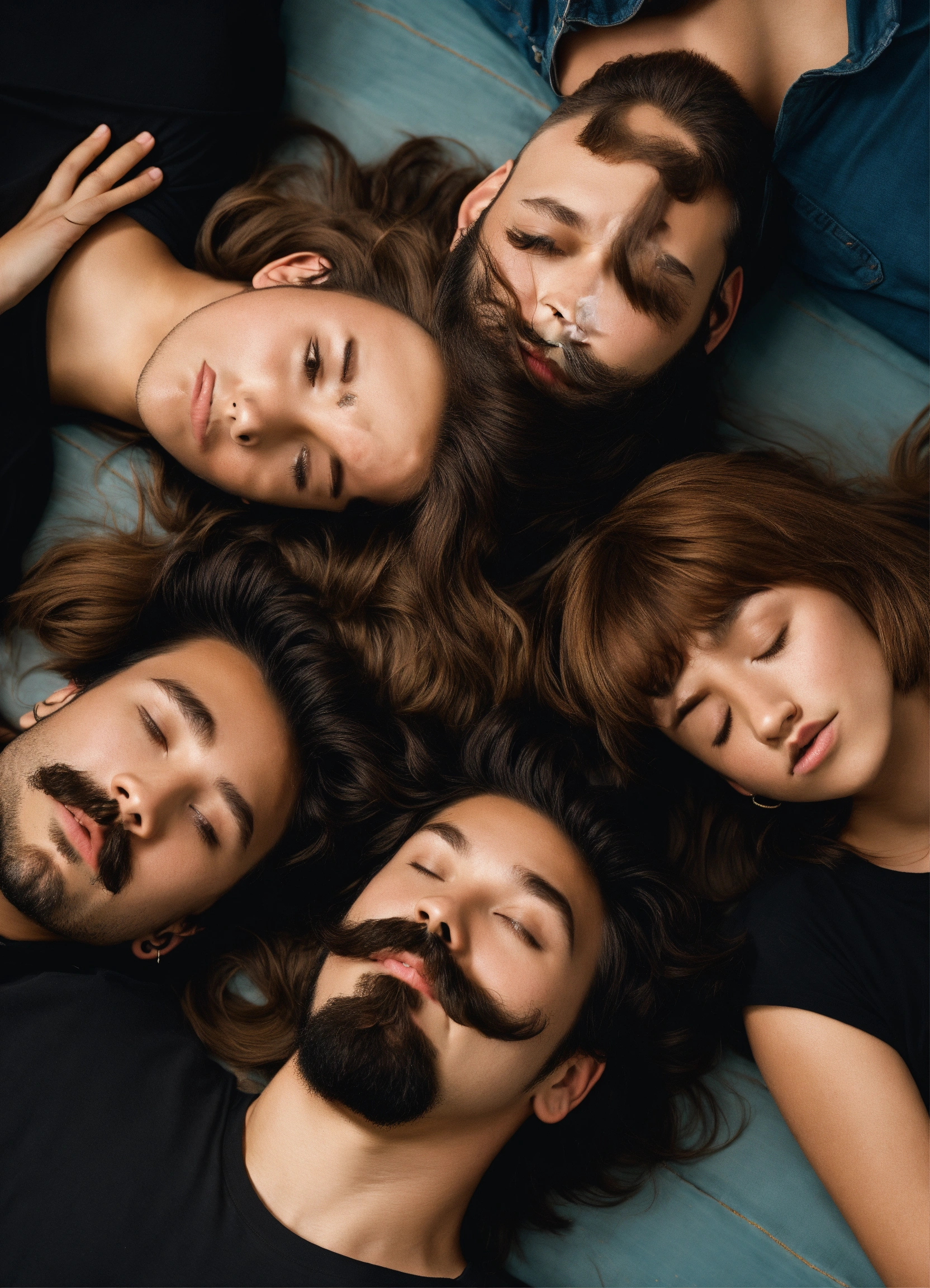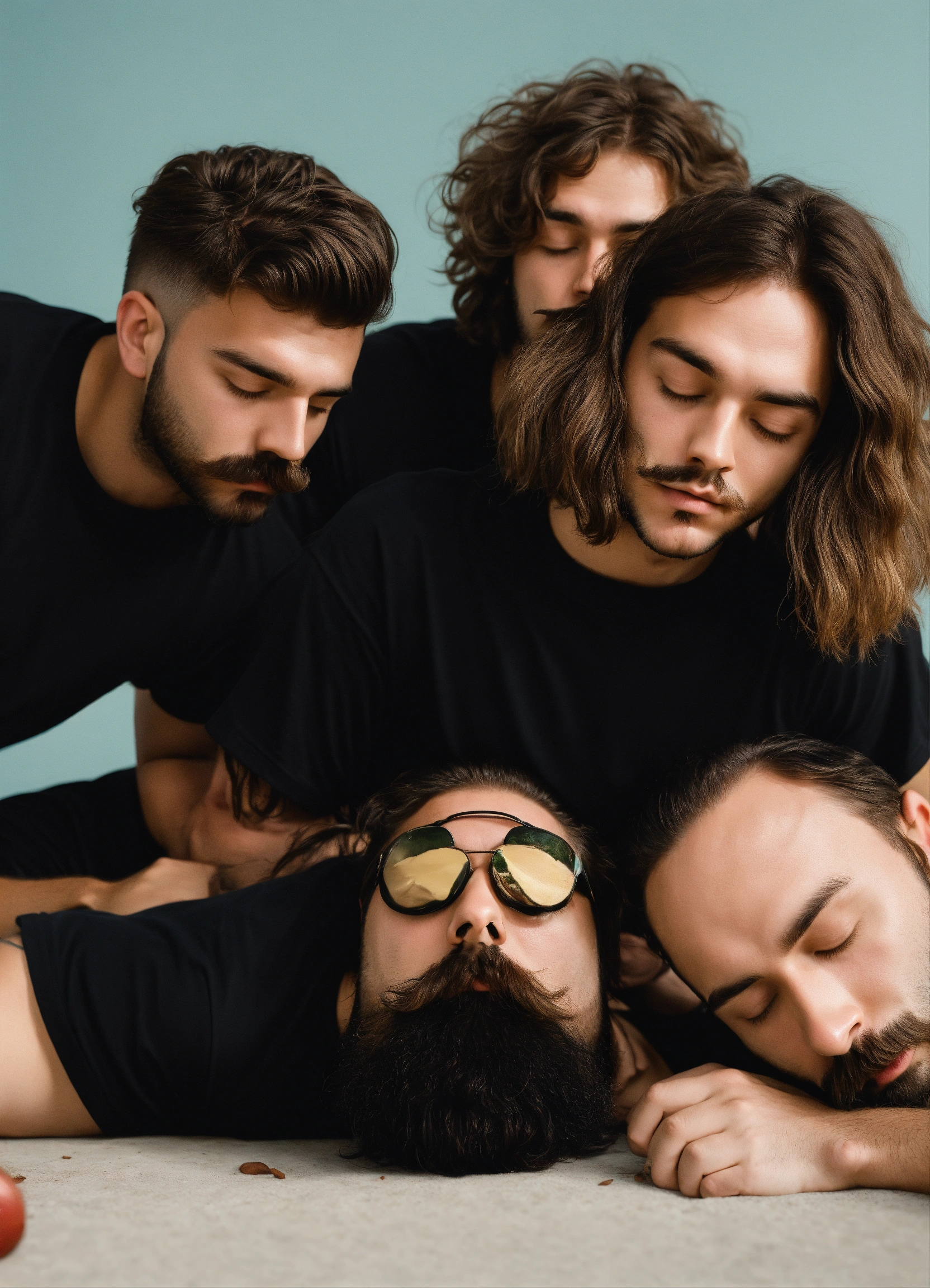 Three guys and one girl lay face down. they are wearing black t-shirts. one guy with a beard, the second guy with a mustache, the third with a fluffy haircut, a girl with a bob