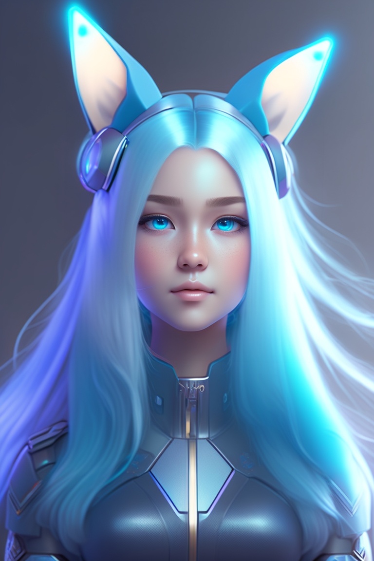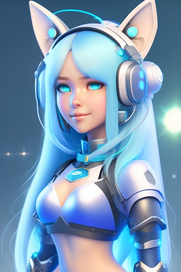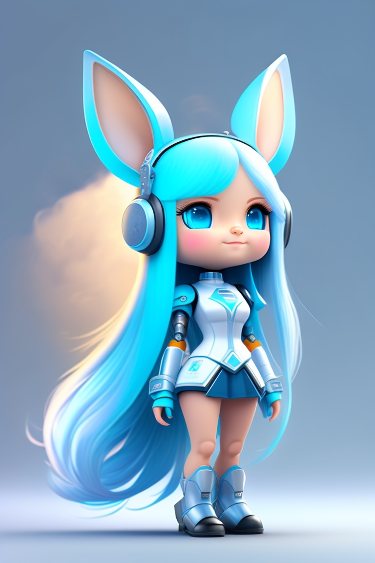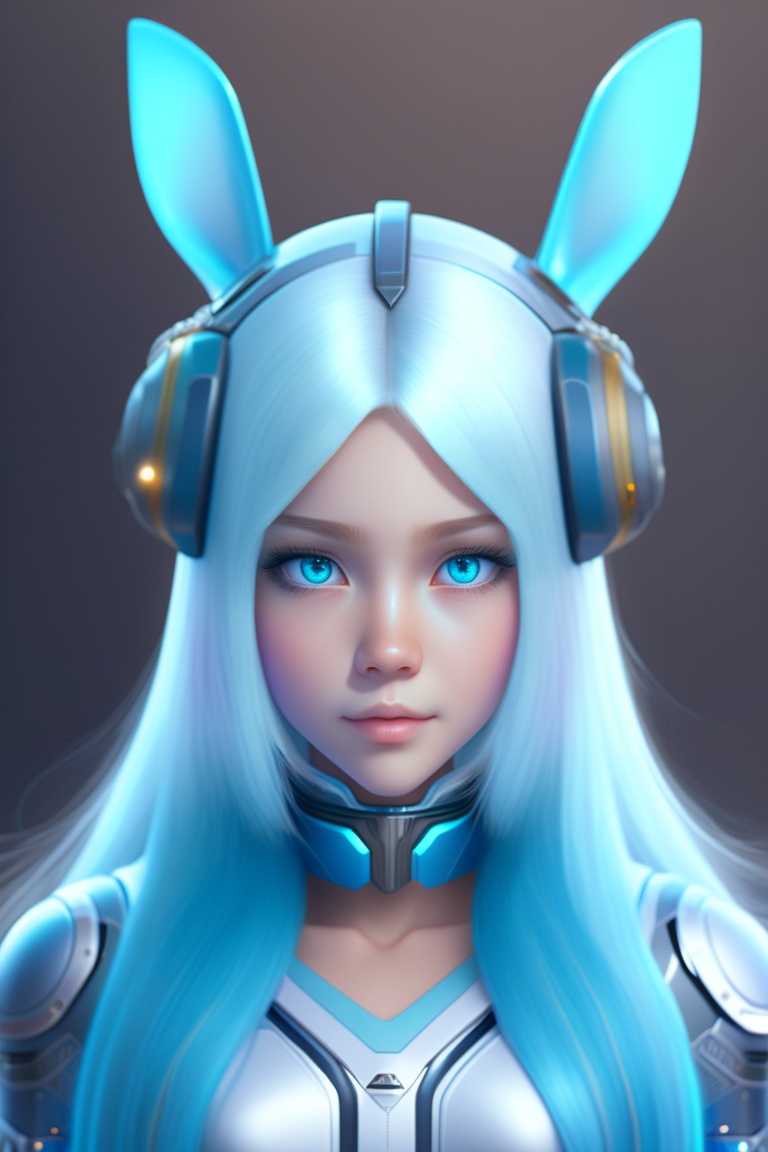 A female robot girl, cyan eyes, light blue long hair, white torso, two antennas on her ears, and a bunny left ear on her head.