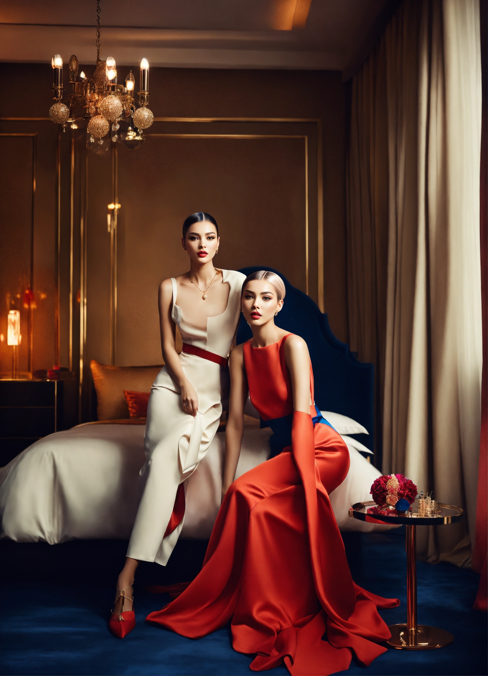 Super clean, hyper photorealistic high fashion beauty photoshoot in an elegant luxury hotel room, the photoshoot is color blocked and its highly stylized with lots of accessories