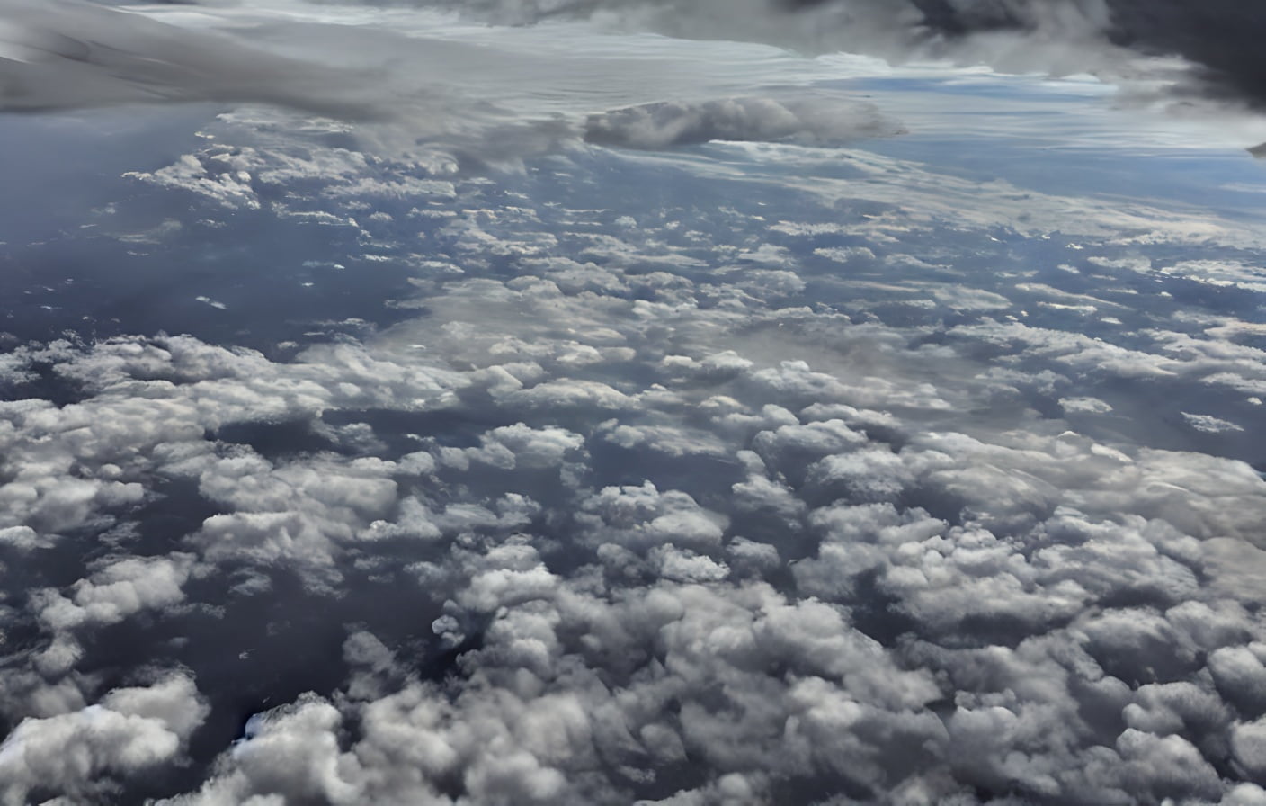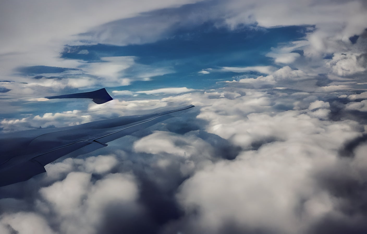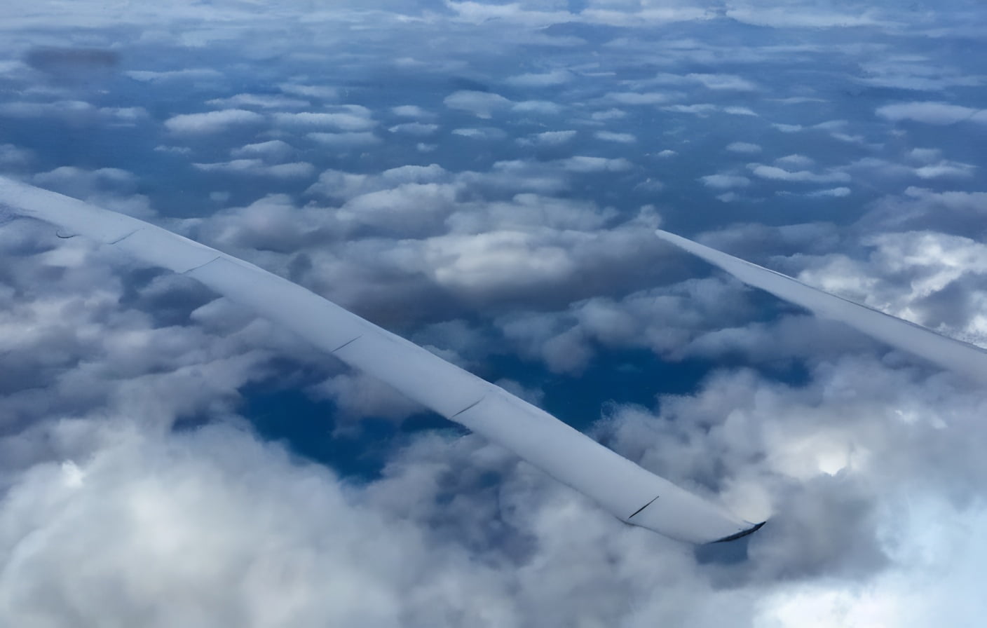 Airplane wing and clouds seen from inside airplane